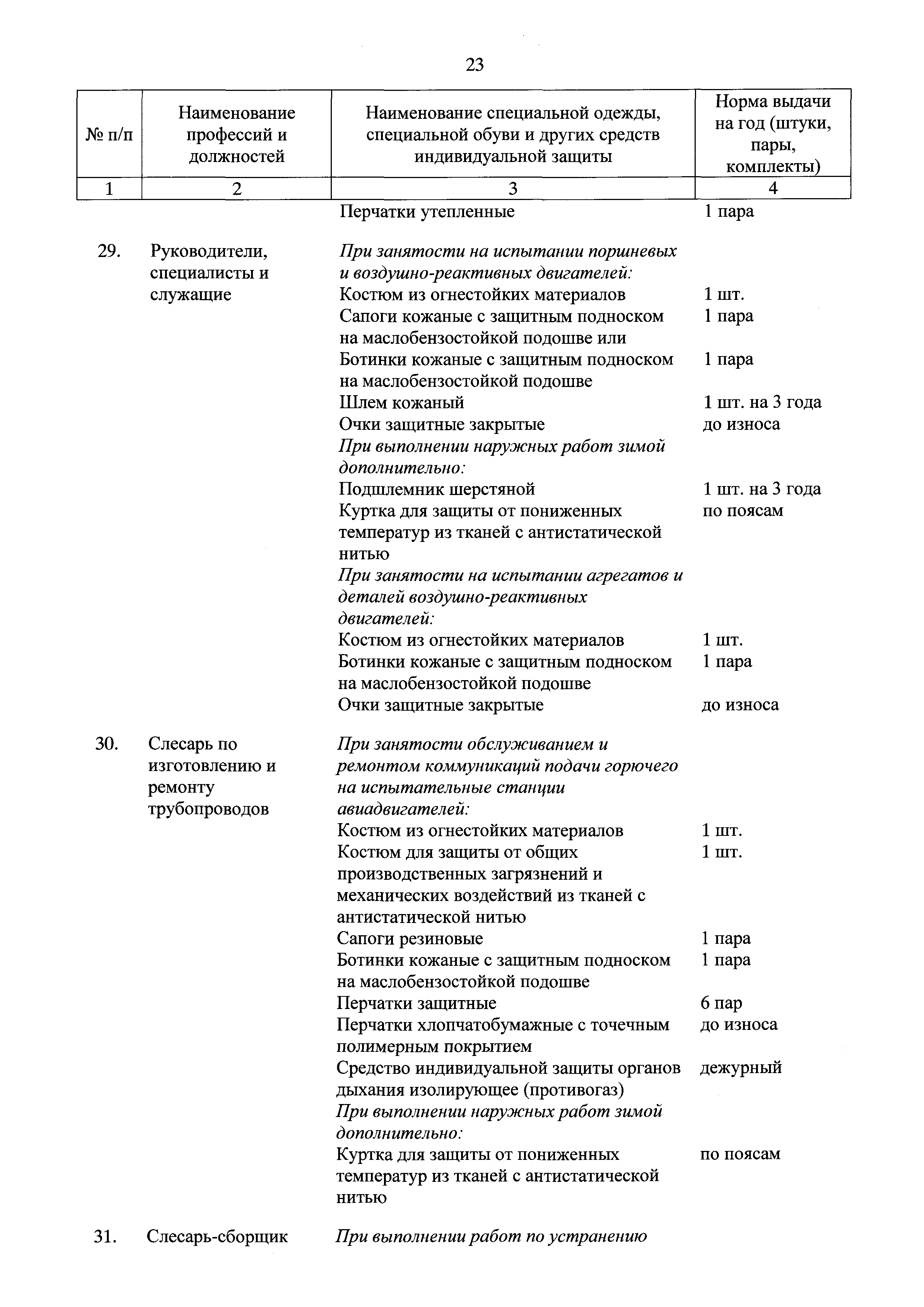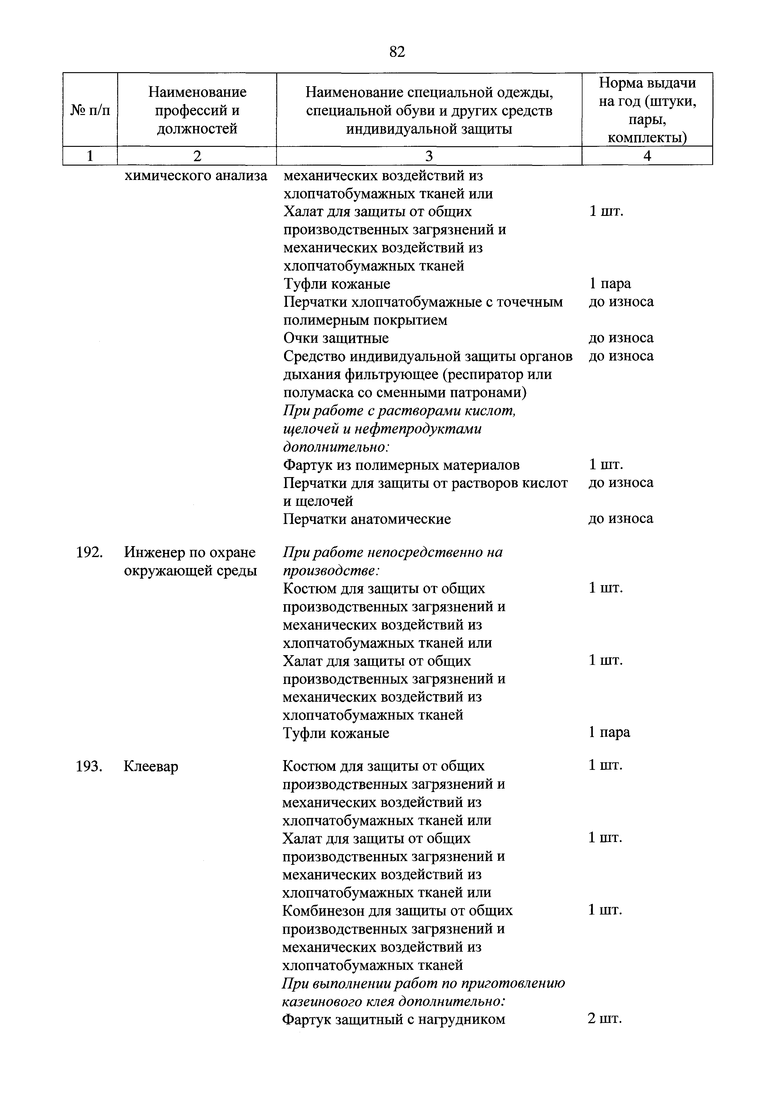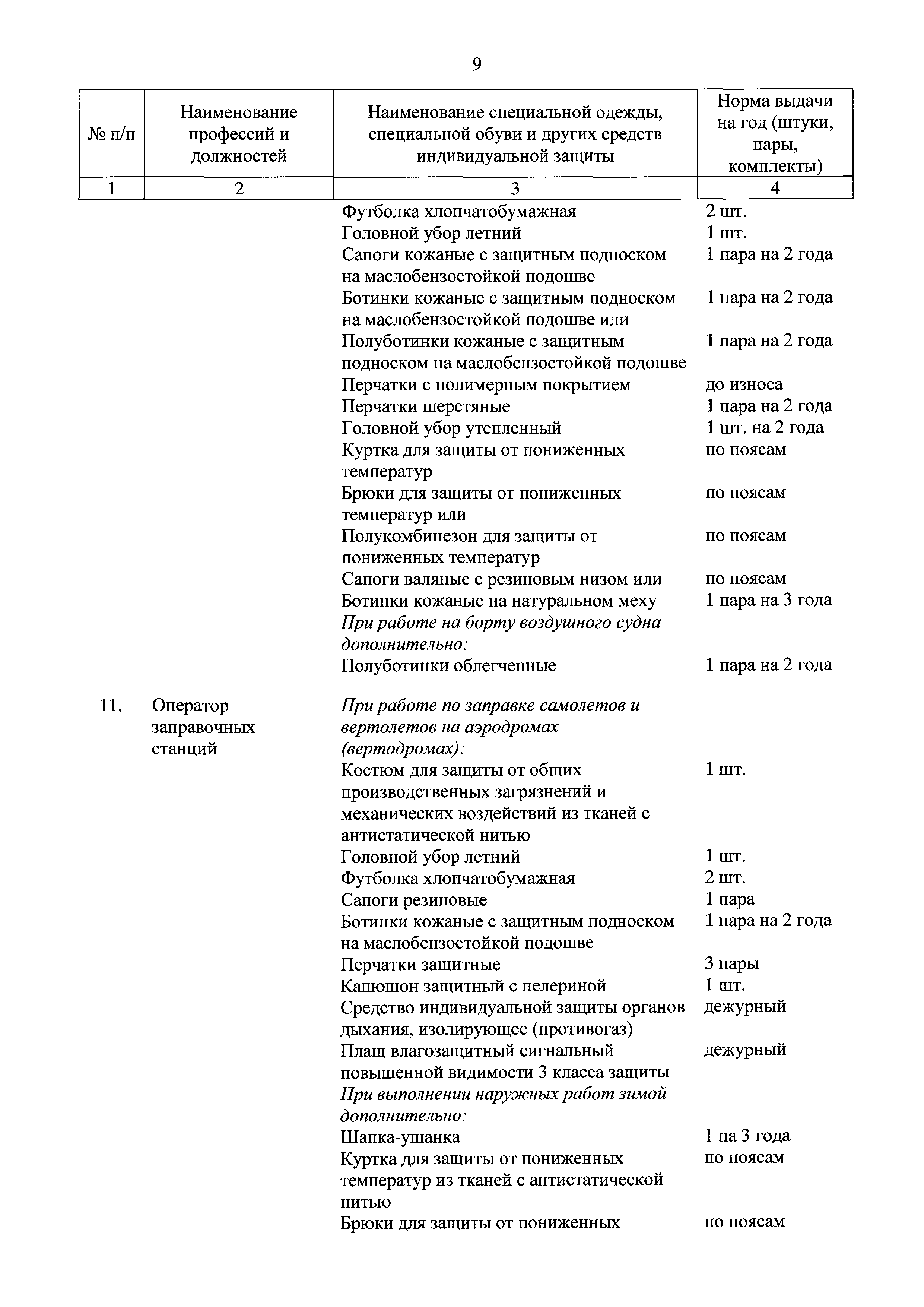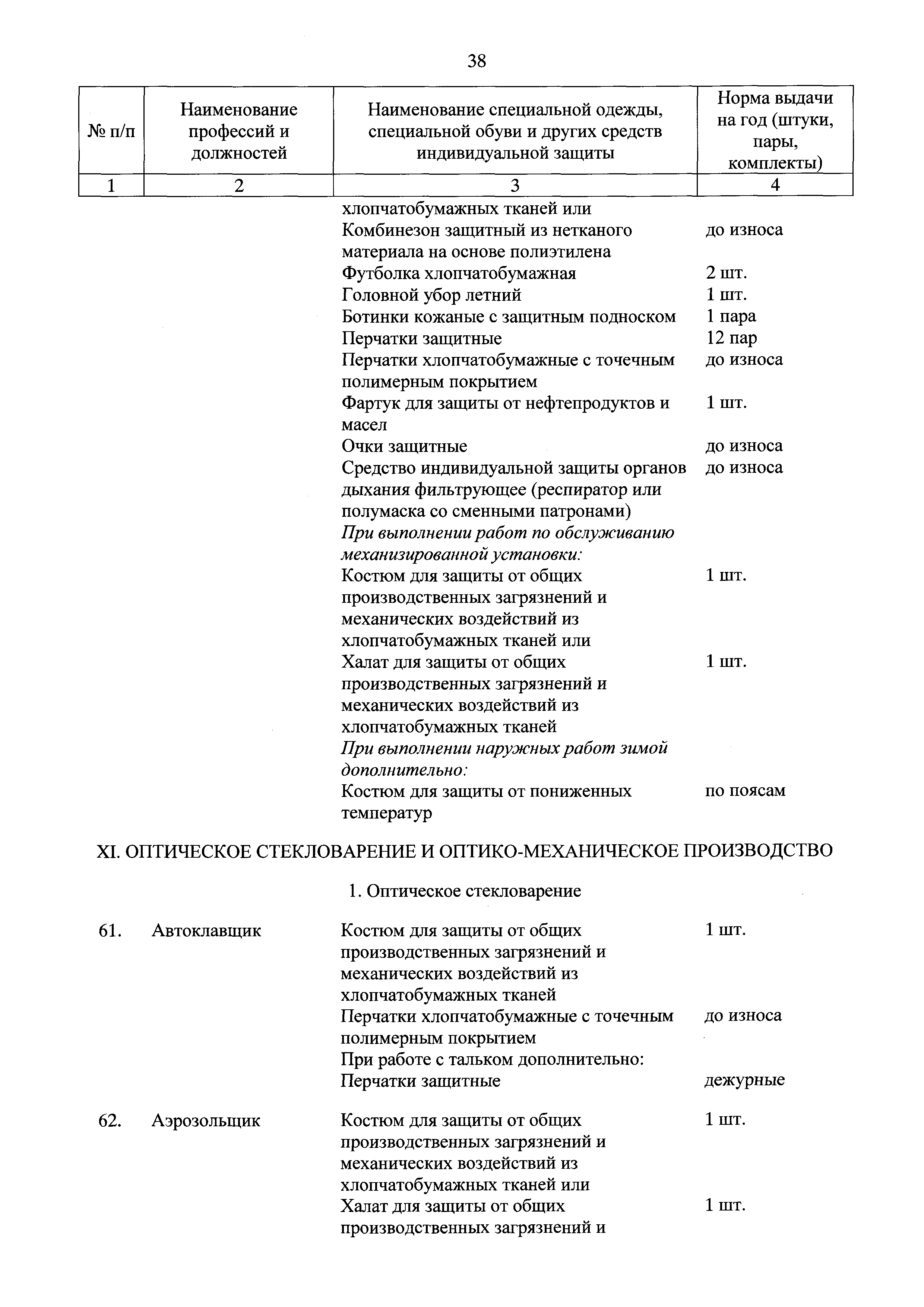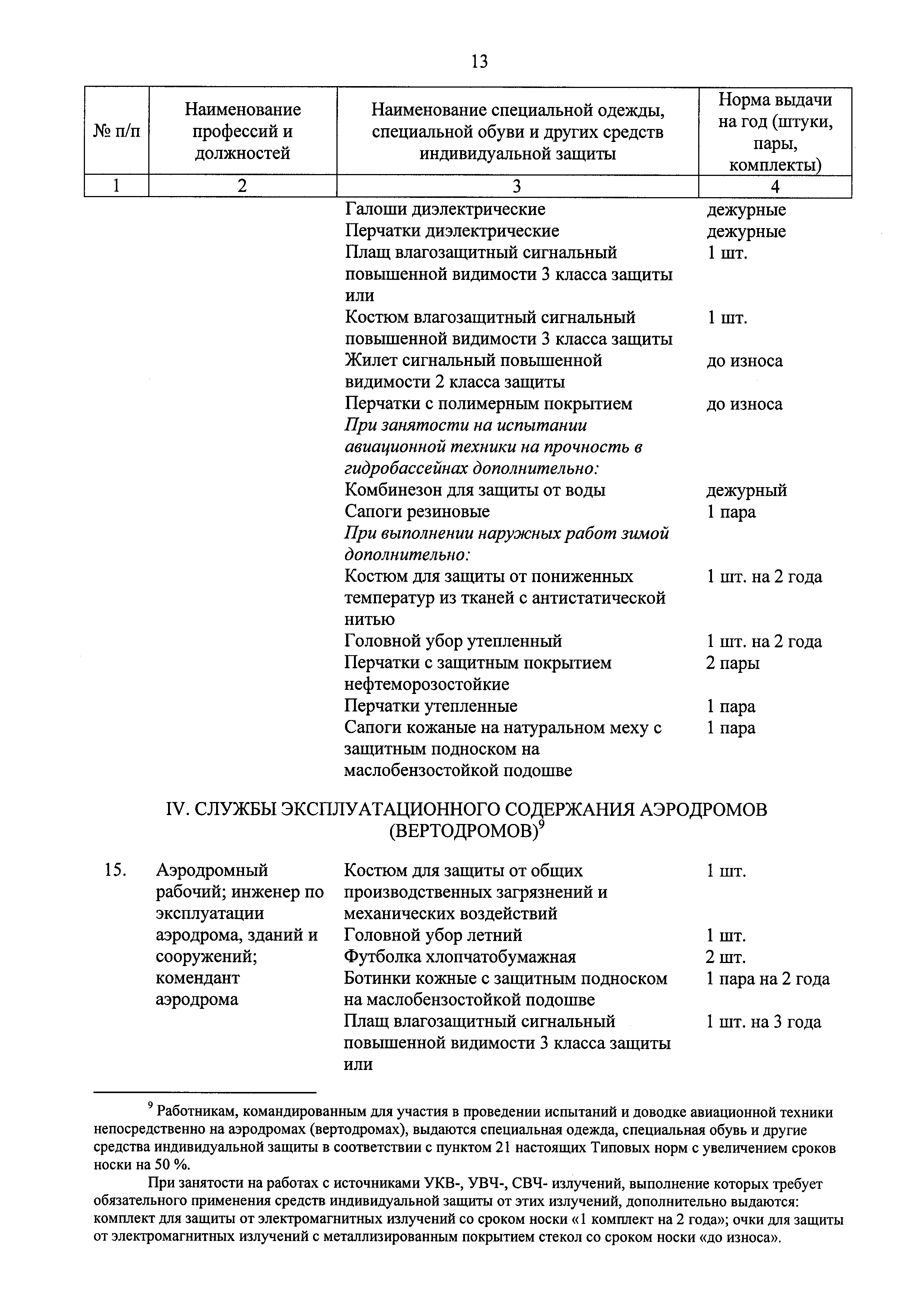 Типовые нормы бесплатной выдачи специальной одежды, специальной обуви и других средств индивидуальной защиты работникам авиационной промышленности, занятым на работах с вредными и (или) опасными условиями труда, а также на работах, выполняемых в особых температурных условиях или связанных с загрязнением| Статус: | действует | | Название рус.: | Типовые нормы бесплатной выдачи специальной одежды, специальной обуви и других средств индивидуальной защиты работникам авиационной промышленности, занятым на работах с вредными и (или) опасными условиями труда, а также на работах, выполняемых в особых температурных условиях или связанных с загрязнением | | Дата добавления в базу: | 01.01.2018 | | Дата актуализации: | 01.01.2021 | | Дата введения: | 01.12.2017 | | Оглавление: | I. Летный состав II. Инженерно-технический состав III. Испытание авиационной техники IV. Службы эксплуатационного содержания аэродромов (вертодромов) V. Персонал испытательных станций авиационных двигателей VI. Персонал испытательных станций двигателей и силовых установок VII. Работники полигона VIII. Производство мягких баков IX. Производство мипоры X. Подразделения неразрушающего контроля XI. Оптическое стекловарение и оптико-механическое производство 1. Оптическое стекловарение 2. Оптико-механическое производство 3. Общие профессии XII. Производство полимерных композиционных материалов (далее - ПКМ) и изделий из них XIII. Производство печатных плат гальваническим способом XIV. Авиаприборостоение. Сборка приборов для ракетно-космической техники XV. Прочие профессии | | Утверждён: | 19.06.2017 Министерство труда и социальной защиты РФ (507н)