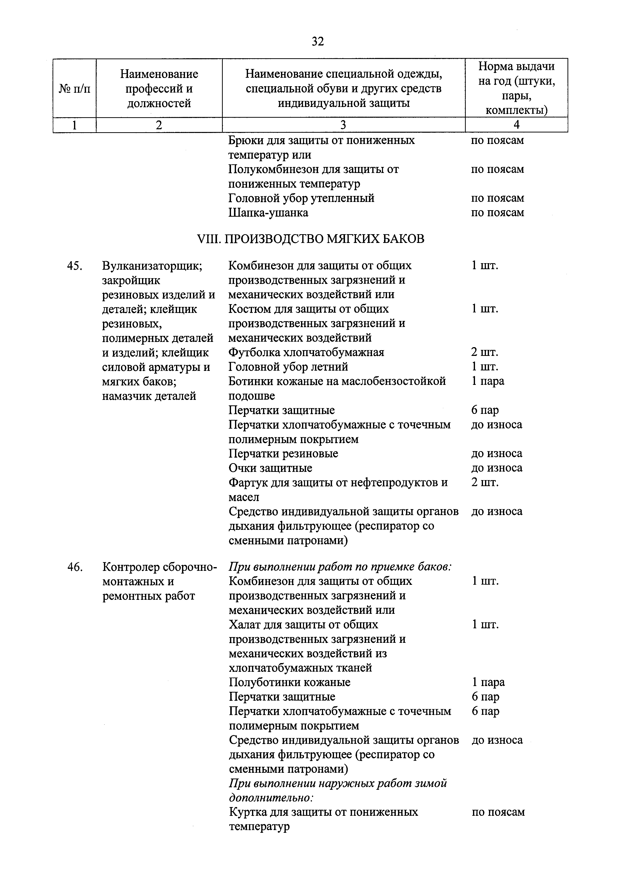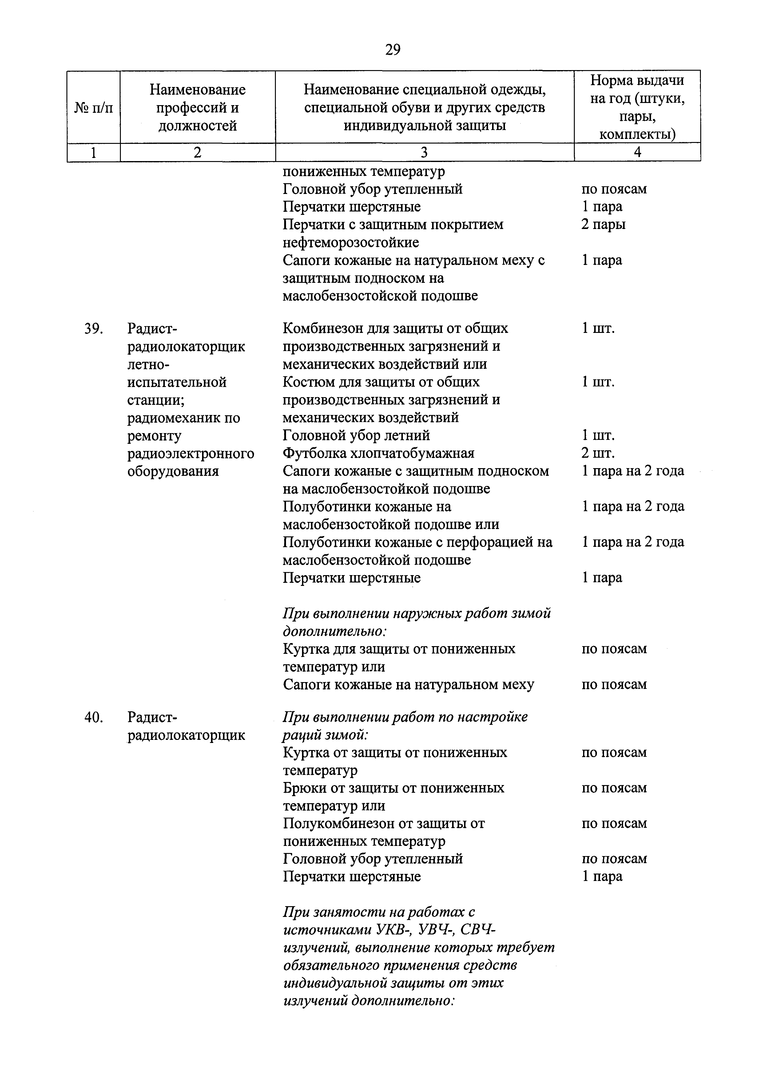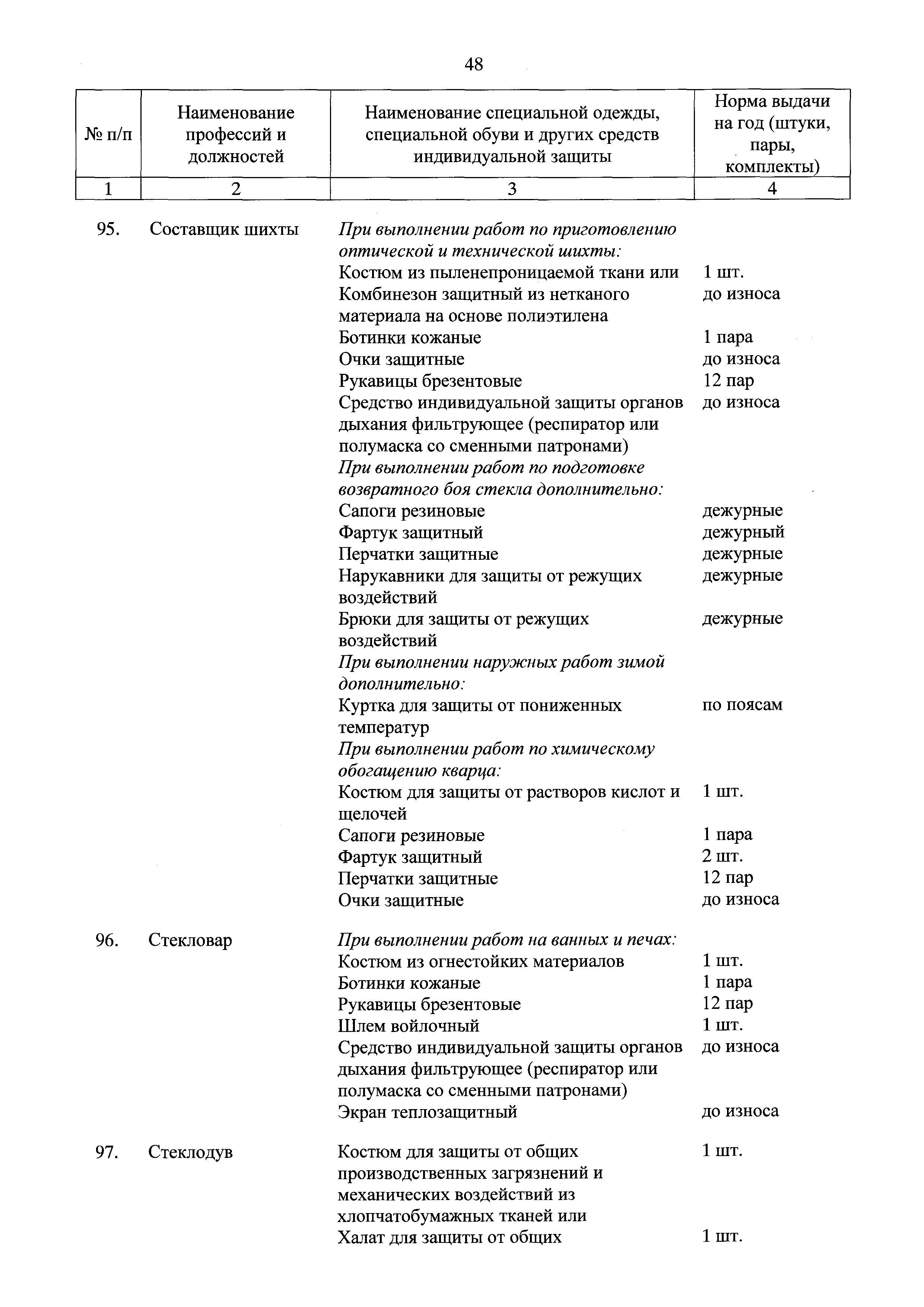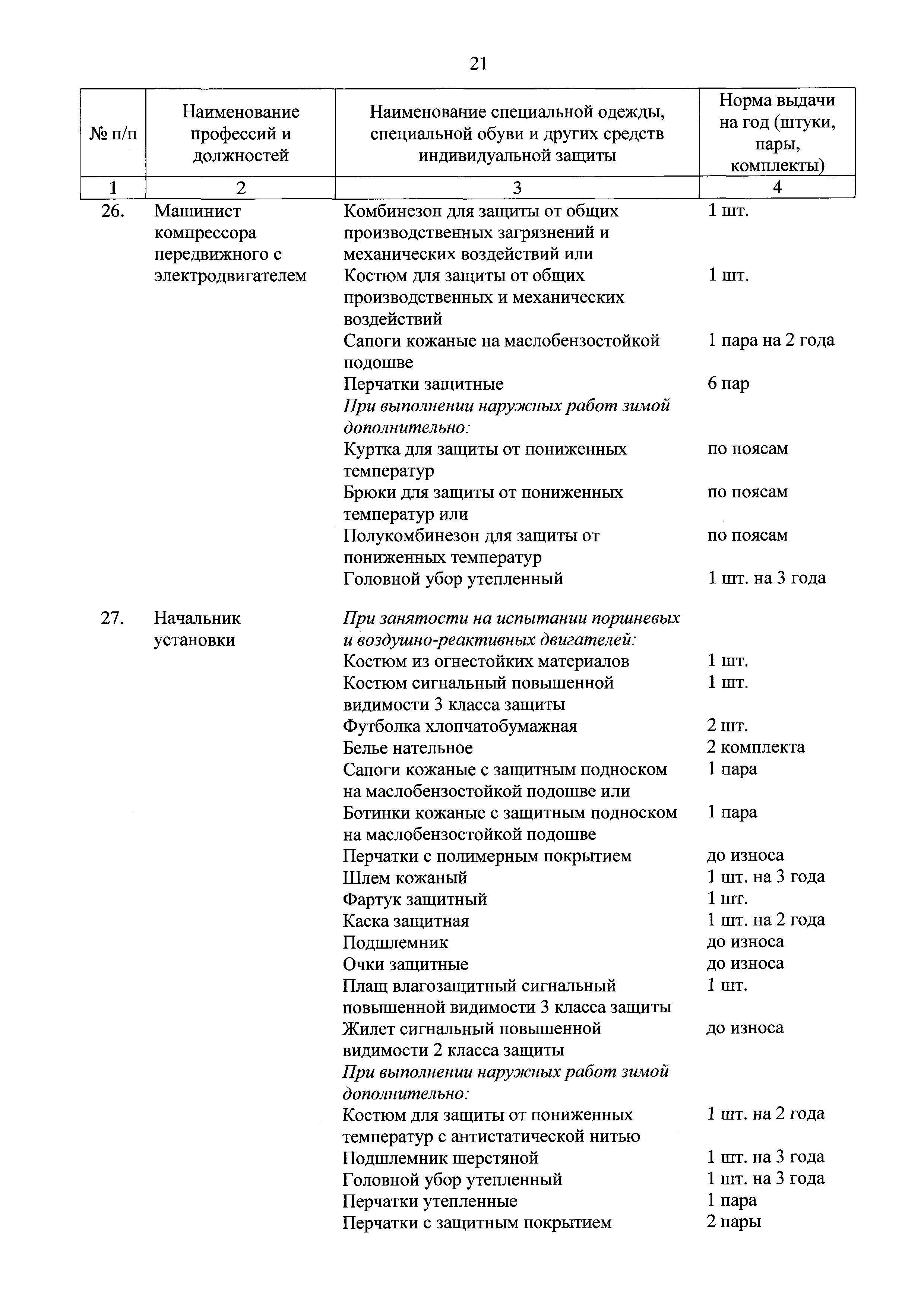 Типовые нормы бесплатной выдачи специальной одежды, специальной обуви и других средств индивидуальной защиты работникам авиационной промышленности, занятым на работах с вредными и (или) опасными условиями труда, а также на работах, выполняемых в особых температурных условиях или связанных с загрязнением| Статус: | действует | | Название рус.: | Типовые нормы бесплатной выдачи специальной одежды, специальной обуви и других средств индивидуальной защиты работникам авиационной промышленности, занятым на работах с вредными и (или) опасными условиями труда, а также на работах, выполняемых в особых температурных условиях или связанных с загрязнением | | Дата добавления в базу: | 01.01.2018 | | Дата актуализации: | 01.01.2021 | | Дата введения: | 01.12.2017 | | Оглавление: | I. Летный состав II. Инженерно-технический состав III. Испытание авиационной техники IV. Службы эксплуатационного содержания аэродромов (вертодромов) V. Персонал испытательных станций авиационных двигателей VI. Персонал испытательных станций двигателей и силовых установок VII. Работники полигона VIII. Производство мягких баков IX. Производство мипоры X. Подразделения неразрушающего контроля XI. Оптическое стекловарение и оптико-механическое производство 1. Оптическое стекловарение 2. Оптико-механическое производство 3. Общие профессии XII. Производство полимерных композиционных материалов (далее - ПКМ) и изделий из них XIII. Производство печатных плат гальваническим способом XIV. Авиаприборостоение. Сборка приборов для ракетно-космической техники XV. Прочие профессии | | Утверждён: | 19.06.2017 Министерство труда и социальной защиты РФ (507н)