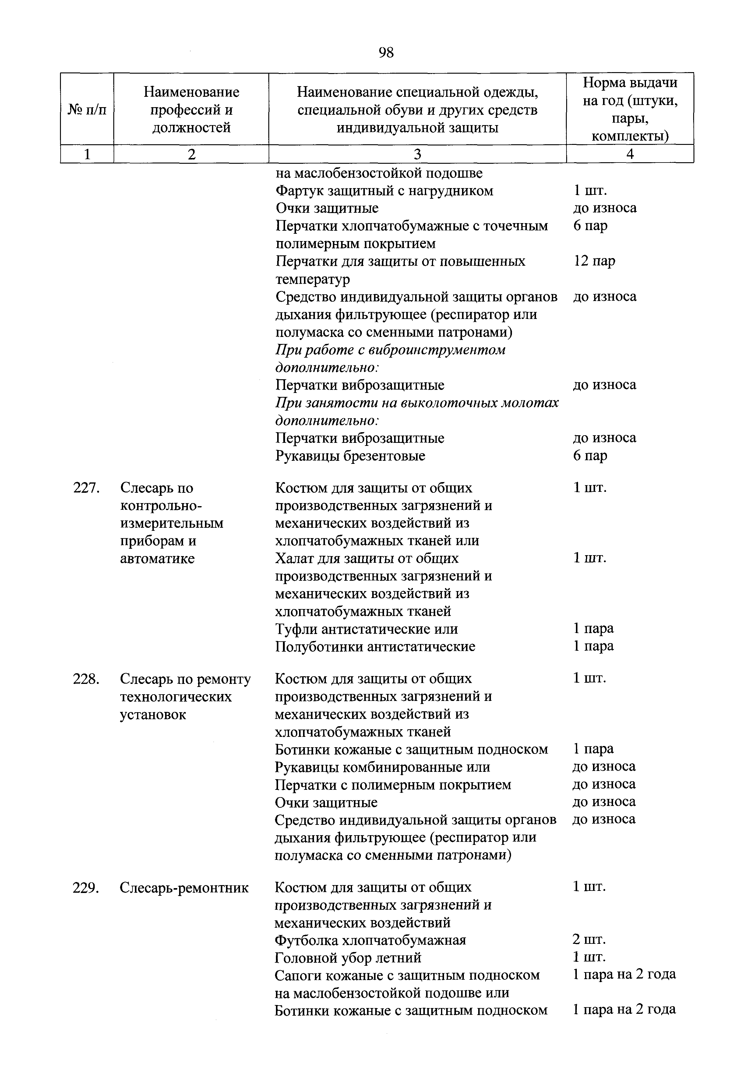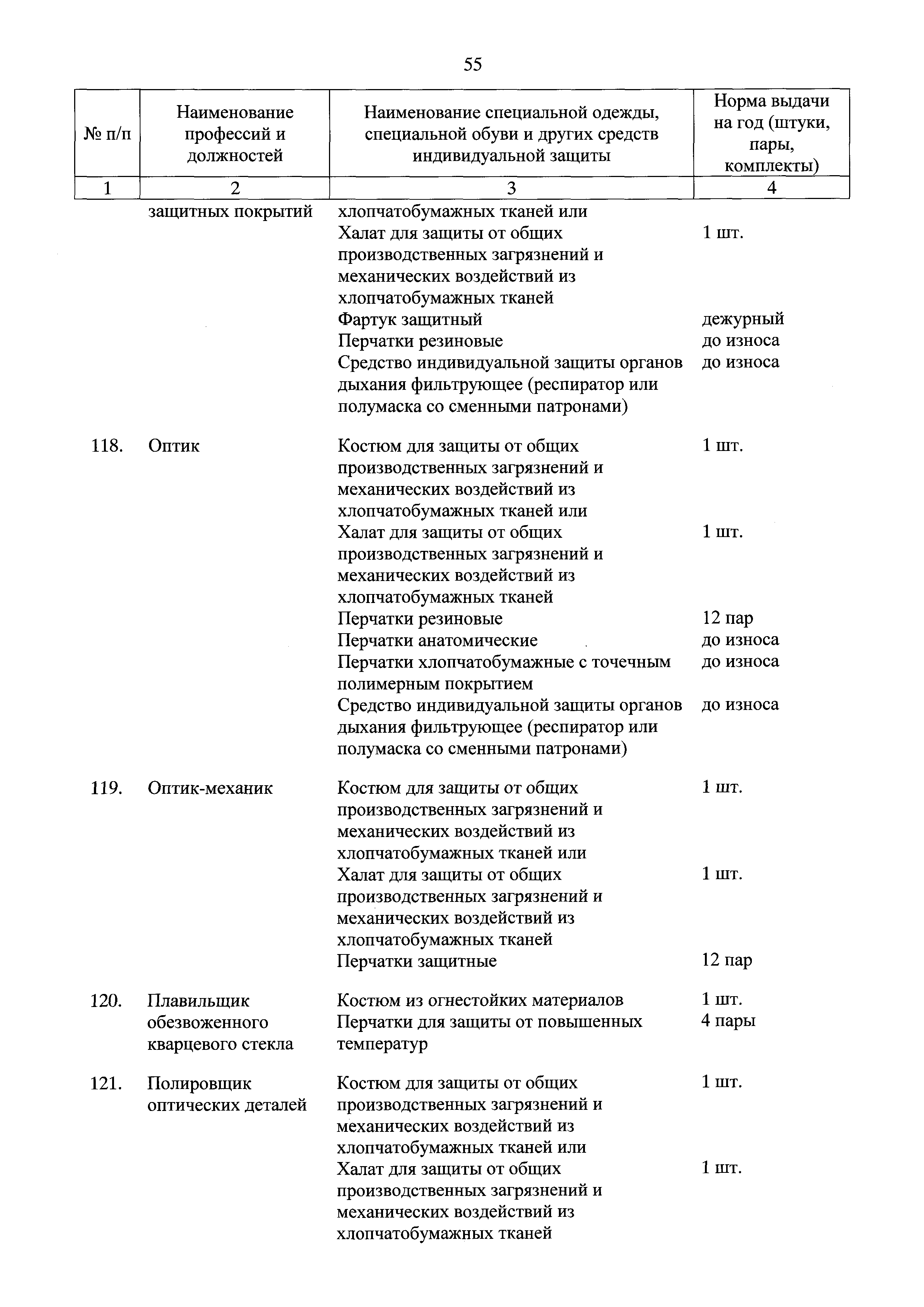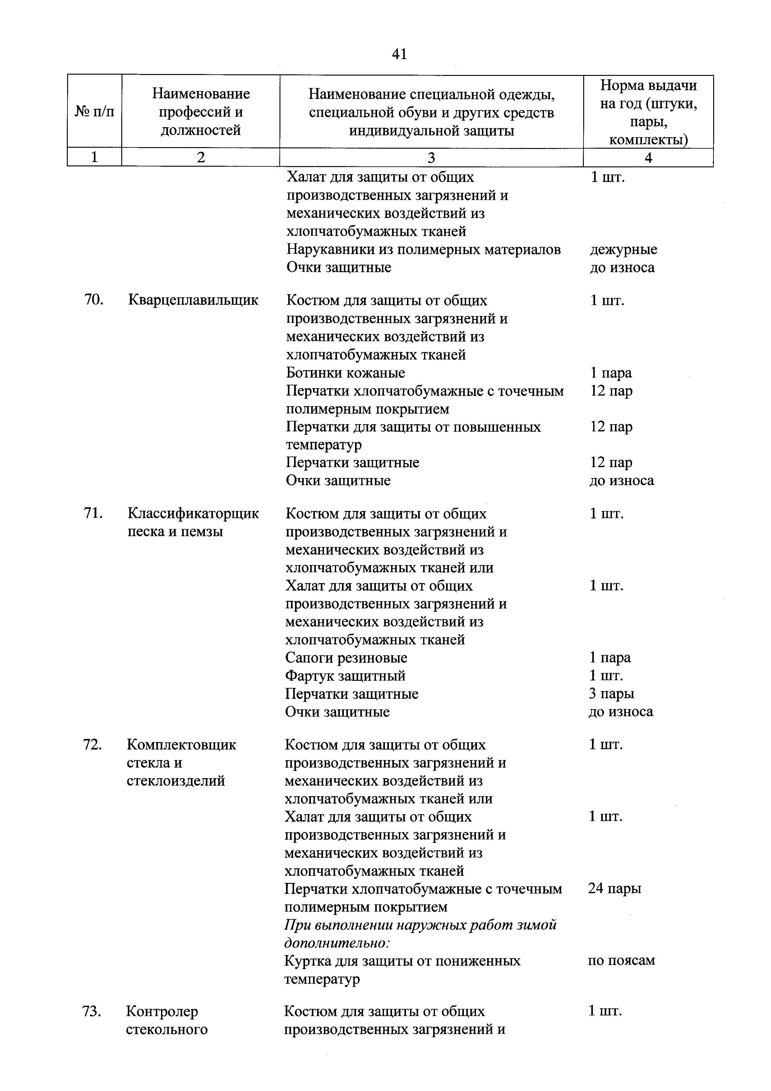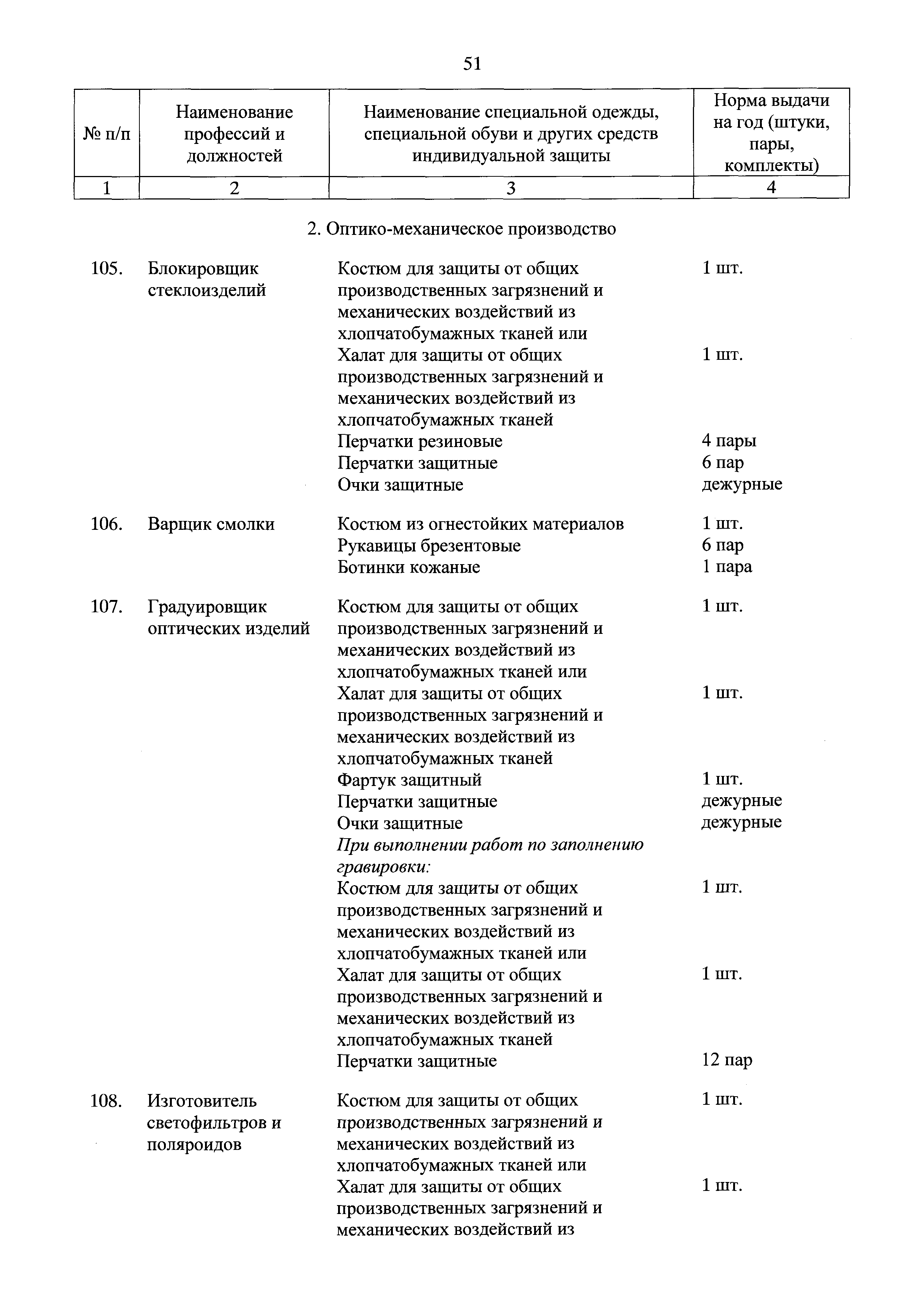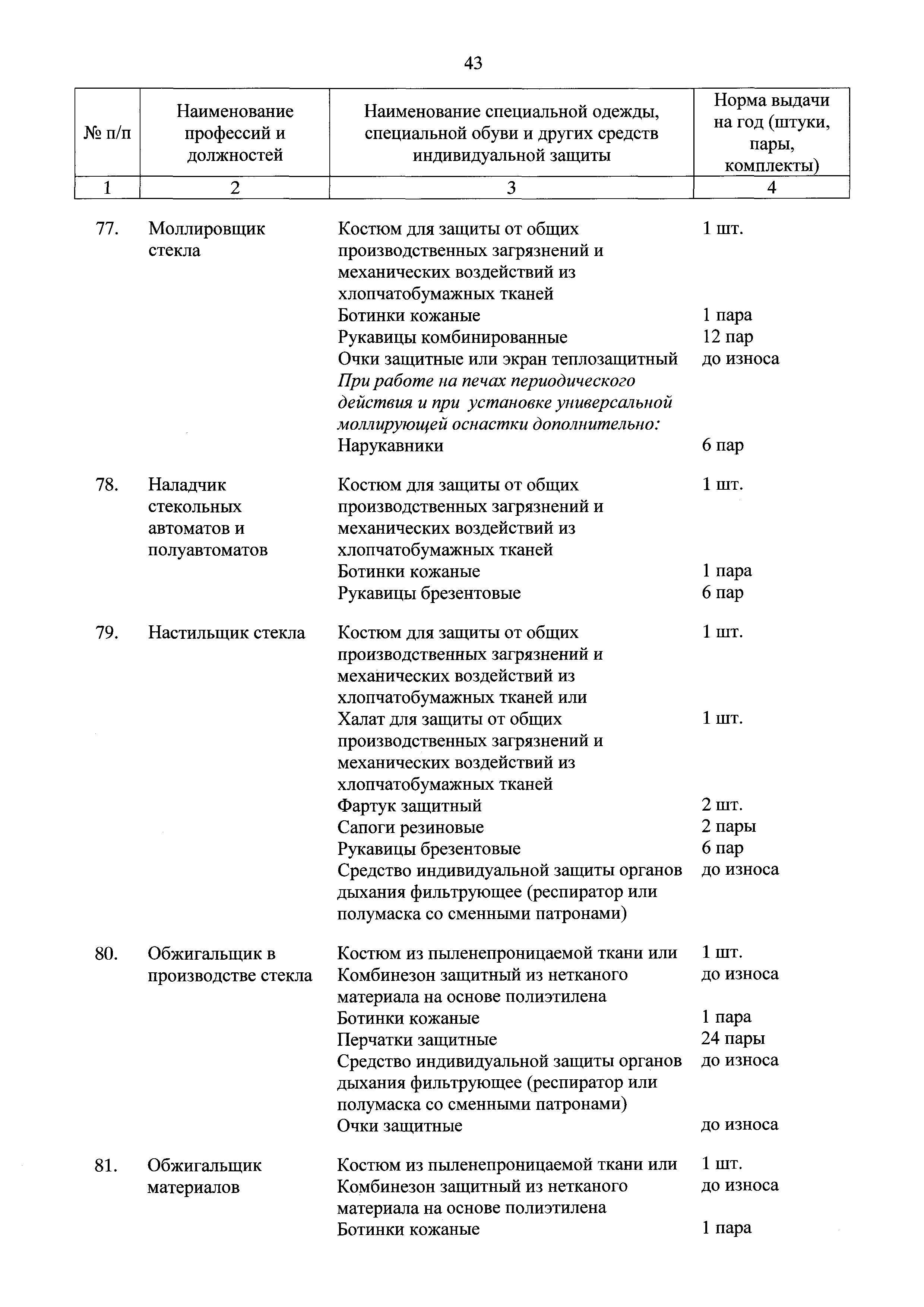 Типовые нормы бесплатной выдачи специальной одежды, специальной обуви и других средств индивидуальной защиты работникам авиационной промышленности, занятым на работах с вредными и (или) опасными условиями труда, а также на работах, выполняемых в особых температурных условиях или связанных с загрязнением| Статус: | действует | | Название рус.: | Типовые нормы бесплатной выдачи специальной одежды, специальной обуви и других средств индивидуальной защиты работникам авиационной промышленности, занятым на работах с вредными и (или) опасными условиями труда, а также на работах, выполняемых в особых температурных условиях или связанных с загрязнением | | Дата добавления в базу: | 01.01.2018 | | Дата актуализации: | 01.01.2021 | | Дата введения: | 01.12.2017 | | Оглавление: | I. Летный состав II. Инженерно-технический состав III. Испытание авиационной техники IV. Службы эксплуатационного содержания аэродромов (вертодромов) V. Персонал испытательных станций авиационных двигателей VI. Персонал испытательных станций двигателей и силовых установок VII. Работники полигона VIII. Производство мягких баков IX. Производство мипоры X. Подразделения неразрушающего контроля XI. Оптическое стекловарение и оптико-механическое производство 1. Оптическое стекловарение 2. Оптико-механическое производство 3. Общие профессии XII. Производство полимерных композиционных материалов (далее - ПКМ) и изделий из них XIII. Производство печатных плат гальваническим способом XIV. Авиаприборостоение. Сборка приборов для ракетно-космической техники XV. Прочие профессии | | Утверждён: | 19.06.2017 Министерство труда и социальной защиты РФ (507н)