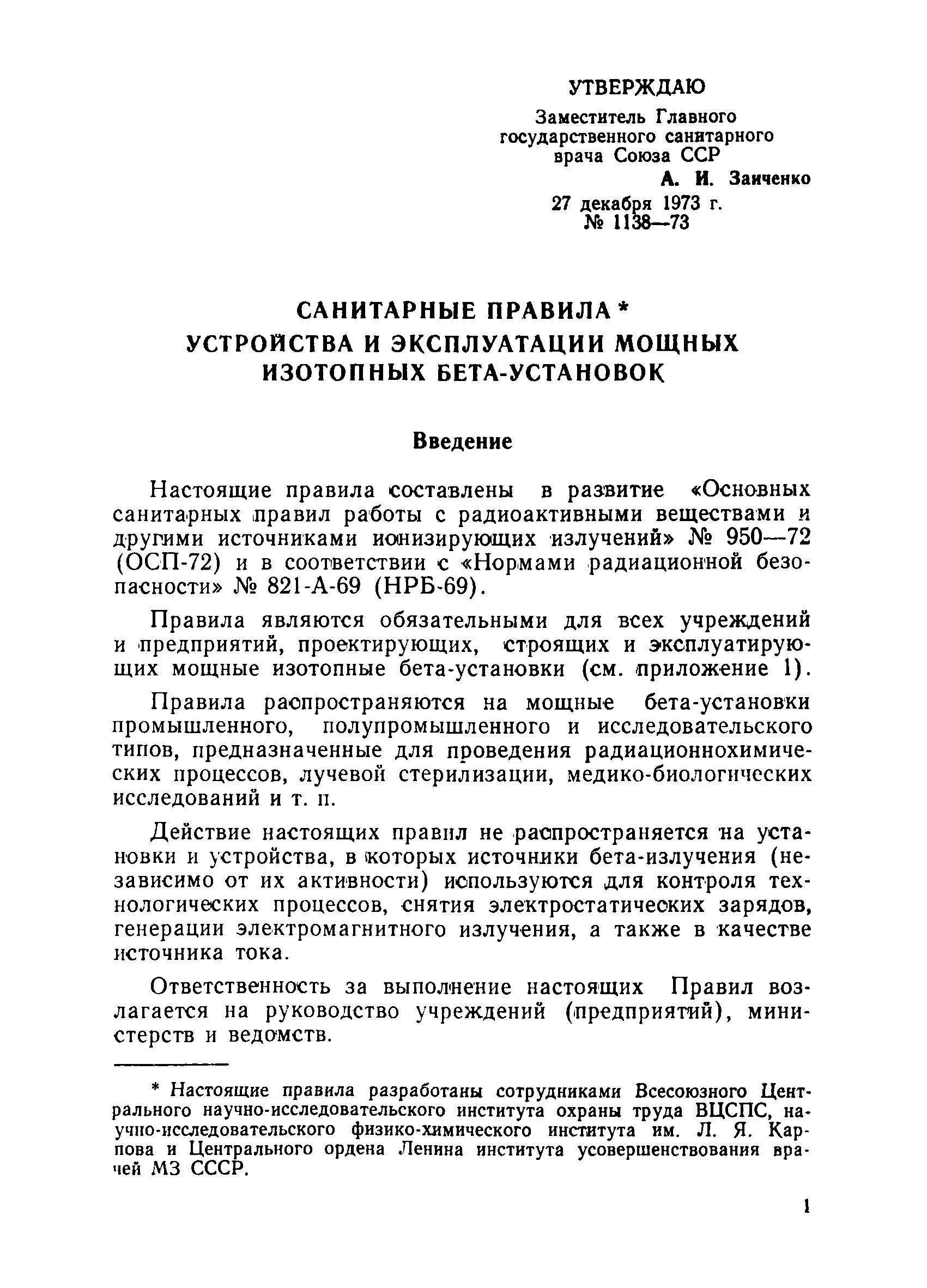 | Утверждён: | 27.12.1973 Заместитель Главного государственного санитарного врача CCCР (1138-73)