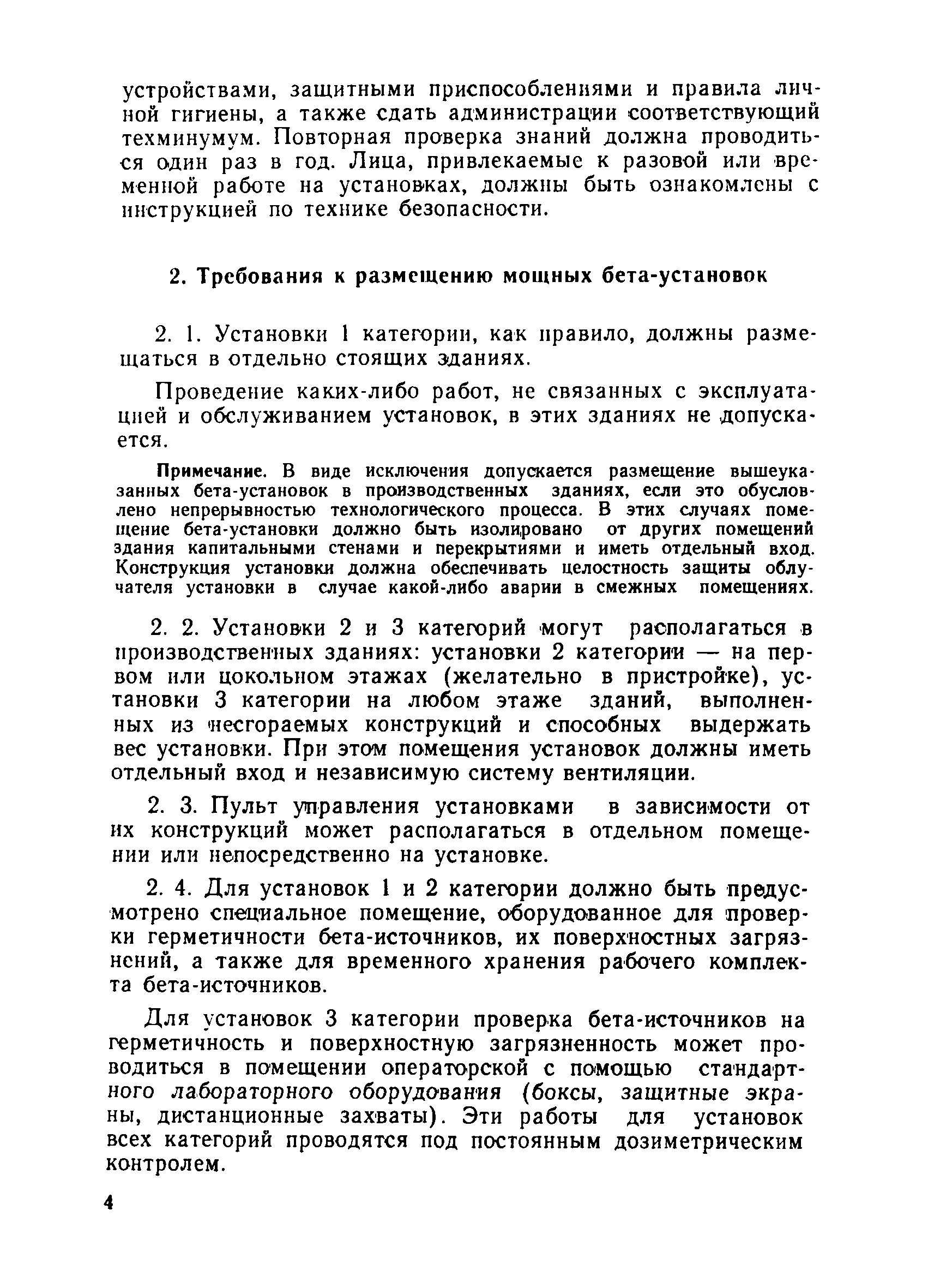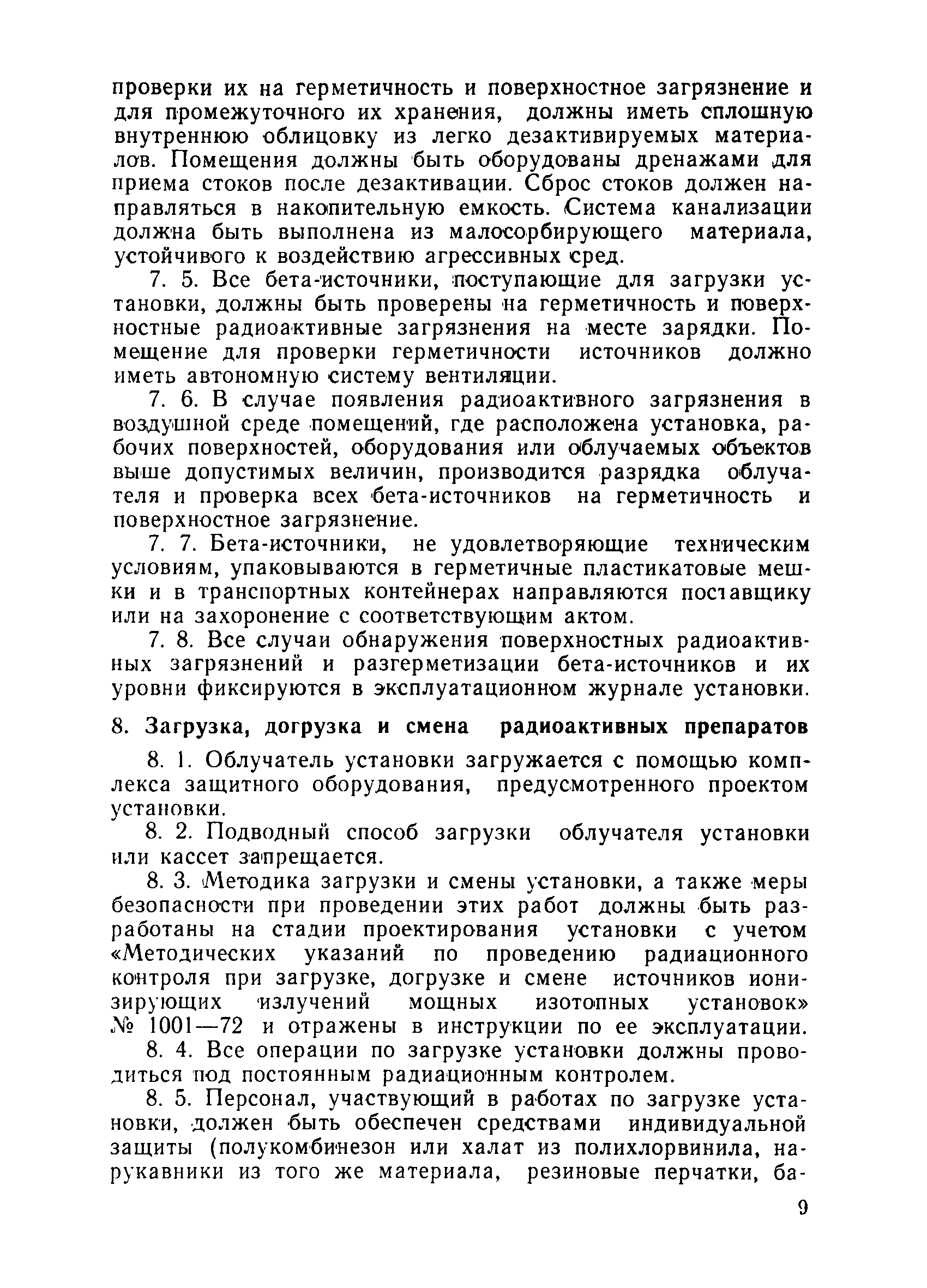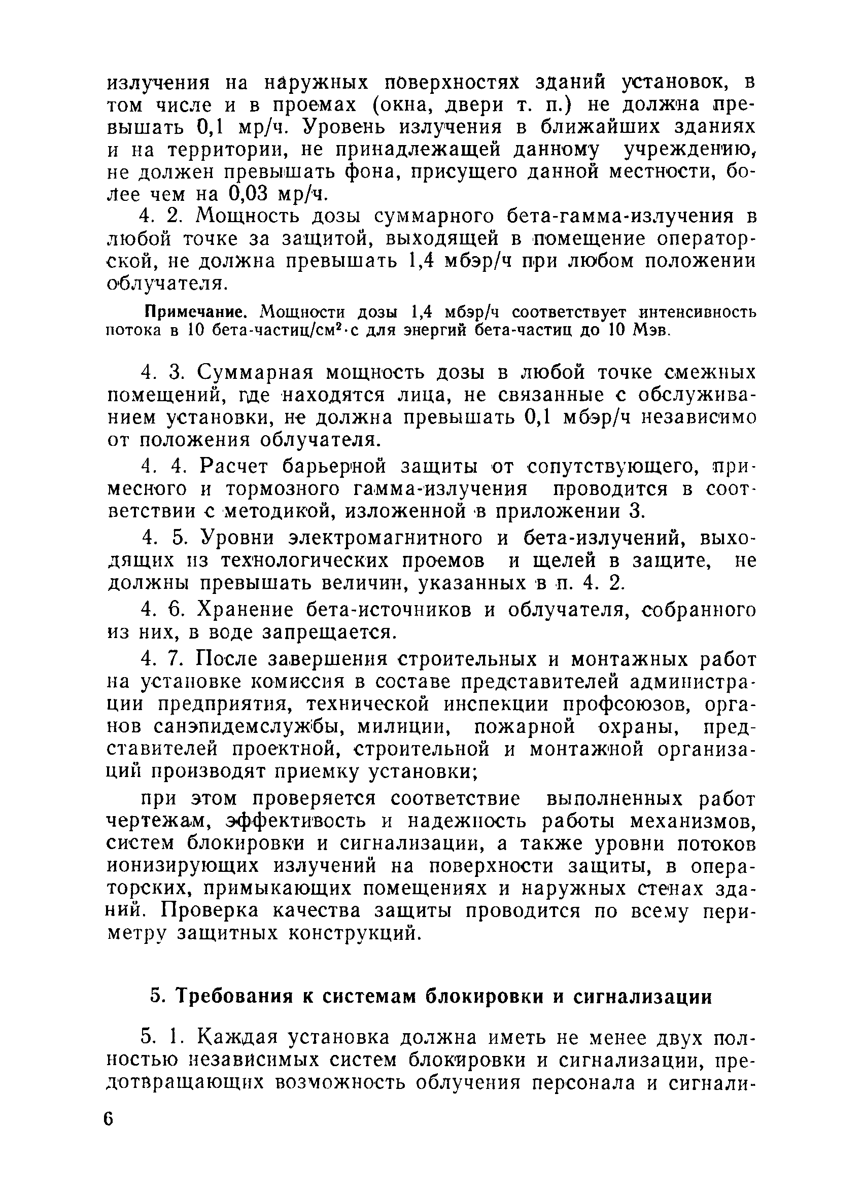 | Оглавление: | Введение 1. Общие положения 2. Требования к размещению мощных бета-установок 3. Конструкция установок 4. Требования к защите 5. Требования к системам блокировки и сигнализации 6. Требования к вентиляции 7. Меры по предупреждению радиоактивных загрязнений и их ликвидация 8. Загрузка, догрузка и смена радиоактивных препаратов 9. Радиационный и профилактический контроль 10. Мероприятия по предупреждению аварий Приложение 1. Основные определения и понятия Приложение 2. Радиационно-физические характеристики некоторых бета-изотопов, применяемых в бета-установках Приложение 3. Расчет биологической защиты мощных бета-установок Приложение 4. Контроль содержания бета-активных аэрозолей в воздухе рабочих помещений |