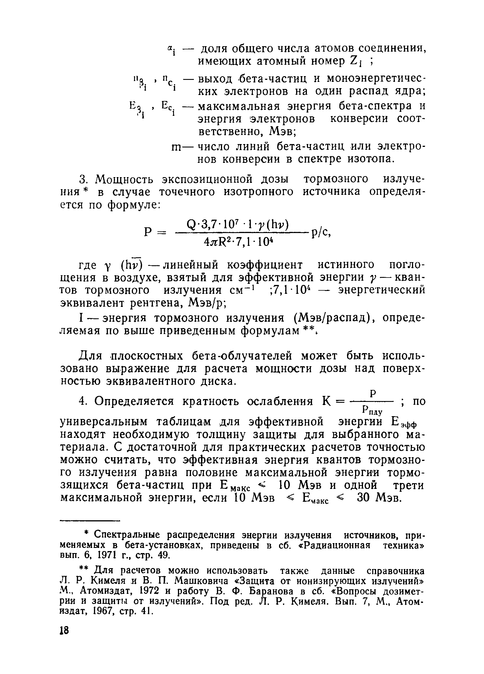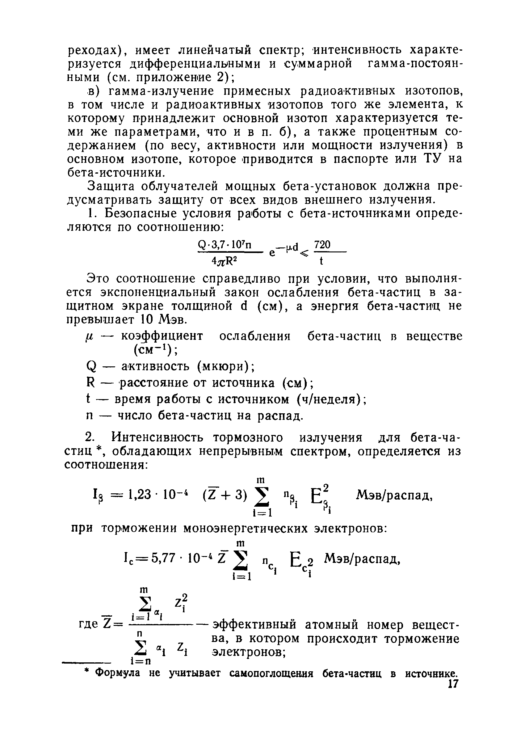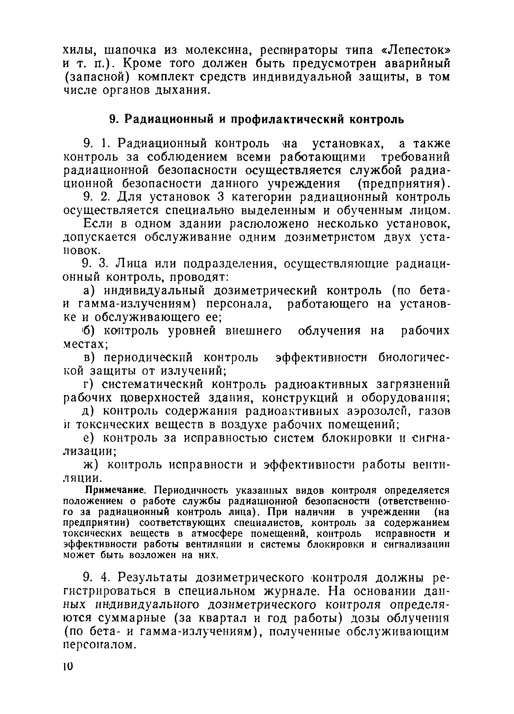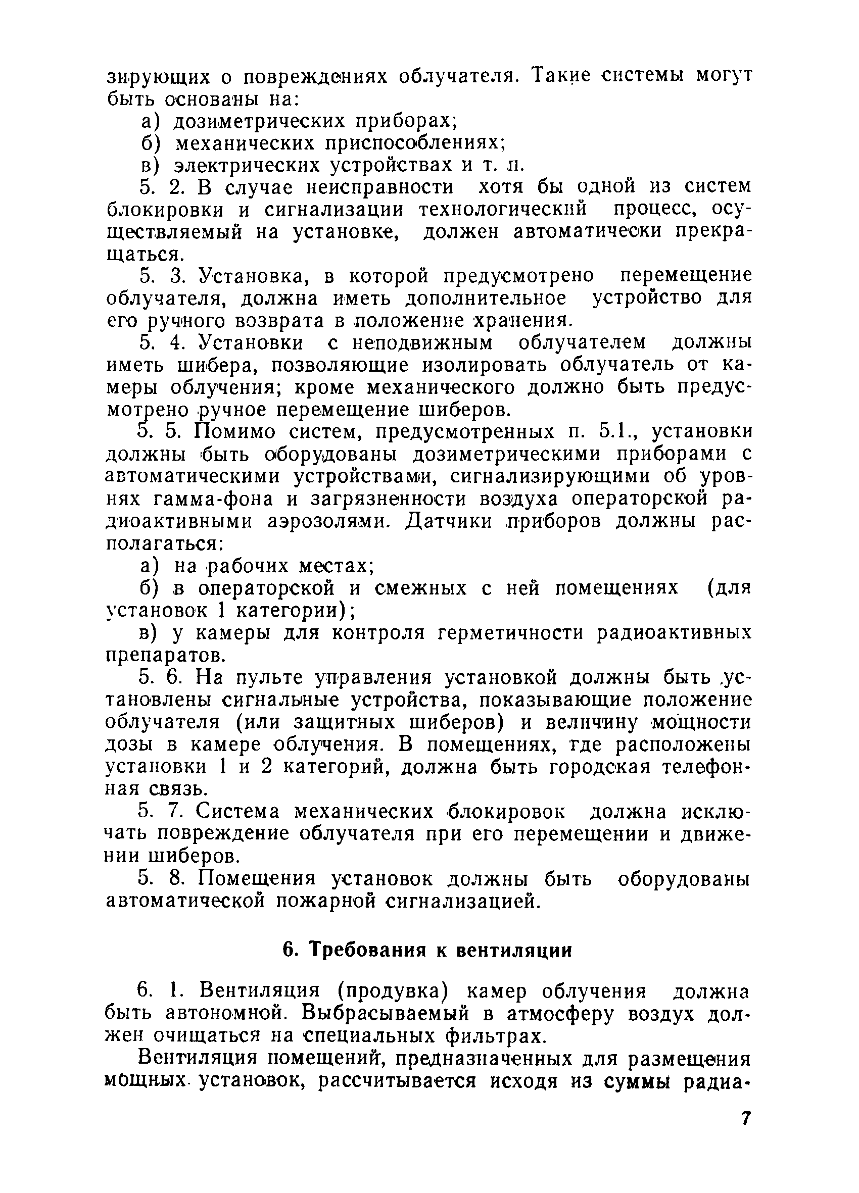 | Оглавление: | Введение 1. Общие положения 2. Требования к размещению мощных бета-установок 3. Конструкция установок 4. Требования к защите 5. Требования к системам блокировки и сигнализации 6. Требования к вентиляции 7. Меры по предупреждению радиоактивных загрязнений и их ликвидация 8. Загрузка, догрузка и смена радиоактивных препаратов 9. Радиационный и профилактический контроль 10. Мероприятия по предупреждению аварий Приложение 1. Основные определения и понятия Приложение 2. Радиационно-физические характеристики некоторых бета-изотопов, применяемых в бета-установках Приложение 3. Расчет биологической защиты мощных бета-установок Приложение 4. Контроль содержания бета-активных аэрозолей в воздухе рабочих помещений |