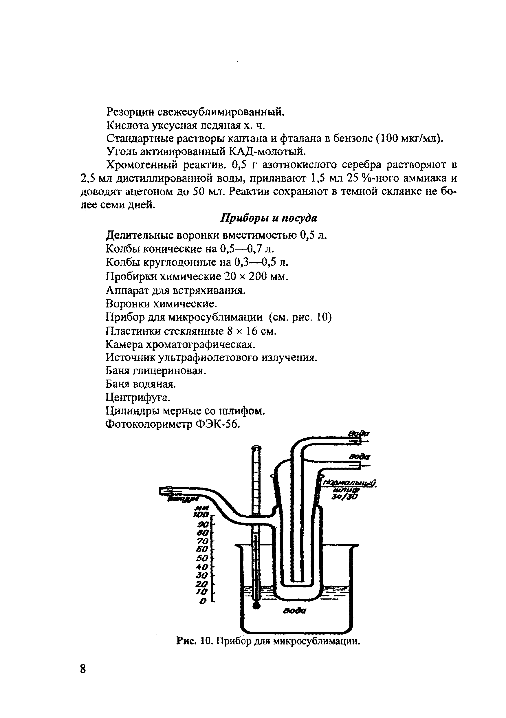 Хроматографическое (ТСХ) и колориметрическое определение каптана и фталана в вине, виноградном соке, листьях и ягодах винограда, яблоках, почве и воде| Статус: | действует | | Название рус.: | Хроматографическое (ТСХ) и колориметрическое определение каптана и фталана в вине, виноградном соке, листьях и ягодах винограда, яблоках, почве и воде | | Дата добавления в базу: | 01.01.2018 | | Дата актуализации: | 01.01.2021 | | Оглавление: | Реактивы и растворы Приборы и посуда Приготовление пластинок | | Разработан: | ВНИИ биологических методов защиты растений