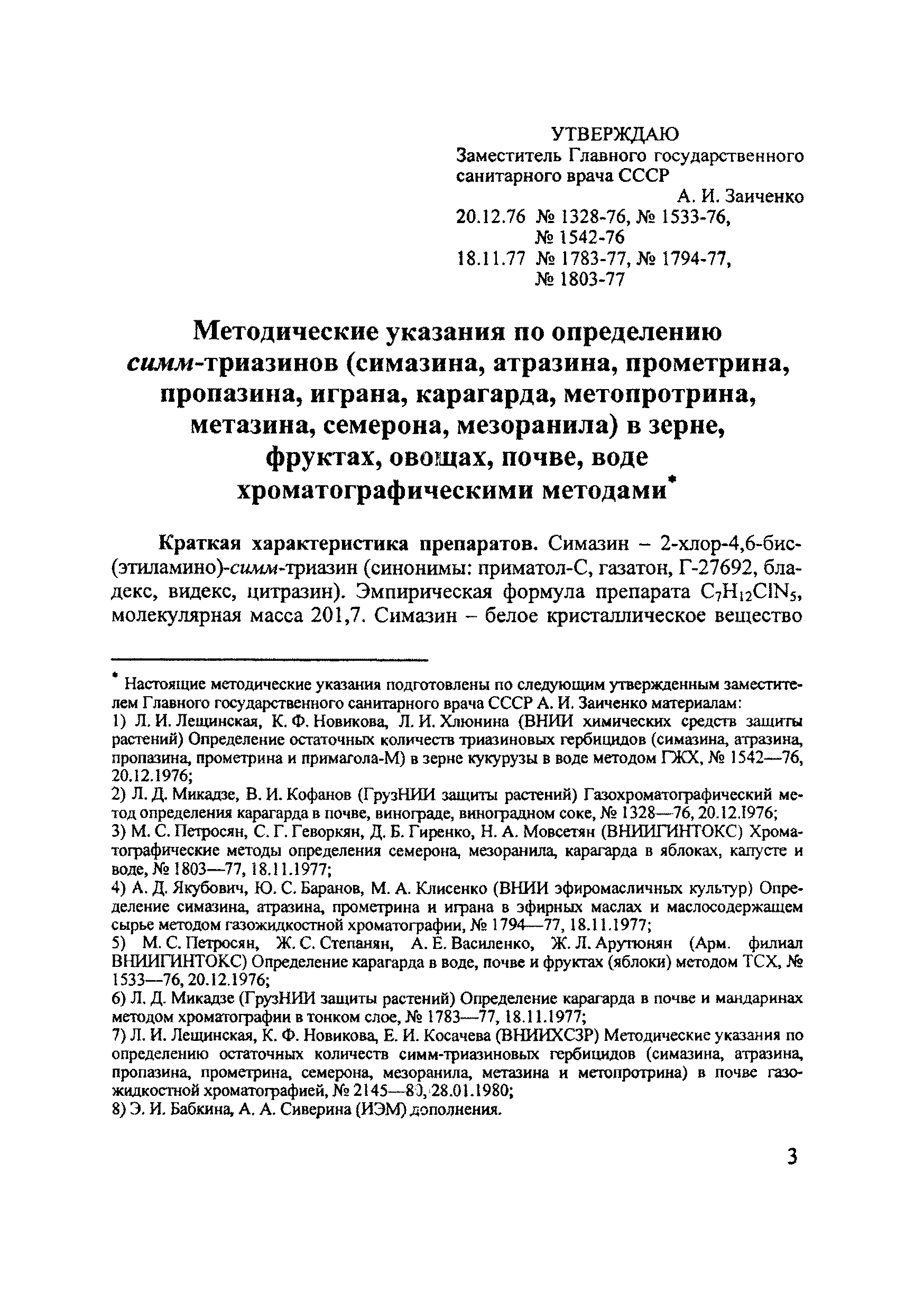| | Утверждён: | 20.12.1976 Заместитель Главного государственного санитарного врача CCCР (1328-76) 20.12.1976 Заместитель Главного государственного санитарного врача CCCР (1533-76) 20.12.1976 Заместитель Главного государственного санитарного врача CCCР (1542-76) 18.11.1977 Заместитель Главного государственного санитарного врача CCCР (1783-77) 18.11.1977 Заместитель Главного государственного санитарного врача CCCР (1794-77) 18.11.1977 Заместитель Главного государственного санитарного врача CCCР (1803-77)