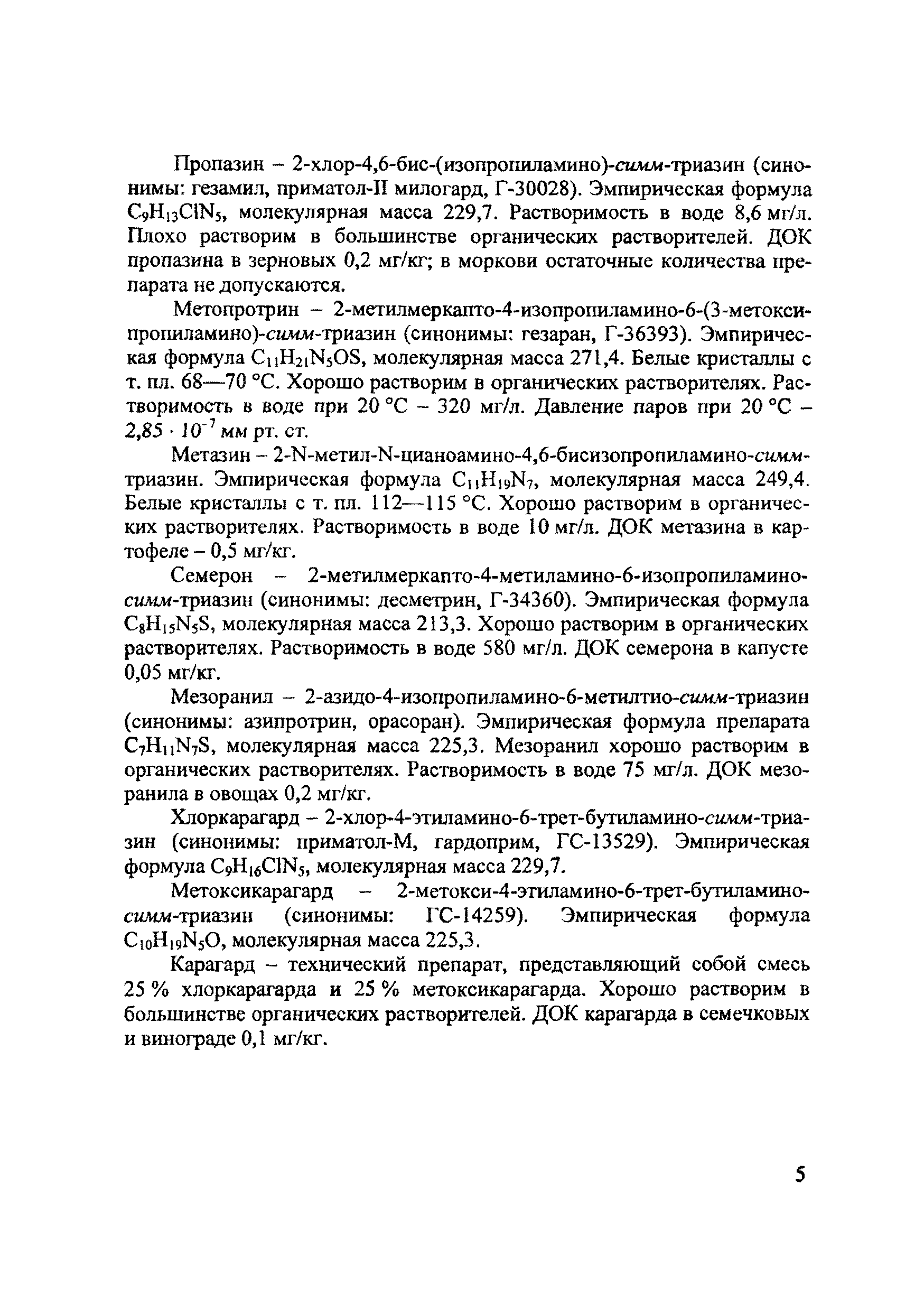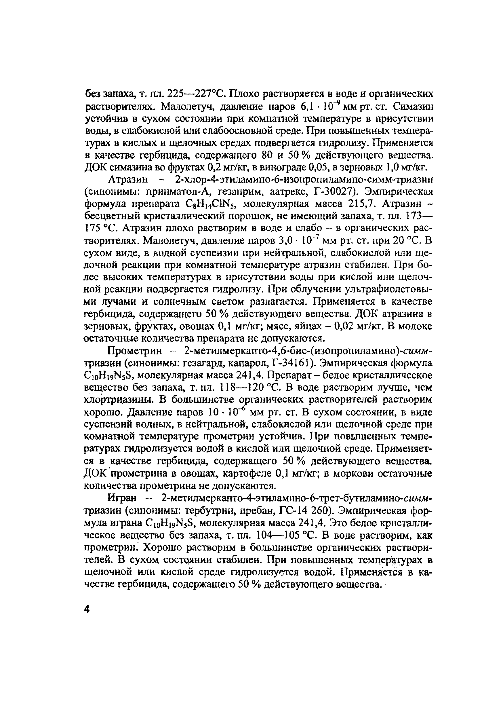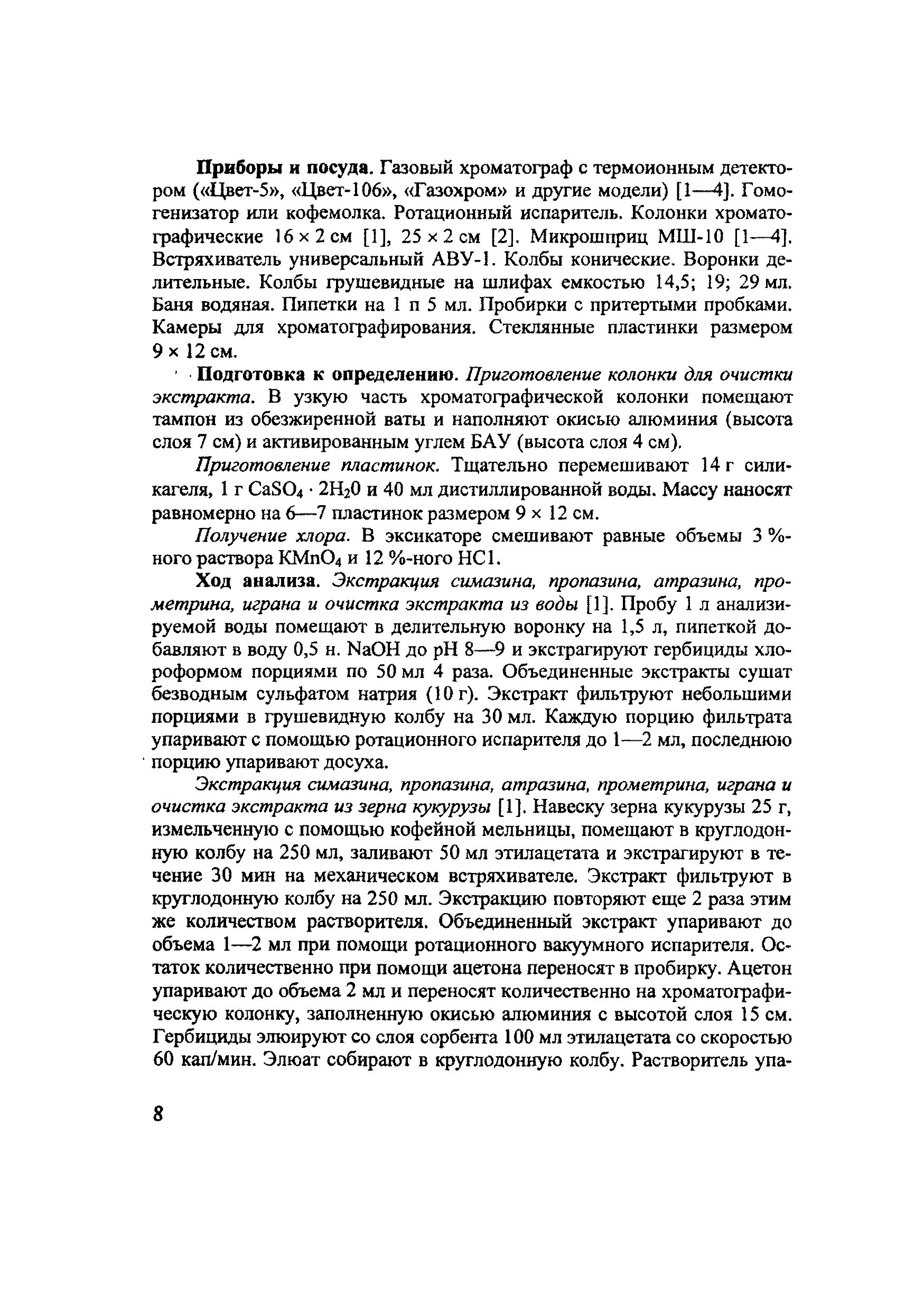 Методические указания по определению симм-триазинов (симазина, атразина, прометрина, пропазина, играна, карагарда, метопротрина, метазина, семерона, мезоранила) в зерне, фруктах, овощах, почве, воде хроматографическими методами| Статус: | действует | | Название рус.: | Методические указания по определению симм-триазинов (симазина, атразина, прометрина, пропазина, играна, карагарда, метопротрина, метазина, семерона, мезоранила) в зерне, фруктах, овощах, почве, воде хроматографическими методами | | Дата добавления в базу: | 01.01.2018 | | Дата актуализации: | 01.01.2021 | | Оглавление: | Краткая характеристика препаратов Методика определения атразина, играна, карагарда, мезоранила, прометрина, пропазина, семерона, симазина в зерне кукурузы, яблоках, винограде, мандаринах, капусте, почве, воде газо-жидкостной и тонкослойной хроматографией Основные положения Принцип метода Метрологическая характеристика метода газо-жидкостной хроматографии Приборы и посуда Подготовка к определению Ход анализа Обработка результатов анализа | | Разработан: | ВНИИГИНТОКС ВНИИ химических средств защиты растений ВНИИХСЗР ВНИИГИНТОКС филиал ВНИИ эфиромасличных культур ГрузНИИ защиты растений