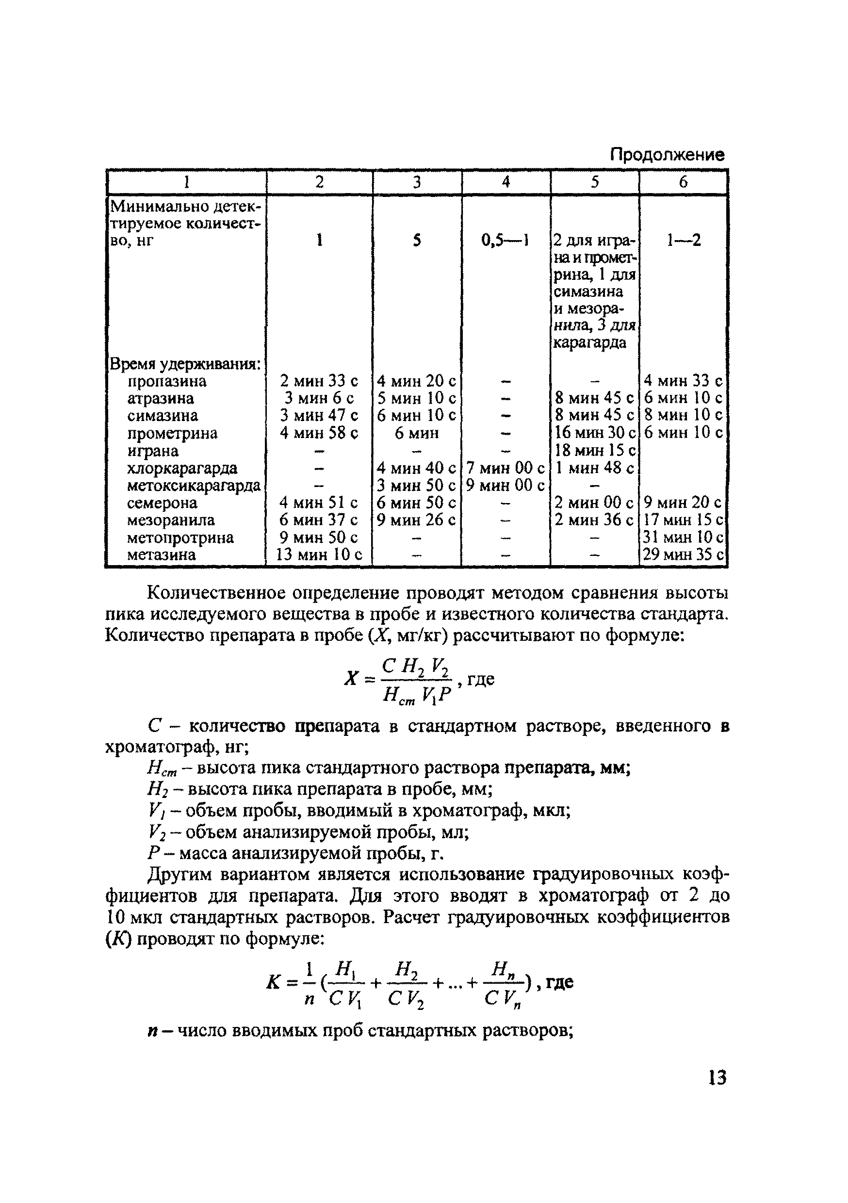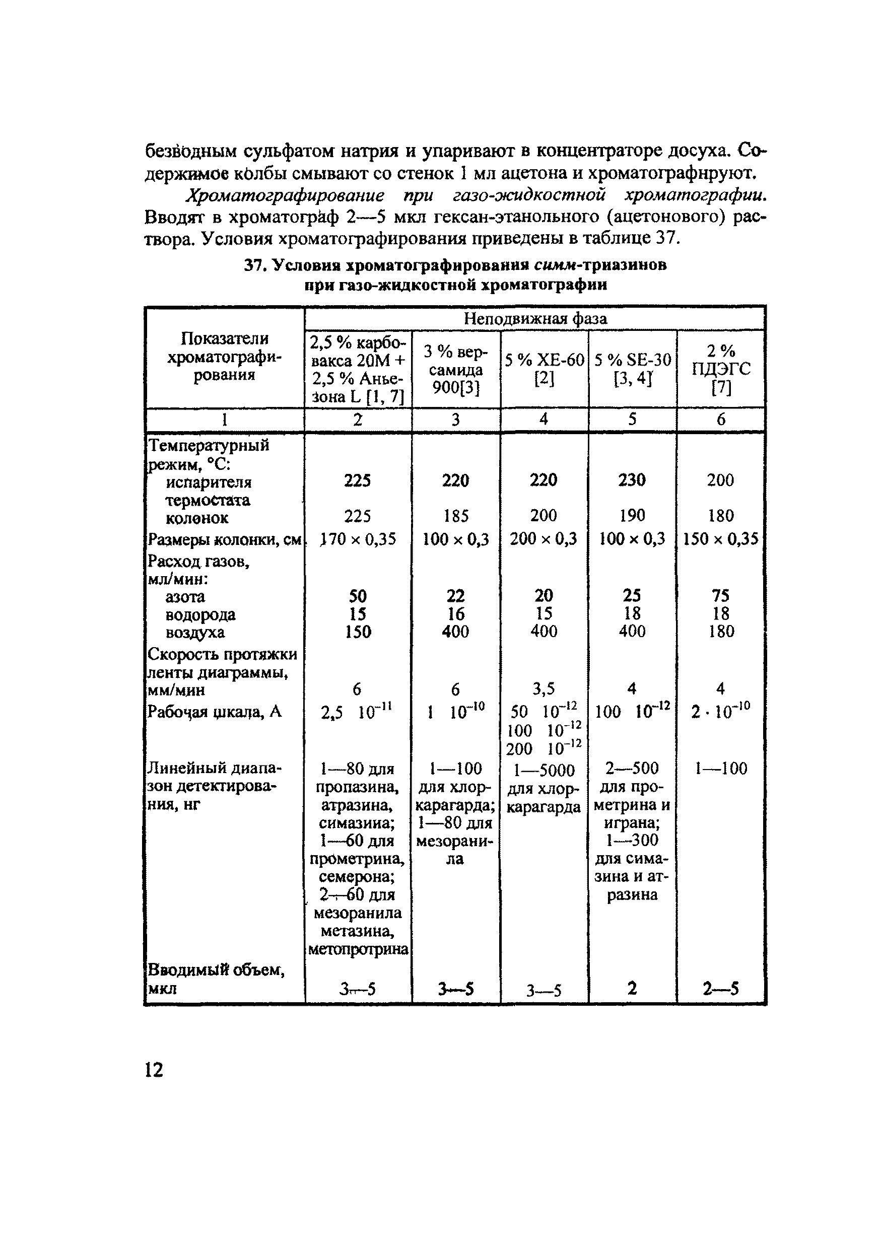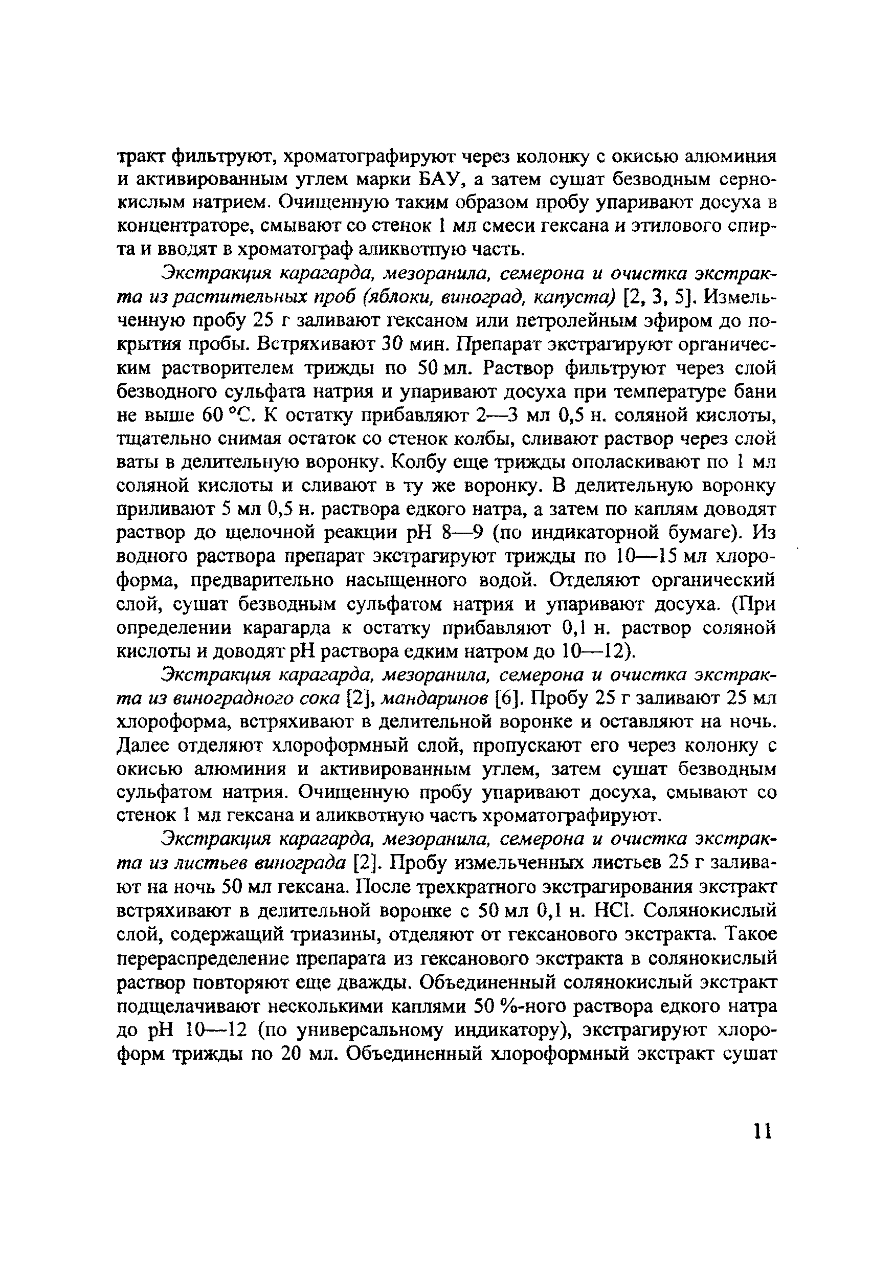 Методические указания по определению симм-триазинов (симазина, атразина, прометрина, пропазина, играна, карагарда, метопротрина, метазина, семерона, мезоранила) в зерне, фруктах, овощах, почве, воде хроматографическими методами| Статус: | действует | | Название рус.: | Методические указания по определению симм-триазинов (симазина, атразина, прометрина, пропазина, играна, карагарда, метопротрина, метазина, семерона, мезоранила) в зерне, фруктах, овощах, почве, воде хроматографическими методами | | Дата добавления в базу: | 01.01.2018 | | Дата актуализации: | 01.01.2021 | | Оглавление: | Краткая характеристика препаратов Методика определения атразина, играна, карагарда, мезоранила, прометрина, пропазина, семерона, симазина в зерне кукурузы, яблоках, винограде, мандаринах, капусте, почве, воде газо-жидкостной и тонкослойной хроматографией Основные положения Принцип метода Метрологическая характеристика метода газо-жидкостной хроматографии Приборы и посуда Подготовка к определению Ход анализа Обработка результатов анализа | | Разработан: | ВНИИГИНТОКС ВНИИ химических средств защиты растений ВНИИХСЗР ВНИИГИНТОКС филиал ВНИИ эфиромасличных культур ГрузНИИ защиты растений