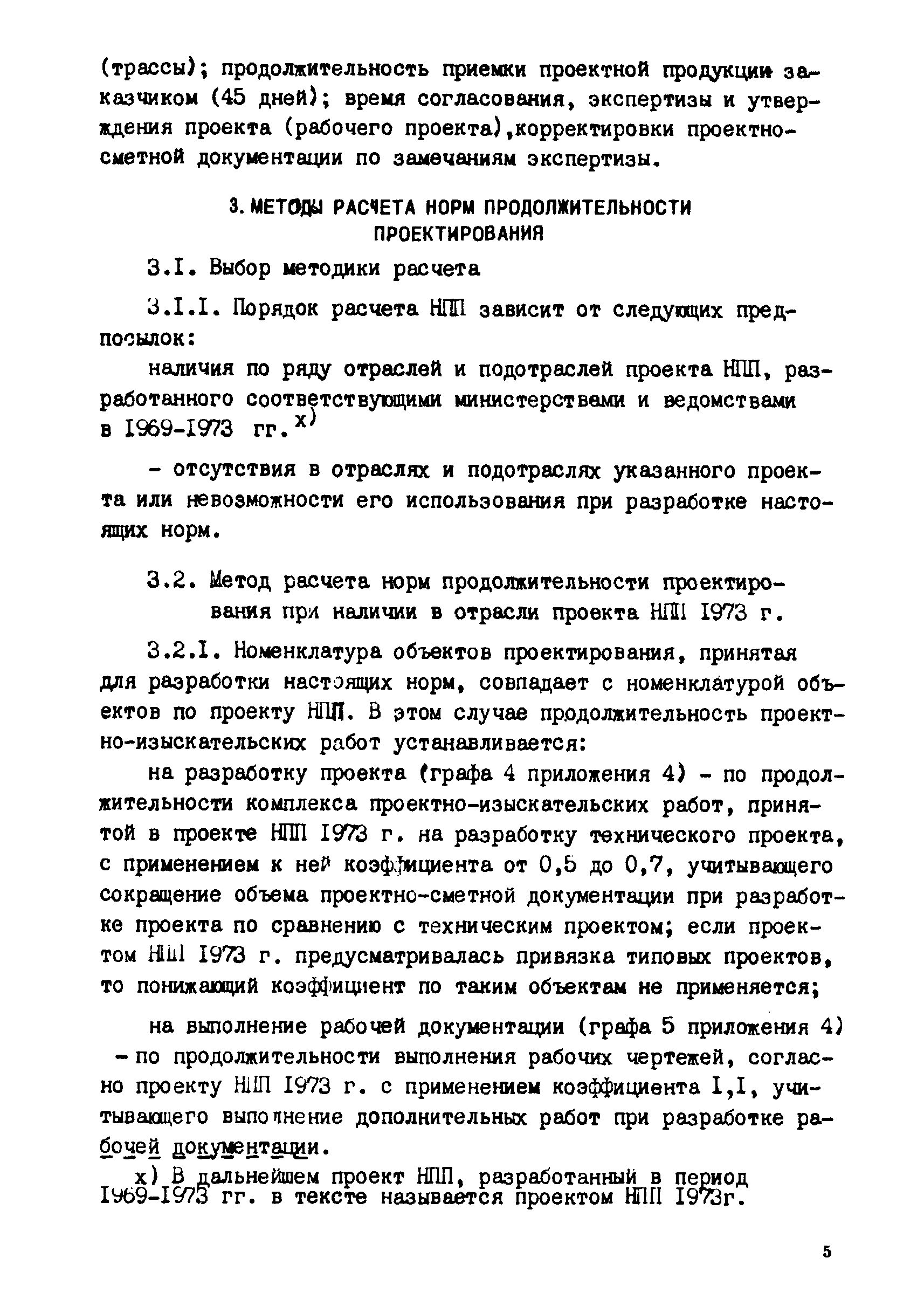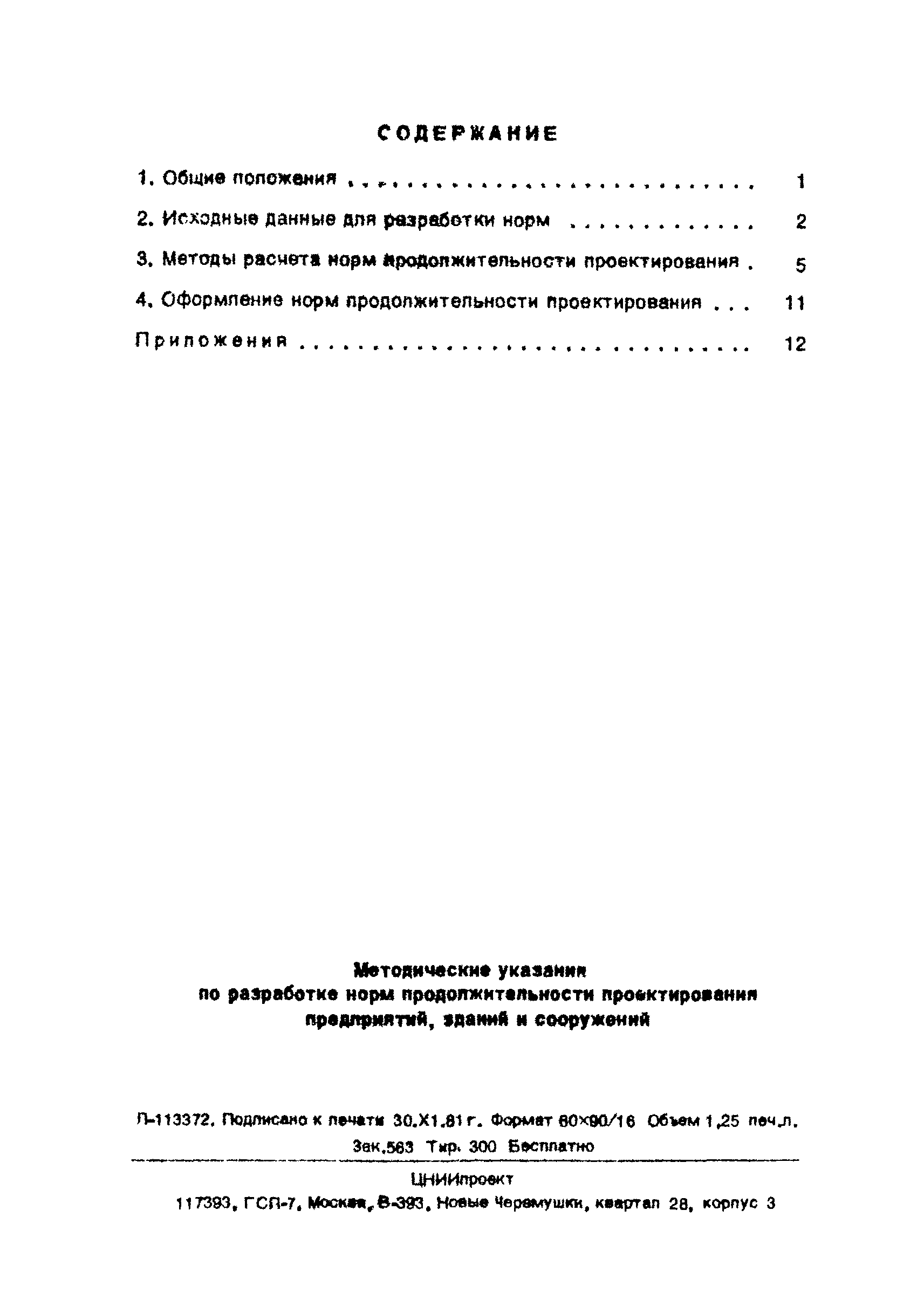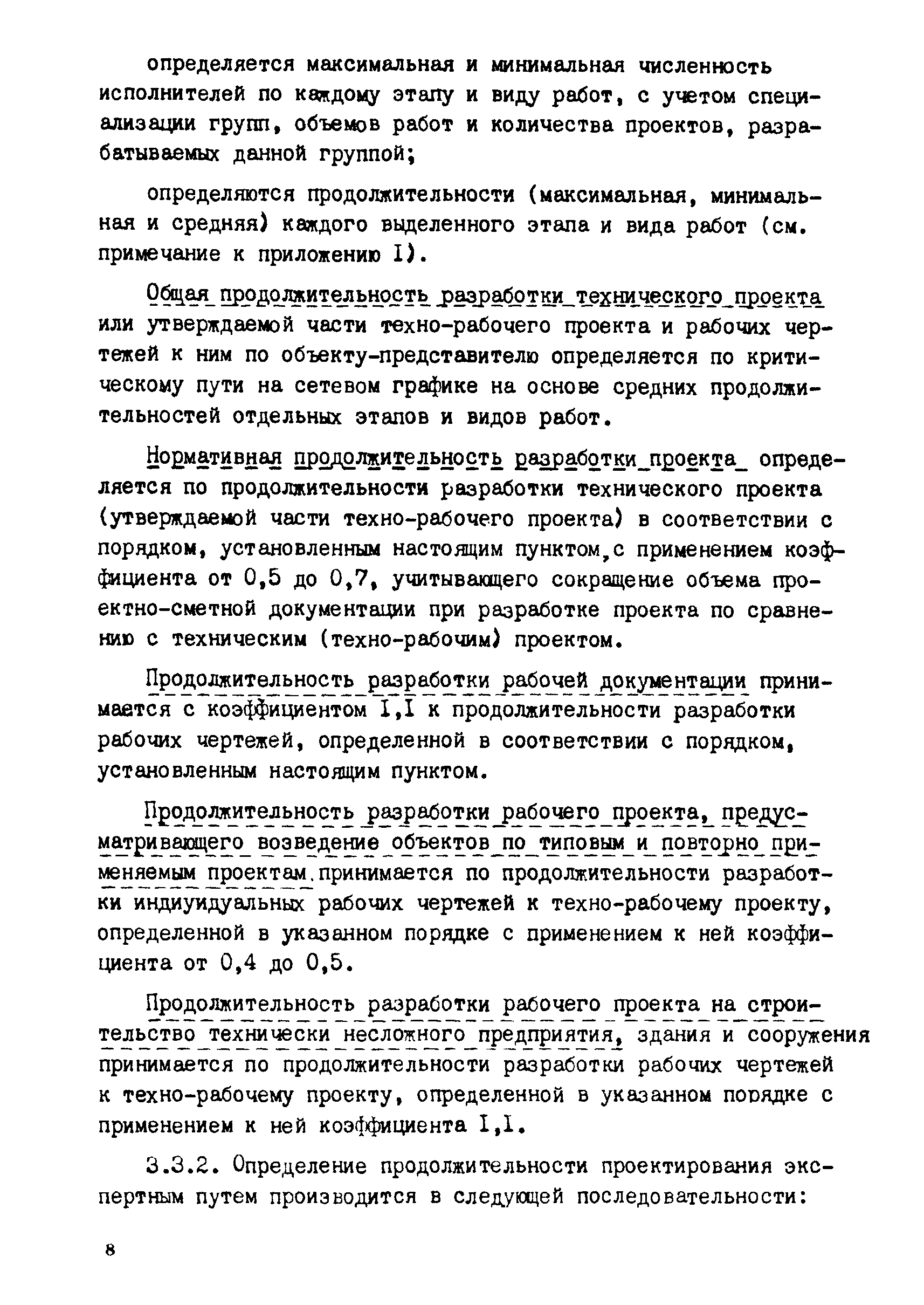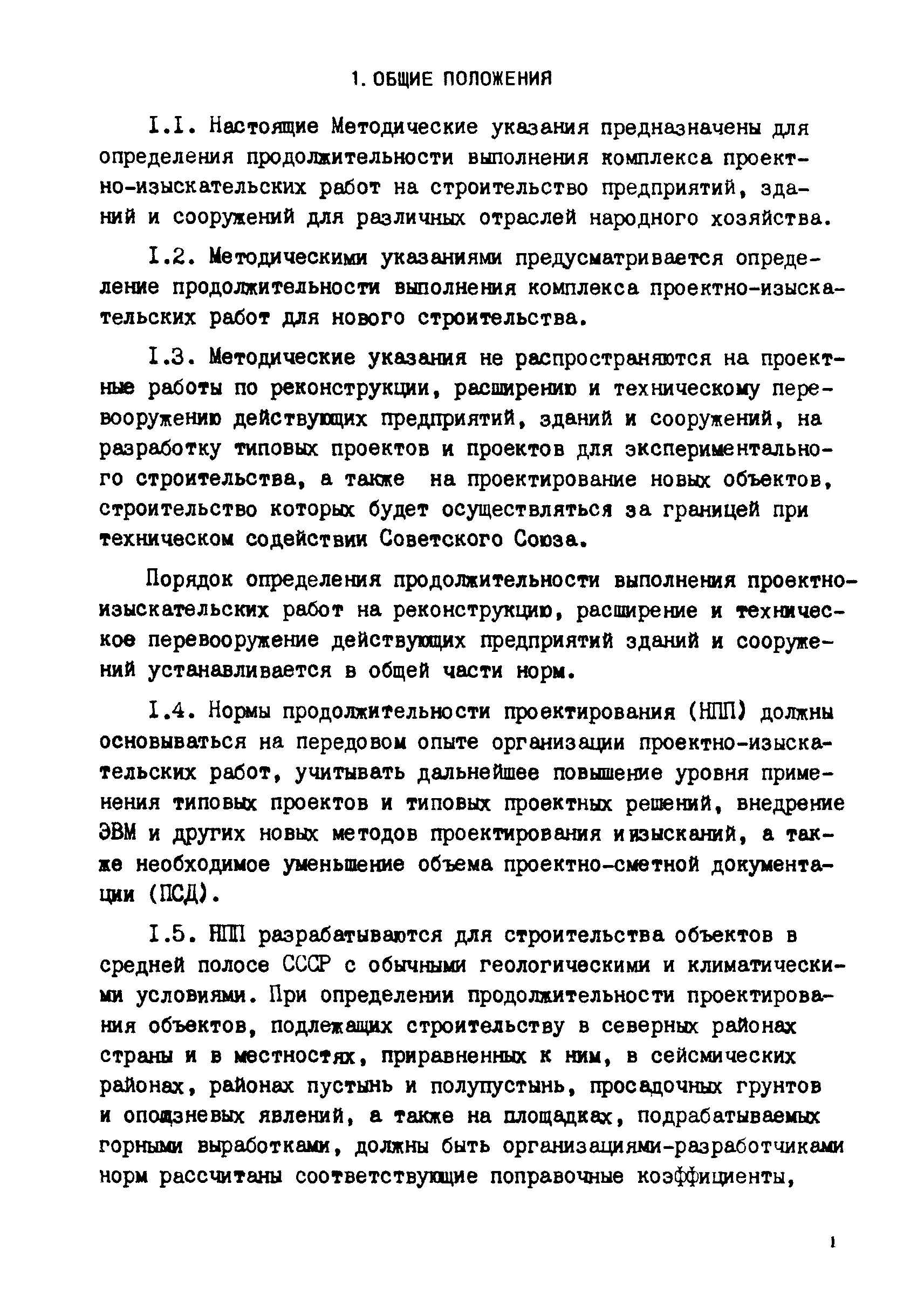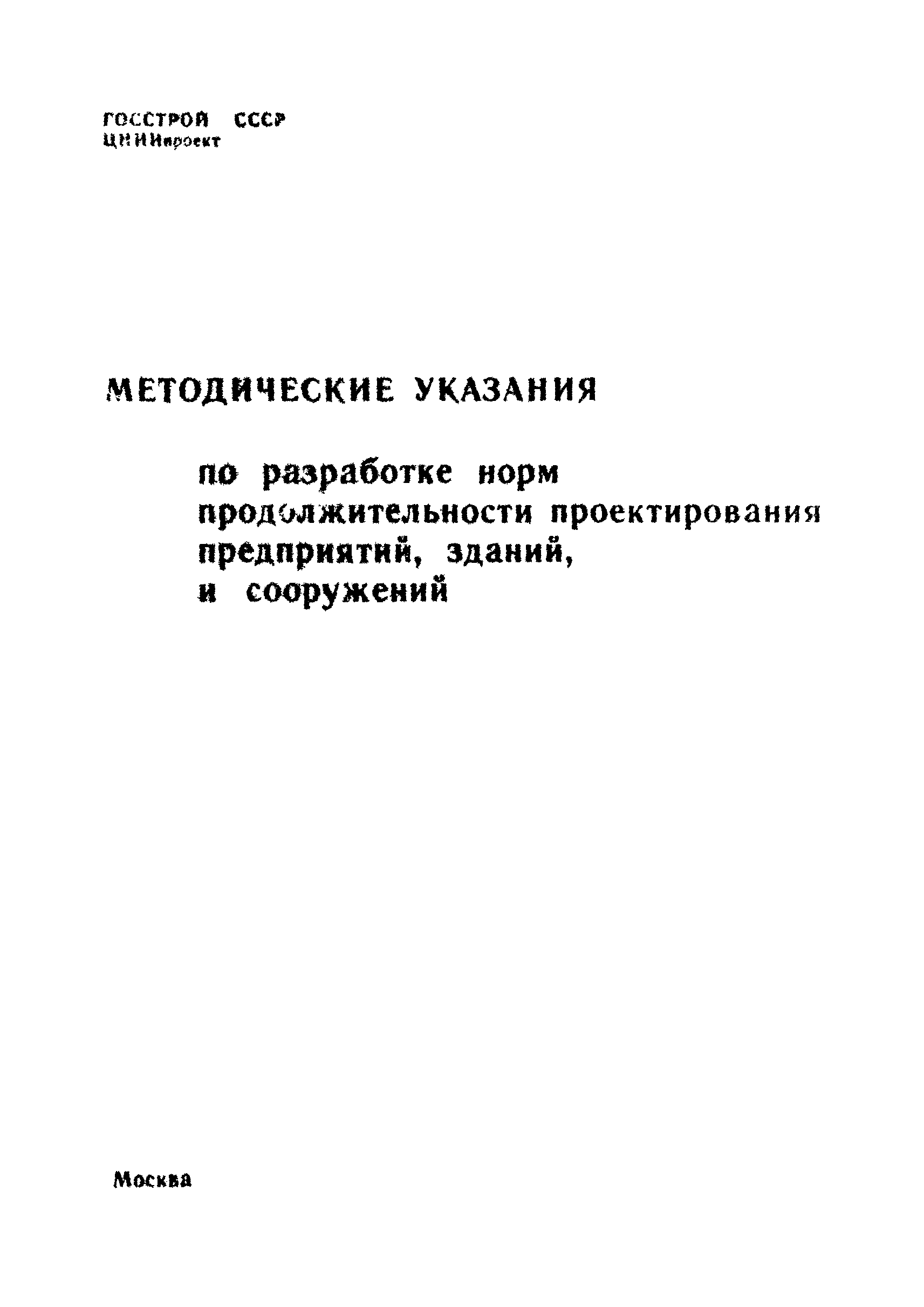 Методические указания по разработке норм продолжительности проектирования предприятий, зданий и сооружений| Статус: | справочные материалы, мп, тпр | | Название рус.: | Методические указания по разработке норм продолжительности проектирования предприятий, зданий и сооружений | | Дата добавления в базу: | 01.01.2019 | | Дата актуализации: | 01.01.2021 | | Область применения: | Методические указания предназначены для определения продолжительности выполнения комплекса проектно-изыскательских работ на новое строительство предприятий, зданий и сооружений в различных отраслях народного хозяйства. В указаниях приведены предпосылки, из которых следует исходить при выборе метода расчета норм продолжительности проектирования, порядок расчета, элементы оформления разработанных норм продолжительности проектирования. | | Оглавление: | 1 Общие положения 2 Исходные данные для разработки норм 3 Методы расчета норм продолжительности проектирования 4 Оформление норм продолжительности проектирования Приложение 1. Расчет трудоемкости и продолжительности работ по объекту-представителю (наименование объекта) Приложение 2. Таблица экспертных оценок продолжительностей этапов и видов работ по объекту-представителю Приложение 3. Сопоставительная таблица продолжительности разработки ПСД по объектам-представителям Приложение 4. Нормы продолжительности проектирования предприятий, зданий и сооружений Приложение 5. Сведения о фактической продолжительности проектирования по отдельным объектам-представителям | | Разработан: | ЦНИИпроект Госстроя России ЦИТП Госстроя СССР