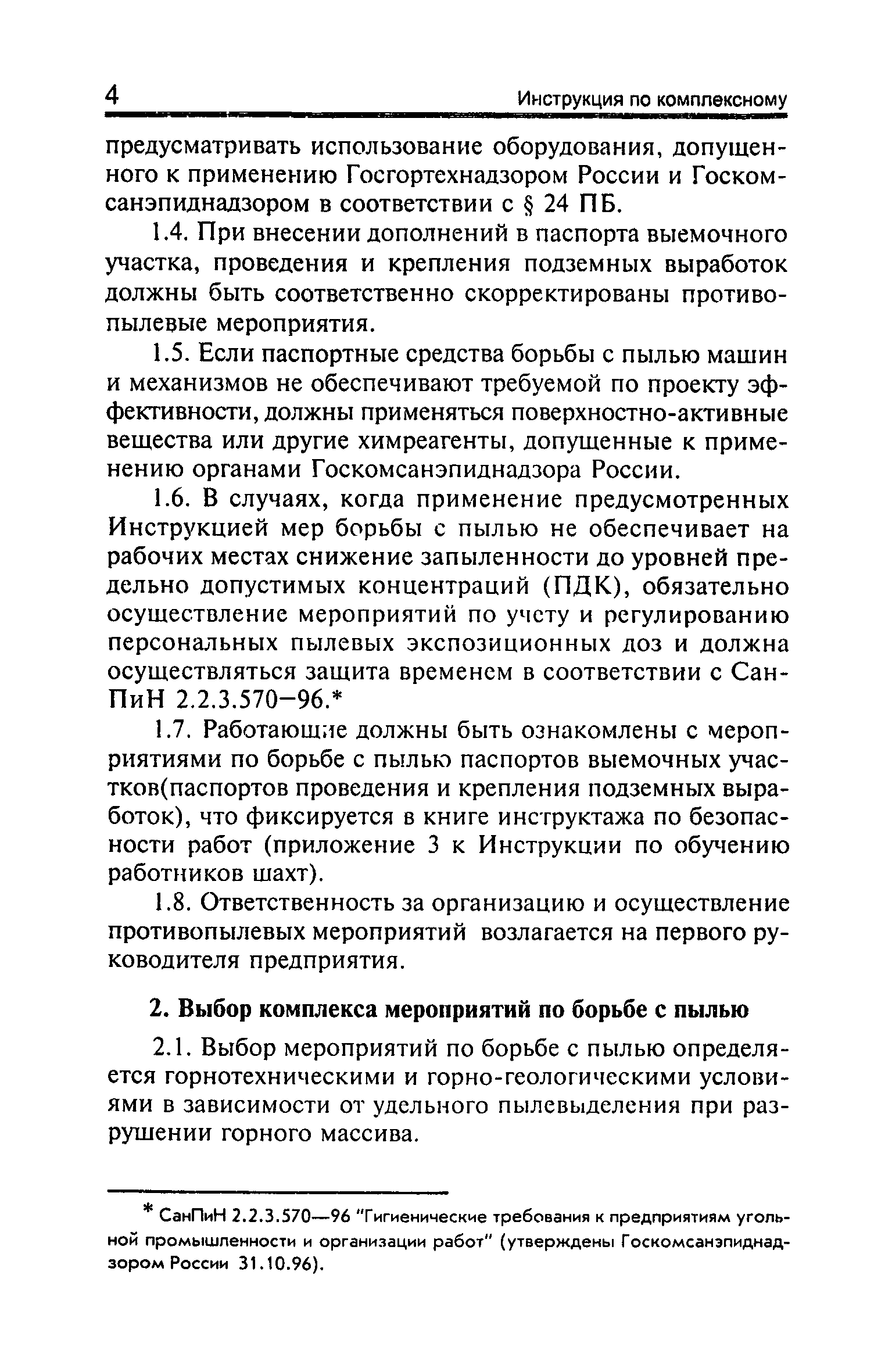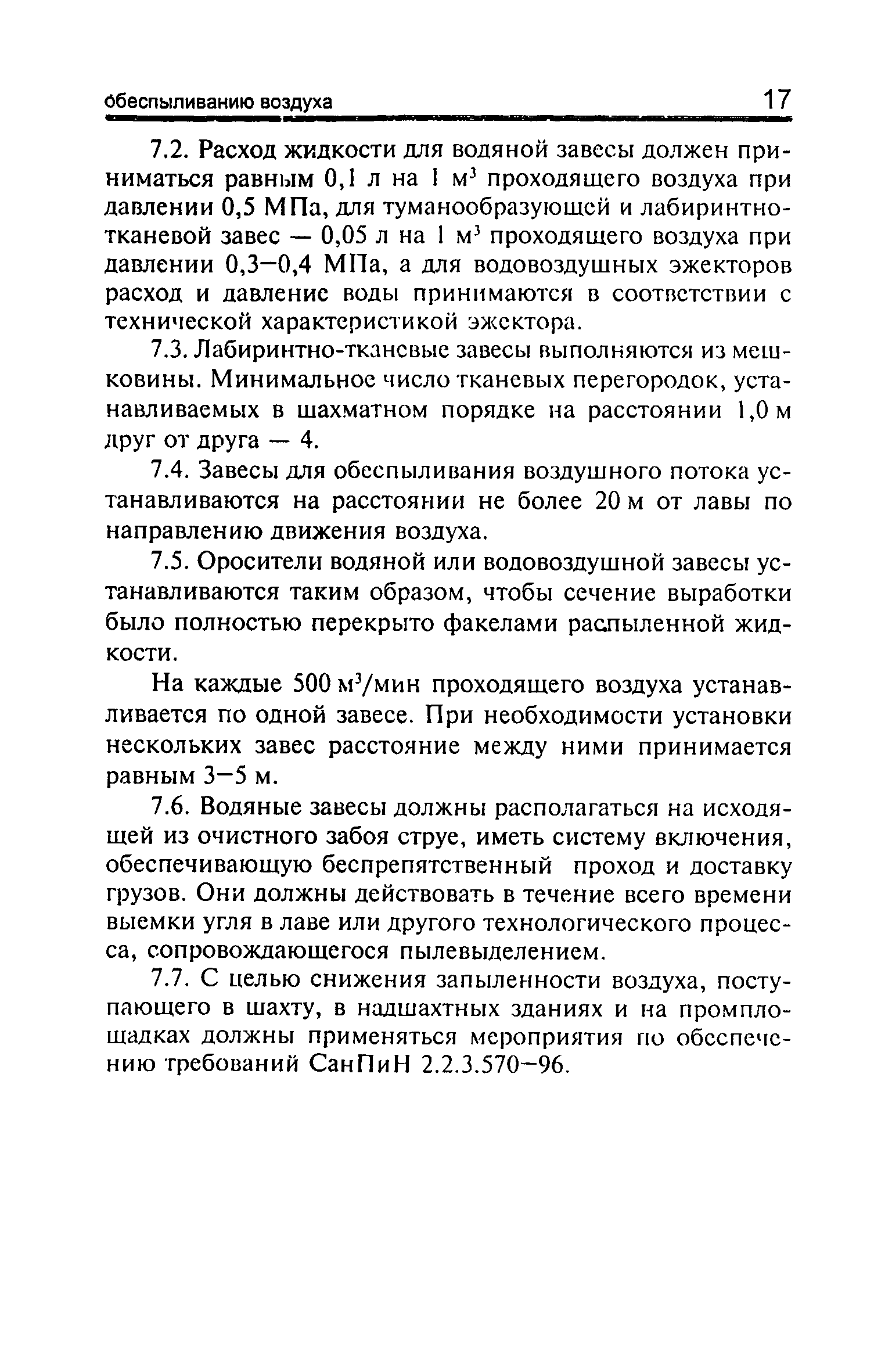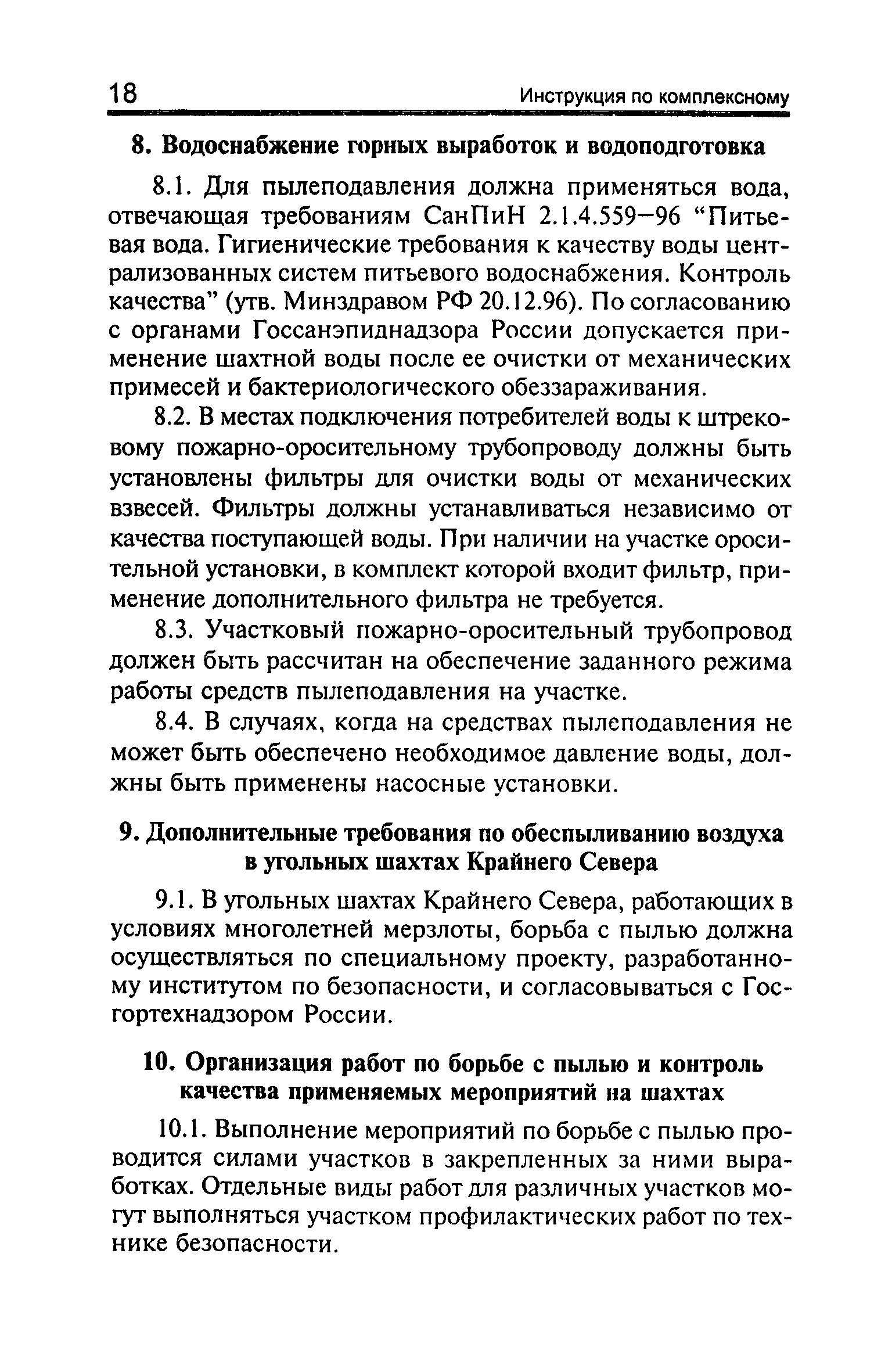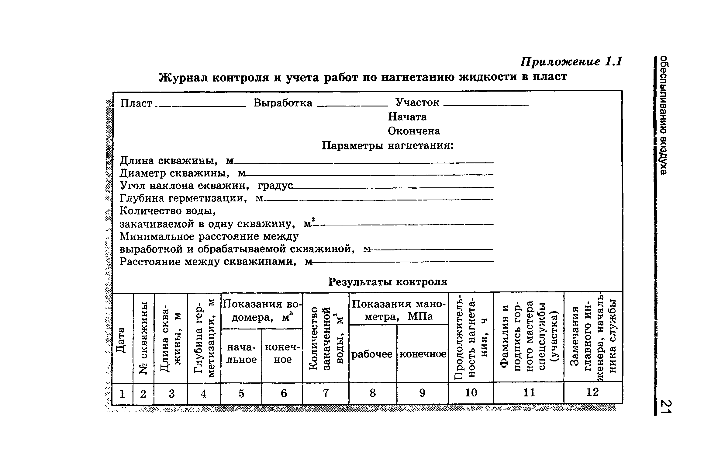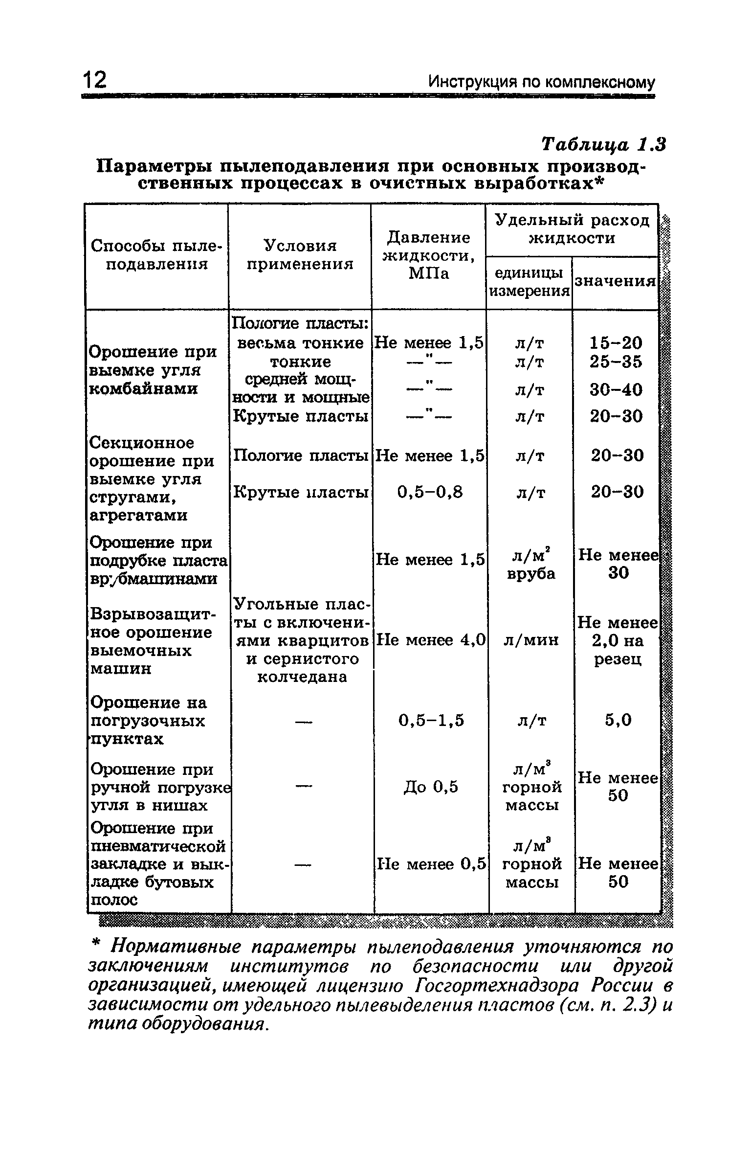 | Оглавление: | 1 Общие положения 2 Выбор комплекса мероприятий по борьбе с пылью 3 Предварительное увлажнение угольных пластов 4 Обеспыливание воздуха в очистных выработках 5 Обеспыливание воздуха при проведении горных выработок 6 Обеспыливание воздуха в транспортных и околоствольных выработках 7 Обеспыливание входящих и исходящих вентиляционных потоков 8 Водоснабжение горных выработок и водоподготовка 9 Дополнительные требования по обеспыливанию воздуха в угольных шахтах Крайнего Севера 10 Организация работ по борьбе с пылью и контроль качества применяемых мероприятий на шахтах Приложение 1.1 Журнал контроля и учета работ по нагнетанию жидкости в пласт |