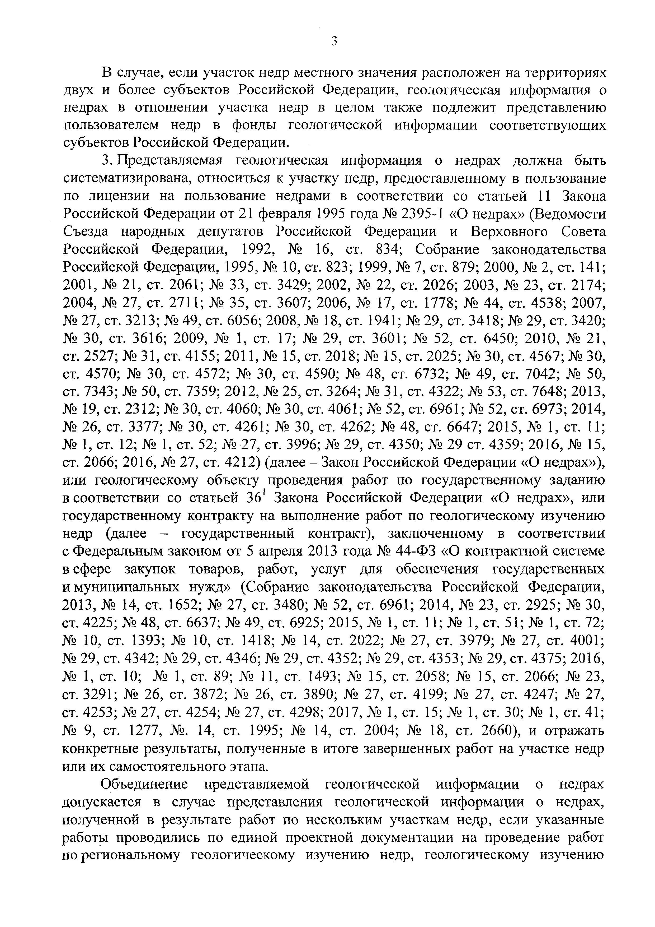 Порядок представления геологической информации о недрах в федеральный фонд геологической информации и его территориальные фонды, фонды геологической информации субъектов Российской Федерации| Статус: | действует | | Название рус.: | Порядок представления геологической информации о недрах в федеральный фонд геологической информации и его территориальные фонды, фонды геологической информации субъектов Российской Федерации | | Дата добавления в базу: | 01.01.2018 | | Дата актуализации: | 01.01.2021 | | Дата введения: | 05.09.2017 | | Область применения: | Порядок устанавливает правила представления геологической информации о недрах пользователями недр в федеральный фонд геологической информации и его территориальный фонды, фонды геологической информации субъектов Российской Федерации | | Оглавление: | Об утверждении Порядка представления геологической информации о недрах в федеральный фонд геологической информации и его территориальные фонды, фонды геологической информации субъектов Российской Федерации Порядок представления геологической информации о недрах в Федеральный фонд геологической информации и его территориальные фонды, фонды геологической информации субъектов Российской Федерации | | Утверждён: | 04.05.2017 Минприроды России (Министерство природных ресурсов и экологии РФ) (216)