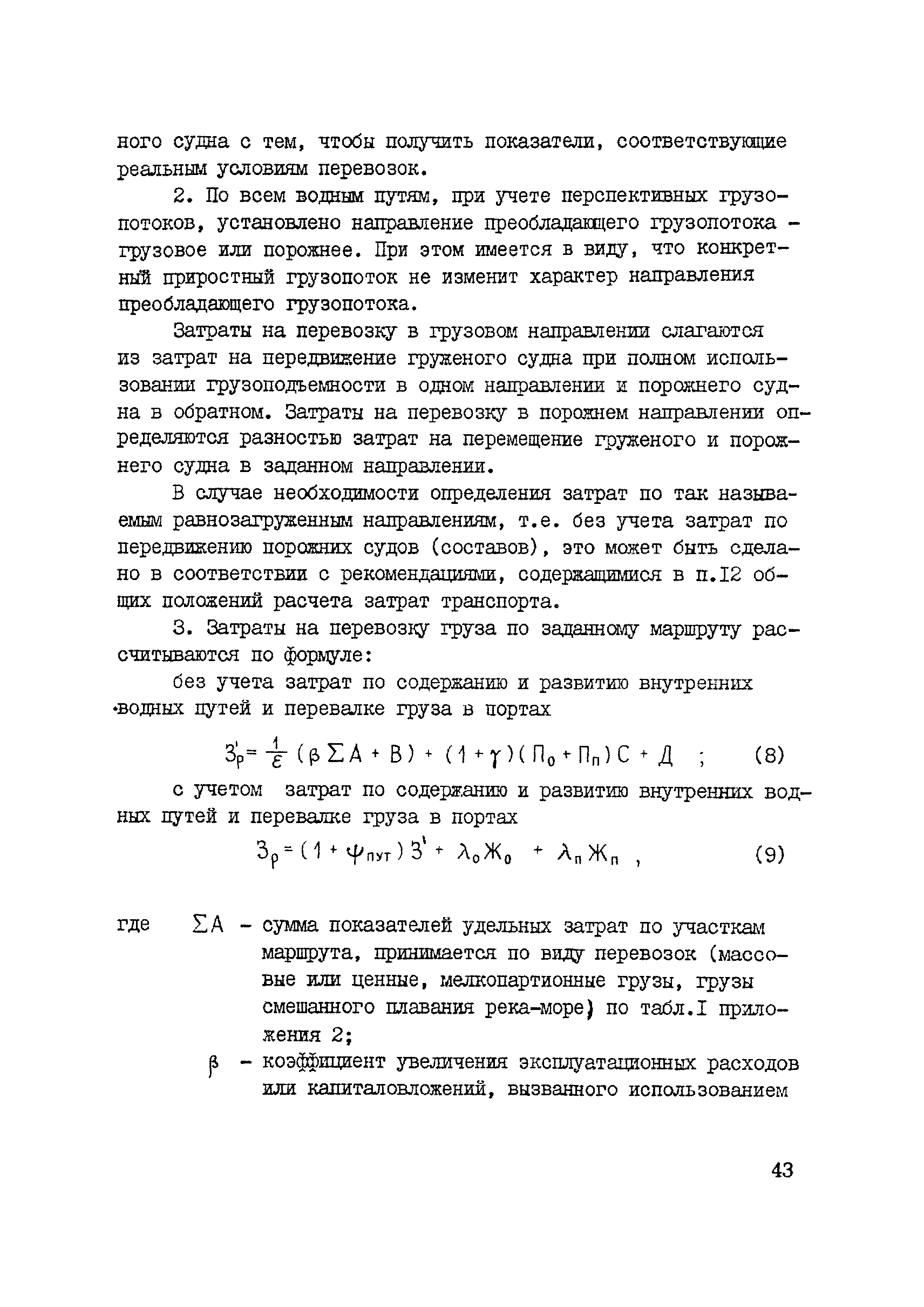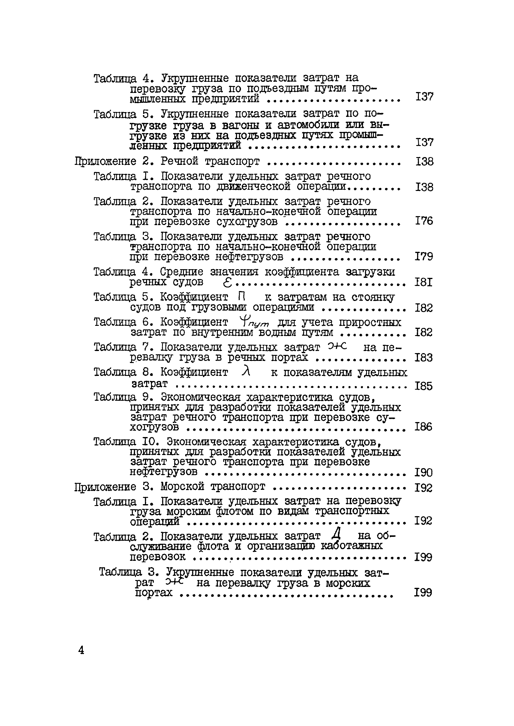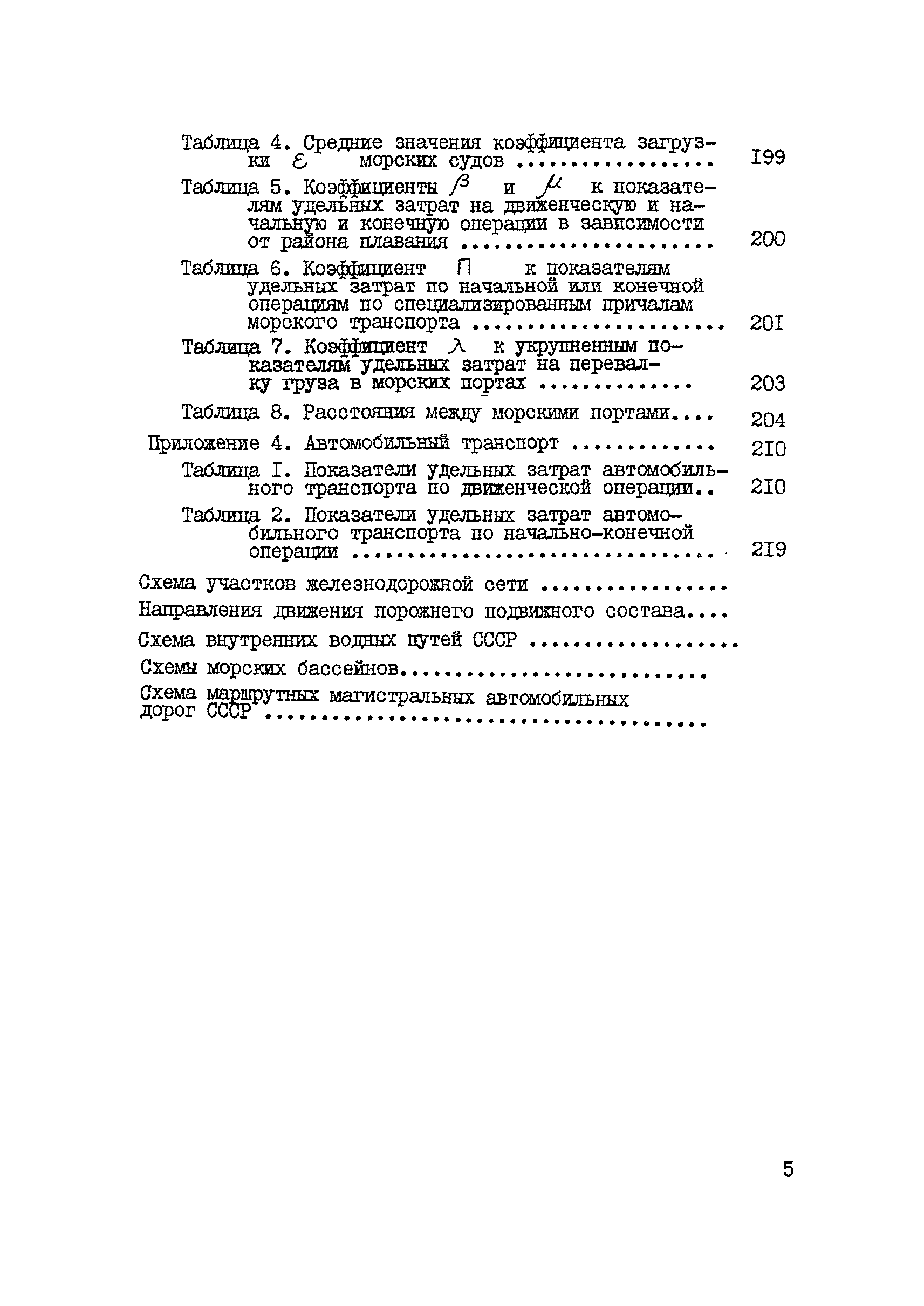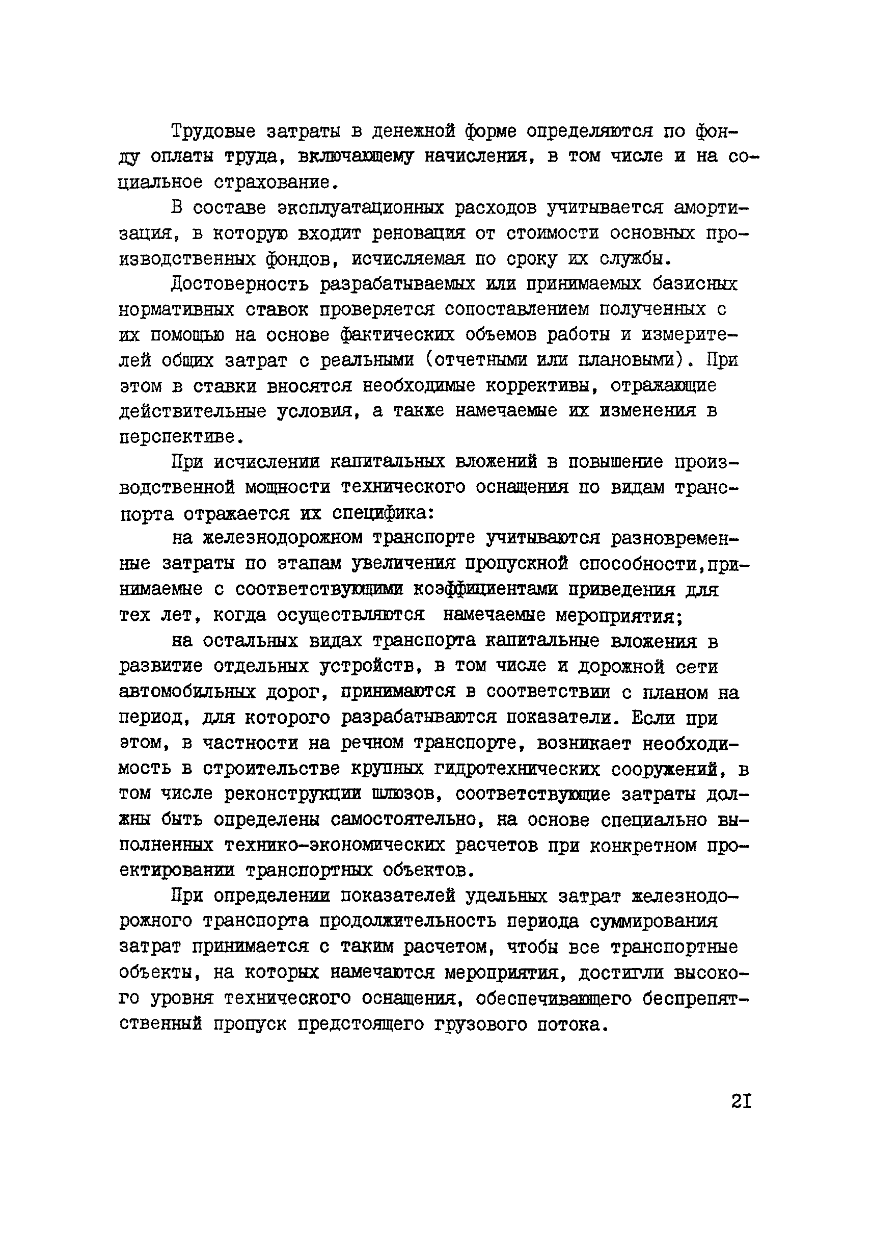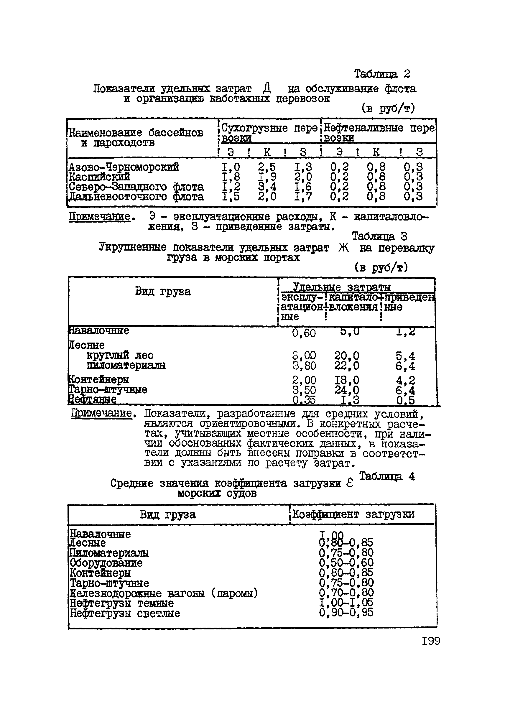 | Оглавление: | Предисловие Основные методические положения разработки показателей удельных затрат транспорта Общая часть Принципиальная концепция разработки показателей Общие методические положения расчета показателей удельных приростных затрат Способы разработки показателей удельных затрат транспорта Методические указания по применению показателей удельных затрат транспорта Общие положения расчета затрат транспорта Указания по расчету затрат на перевозку груза железнодорожным транспортом Указания по расчету затрат на перевозку груза речным транспортом Указания по расчету затрат на перевозку груза морским транспортом Указания по расчету затрат на перевозку груза автомобильным транспортом Указания по расчету затрат на перевозку груза в смешанном сообщении Приложение 1. Железнодорожный транспорт Таблица 1. Показатели удельных затрат железнодорожного транспорта по движенческой операции (на участках существующей железнодорожной сети) Таблица 2. Показатели удельных затрат железнодорожного транспорта по движенческой операции в грузовом направлении на новых линиях протяжением 100 км Таблица 3. Показатели удельных затрат железнодорожного транспорта по начально-конечной операции (на существующих железнодорожных узлах) Таблица 4. Укрупненные показатели затрат на перевозку груза по подъездным путям промышленных предприятий Таблица 5. Укрупненные показатели затрат по погрузке груза в вагоны и автомобили или выгрузке из них на подъездных путях промышленных предприятий Приложение 2. Речной транспорт Таблица 1. Показатели удельных затрат речного транспорта по движенческой операции Таблица 2. Показатели удельных затрат речного транспорта по начально—конечной операции при перевозке сухогрузов Таблица 3. Показатели удельных затрат речного транспорта по начально—конечной операции при перевозке нефтегрузов Таблица 4. Средние значения коэффициента загрузки речных судов Таблица 5. Коэффициент П к затратам на стоянку судов под грузовыми операциями Таблица 6. Коэффициент для учета приростных затрат по внутренним водным путям Таблица 7. Показатели удельных затрат Ж на перевалку груза в речных портах Таблица 8. Коэффициент‚ к показателям удельных затрат Таблица 9. Экономическая характеристика судов, принятых дня разработки показателей удельных затрат речного транспорта при перевозке сухогрузов Таблица 10. Экономическая характеристика судов, принятых дня разработки показателей удельных затрат речного транспорта при перевозке нефтегрузов Приложение 3. Морской транспорт Таблица 1. Показатели удельных затрат на перевозку груза морским флотом по видам транспортных операций Таблица 2. Показатели удельных затрат Д на обслуживание флота и организацию каботажных перевозок Таблица 3. Укрупненные показатели удельных затрат Ж на перевалку груза в морских портах Таблица 4. Средние значения коэффициента загрузки морских судов Таблица 5. Коэффициенты к показателям удельных затрат на движенческую и начальную и конечную операции в зависимости от района плавания Таблица 6. Коэффициент П к показателям удельных затрат по начальной или конечной операциям по специализированным причалам морского транспорта Таблица 7. Коэффициент к укрупненным показателям удельных затрат на перевалку груза в морских портах Таблица 8. Расст