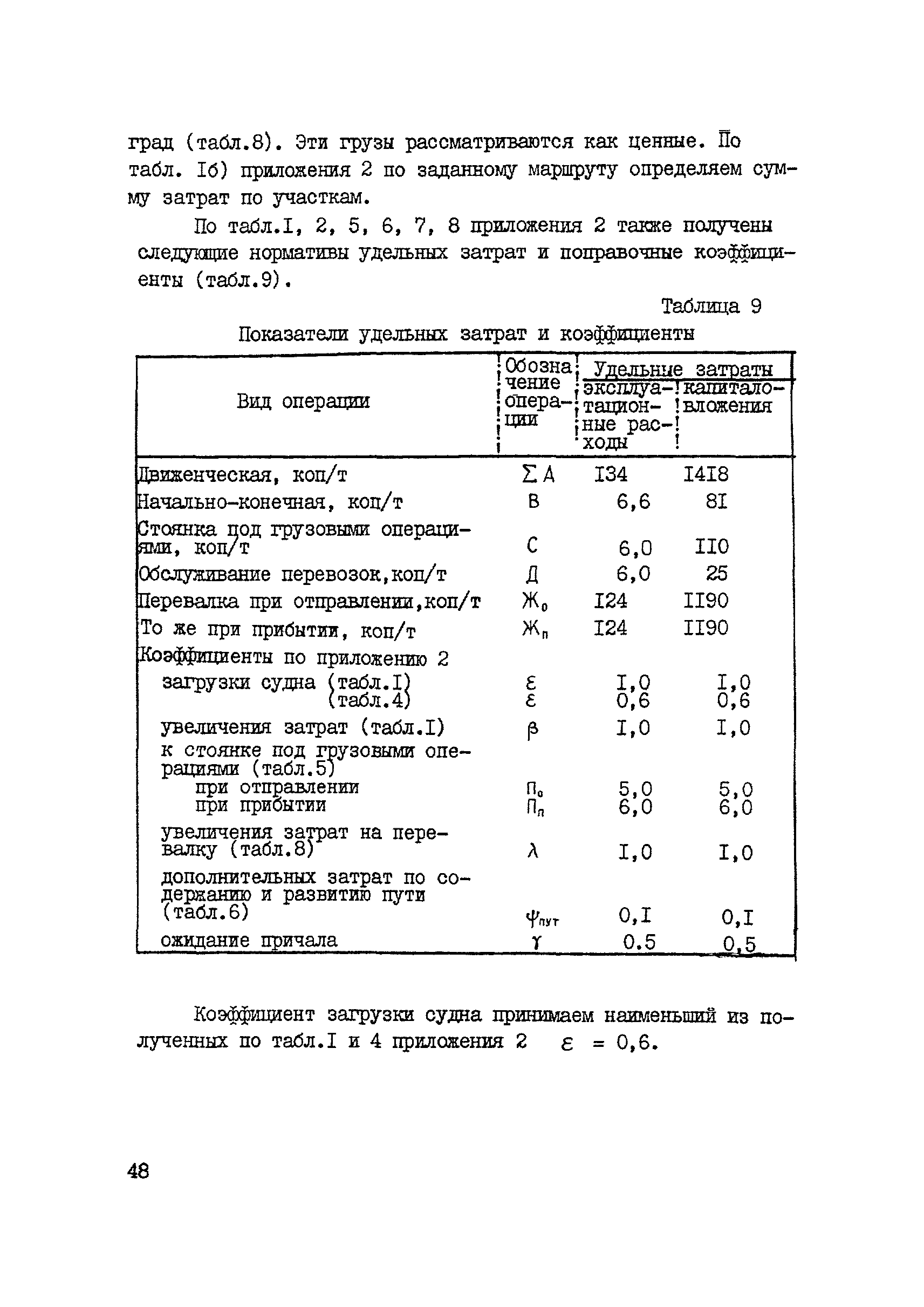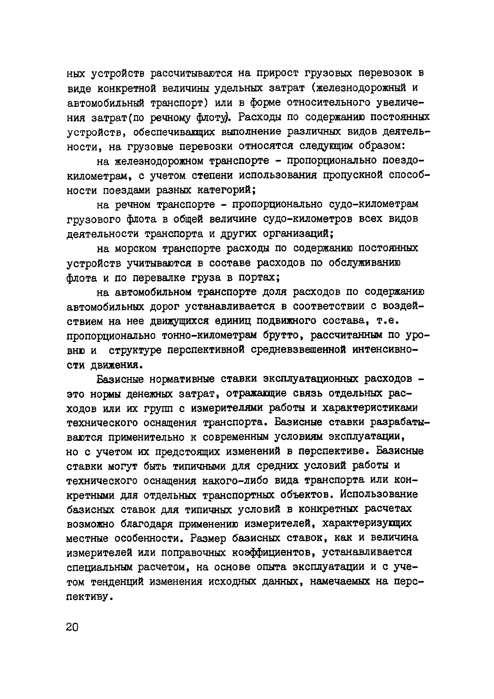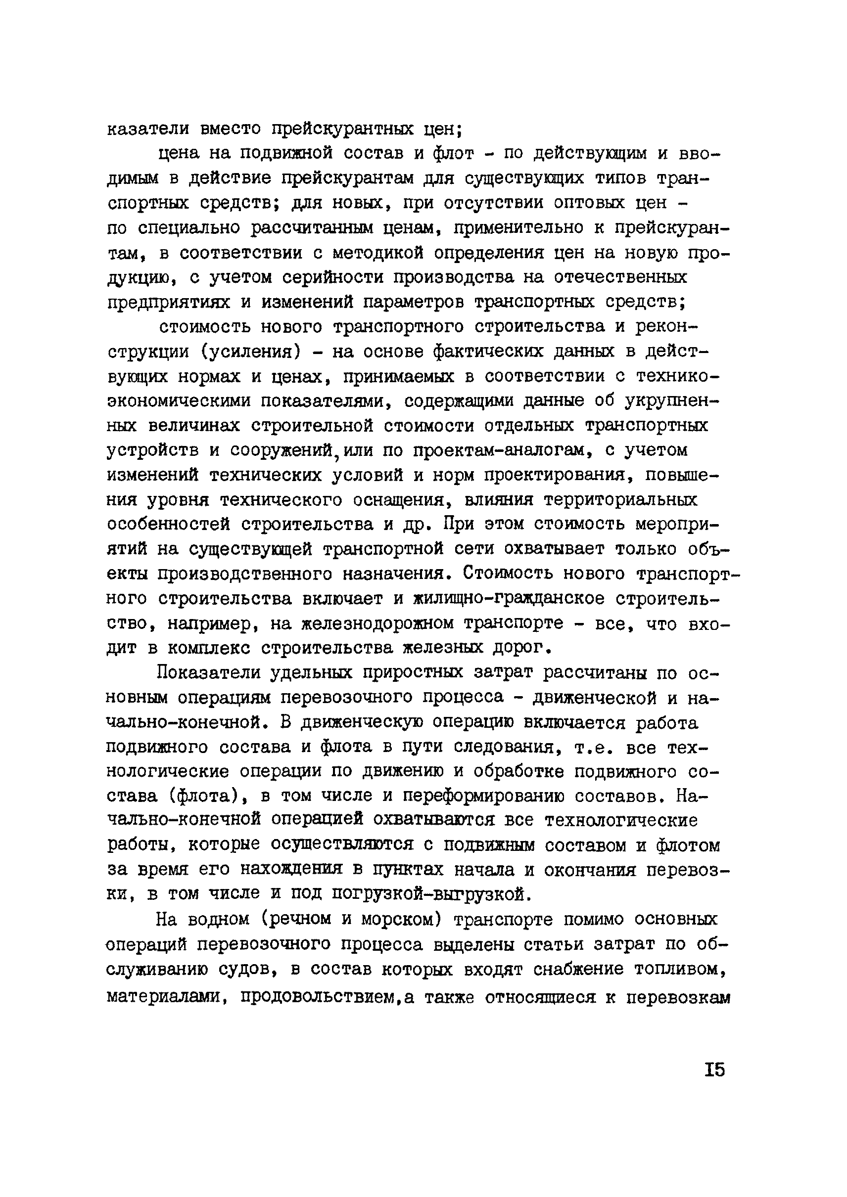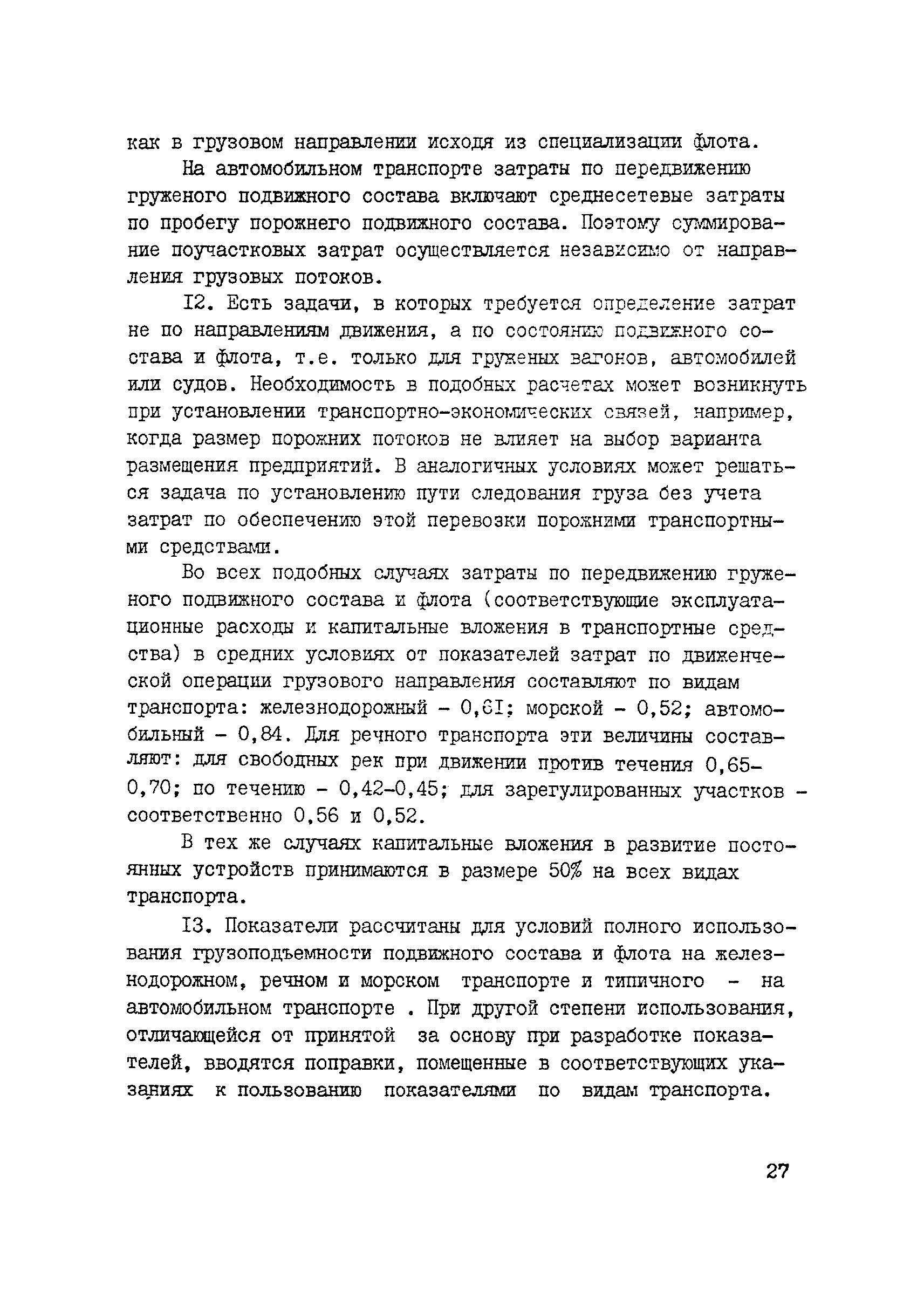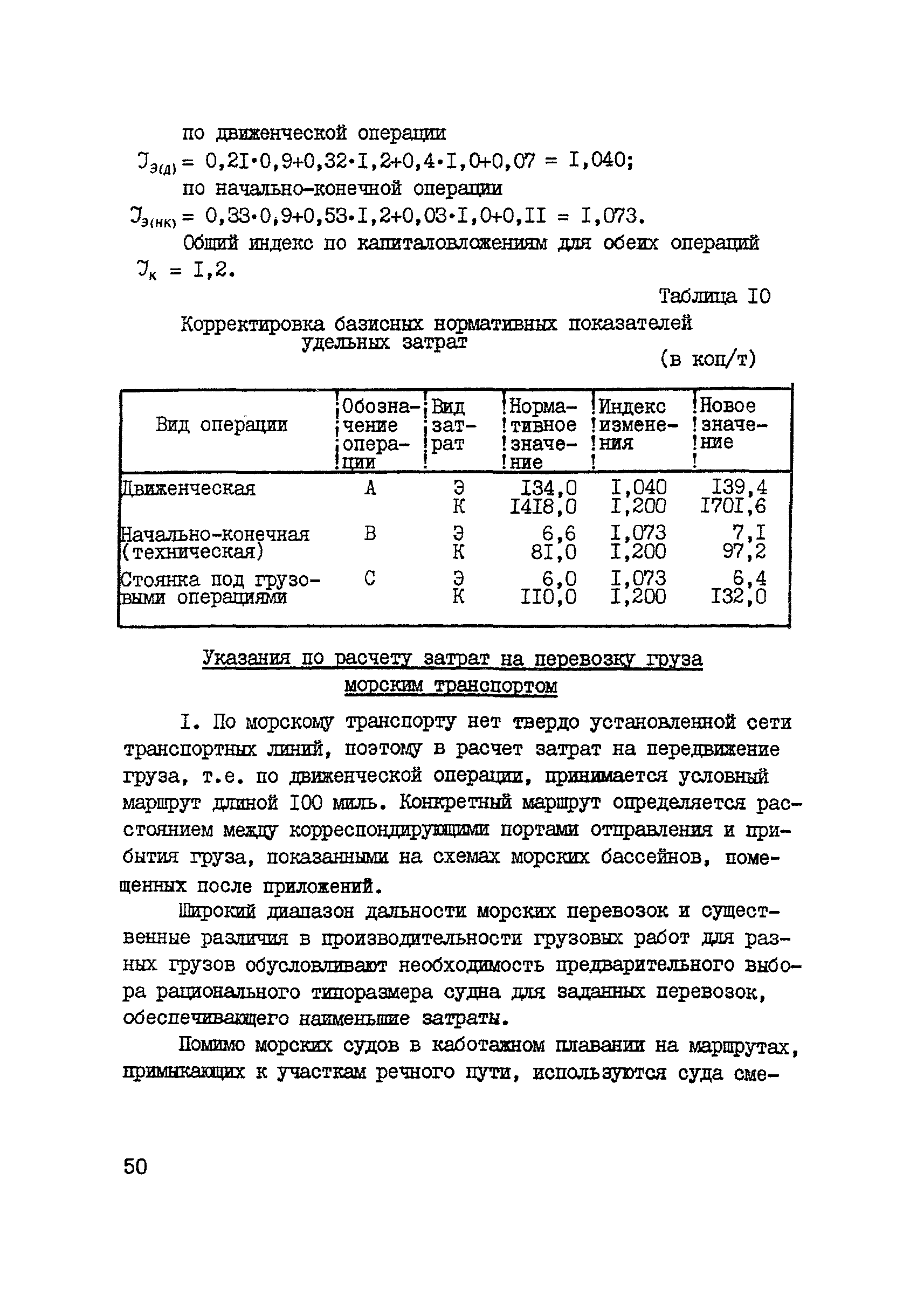 | Оглавление: | Предисловие Основные методические положения разработки показателей удельных затрат транспорта Общая часть Принципиальная концепция разработки показателей Общие методические положения расчета показателей удельных приростных затрат Способы разработки показателей удельных затрат транспорта Методические указания по применению показателей удельных затрат транспорта Общие положения расчета затрат транспорта Указания по расчету затрат на перевозку груза железнодорожным транспортом Указания по расчету затрат на перевозку груза речным транспортом Указания по расчету затрат на перевозку груза морским транспортом Указания по расчету затрат на перевозку груза автомобильным транспортом Указания по расчету затрат на перевозку груза в смешанном сообщении Приложение 1. Железнодорожный транспорт Таблица 1. Показатели удельных затрат железнодорожного транспорта по движенческой операции (на участках существующей железнодорожной сети) Таблица 2. Показатели удельных затрат железнодорожного транспорта по движенческой операции в грузовом направлении на новых линиях протяжением 100 км Таблица 3. Показатели удельных затрат железнодорожного транспорта по начально-конечной операции (на существующих железнодорожных узлах) Таблица 4. Укрупненные показатели затрат на перевозку груза по подъездным путям промышленных предприятий Таблица 5. Укрупненные показатели затрат по погрузке груза в вагоны и автомобили или выгрузке из них на подъездных путях промышленных предприятий Приложение 2. Речной транспорт Таблица 1. Показатели удельных затрат речного транспорта по движенческой операции Таблица 2. Показатели удельных затрат речного транспорта по начально—конечной операции при перевозке сухогрузов Таблица 3. Показатели удельных затрат речного транспорта по начально—конечной операции при перевозке нефтегрузов Таблица 4. Средние значения коэффициента загрузки речных судов Таблица 5. Коэффициент П к затратам на стоянку судов под грузовыми операциями Таблица 6. Коэффициент для учета приростных затрат по внутренним водным путям Таблица 7. Показатели удельных затрат Ж на перевалку груза в речных портах Таблица 8. Коэффициент‚ к показателям удельных затрат Таблица 9. Экономическая характеристика судов, принятых дня разработки показателей удельных затрат речного транспорта при перевозке сухогрузов Таблица 10. Экономическая характеристика судов, принятых дня разработки показателей удельных затрат речного транспорта при перевозке нефтегрузов Приложение 3. Морской транспорт Таблица 1. Показатели удельных затрат на перевозку груза морским флотом по видам транспортных операций Таблица 2. Показатели удельных затрат Д на обслуживание флота и организацию каботажных перевозок Таблица 3. Укрупненные показатели удельных затрат Ж на перевалку груза в морских портах Таблица 4. Средние значения коэффициента загрузки морских судов Таблица 5. Коэффициенты к показателям удельных затрат на движенческую и начальную и конечную операции в зависимости от района плавания Таблица 6. Коэффициент П к показателям удельных затрат по начальной или конечной операциям по специализированным причалам морского транспорта Таблица 7. Коэффициент к укрупненным показателям удельных затрат на перевалку груза в морских портах Таблица 8. Расст