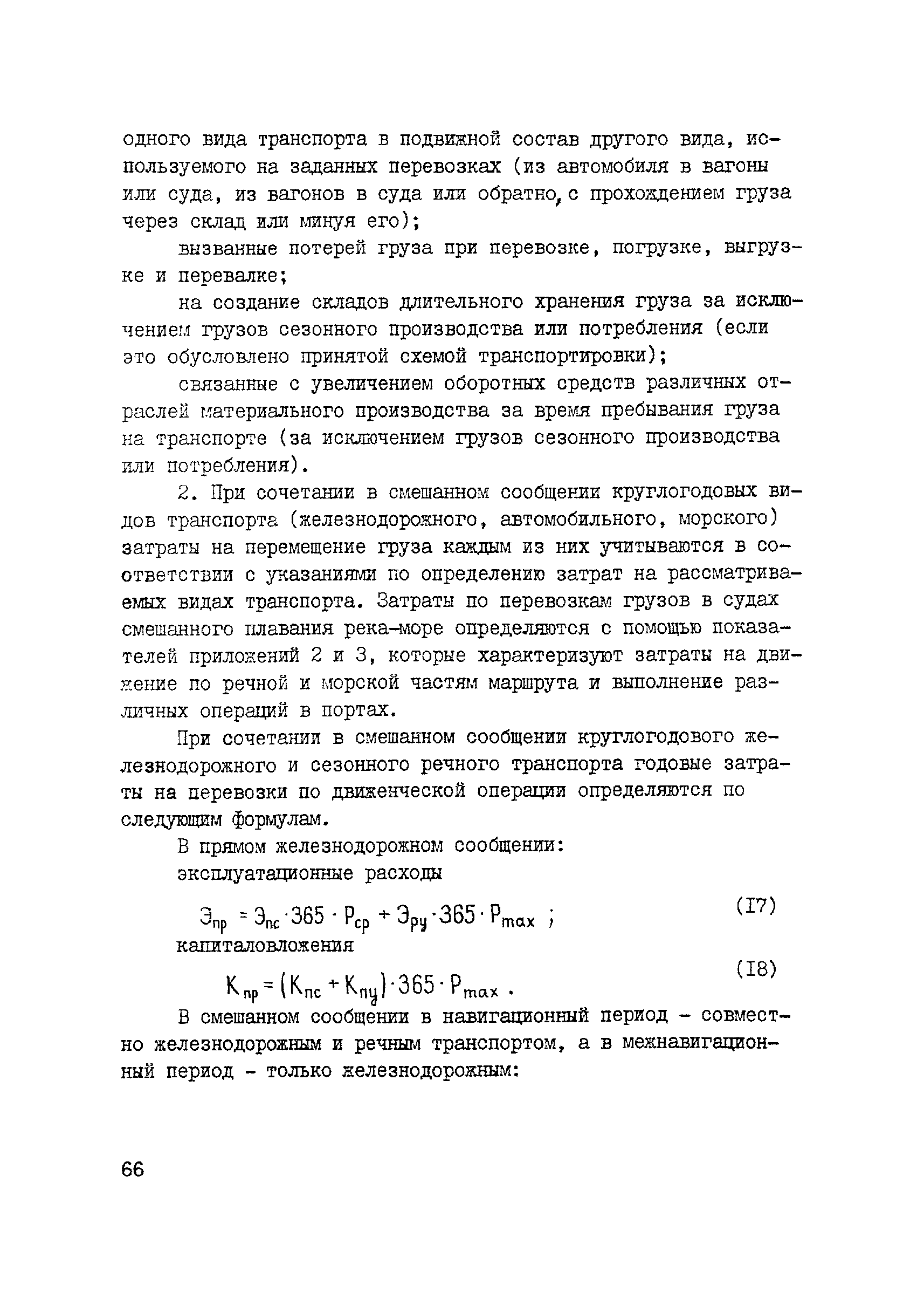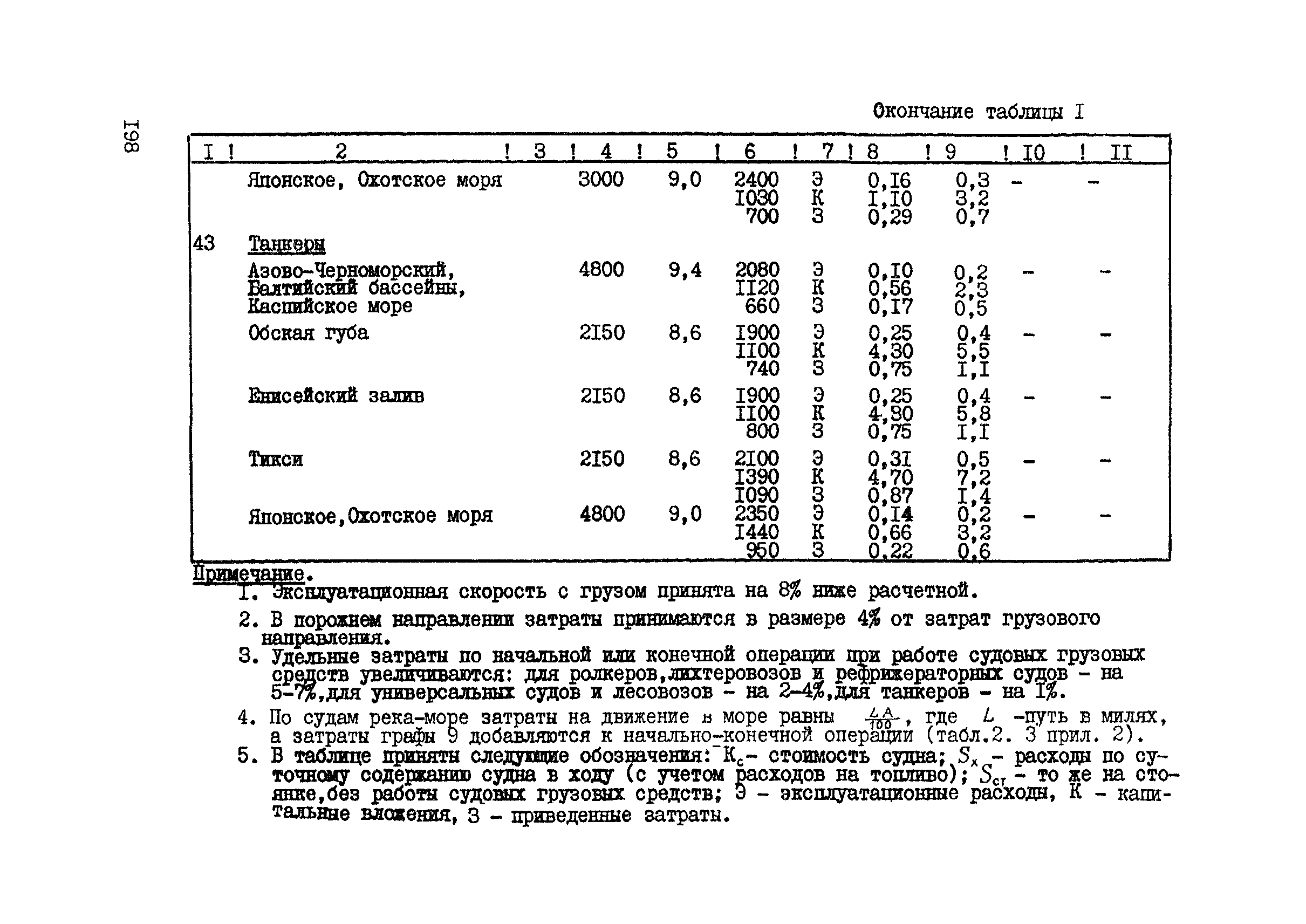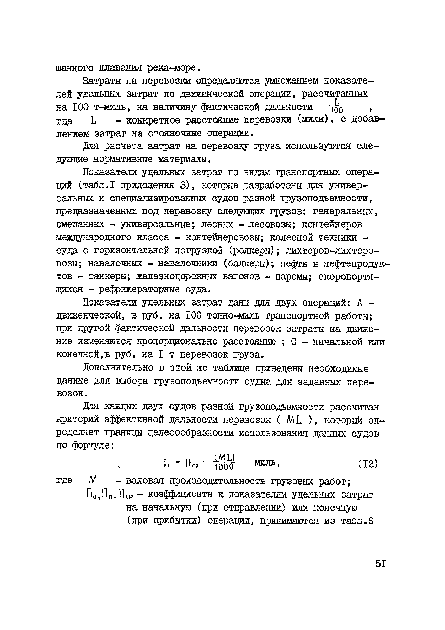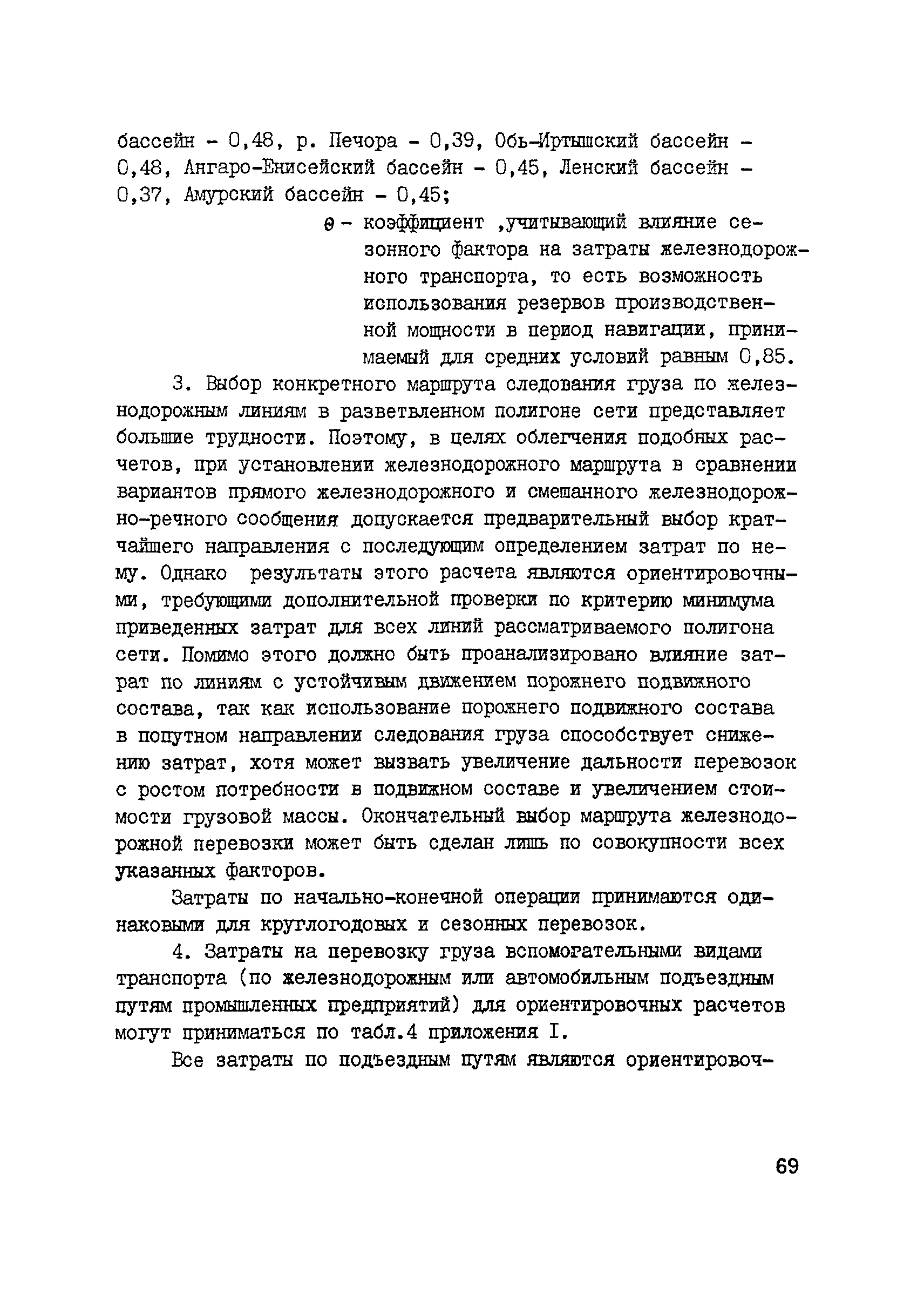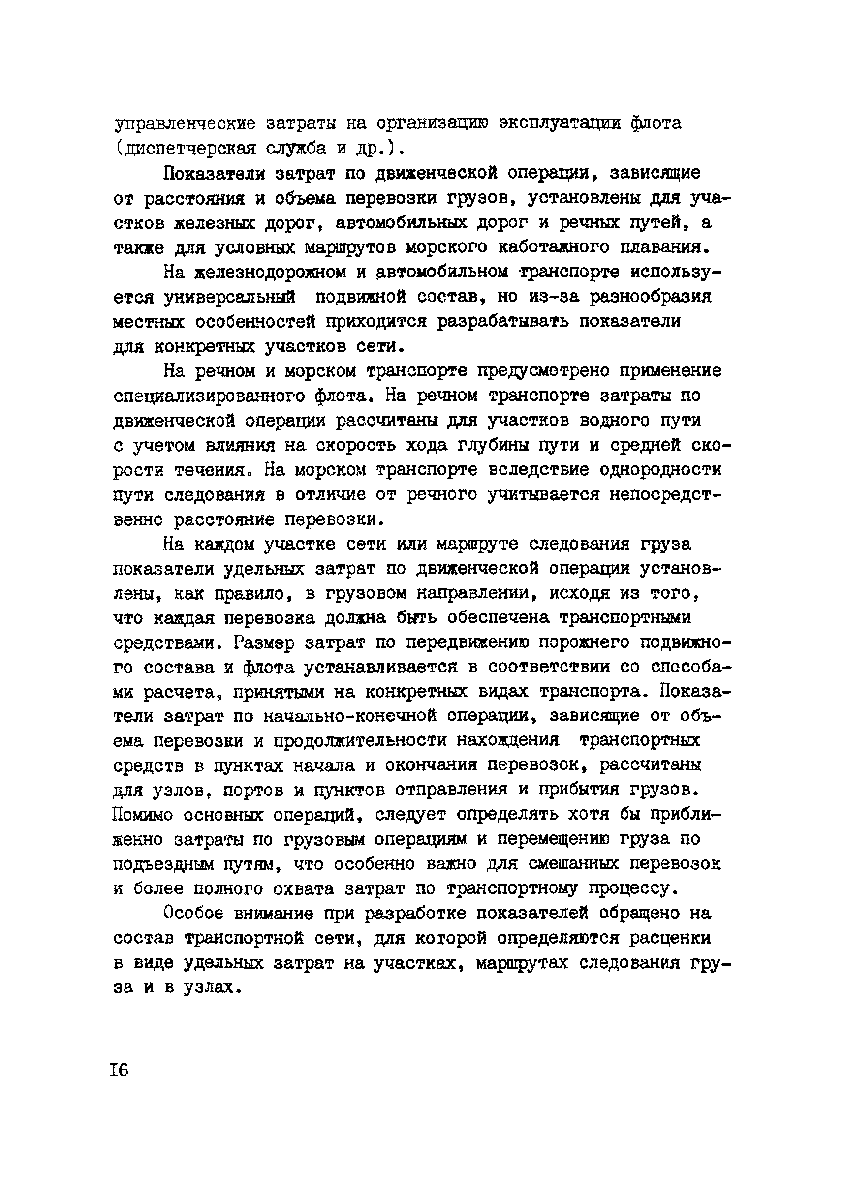| Оглавление: | Предисловие Основные методические положения разработки показателей удельных затрат транспорта Общая часть Принципиальная концепция разработки показателей Общие методические положения расчета показателей удельных приростных затрат Способы разработки показателей удельных затрат транспорта Методические указания по применению показателей удельных затрат транспорта Общие положения расчета затрат транспорта Указания по расчету затрат на перевозку груза железнодорожным транспортом Указания по расчету затрат на перевозку груза речным транспортом Указания по расчету затрат на перевозку груза морским транспортом Указания по расчету затрат на перевозку груза автомобильным транспортом Указания по расчету затрат на перевозку груза в смешанном сообщении Приложение 1. Железнодорожный транспорт Таблица 1. Показатели удельных затрат железнодорожного транспорта по движенческой операции (на участках существующей железнодорожной сети) Таблица 2. Показатели удельных затрат железнодорожного транспорта по движенческой операции в грузовом направлении на новых линиях протяжением 100 км Таблица 3. Показатели удельных затрат железнодорожного транспорта по начально-конечной операции (на существующих железнодорожных узлах) Таблица 4. Укрупненные показатели затрат на перевозку груза по подъездным путям промышленных предприятий Таблица 5. Укрупненные показатели затрат по погрузке груза в вагоны и автомобили или выгрузке из них на подъездных путях промышленных предприятий Приложение 2. Речной транспорт Таблица 1. Показатели удельных затрат речного транспорта по движенческой операции Таблица 2. Показатели удельных затрат речного транспорта по начально—конечной операции при перевозке сухогрузов Таблица 3. Показатели удельных затрат речного транспорта по начально—конечной операции при перевозке нефтегрузов Таблица 4. Средние значения коэффициента загрузки речных судов Таблица 5. Коэффициент П к затратам на стоянку судов под грузовыми операциями Таблица 6. Коэффициент для учета приростных затрат по внутренним водным путям Таблица 7. Показатели удельных затрат Ж на перевалку груза в речных портах Таблица 8. Коэффициент‚ к показателям удельных затрат Таблица 9. Экономическая характеристика судов, принятых дня разработки показателей удельных затрат речного транспорта при перевозке сухогрузов Таблица 10. Экономическая характеристика судов, принятых дня разработки показателей удельных затрат речного транспорта при перевозке нефтегрузов Приложение 3. Морской транспорт Таблица 1. Показатели удельных затрат на перевозку груза морским флотом по видам транспортных операций Таблица 2. Показатели удельных затрат Д на обслуживание флота и организацию каботажных перевозок Таблица 3. Укрупненные показатели удельных затрат Ж на перевалку груза в морских портах Таблица 4. Средние значения коэффициента загрузки морских судов Таблица 5. Коэффициенты к показателям удельных затрат на движенческую и начальную и конечную операции в зависимости от района плавания Таблица 6. Коэффициент П к показателям удельных затрат по начальной или конечной операциям по специализированным причалам морского транспорта Таблица 7. Коэффициент к укрупненным показателям удельных затрат на перевалку груза в морских портах Таблица 8. Расст
