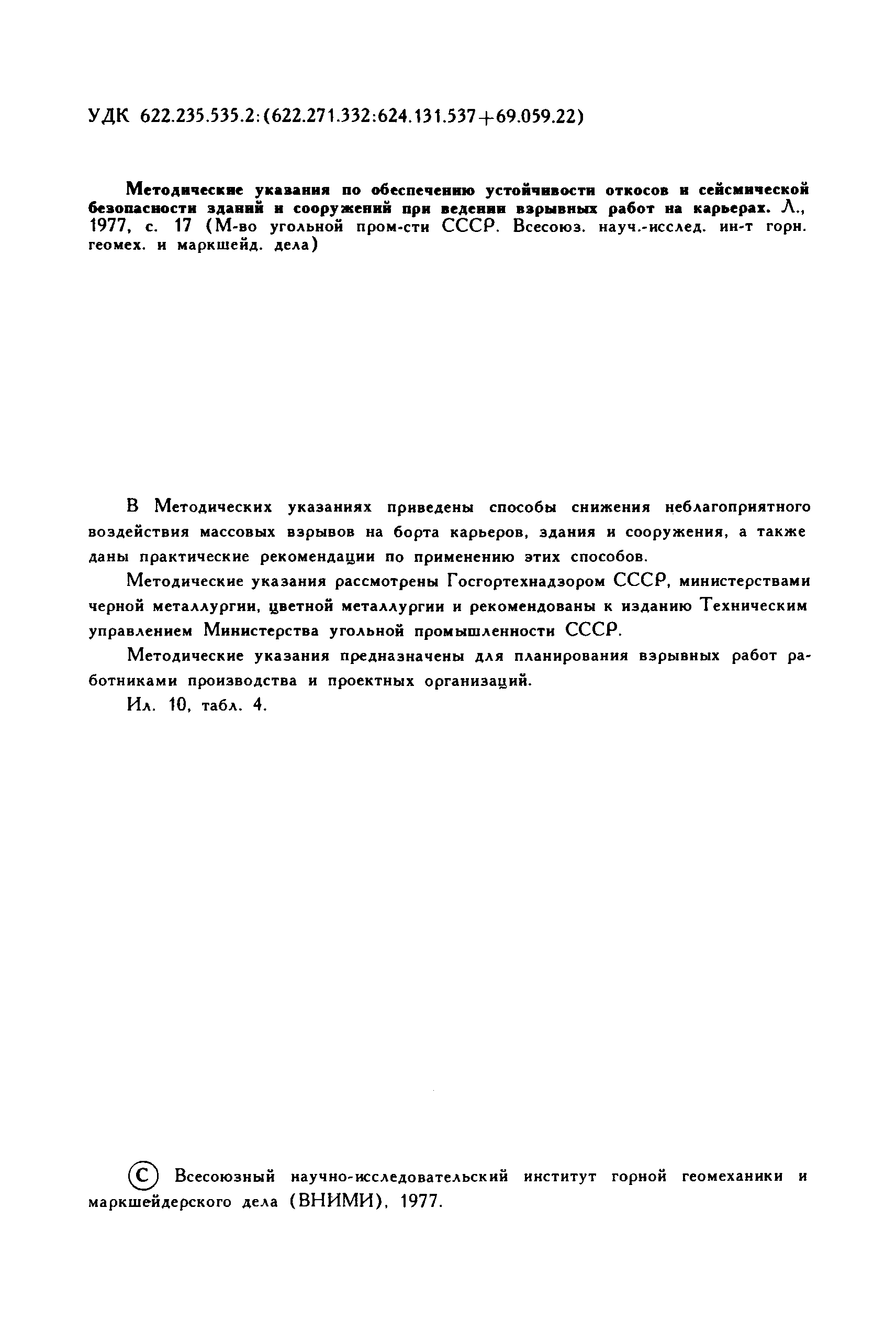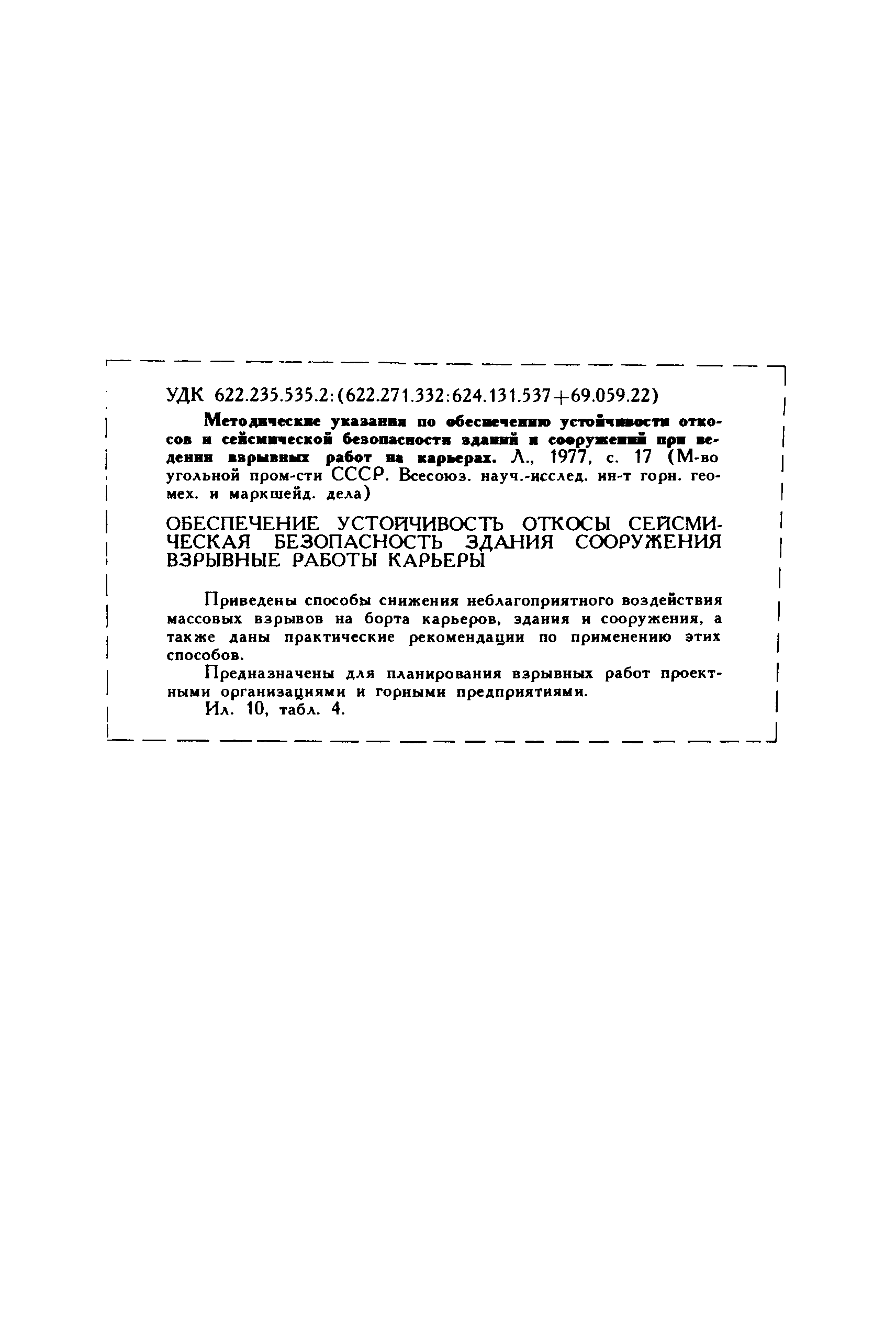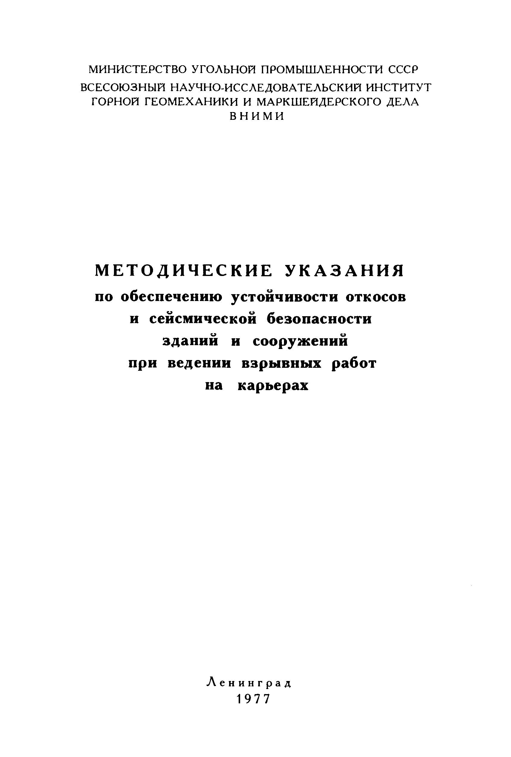 | Название рус.: | Методические указания по обеспечению устойчивости откосов и сейсмической безопасности зданий и сооружений при ведении взрывных работ на карьерах |