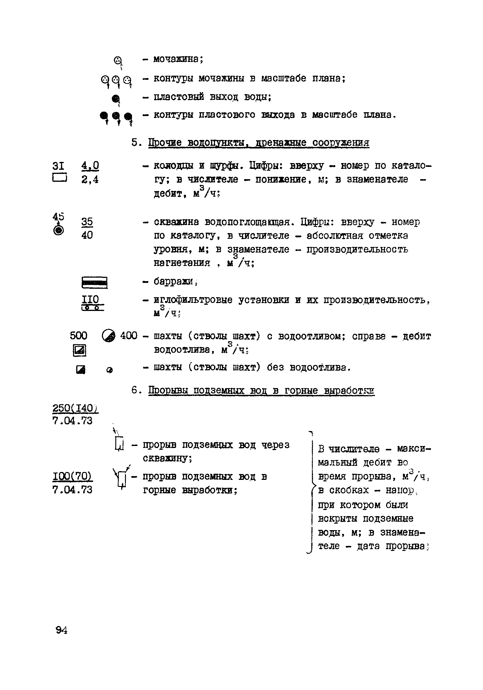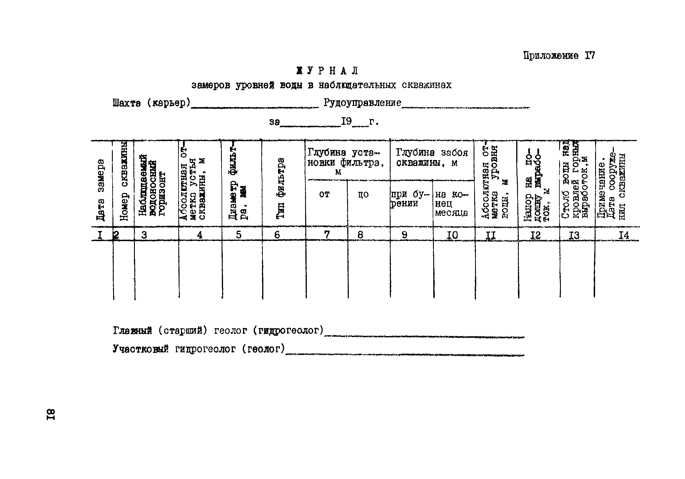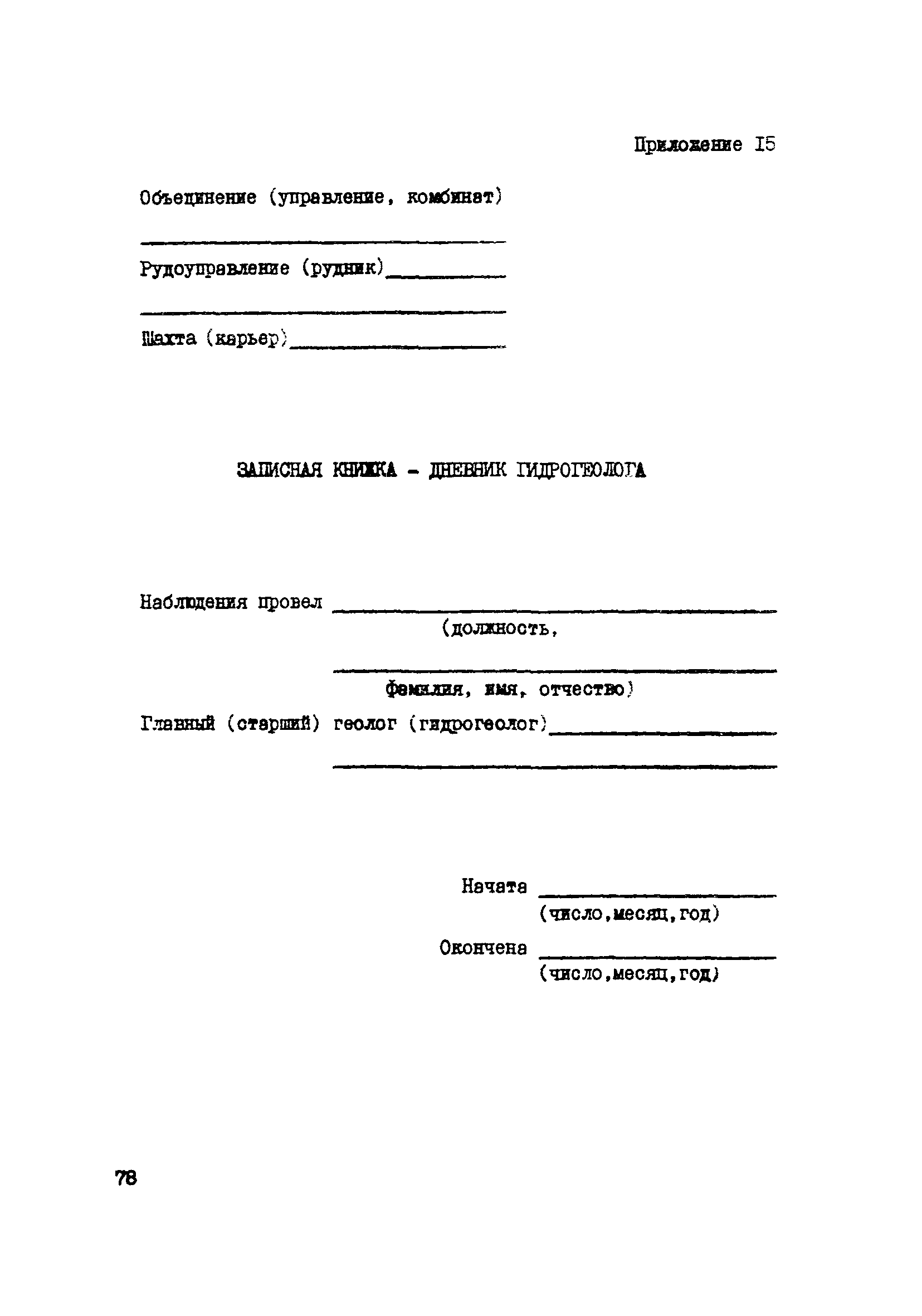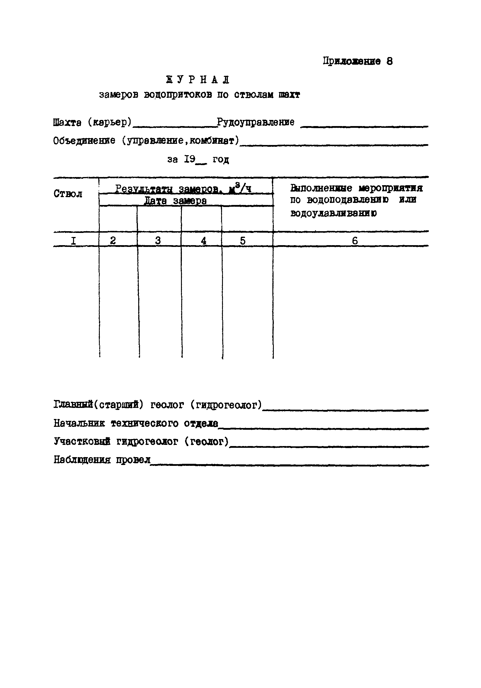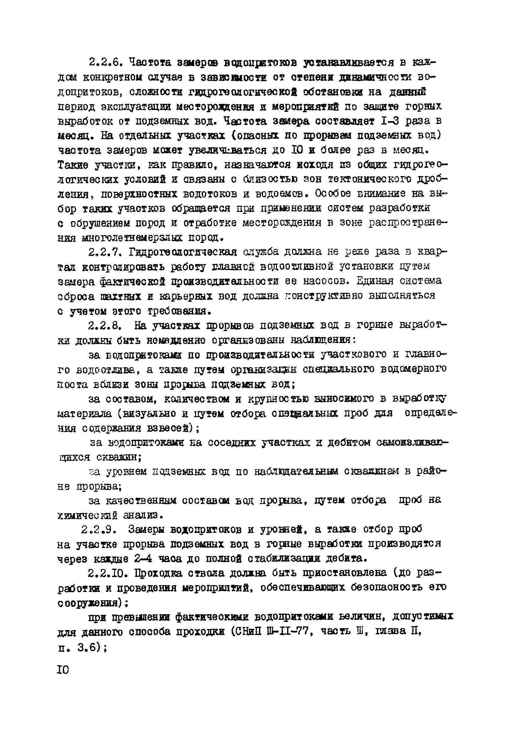 | Оглавление: | 1 Общие положения 2 Гидрогеологические и инженерно-геологические работы в подземных горных выработках 2.1 Наблюдения за деформациями горных выработок 2.2 Наблюдения за водопритоками в горные выработки 2.3 Наблюдения за химическим составом подземных и загрязненных подземных вод 2.4 Наблюдения при бурении разведочных, опережающих и дренажных скважин 2.5 Гидрогеологическая съемка 2.6 Специальные наблюдения 2.7 Геокриологические наблюдения 3 Гидрогеологические и инженерно-геологические работы в открытых горных выработках 3.1 Наблюдения за устойчивостью и деформациями уступов, бортов карьеров и отвалов породы 3.2 Наблюдение за водопритоками 3.3 Наблюдения за химическим составом подземных и загрязненных карьерных вод 3.4 Гидрогеологическая съемка карьера 3.5 Специальные наблюдения в карьере 3.6 Геокриологические наблюдения 3.7 Наблюдения за ливневыми и поверхностными водами 4 Наблюдения при сооружении и эксплуатации дренажных систем карьерных и шахтных полей 4.1 Наблюдения при сооружении и эксплуатации системы водопонижающих скважин 4.2 Наблюдения при сооружении и эксплуатации подземного дренажного комплекса 5 Гидрогеологические и инженерно-геологические наблюдения на поверхности в пределах горного отвода 5.1 Гидрогеологическое и инженерно-геологическое обследование на поверхности 5.2 Наблюдения за режимом поверхностных вод 5.3 Наблюдения за режимом подземных вод 6 Гидрогеологические наблюдения по охране водных ресурсов 7 Специальные гидрохимические наблюдения для оценки агрессивного воздействия подземных и рудничных вод на крепь, армировку и оборудование подземных горных выработок 7.1 Оценка агрессивности вод 7.2 Периодичность и правила отбора проб воды 8 Гидрогеологические наблюдения по рациональному использованию подземных вод и водоснабжению предприятий 9 Первичный учет использования вод 10 Камеральная обработка результатов наблюдений и отчетность Литература Приложение 1. Комплекс гидрогеологических и инженерно—геологических наблюдений при подземном способе разработки месторождений Приложение 2. Комплекс гидрогеологических и инженерно—геологических наблюдений при открытом способе разработки месторождений Приложение 3. Характеристика сложности инженерно—геологических условий разработки месторождений Приложение 4. Классификация месторождений полезных ископаемых по гидрогеологическим и инженерно—геологическим условиям освоения Приложение 5. Примерный перечень исходной документации Приложение 6. Приборы и оборудование для проведения гидрогеологических и инженерно—геологических наблюдений Приложение 7. Журнал регистрации проб для лабораторного определения физико—механических свойств Приложение 8. Журнал замеров водопритоков по стволам шахт Приложение 9. Журнал работы водопонижающих колодцев и иглофильтровых установок Приложение 10. Журнал работы забивных (сквозных) фильтров, восстающих и горизонтальных дренажных скважин Приложение 11. Журнал наблюдений за работой насосов водоотлива Приложение 12. Журнал замеров притока воды в шахту (карьер) Приложение 13. Акт прорыва воды в шахту (карьер) Приложение 14. Ведомость отбора проб воды на химические анализы Приложение 15. Записная книжка-дневник гидрогеолога Приложение 16. Журнал работы водопонижающих скважин Приложение 17. Журнал замеров уро