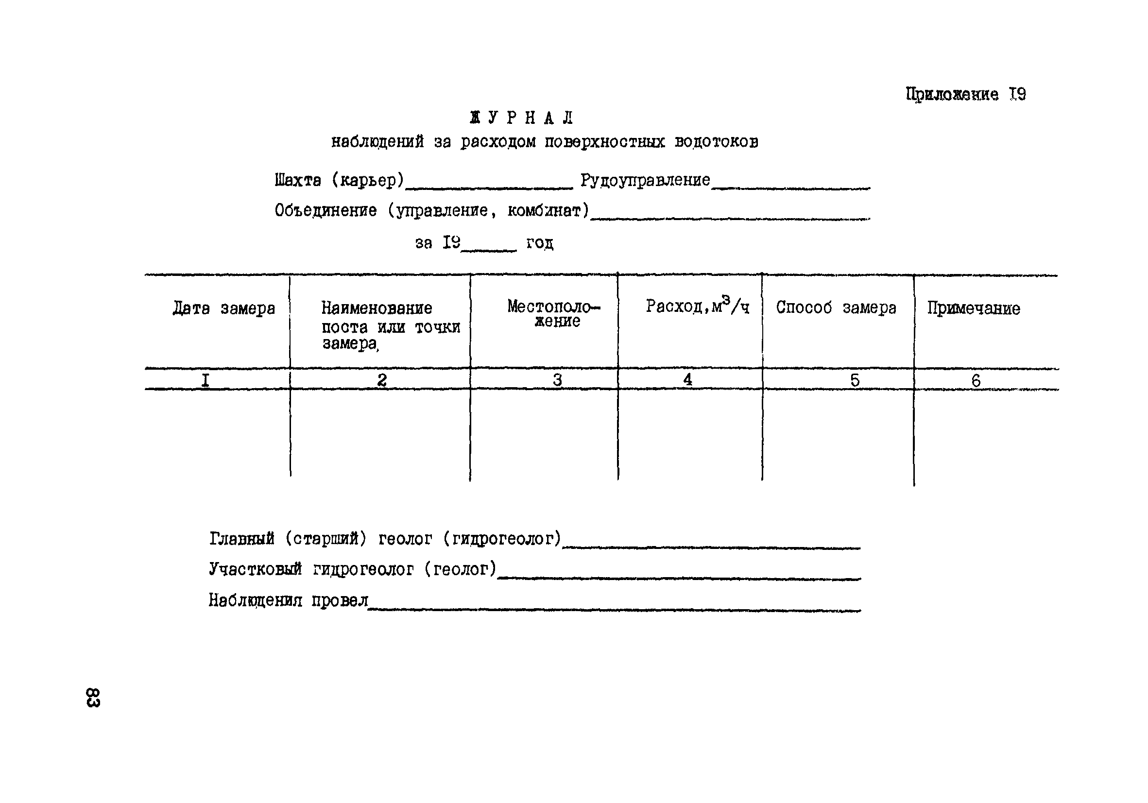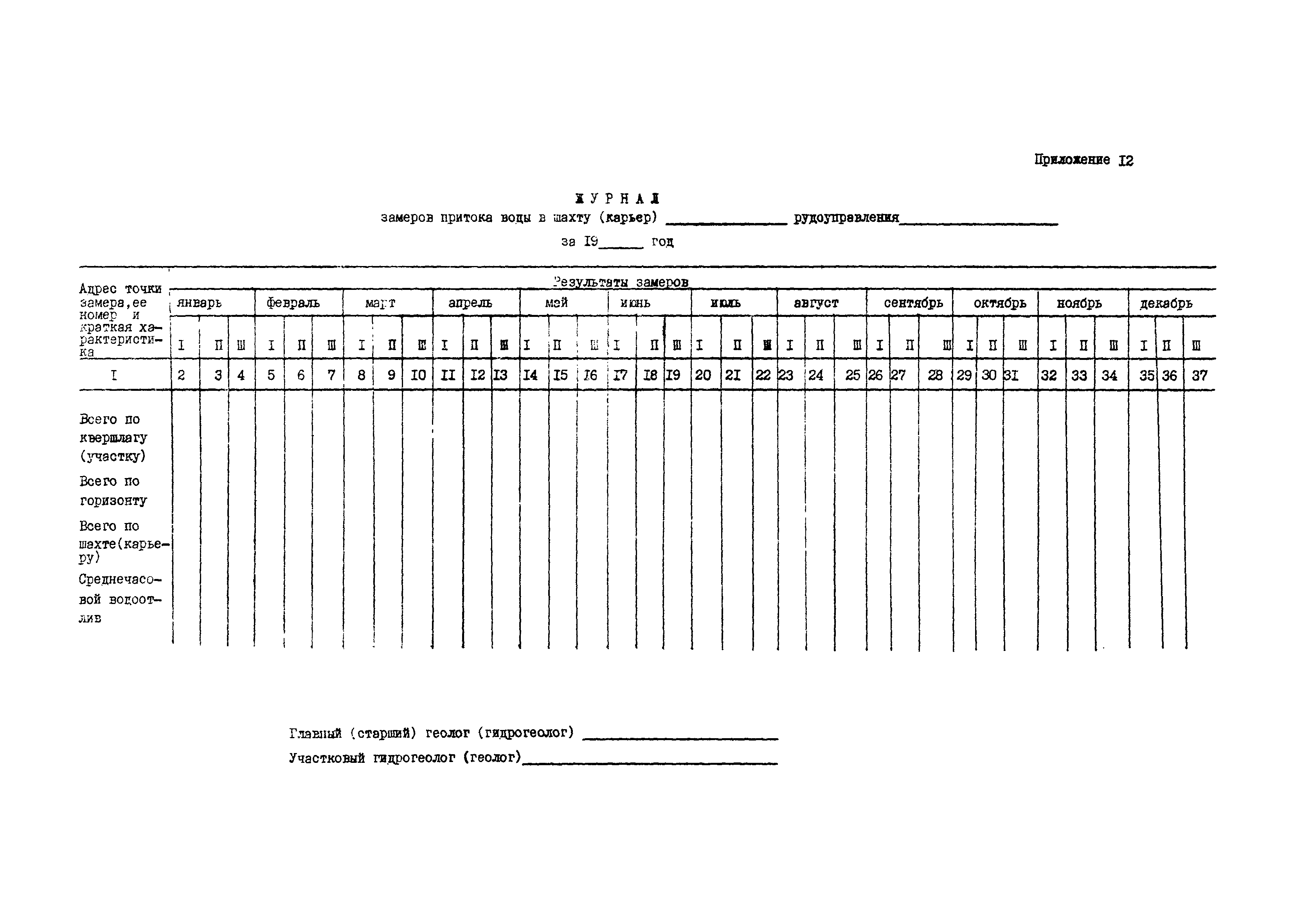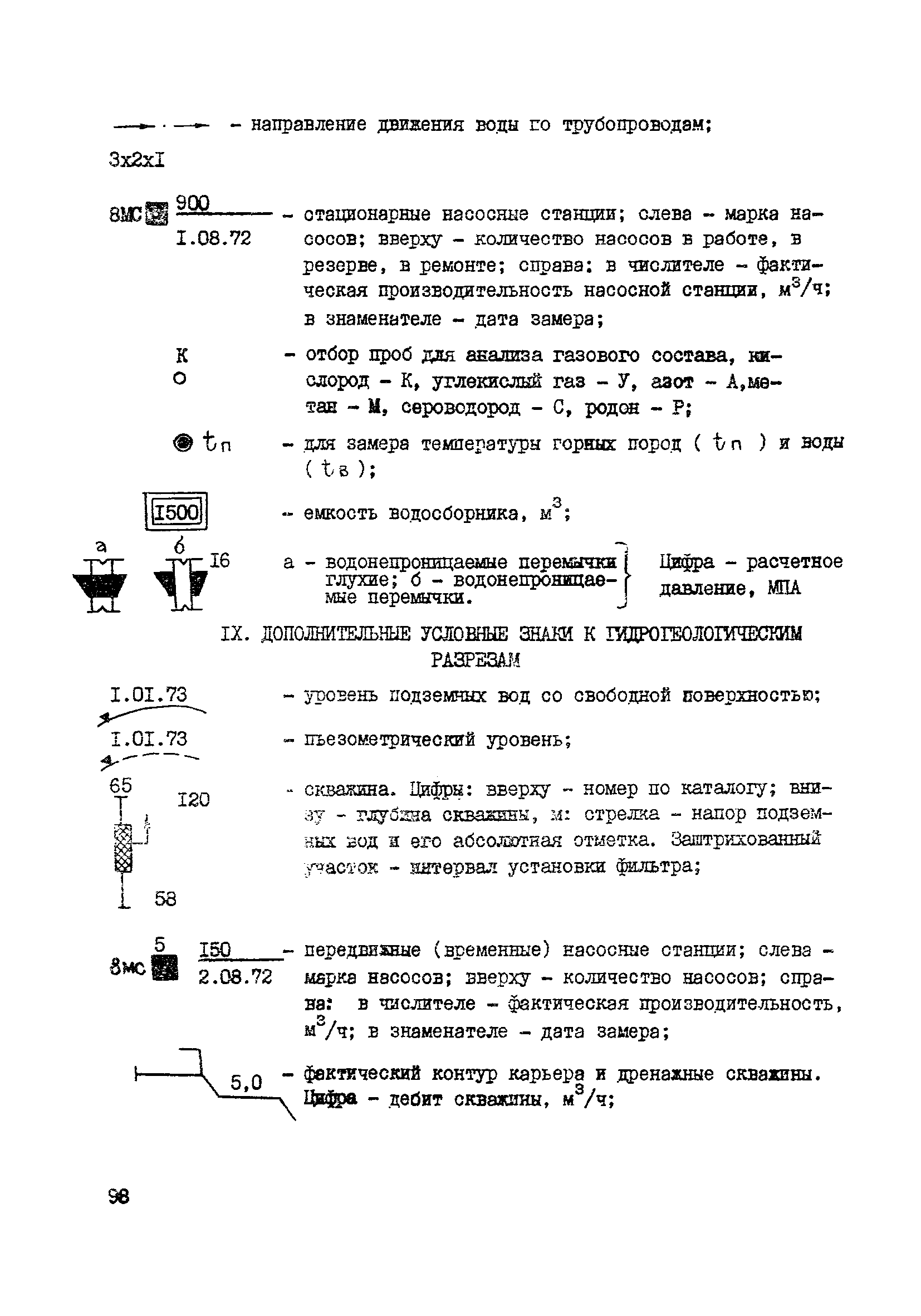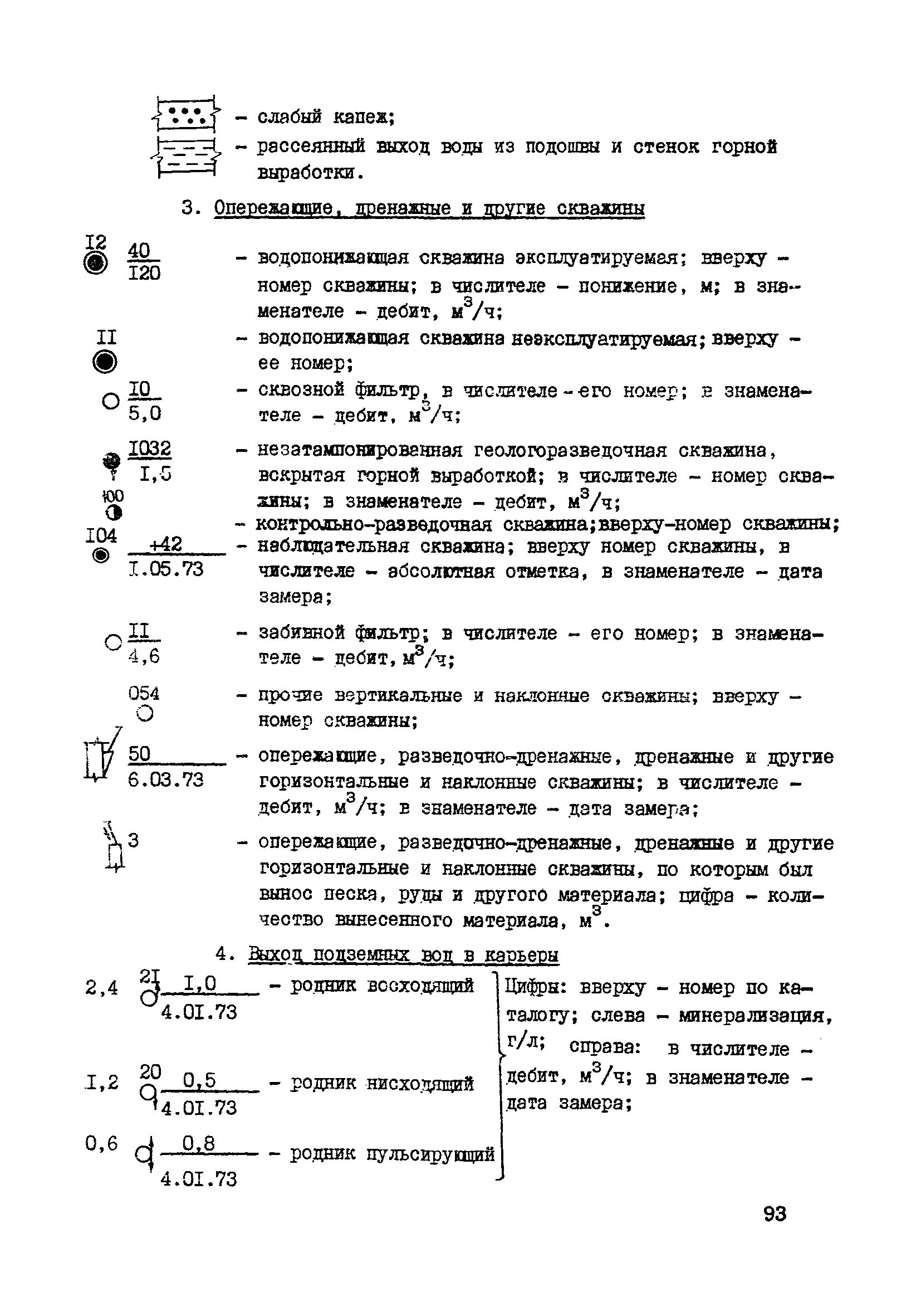 | Оглавление: | 1 Общие положения 2 Гидрогеологические и инженерно-геологические работы в подземных горных выработках 2.1 Наблюдения за деформациями горных выработок 2.2 Наблюдения за водопритоками в горные выработки 2.3 Наблюдения за химическим составом подземных и загрязненных подземных вод 2.4 Наблюдения при бурении разведочных, опережающих и дренажных скважин 2.5 Гидрогеологическая съемка 2.6 Специальные наблюдения 2.7 Геокриологические наблюдения 3 Гидрогеологические и инженерно-геологические работы в открытых горных выработках 3.1 Наблюдения за устойчивостью и деформациями уступов, бортов карьеров и отвалов породы 3.2 Наблюдение за водопритоками 3.3 Наблюдения за химическим составом подземных и загрязненных карьерных вод 3.4 Гидрогеологическая съемка карьера 3.5 Специальные наблюдения в карьере 3.6 Геокриологические наблюдения 3.7 Наблюдения за ливневыми и поверхностными водами 4 Наблюдения при сооружении и эксплуатации дренажных систем карьерных и шахтных полей 4.1 Наблюдения при сооружении и эксплуатации системы водопонижающих скважин 4.2 Наблюдения при сооружении и эксплуатации подземного дренажного комплекса 5 Гидрогеологические и инженерно-геологические наблюдения на поверхности в пределах горного отвода 5.1 Гидрогеологическое и инженерно-геологическое обследование на поверхности 5.2 Наблюдения за режимом поверхностных вод 5.3 Наблюдения за режимом подземных вод 6 Гидрогеологические наблюдения по охране водных ресурсов 7 Специальные гидрохимические наблюдения для оценки агрессивного воздействия подземных и рудничных вод на крепь, армировку и оборудование подземных горных выработок 7.1 Оценка агрессивности вод 7.2 Периодичность и правила отбора проб воды 8 Гидрогеологические наблюдения по рациональному использованию подземных вод и водоснабжению предприятий 9 Первичный учет использования вод 10 Камеральная обработка результатов наблюдений и отчетность Литература Приложение 1. Комплекс гидрогеологических и инженерно—геологических наблюдений при подземном способе разработки месторождений Приложение 2. Комплекс гидрогеологических и инженерно—геологических наблюдений при открытом способе разработки месторождений Приложение 3. Характеристика сложности инженерно—геологических условий разработки месторождений Приложение 4. Классификация месторождений полезных ископаемых по гидрогеологическим и инженерно—геологическим условиям освоения Приложение 5. Примерный перечень исходной документации Приложение 6. Приборы и оборудование для проведения гидрогеологических и инженерно—геологических наблюдений Приложение 7. Журнал регистрации проб для лабораторного определения физико—механических свойств Приложение 8. Журнал замеров водопритоков по стволам шахт Приложение 9. Журнал работы водопонижающих колодцев и иглофильтровых установок Приложение 10. Журнал работы забивных (сквозных) фильтров, восстающих и горизонтальных дренажных скважин Приложение 11. Журнал наблюдений за работой насосов водоотлива Приложение 12. Журнал замеров притока воды в шахту (карьер) Приложение 13. Акт прорыва воды в шахту (карьер) Приложение 14. Ведомость отбора проб воды на химические анализы Приложение 15. Записная книжка-дневник гидрогеолога Приложение 16. Журнал работы водопонижающих скважин Приложение 17. Журнал замеров уро