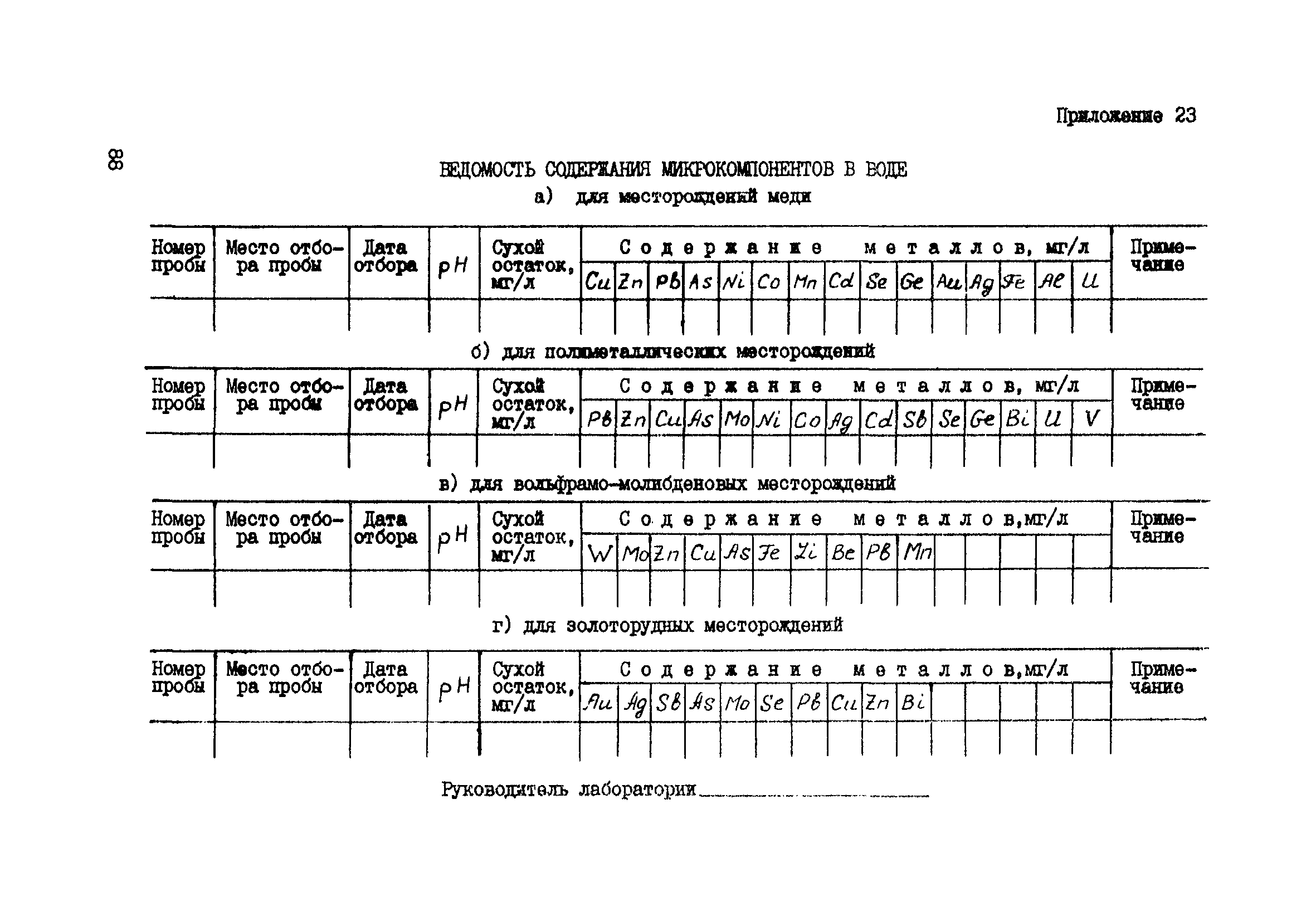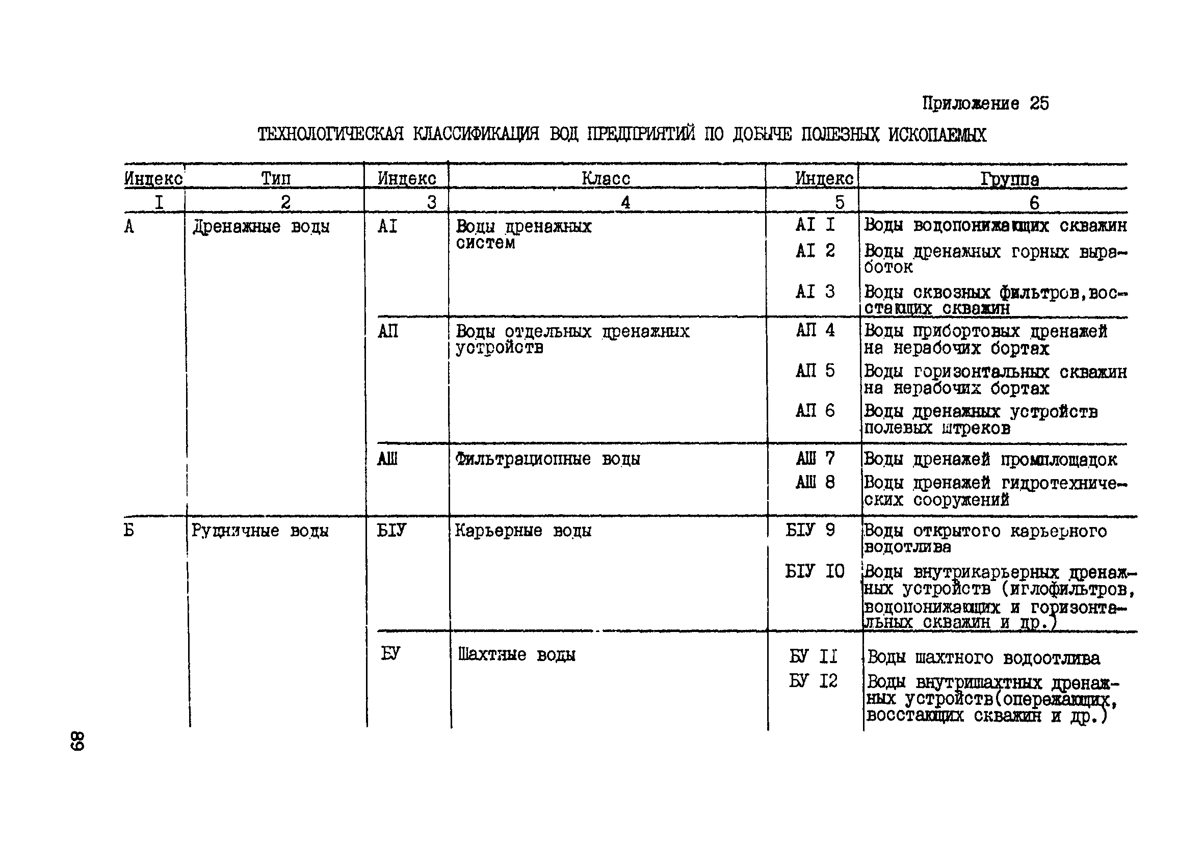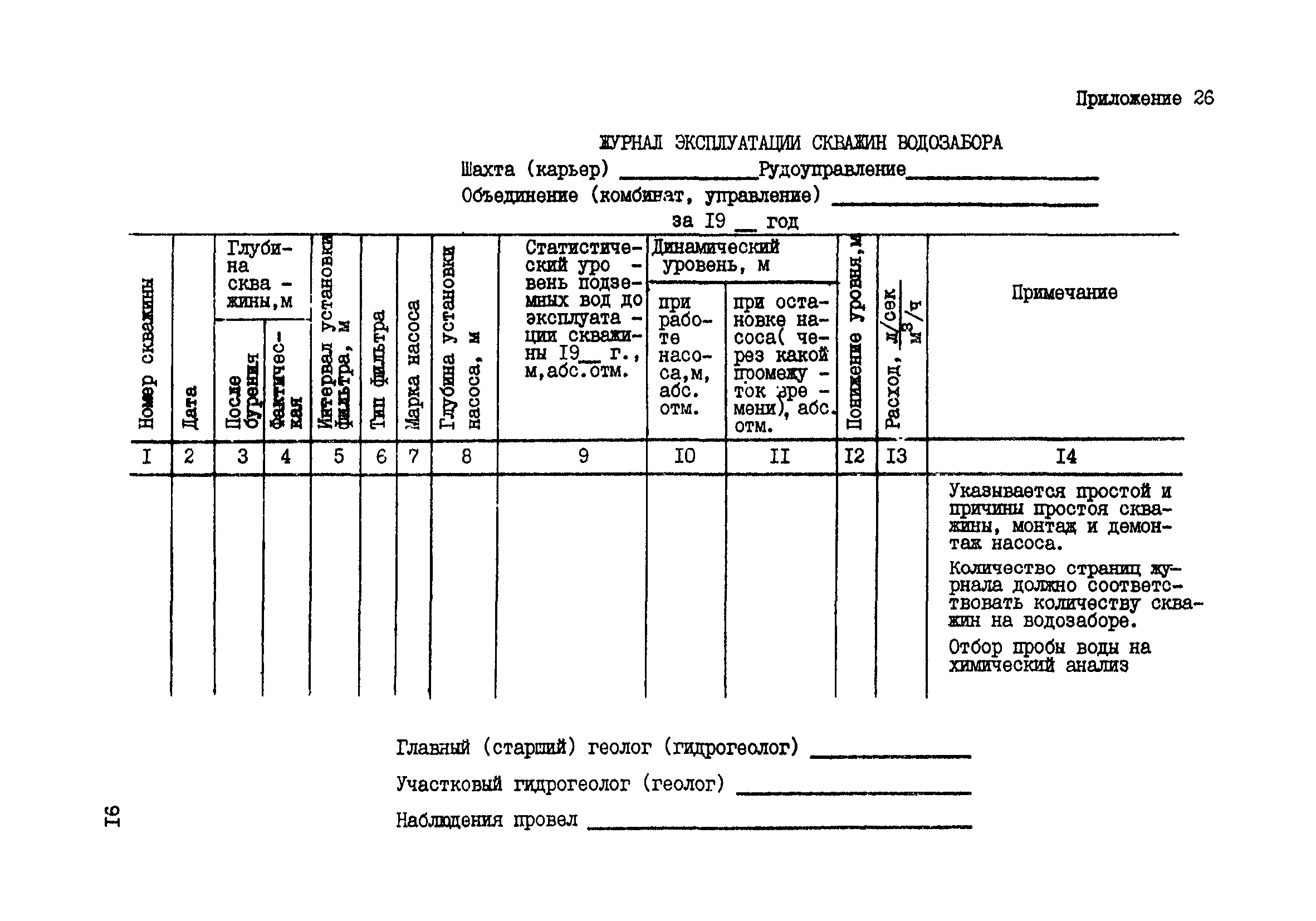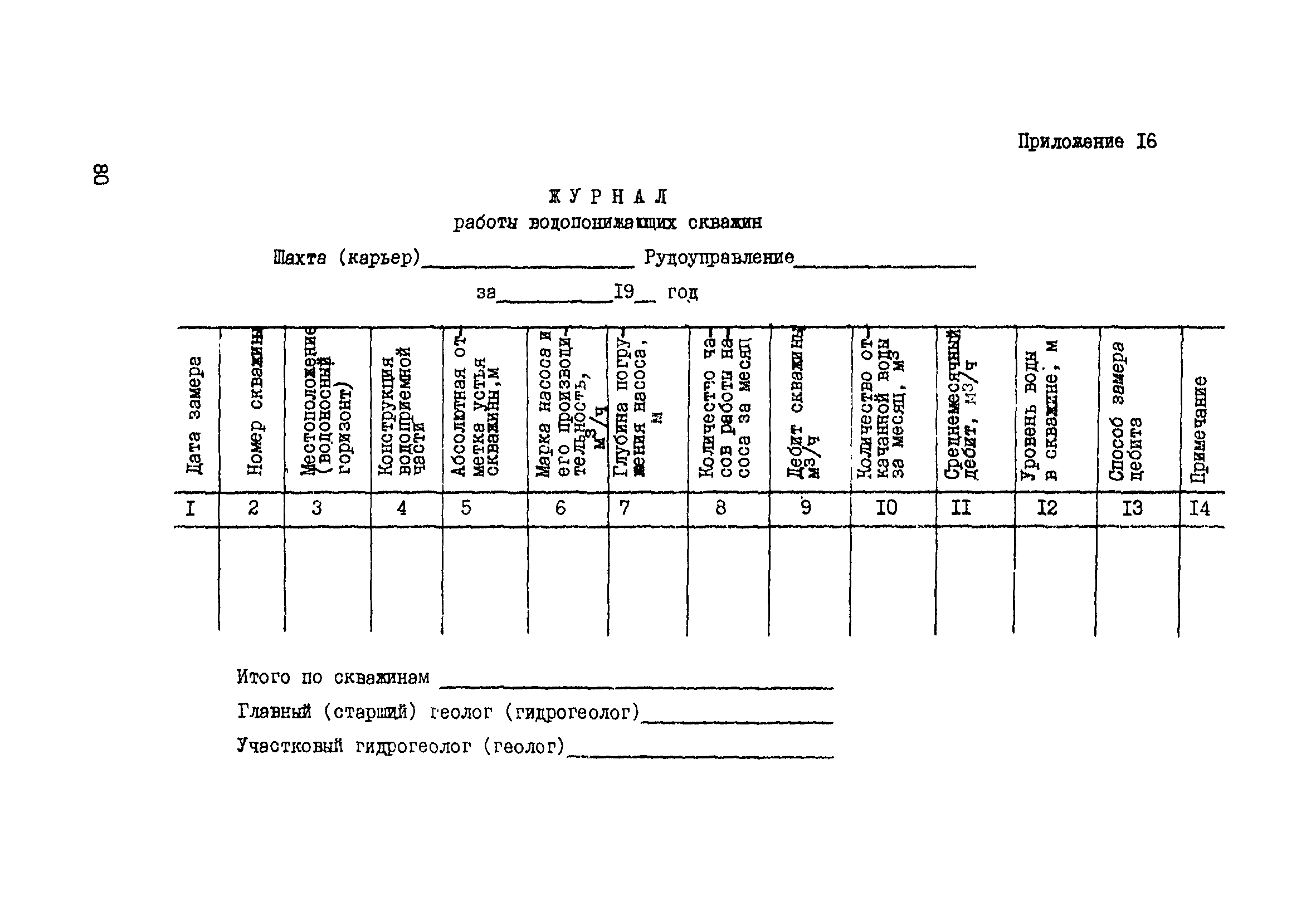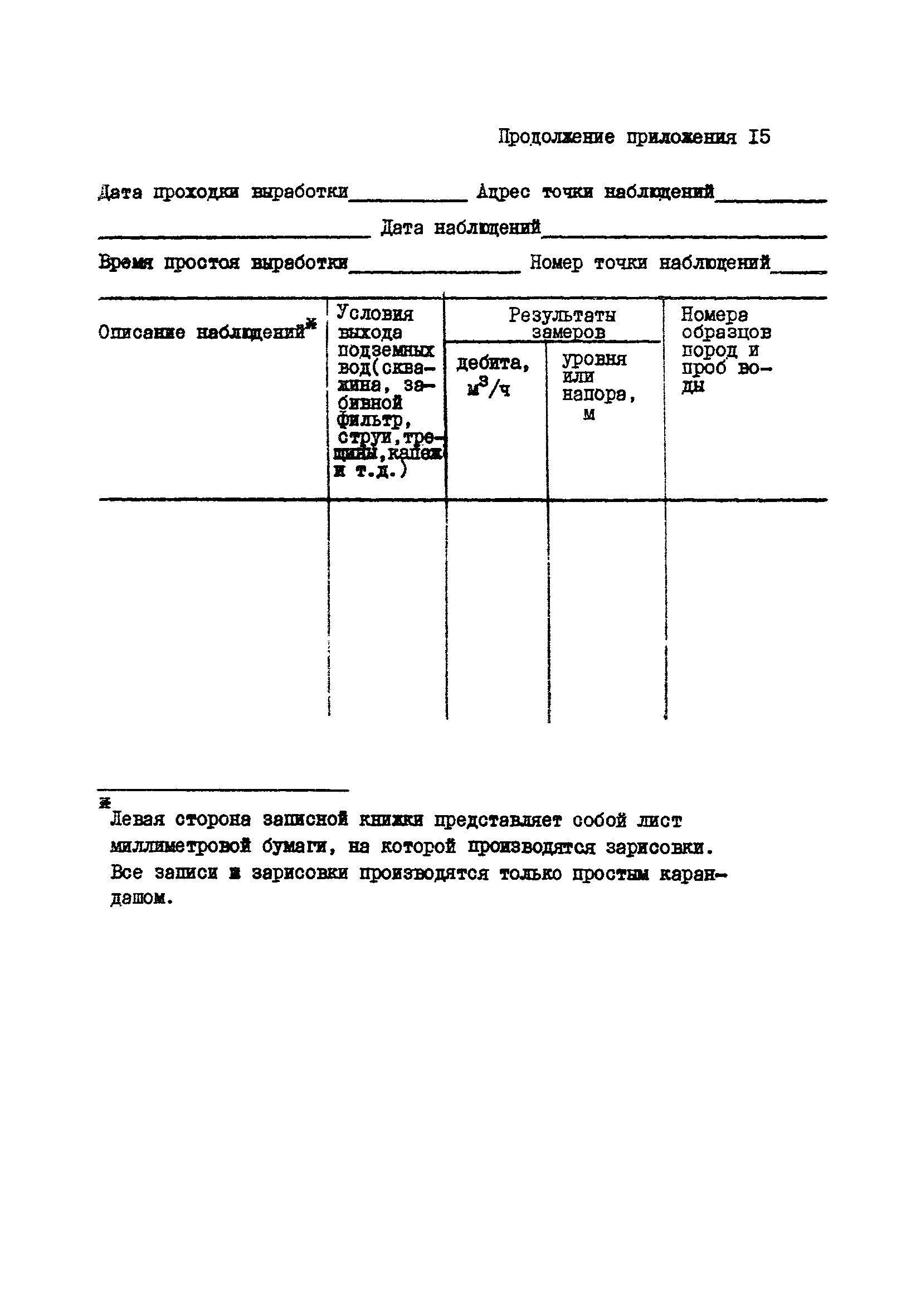 | Оглавление: | 1 Общие положения 2 Гидрогеологические и инженерно-геологические работы в подземных горных выработках 2.1 Наблюдения за деформациями горных выработок 2.2 Наблюдения за водопритоками в горные выработки 2.3 Наблюдения за химическим составом подземных и загрязненных подземных вод 2.4 Наблюдения при бурении разведочных, опережающих и дренажных скважин 2.5 Гидрогеологическая съемка 2.6 Специальные наблюдения 2.7 Геокриологические наблюдения 3 Гидрогеологические и инженерно-геологические работы в открытых горных выработках 3.1 Наблюдения за устойчивостью и деформациями уступов, бортов карьеров и отвалов породы 3.2 Наблюдение за водопритоками 3.3 Наблюдения за химическим составом подземных и загрязненных карьерных вод 3.4 Гидрогеологическая съемка карьера 3.5 Специальные наблюдения в карьере 3.6 Геокриологические наблюдения 3.7 Наблюдения за ливневыми и поверхностными водами 4 Наблюдения при сооружении и эксплуатации дренажных систем карьерных и шахтных полей 4.1 Наблюдения при сооружении и эксплуатации системы водопонижающих скважин 4.2 Наблюдения при сооружении и эксплуатации подземного дренажного комплекса 5 Гидрогеологические и инженерно-геологические наблюдения на поверхности в пределах горного отвода 5.1 Гидрогеологическое и инженерно-геологическое обследование на поверхности 5.2 Наблюдения за режимом поверхностных вод 5.3 Наблюдения за режимом подземных вод 6 Гидрогеологические наблюдения по охране водных ресурсов 7 Специальные гидрохимические наблюдения для оценки агрессивного воздействия подземных и рудничных вод на крепь, армировку и оборудование подземных горных выработок 7.1 Оценка агрессивности вод 7.2 Периодичность и правила отбора проб воды 8 Гидрогеологические наблюдения по рациональному использованию подземных вод и водоснабжению предприятий 9 Первичный учет использования вод 10 Камеральная обработка результатов наблюдений и отчетность Литература Приложение 1. Комплекс гидрогеологических и инженерно—геологических наблюдений при подземном способе разработки месторождений Приложение 2. Комплекс гидрогеологических и инженерно—геологических наблюдений при открытом способе разработки месторождений Приложение 3. Характеристика сложности инженерно—геологических условий разработки месторождений Приложение 4. Классификация месторождений полезных ископаемых по гидрогеологическим и инженерно—геологическим условиям освоения Приложение 5. Примерный перечень исходной документации Приложение 6. Приборы и оборудование для проведения гидрогеологических и инженерно—геологических наблюдений Приложение 7. Журнал регистрации проб для лабораторного определения физико—механических свойств Приложение 8. Журнал замеров водопритоков по стволам шахт Приложение 9. Журнал работы водопонижающих колодцев и иглофильтровых установок Приложение 10. Журнал работы забивных (сквозных) фильтров, восстающих и горизонтальных дренажных скважин Приложение 11. Журнал наблюдений за работой насосов водоотлива Приложение 12. Журнал замеров притока воды в шахту (карьер) Приложение 13. Акт прорыва воды в шахту (карьер) Приложение 14. Ведомость отбора проб воды на химические анализы Приложение 15. Записная книжка-дневник гидрогеолога Приложение 16. Журнал работы водопонижающих скважин Приложение 17. Журнал замеров уро