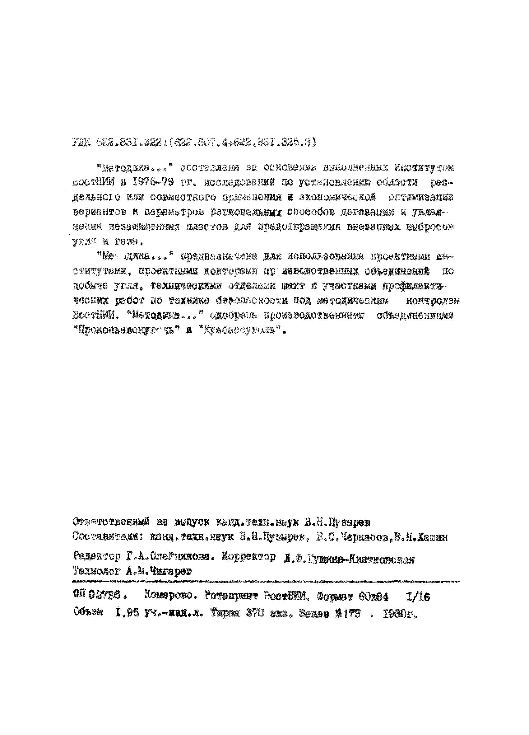 | Оглавление: | 1 Общие положения 2 Исходные данные для расчетов 3 Получение исходных данных 4 Коэффициенты, входящие в расчеты 5 Задачи оптимизации и ее решение 6 Программа расчетов оптимальных параметров дегазации и увлажнения пластов для "ЭЦВМ "Наири-2" 7 Примеры оптимизации вариантов и параметров дегазации и увлажнения выбросоопасных пластов |
