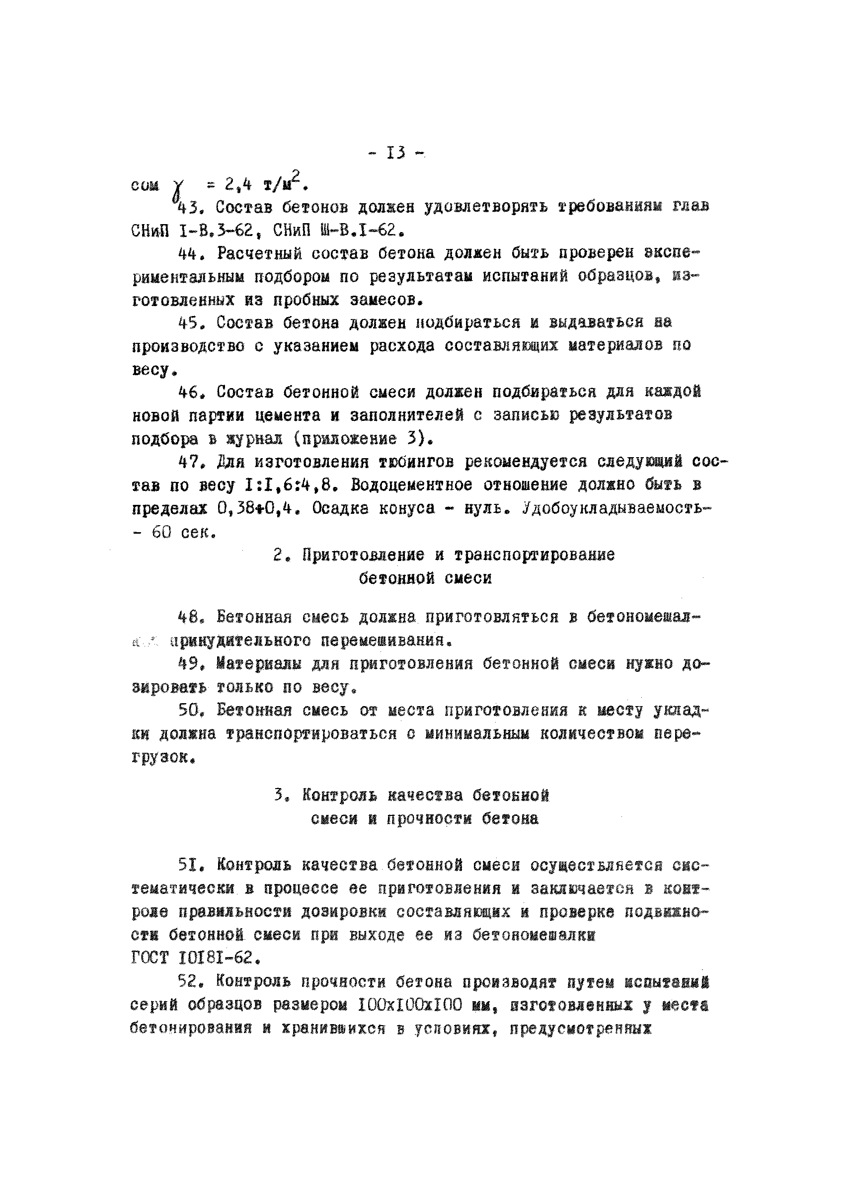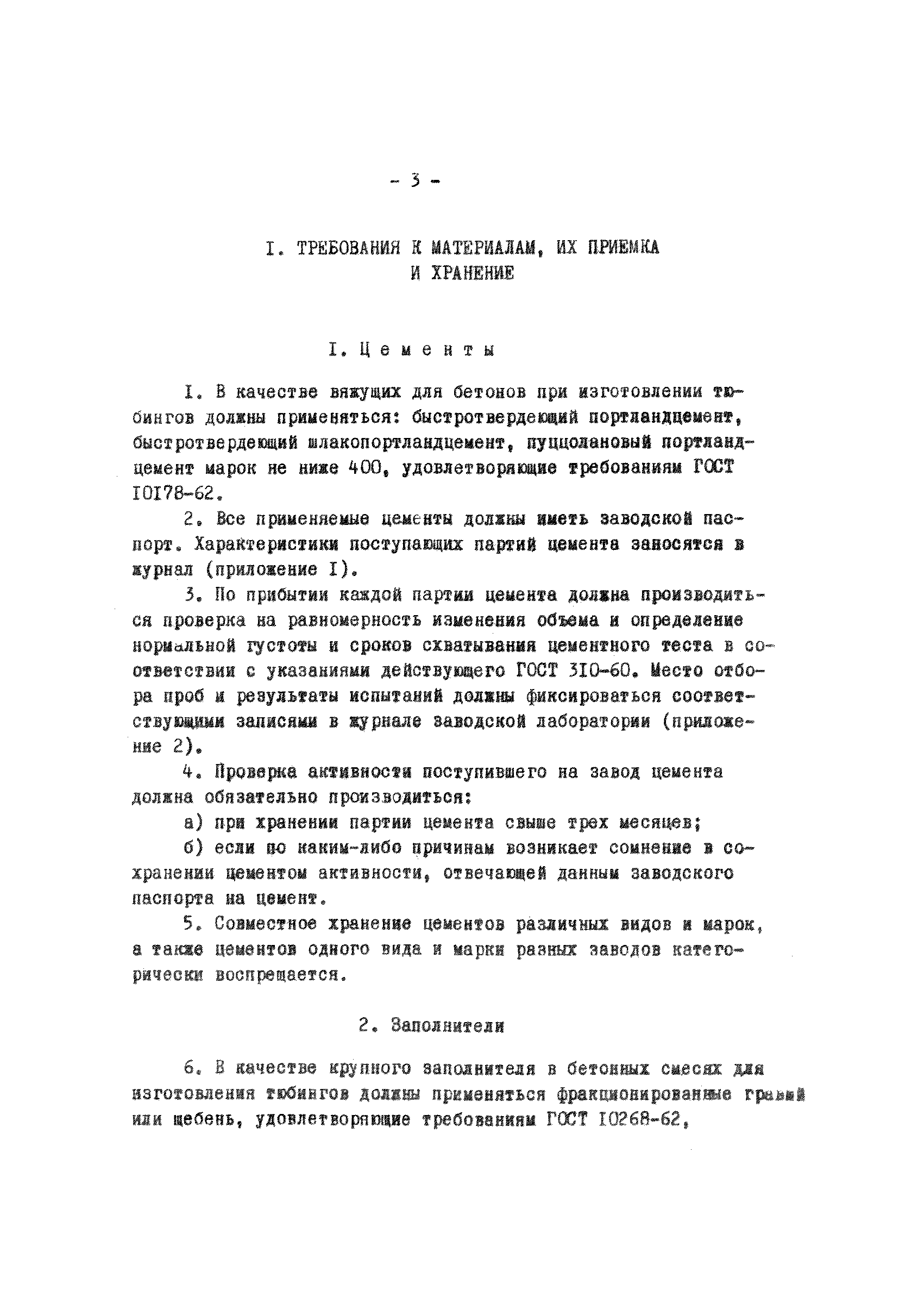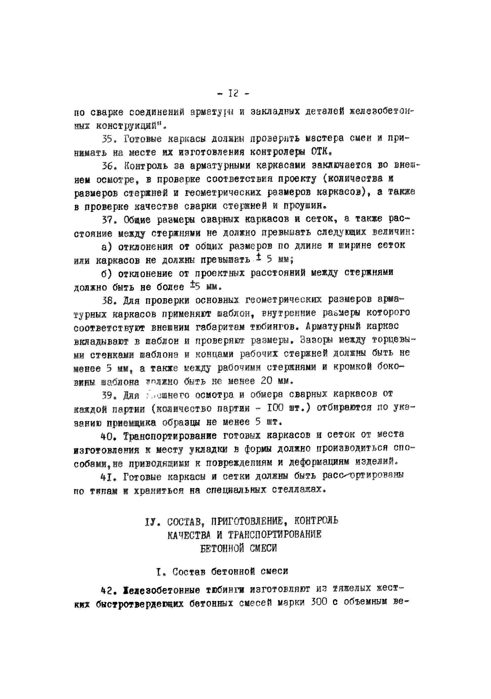| Оглавление: | Глава I. Требования к материалам, их приемка и хранение 1 Цементы 2 Заполнители 3 Вода 4 Арматурная сталь Глава II. Формы, поддоны и требования к ним Глава III. Изготовление арматурных каркасов и требования к ним Глава IV. Состав, приготовление, контроль качества и транспортирование бетонной смеси 1 Состав бетонной смеси 2 Приготовление и транспортирование бетонной смеси 3 Контроль качества бетонной смеси и прочности бетона Глава V. Формование и пропаривание тюбингов Глава VI. Контроль качества железобетонных тюбингов 1 Требования, предъявляемые к железобетонным тюбингам 2 Контроль геометрических размеров тюбингов непосредственным замером 3 Контрольная сборка тюбинговых колец крепи 4 Контроль прочности тюбинговой разрушающей нагрузкой на изгиб Глава VII. Маркировка, складирование и отпуск тюбингов Приложение 1. Журнал учета поступающих цементов Приложение 2. Журнал испытания цемента Приложение 3. Карточка подбора состава бетона Приложение 4. Журнал испытания контрольных бетонных образцов Приложение 5. Журнал учета качества тюбингов Приложение 6. Методика испытаний элементов гладкостенной тюбинговой крепи |