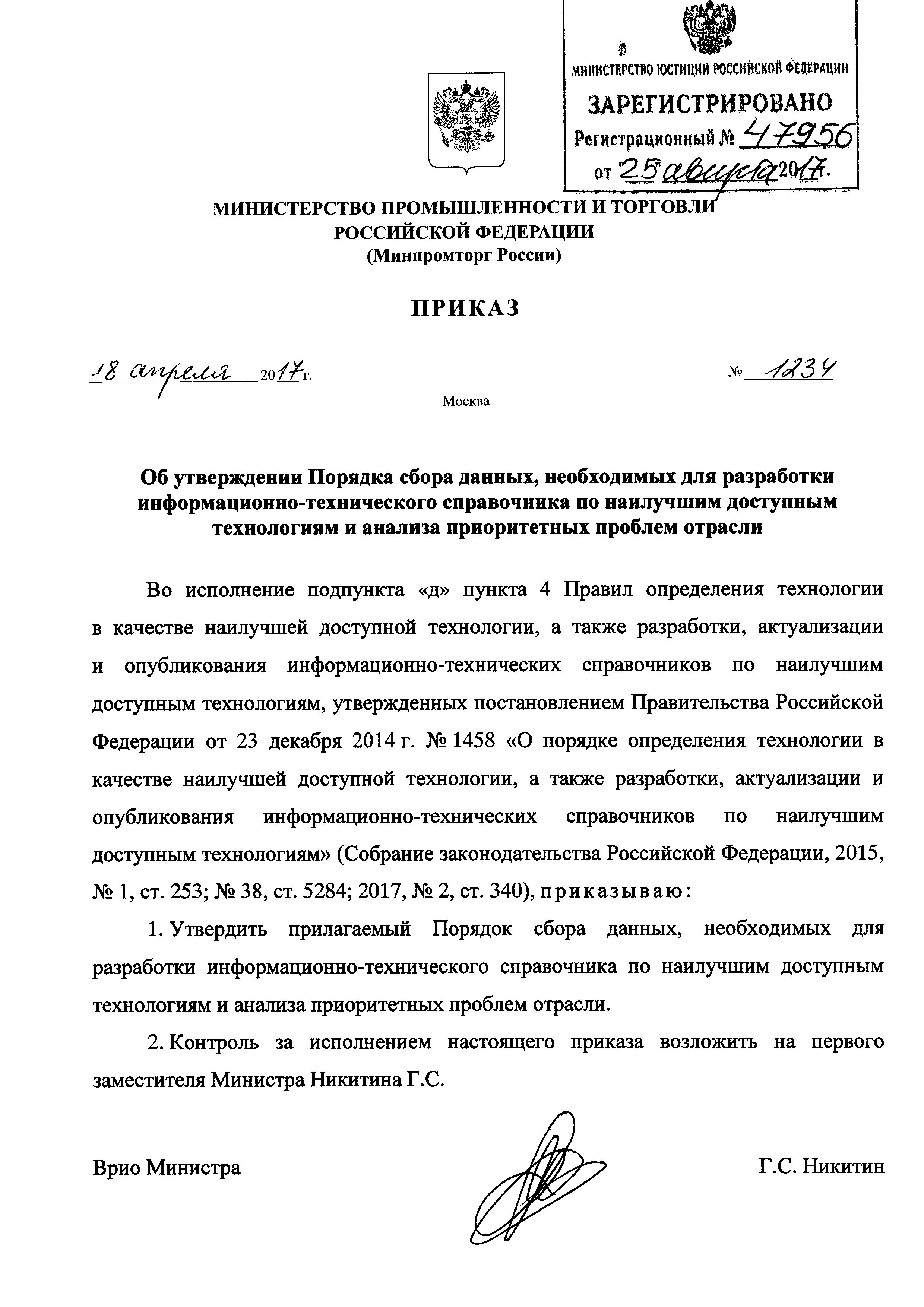Порядок сбора данных, необходимых для разработки информационно-технического справочника по наилучшим доступным технологиям и анализа приоритетных проблем отрасли| Статус: | утратил силу | | Название рус.: | Порядок сбора данных, необходимых для разработки информационно-технического справочника по наилучшим доступным технологиям и анализа приоритетных проблем отрасли | | Дата добавления в базу: | 01.01.2018 | | Дата актуализации: | 01.01.2021 | | Дата введения: | 08.09.2017 | | Дата окончания срока действия: | 07.03.2020 | | Область применения: | Порядок определяет правила сбора данных, необходимых для разработки информационно-технического справочника по наилучшим доступным технологиям | | Утверждён: | 18.04.2017 Министерство промышленности и торговли РФ (1234)
