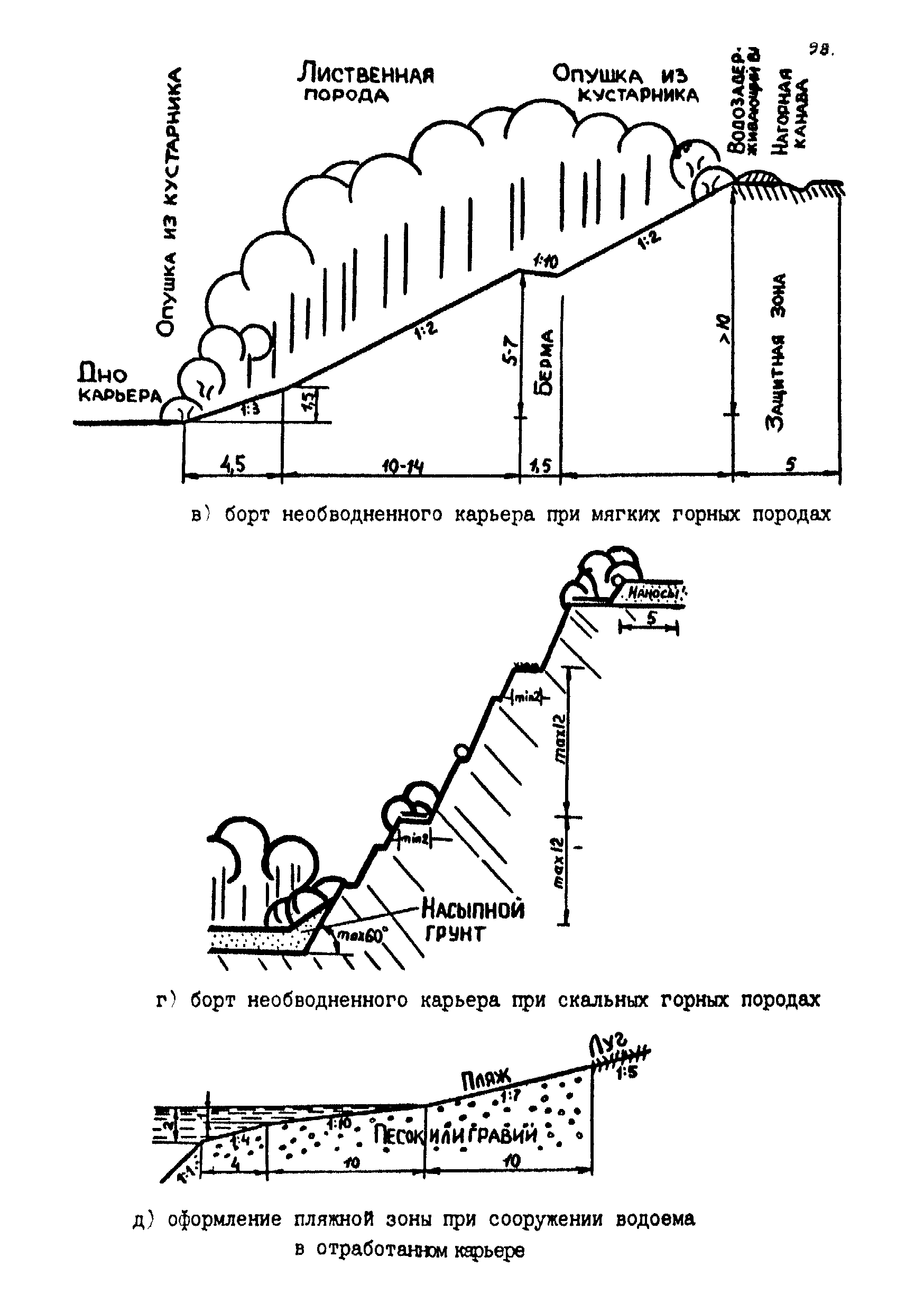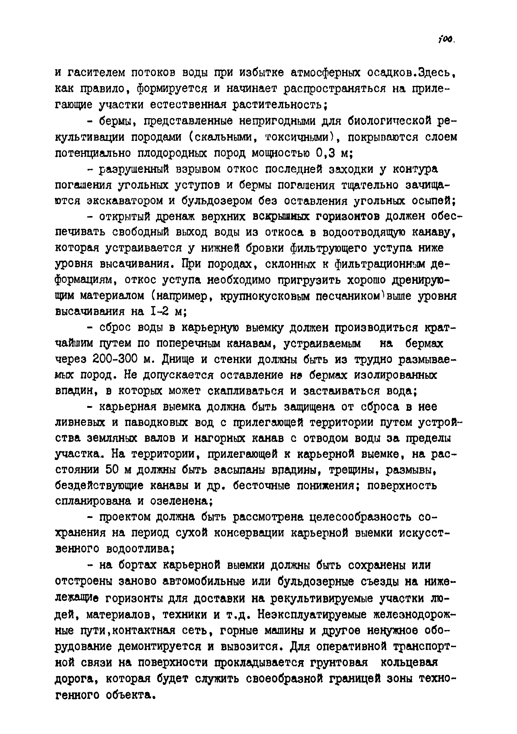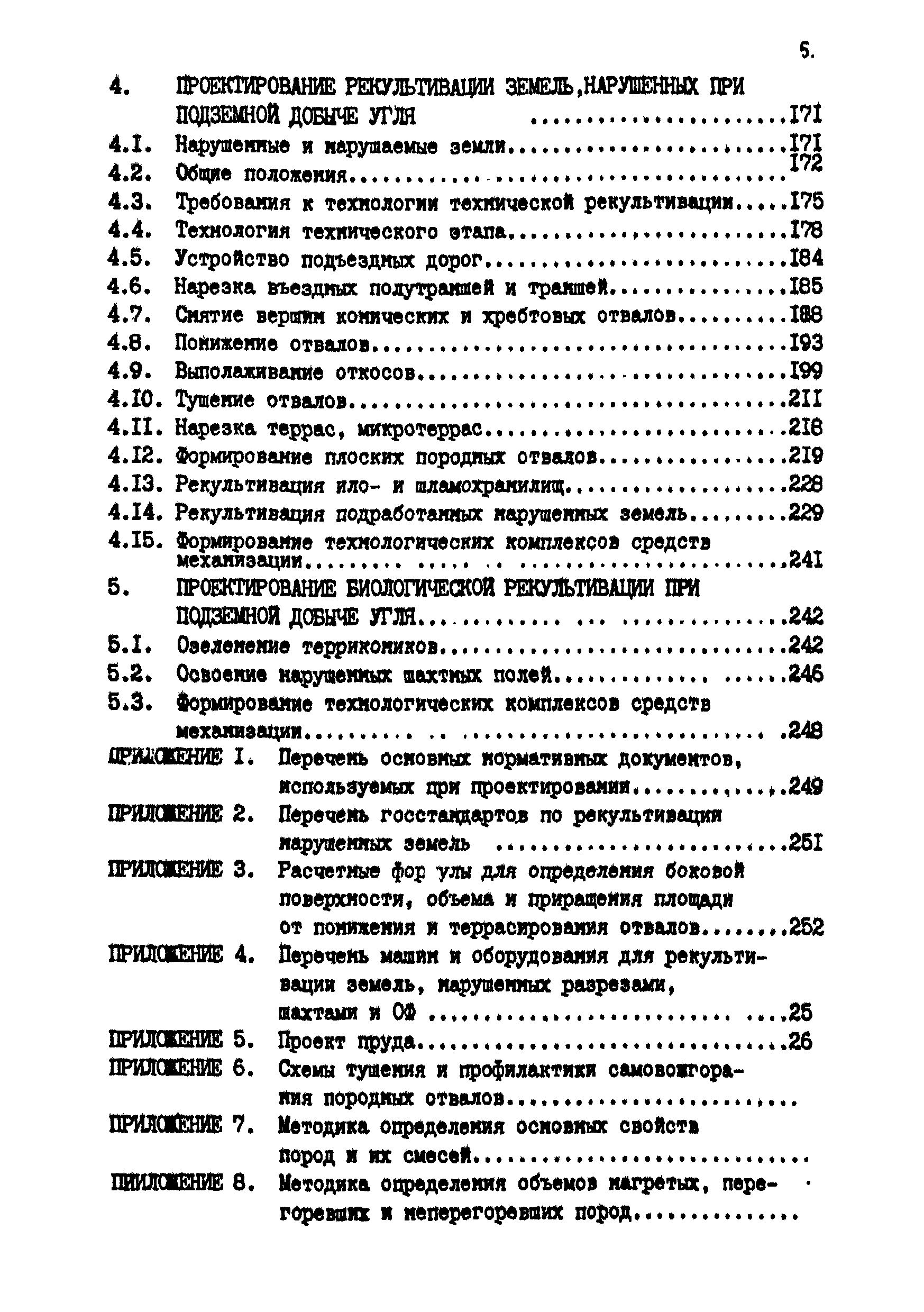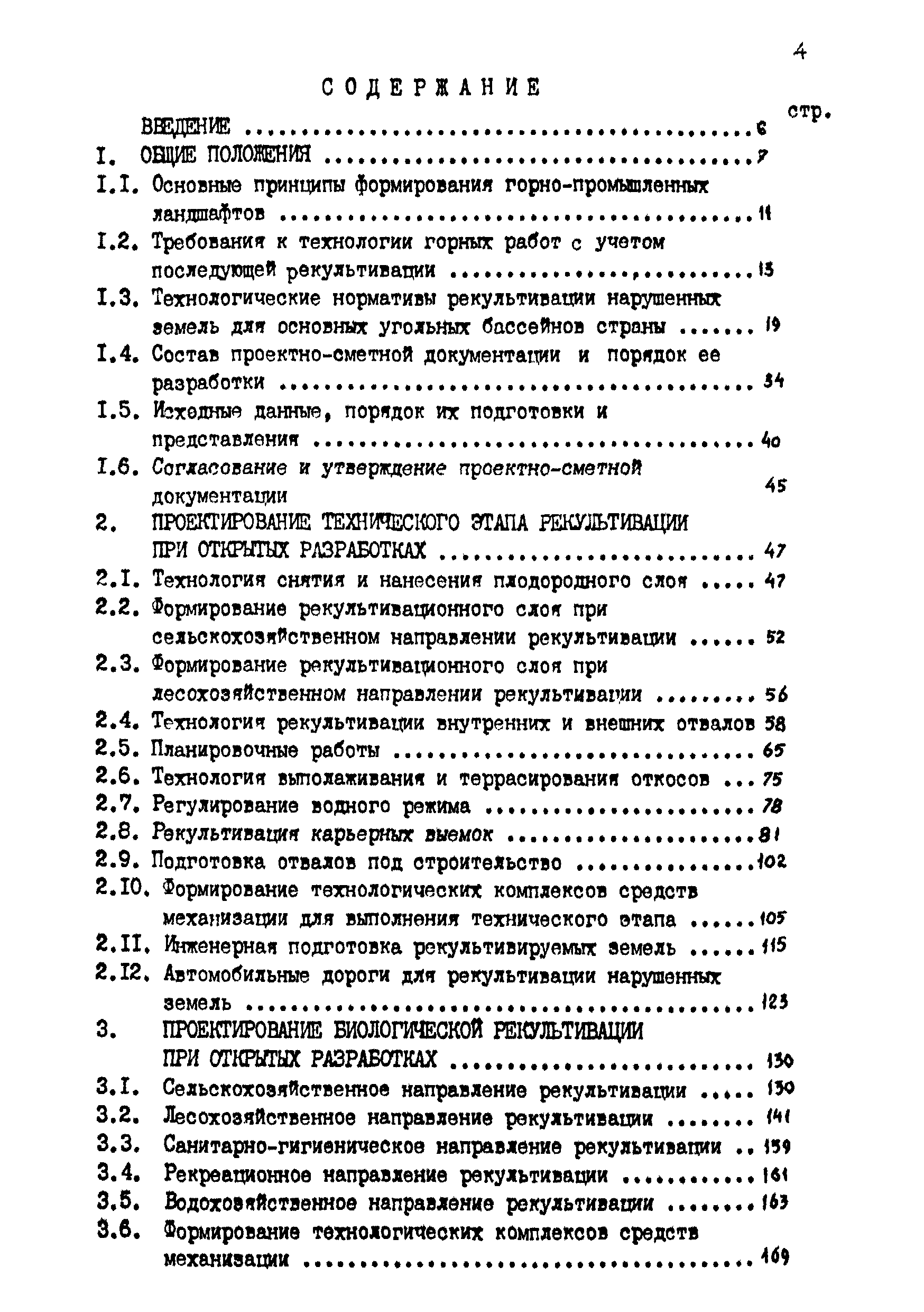 | Оглавление: | Введение 1 Общие положения 1.1 Основные принципы формирования горно-промышленных ландшафтов 1.2 Требовании к технологии горных работ с учётом последующей рекультивации 1.3 Технологические нормативы рекультивации нарушенных земель для основных угольных бассейнов страны 1.4 Состав проектно-сметной документации и порядок ее разработки 1.5 Исходные данные, порядок их подготовки и представления 1.6 Согласование и утверждение проектно—сметной документации 2 Проектирование технического этапа рекультивации при открытых разработках 2.1 Технология снятия и нанесения плодородного слоя 2.2 Формирование рекультивационного слоя при сельскохозяйственном направлении рекультивации 2.3 Формирование рекультивационного слоя при лесохозяйственном направлении рекультивации 2.4 Технология рекультивации внутренних и внешних отвалов 2.5 Планировочные работы 2.6 Технологии выполаживания и террасирования откосов 2.7 Регулирование водного режима 2.8 Рекультивация карьерных выемок 2.9 Подготовка отвалов под строительство 2.10 Формирование технологических комплексов средств механизации для выполнения технического этапа 2.11 Инженерная подготовка рекультивируемых земель 2.12 Автомобильные дороги для рекультивации нарушенных земель 3 Проектирование биологической рекультивации при открытых разработках 3.1 Сельскохозяйственное направление рекультивации 3.2 Лесохозяйственное направление рекультивации 3.3 Санитарно-гигиеническое направление рекультивации 3.4 Рекреационное направление рекультивации 3.5 Водохозяйственное направление рекультивации 3.6 Формирование технологических комплексов средств механизации 4 Проектирование рекультивации земель, нарушенных при подземной добыче угля 4.1 Нарушенные и нарушаемые земли 4.2 Общие положения 4.3 Требования к технологии технической рекультивации 4.4 Технология технического этапа 4.5 Устройство подъездных дорог 4.6 Нарезка въездных полутраншей и траншей 4.7 Снятие вершин конических и хребтовых отвалов 4.8 Понижение отвалов 4.9 Выполаживание откосов 4.10 Тушение отвалов 4.11 Нарезка террас, микротеррас 4.12 Формирование плоских породных отвалов 4.13 Рекультивация ило- и шламохранилищ 4.14 Рекультивация подрабатываемых нарушенных земель 4.15 Формирование технологических комплексов средств механизации 5 Проектирование биологической рекультивации при подземной добыче угля 5.1 Озеленение террикоников 5.2 Освоение нарушенных шахтных полей 5.3 Формирование технологических комплексов средств механизации Приложение 1. Перечень основных нормативных документов, используемых при проектировании Приложение 2. Перечень госстандартов по рекультивации нарушенных земель Приложение 3. Расчетные формулы для определения боковой поверхности, объема и приращения площади Приложение 4. Перечень машин и оборудования для рекультивации земель, нарушенных разрезами, шахтами и ОФ Приложение 5. Проект пруда Приложение 6. Схемы тушения и профилактики самовозгорания породных отвалов Приложение 7. Методика определения основных свойств пород и их смесей Приложение 8. Методика определения объемов нагретых, перегоревших и неперегоревших пород |