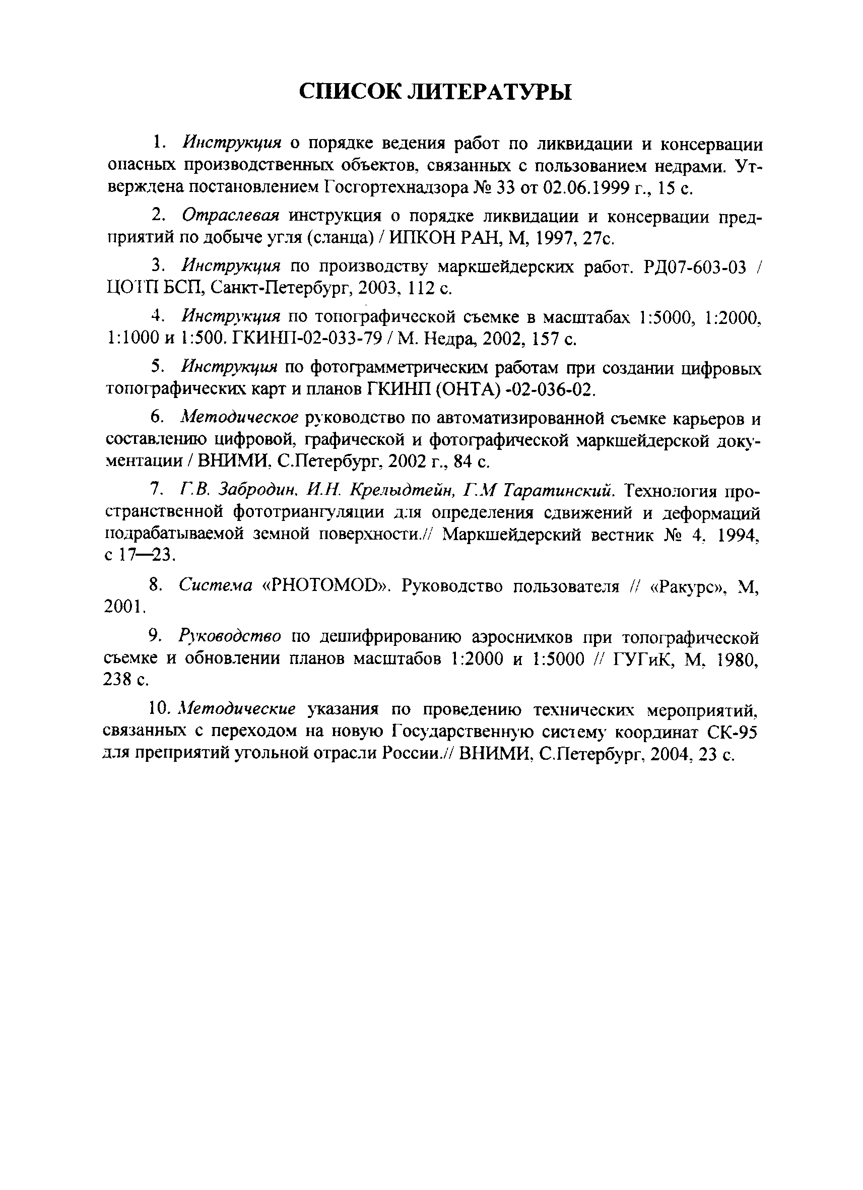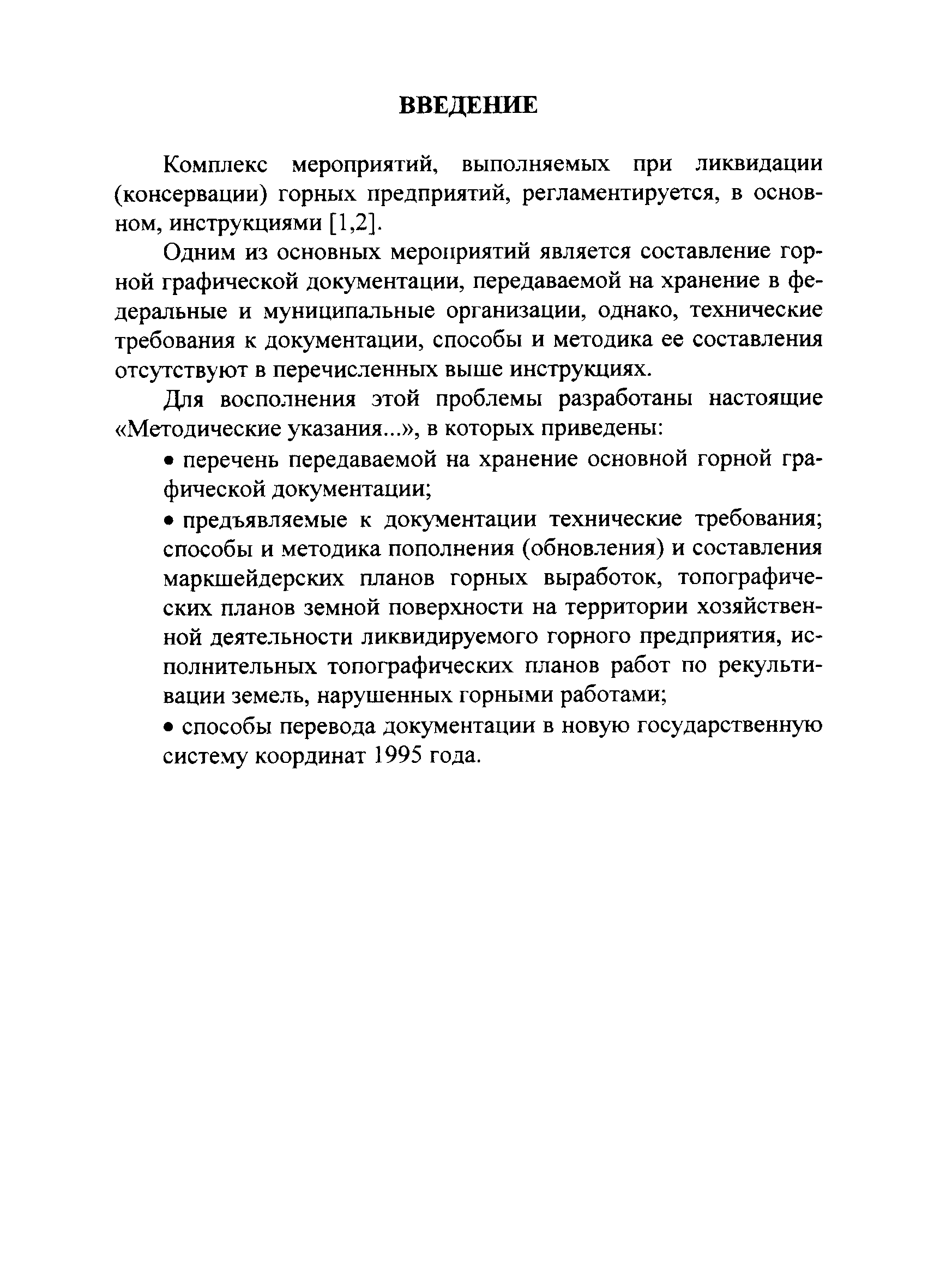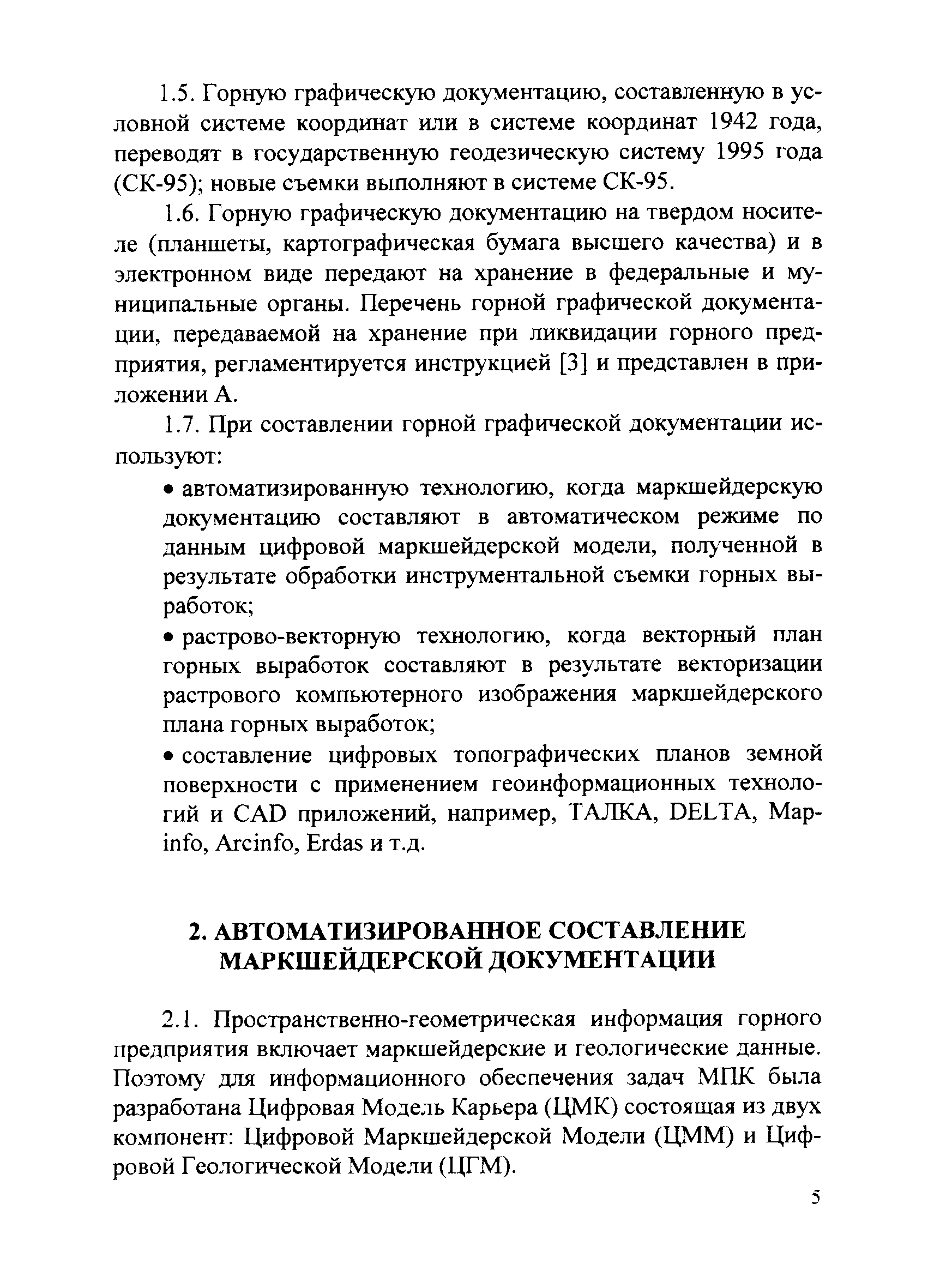 | Оглавление: | Введение 1 Общие положения 2 Автоматизированное составление горной графической документации 3 Растрово-векторная технология составления горной графической документации 4 Составление топографических планов земной поверхности 5 Перевод документации в Государственную систему 1995 года (СК-95) Приложение А. Перечень необходимой горной графической документации, передаваемой на хрангение при ликвидации предприятия |