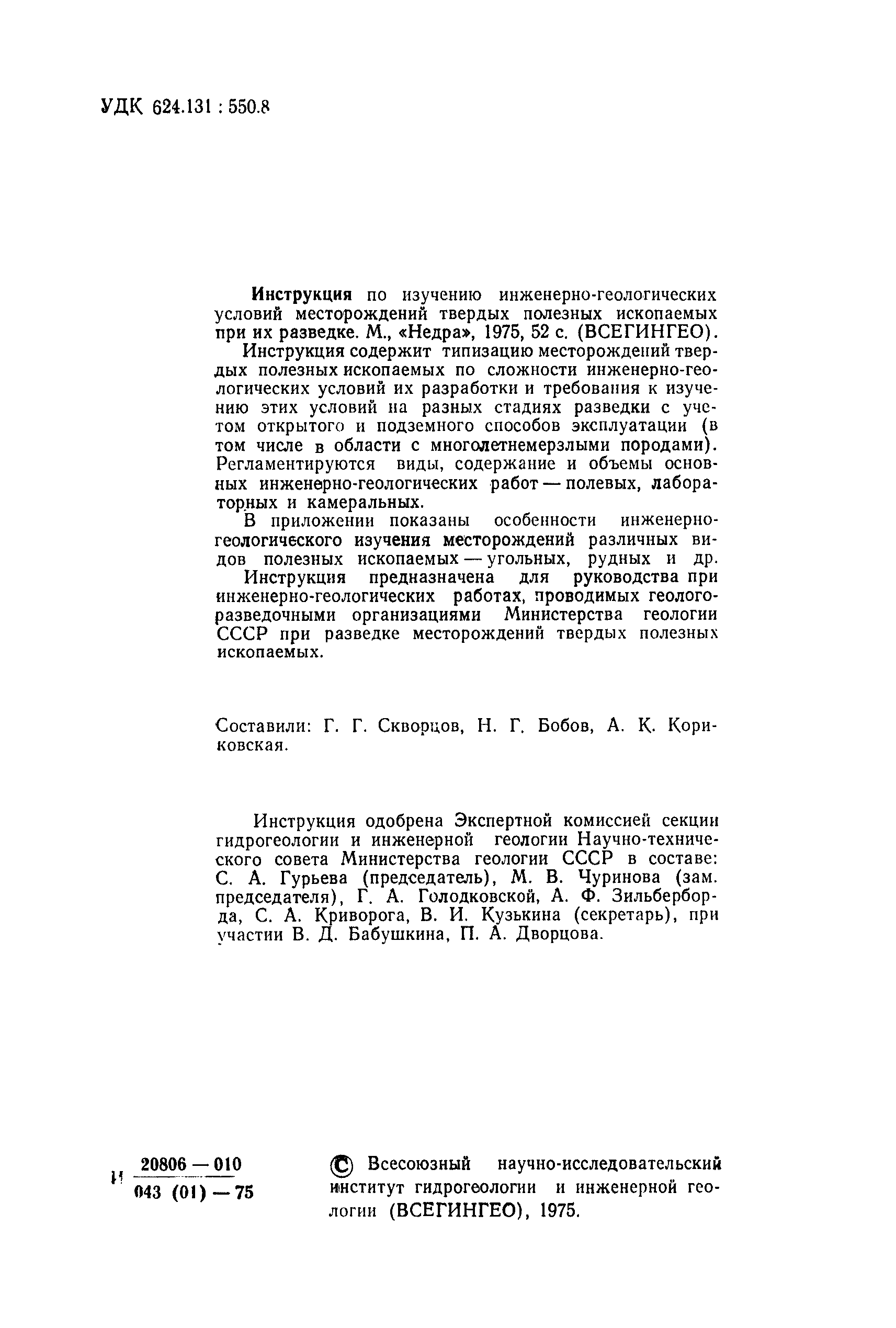 | Название рус.: | Инструкция по изучению инженерно-геологических условий месторождений твердых полезных ископаемых при их разведке |