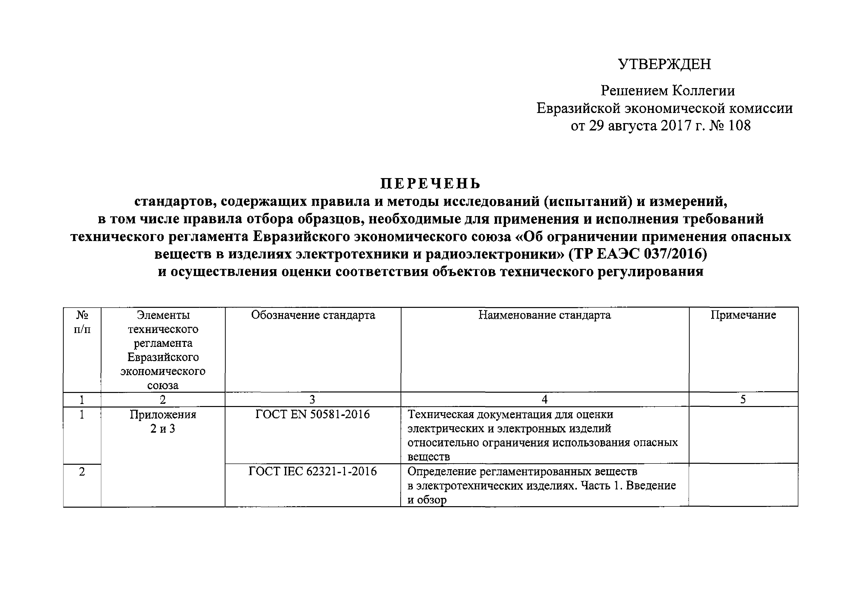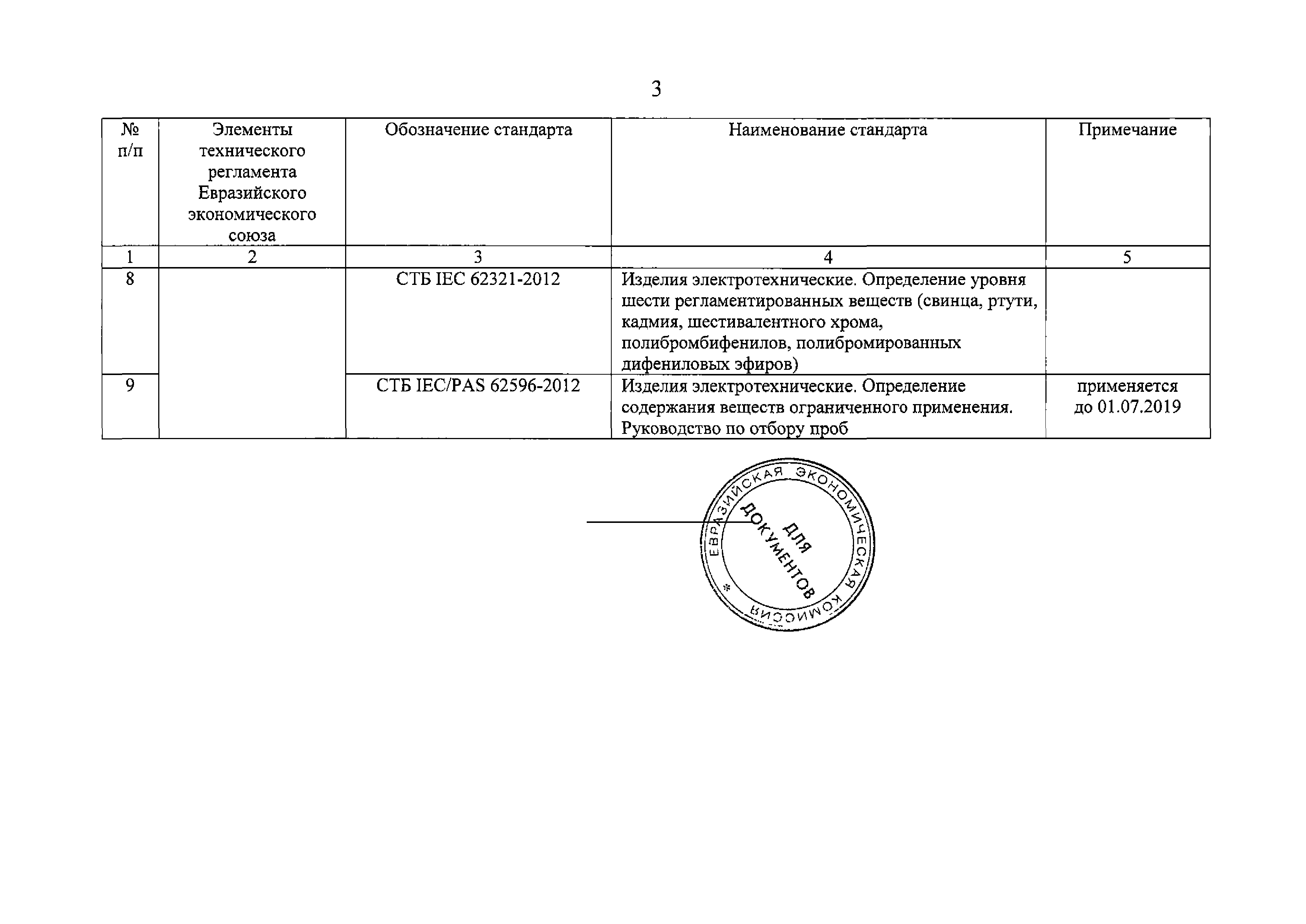Перечень стандартов, содержащих правила и методы исследований (испытаний) и измерений, в том числе правила отбора образцов, необходимые для применения и исполнения требований технического регламента Евразийского экономического союза "Об ограничении применения опасных веществ в изделиях электротехники и радиоэлектроники" (ТР ЕАЭС 037/2016) и осуществления оценки соответствия объектов технического регулирования| Статус: | действует | | Название рус.: | Перечень стандартов, содержащих правила и методы исследований (испытаний) и измерений, в том числе правила отбора образцов, необходимые для применения и исполнения требований технического регламента Евразийского экономического союза "Об ограничении применения опасных веществ в изделиях электротехники и радиоэлектроники" (ТР ЕАЭС 037/2016) и осуществления оценки соответствия объектов технического регулирования | | Дата добавления в базу: | 01.01.2018 | | Дата актуализации: | 01.01.2021 | | Дата введения: | 30.09.2017 | | Утверждён: | 29.08.2017 Коллегия Евразийской экономической комиссии (108)