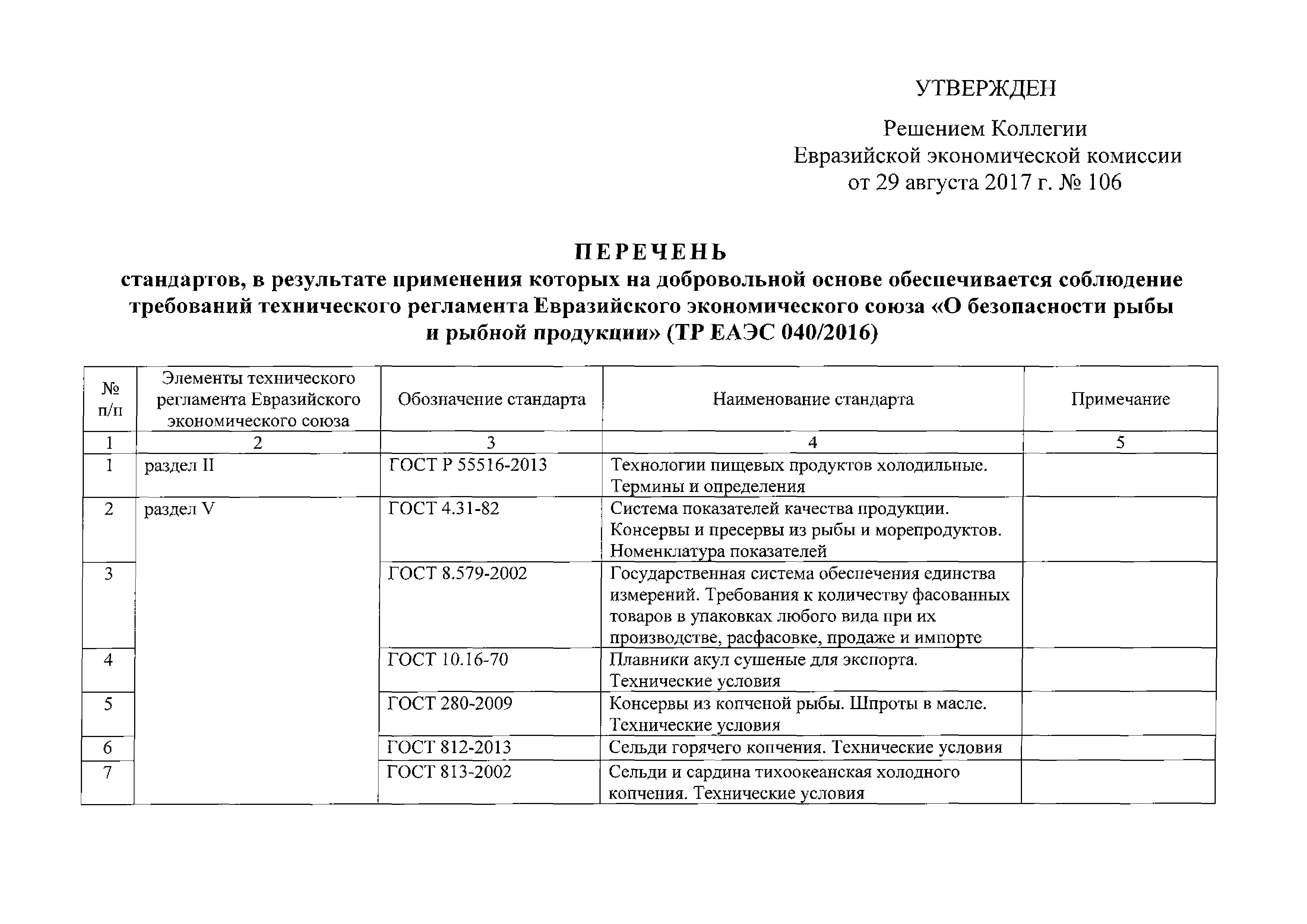 Перечень стандартов, в результате применения которых на добровольной основе обеспечивается соблюдение требований технического регламента Евразийского экономического союза "О безопасности рыбы и рыбной продукции" (ТР ЕАЭС 040/2016)