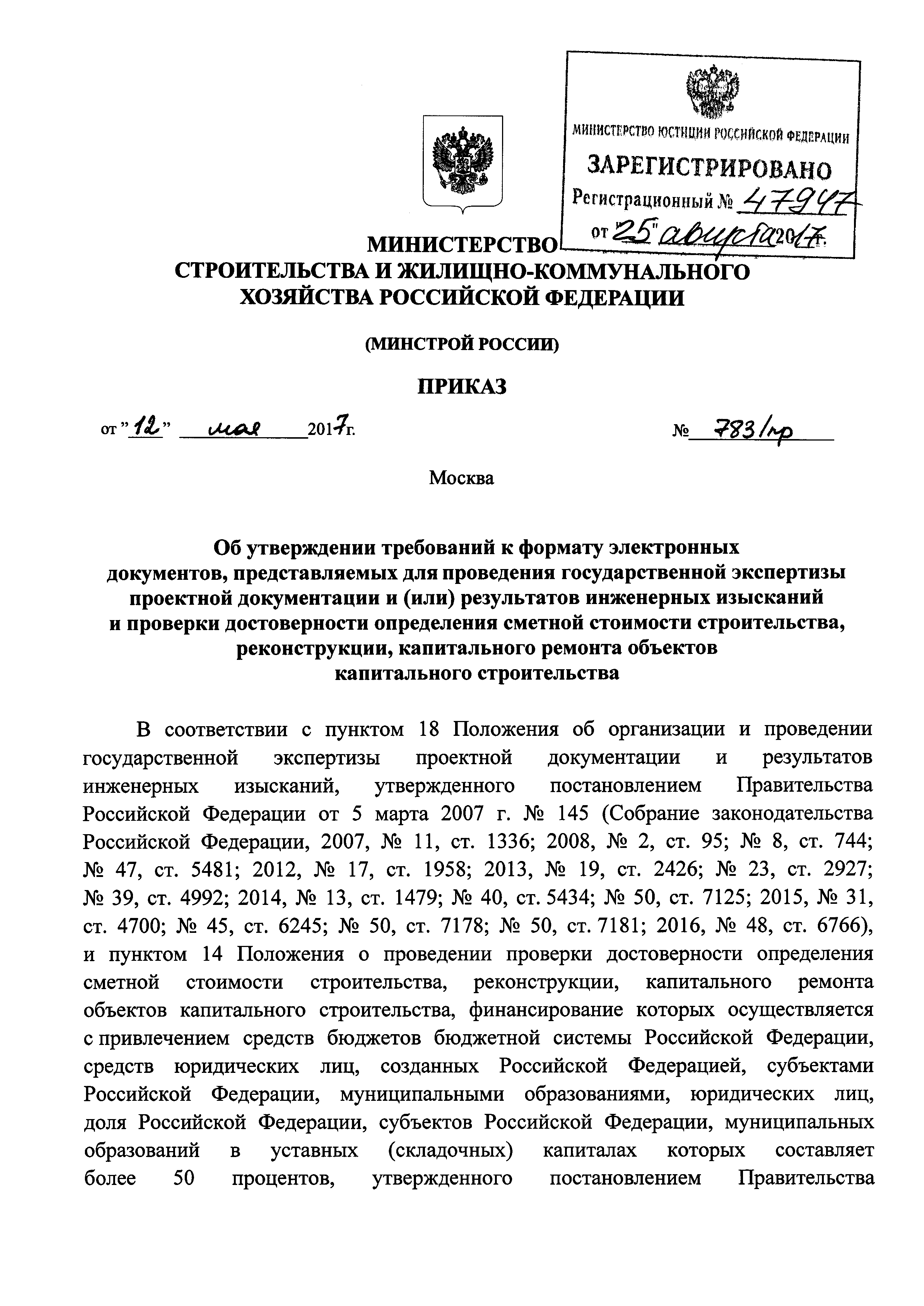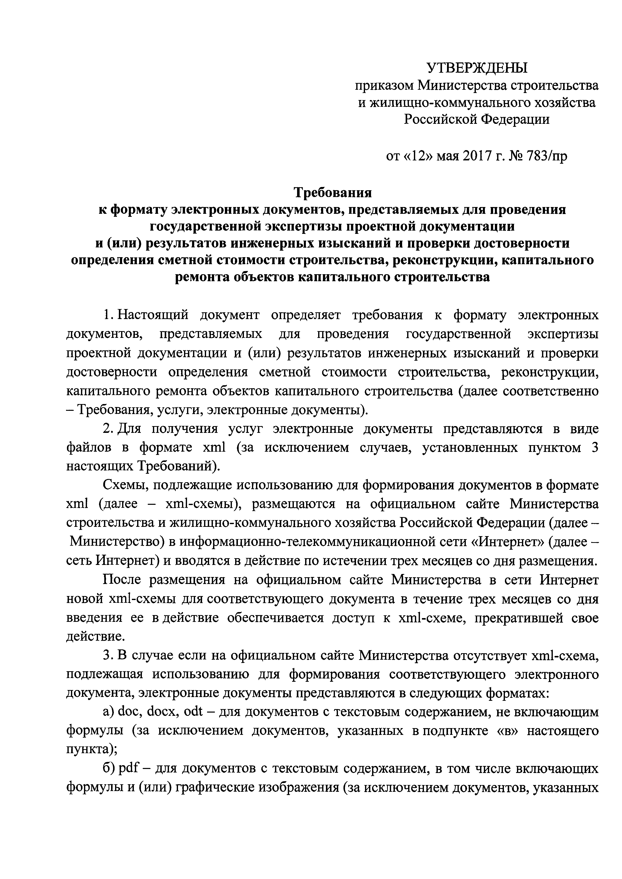 Требования к формату электронных документов, представляемых для проведения государственной экспертизы проектной документации и (или) результатов инженерных изысканий и проверки достоверности определения сметной стоимости строительства, реконструкции, капитального ремонта объектов капитального строительства| Статус: | действует | | Название рус.: | Требования к формату электронных документов, представляемых для проведения государственной экспертизы проектной документации и (или) результатов инженерных изысканий и проверки достоверности определения сметной стоимости строительства, реконструкции, капитального ремонта объектов капитального строительства | | Дата добавления в базу: | 01.01.2018 | | Дата актуализации: | 01.01.2021 | | Дата введения: | 26.09.2017 | | Утверждён: | 12.05.2017 Минстрой России (Russian Federation Minstroy 783/пр)