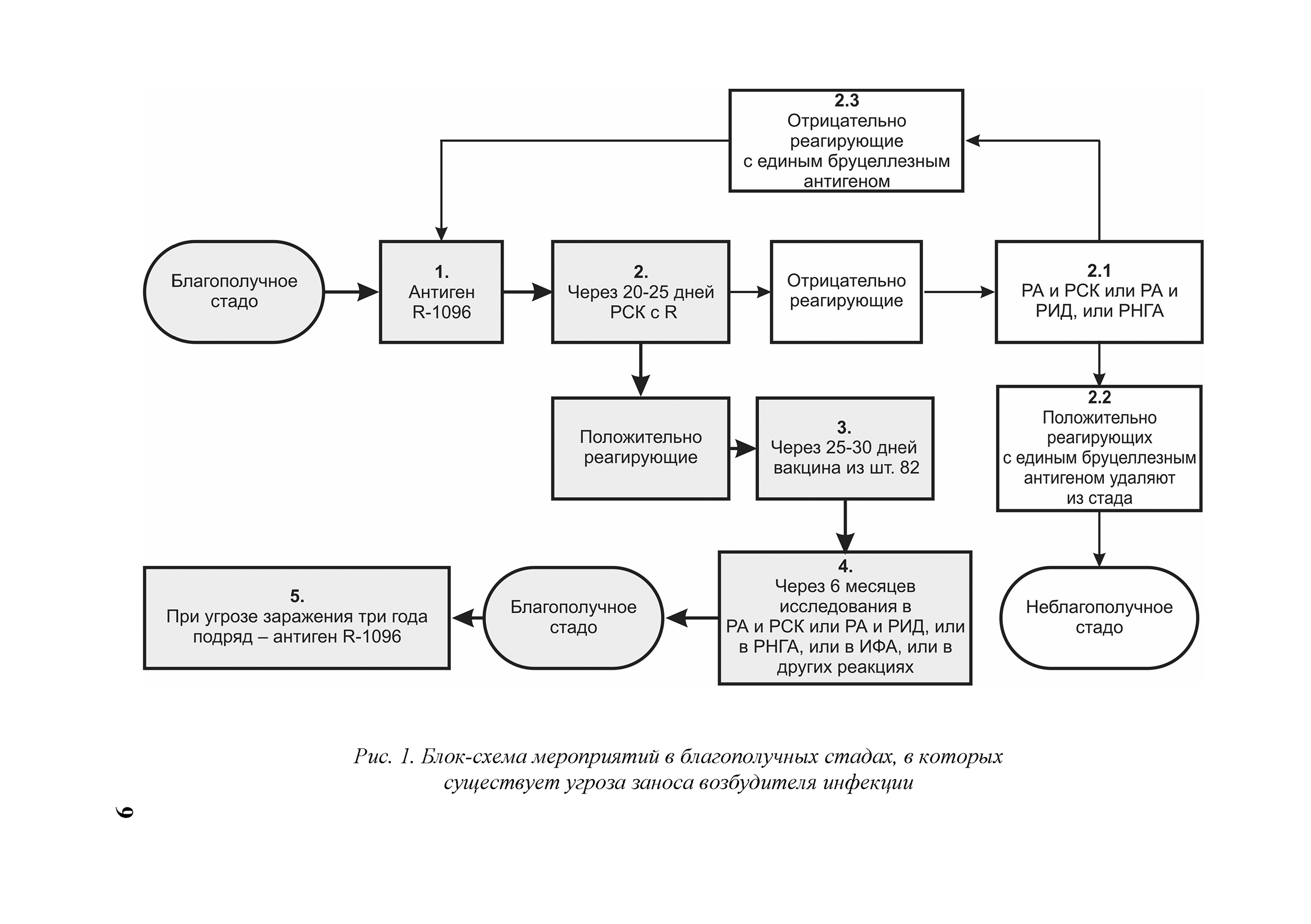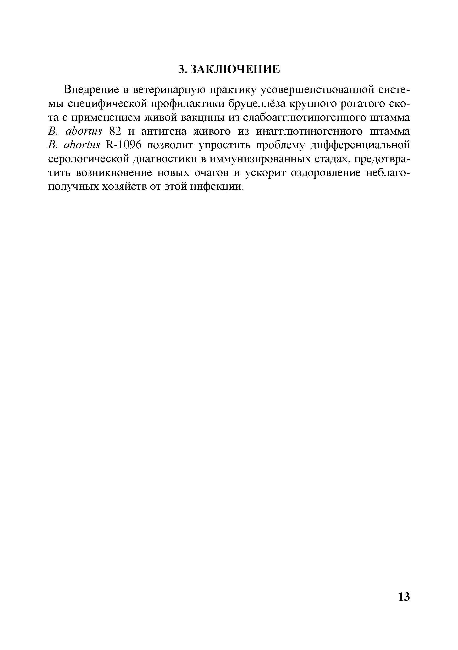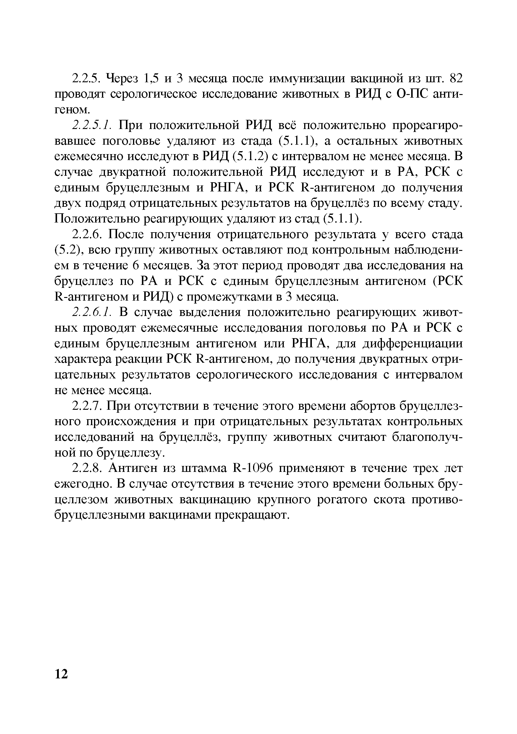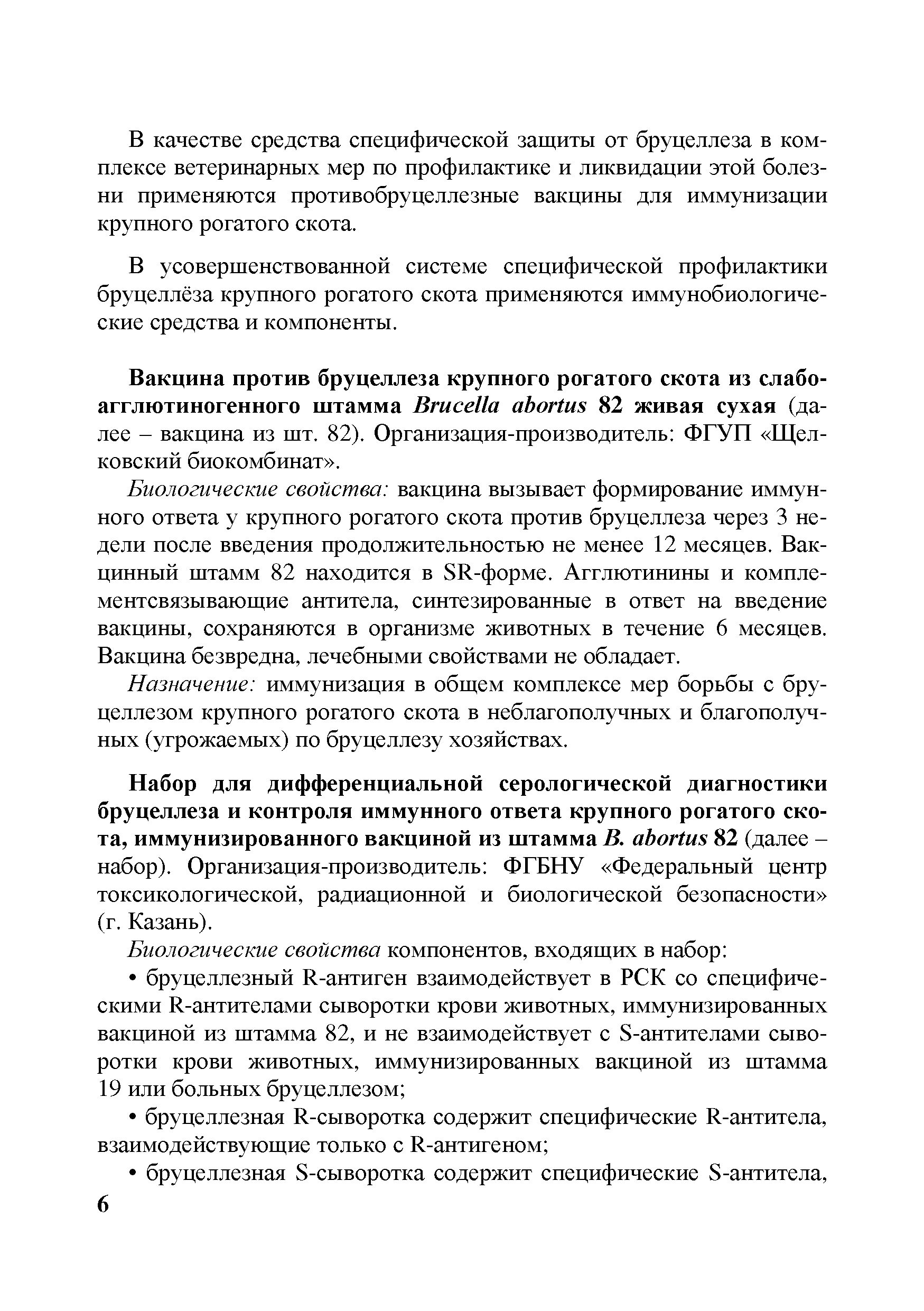 Методические рекомендации по профилактике и оздоровлению неблагополучных по бруцеллезу крупного рогатого скота стад, ферм, хозяйств, населенных пунктов и административных территорий с применением живой вакцины из слабоагглютиногенного штамма B.abortus 82 и антигена живого из инагглютиногенного штамма B.abortus R-1096| Статус: | действует | | Название рус.: | Методические рекомендации по профилактике и оздоровлению неблагополучных по бруцеллезу крупного рогатого скота стад, ферм, хозяйств, населенных пунктов и административных территорий с применением живой вакцины из слабоагглютиногенного штамма B.abortus 82 и антигена живого из инагглютиногенного штамма B.abortus R-1096 | | Дата добавления в базу: | 01.01.2018 | | Дата актуализации: | 01.01.2021 | | Область применения: | В документе представлена усовершенствованная система специальных противоэпизоотических мероприятий по профилактике бруцеллеза и оздоровлению от него стад, ферм, хозяйств, населенных пунктов и административных территорий с применением специальных средств и методов диагностики и профилактики болезни. Предназначены для специалистов государственной ветеринарной службы субъектов Российской Федерации, ветеринарных лабораторий, научных сотрудников, специализирующихся в области инфекционной патологии, студентов и слушателей курсов повышения квалификации. | | Оглавление: | Введение 1 Общие положения 2 Мероприятия по профилактике в благополучных, но угрожаемых по заносу возбудителя инфекции стадах и оздоровлению стад, ферм, хозяйств, населенных пунктов и административных территорий, неблагополучных по бруцеллезу крупного рогатого скота 2.1. Мероприятия в благополучных стадах, в которых существует угроза заноса возбудителя инфекции и поголовье отрицательно реагирует по серологическим реакциям на бруцеллёз, не регистрируются аборты бруцеллезной этиологии и которые не применяют противобруцеллезные препараты 2.2. Мероприятия в неблагополучных оздоравлеваемых стадах 3 Заключение | | Разработан: | ФГБУ ВГНКИ ФГБНУ ФЦТРБ-ВНИВИ