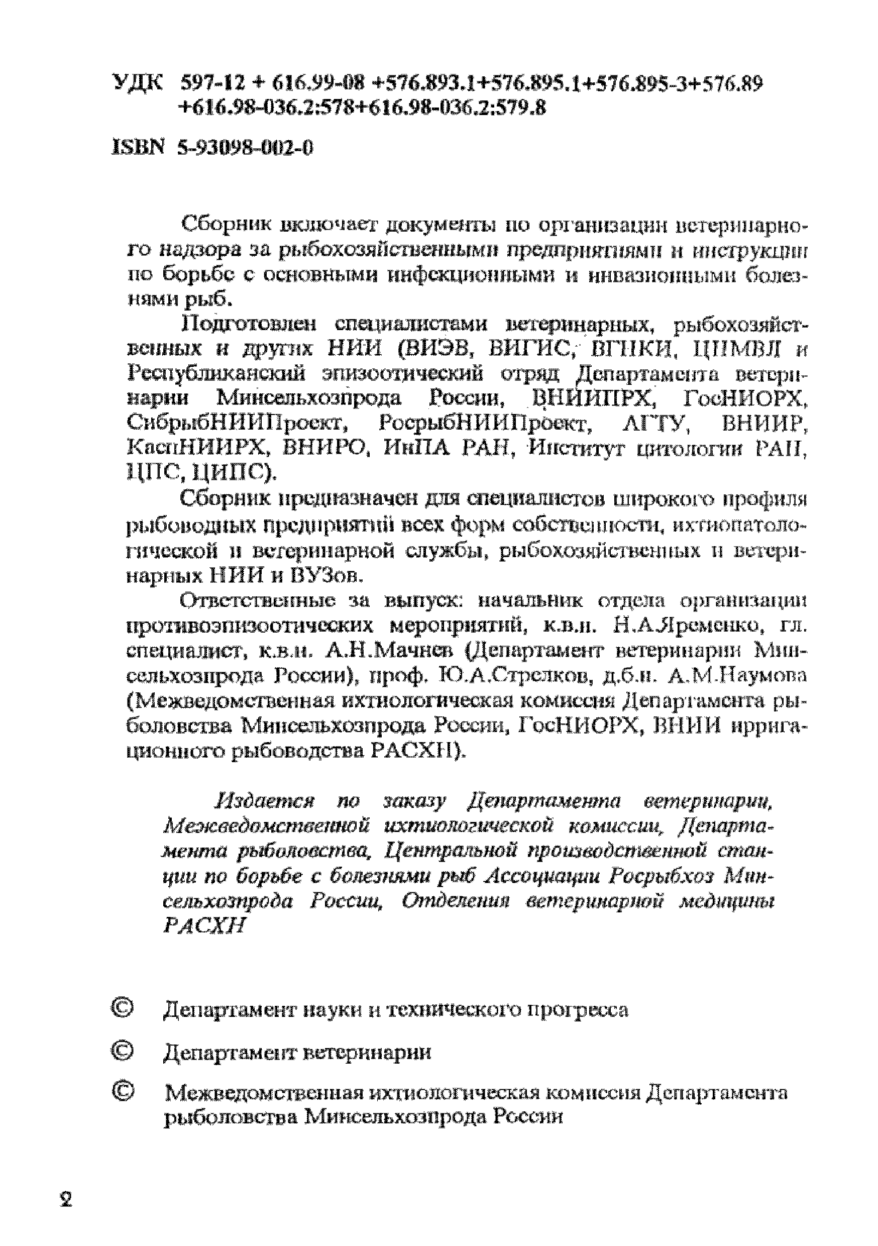 | Разработан: | ВИГИС ВИЭВ ВНИРО ВНИИПРХ ГОСНИОРХ ВНИИР ВГНКИ ЦНМВЛ Республиканский эпизоотический отряд департамента ветеринарии Минсельхозпрода России СибрыбНИИПроект РосрыбНИИПроект АГТУ КаспНИИРХ ИнПА РАН Институт цитологии РАН ЦПС ЦИПС