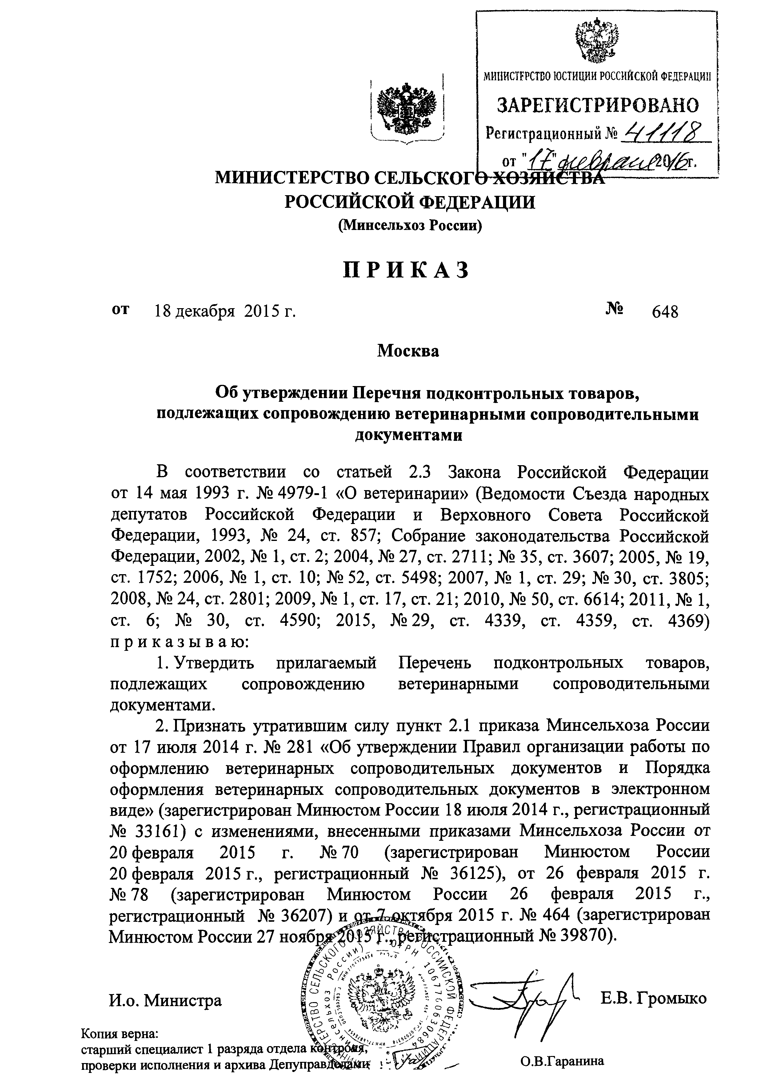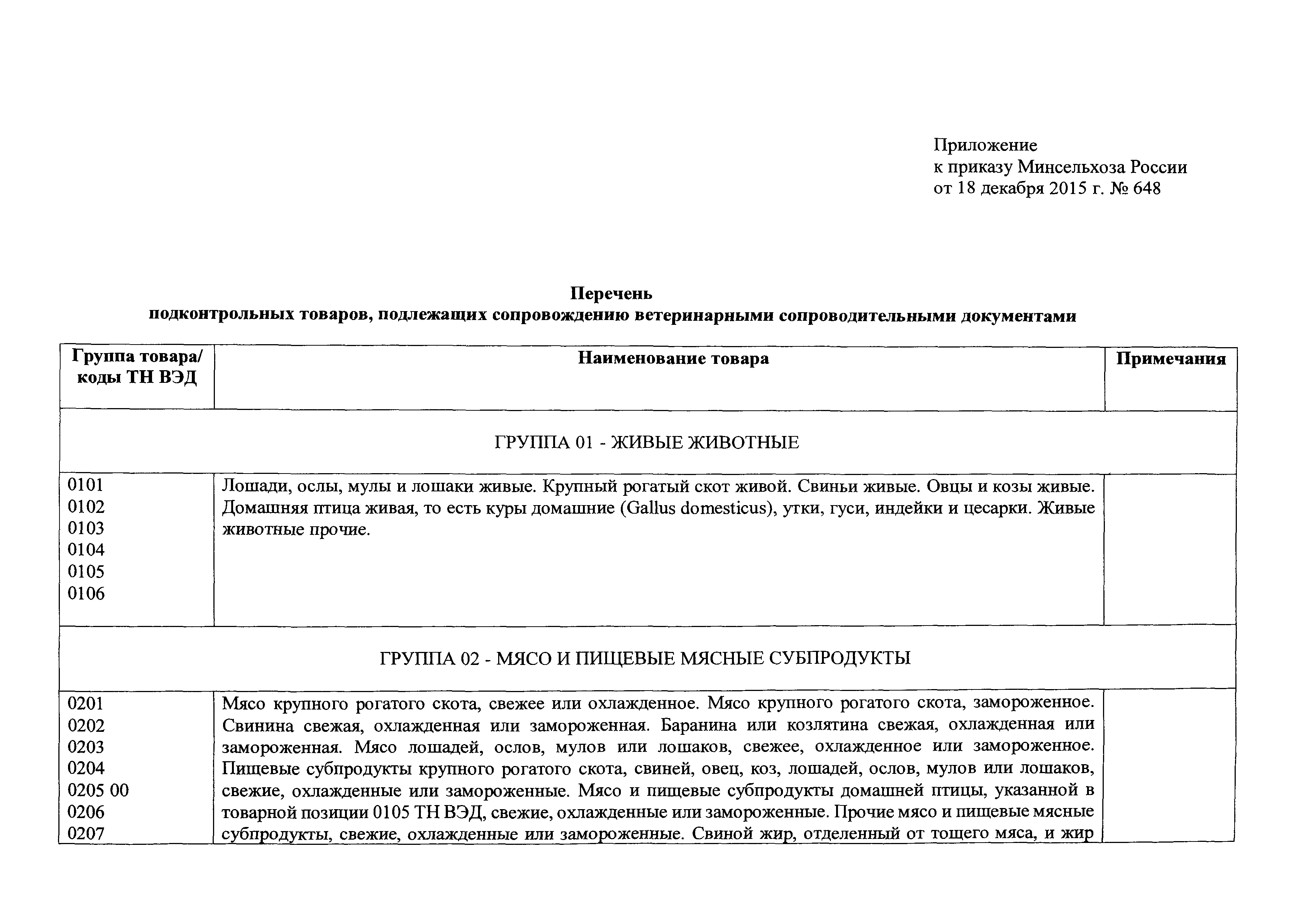 Перечень подконтрольных товаров, подлежащих сопровождению ветеринарными сопроводительными документами| Статус: | действует | | Название рус.: | Перечень подконтрольных товаров, подлежащих сопровождению ветеринарными сопроводительными документами | | Дата добавления в базу: | 01.01.2018 | | Дата актуализации: | 01.01.2021 | | Дата введения: | 02.03.2016 | | Утверждён: | 18.12.2015 Министерство сельского хозяйства Российской Федерации (648)