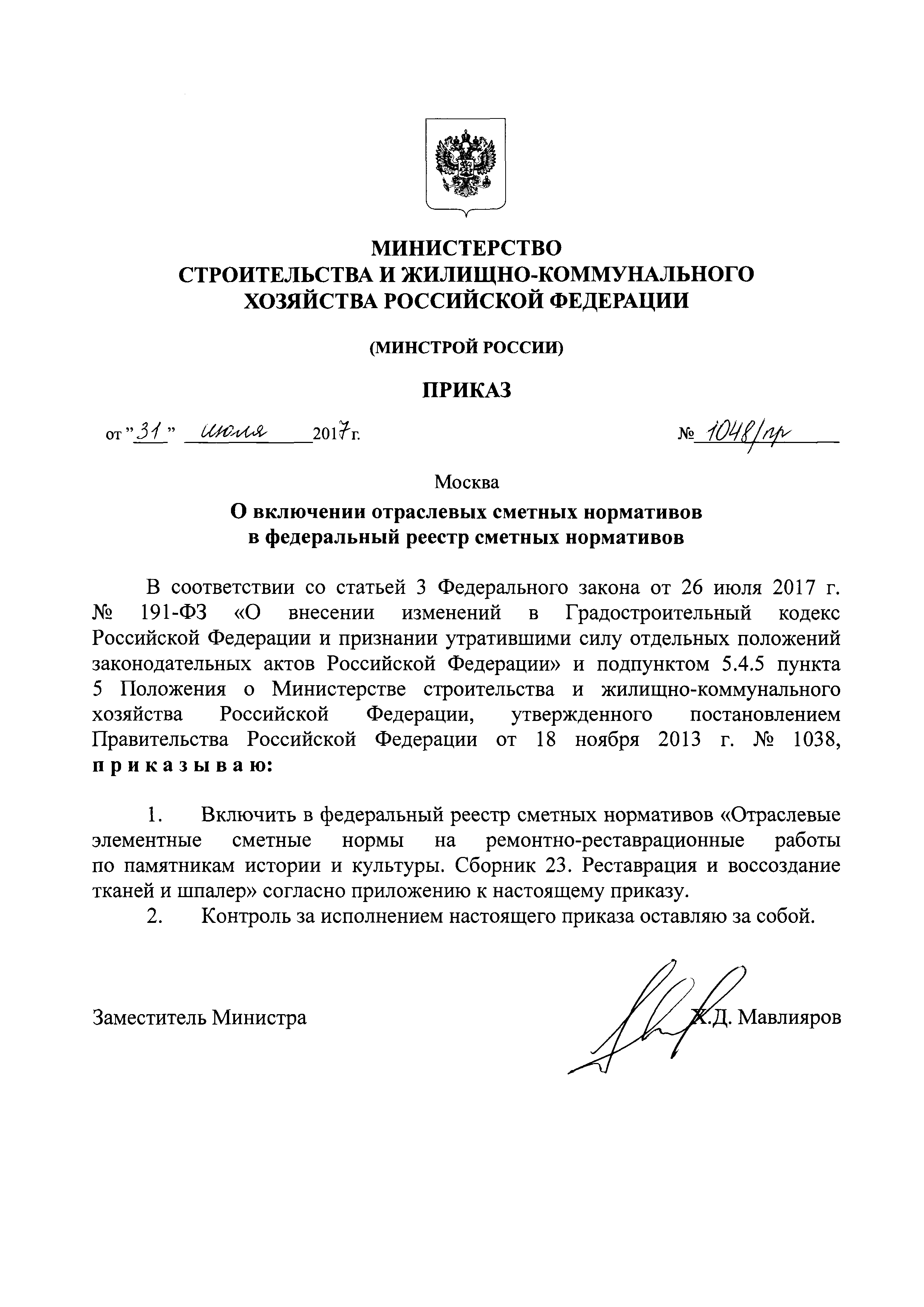 | Утверждён: | 31.07.2017 Министерство строительства и жилищно-коммунального хозяйства Российской Федерации (1048/пр)