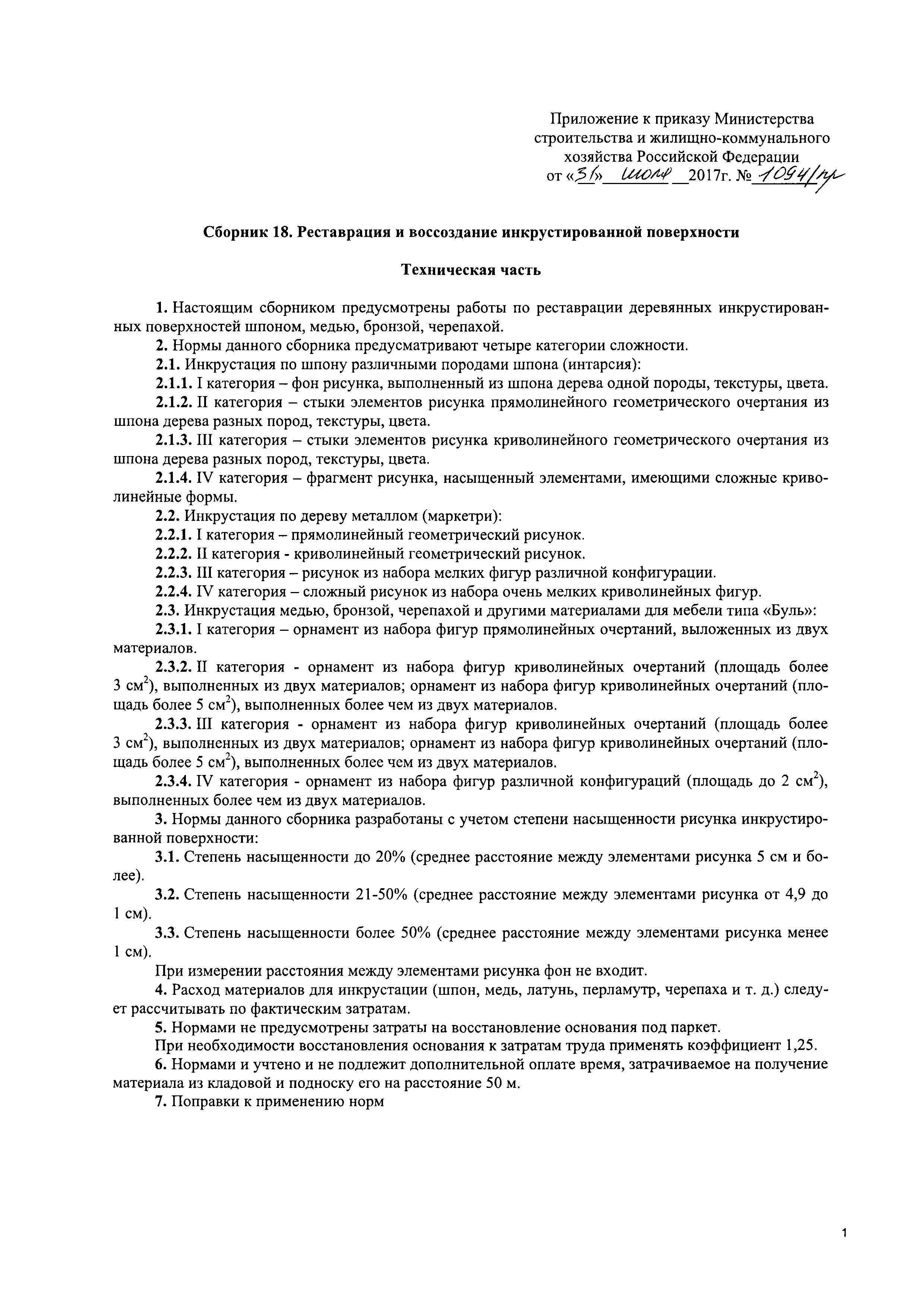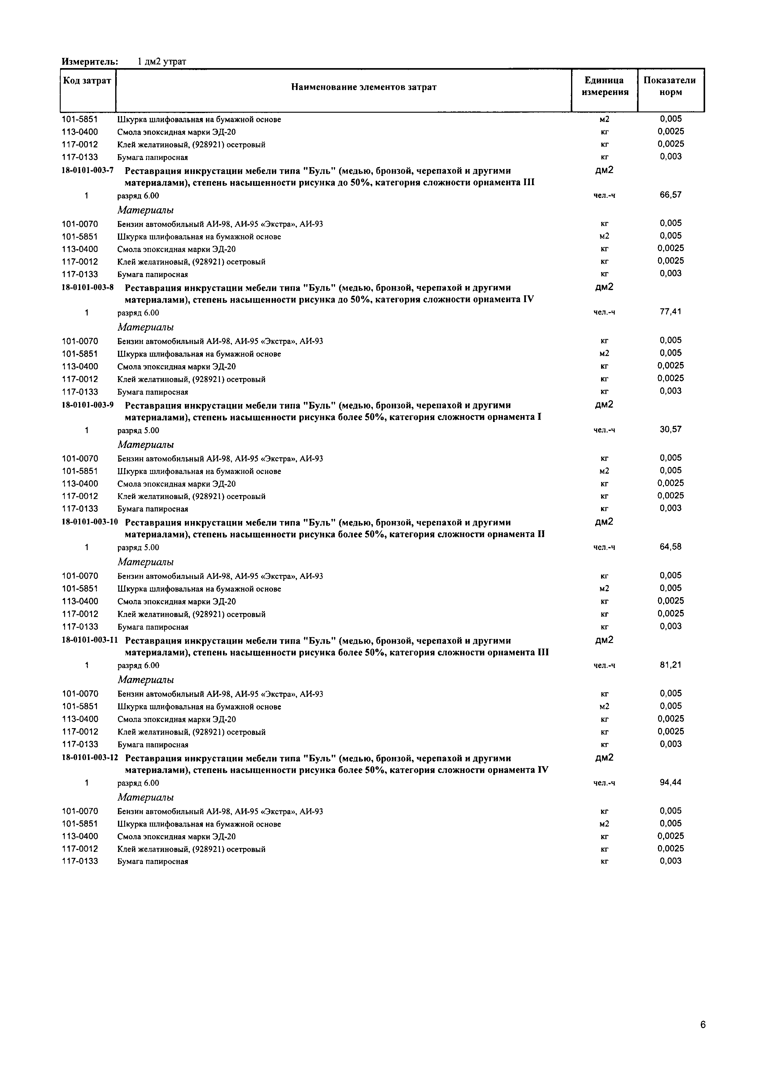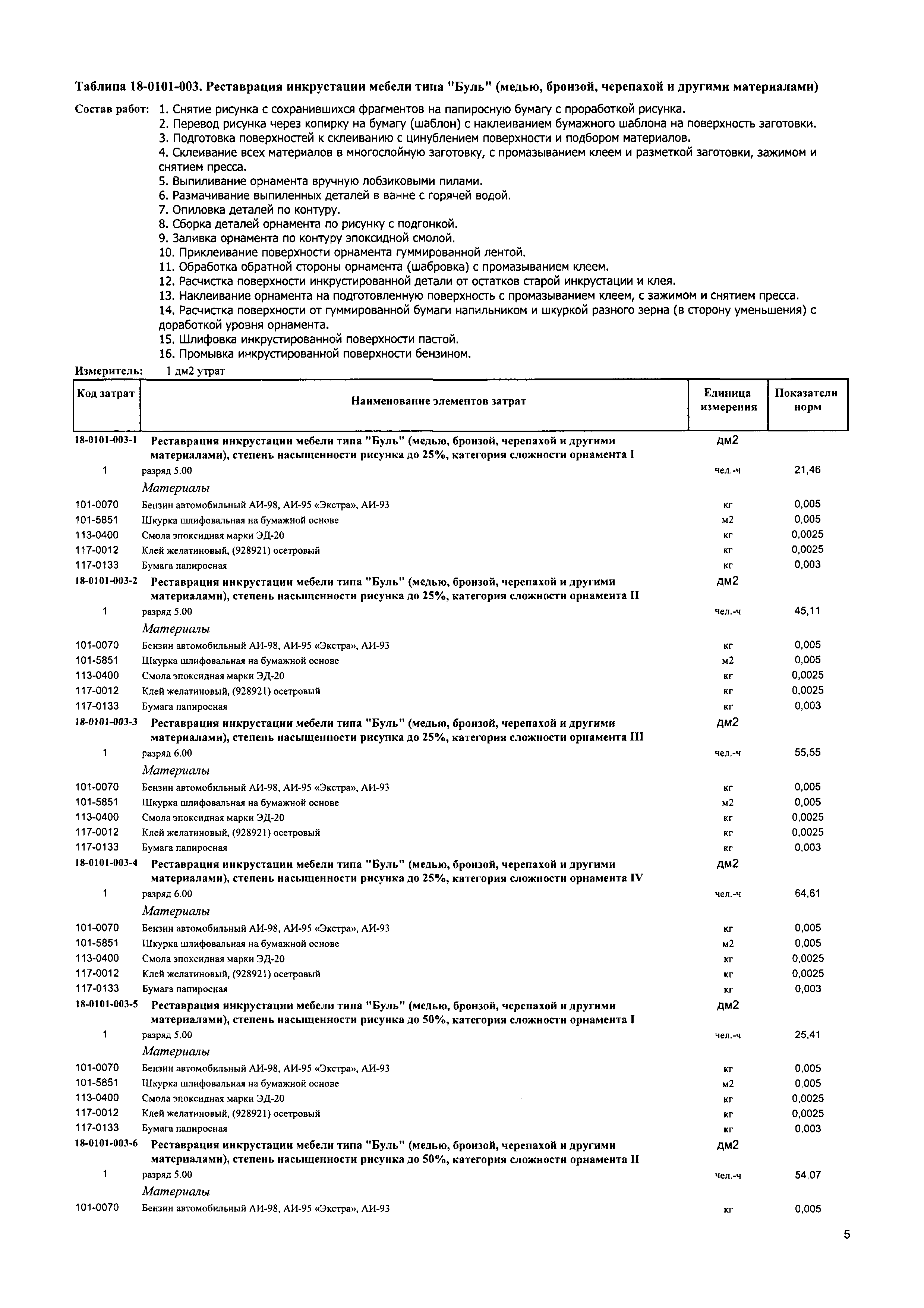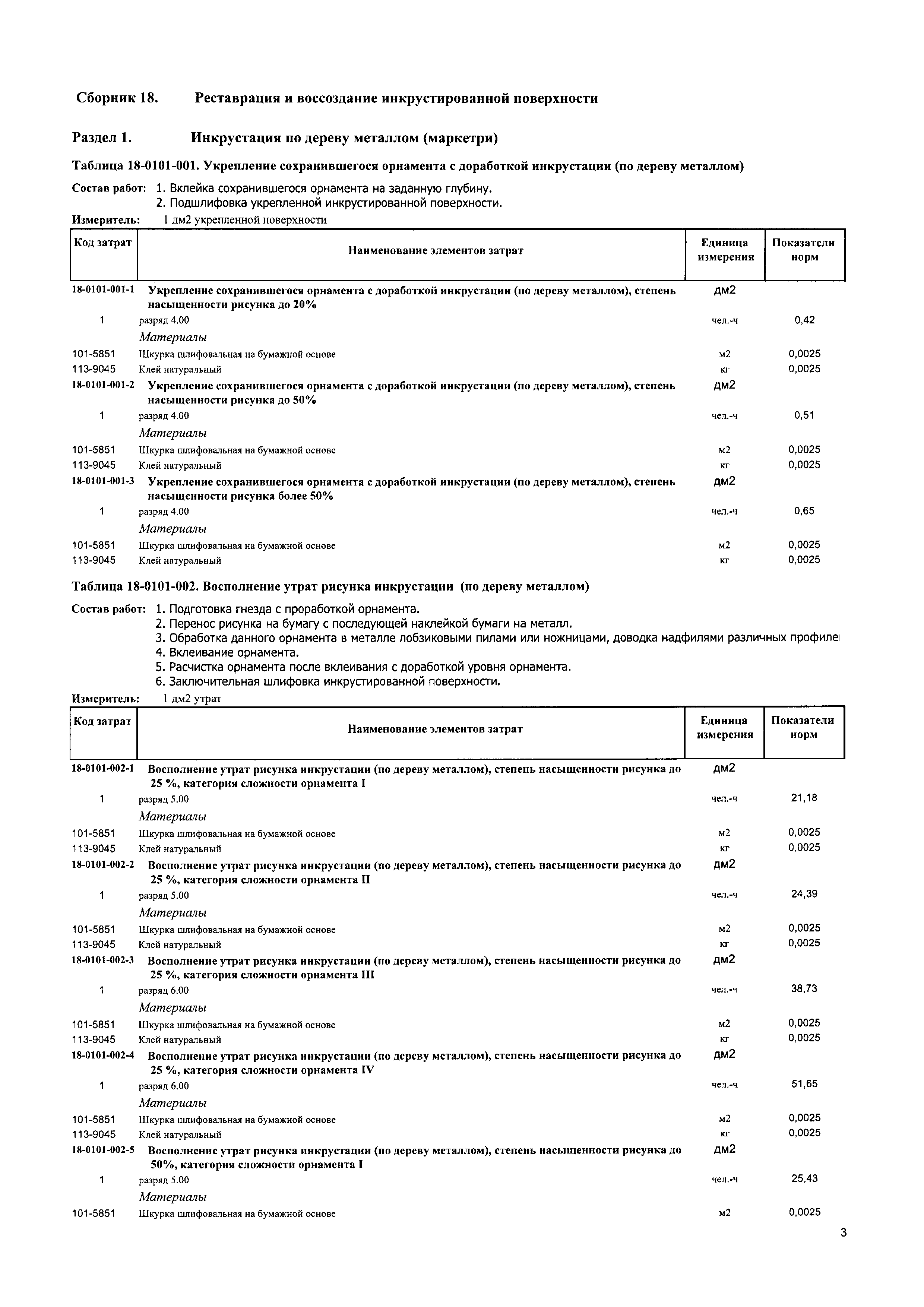 Сборник 18. Реставрация и воссоздание инкрустированной поверхности. Отраслевые элементные сметные нормы на ремонтно-реставрационные работы по памятникам истории и культуры| Статус: | действует | | Название рус.: | Сборник 18. Реставрация и воссоздание инкрустированной поверхности. Отраслевые элементные сметные нормы на ремонтно-реставрационные работы по памятникам истории и культуры | | Дата добавления в базу: | 01.01.2018 | | Дата актуализации: | 01.01.2021 | | Дата введения: | 31.07.2017 | | Область применения: | Сборником предусмотрены работы по реставрации деревянных инкрустированных поверхностей шпоном, медью, бронзой, черепахой | | Утверждён: | 31.07.2017 Министерство строительства и жилищно-коммунального хозяйства Российской Федерации (1094/пр)