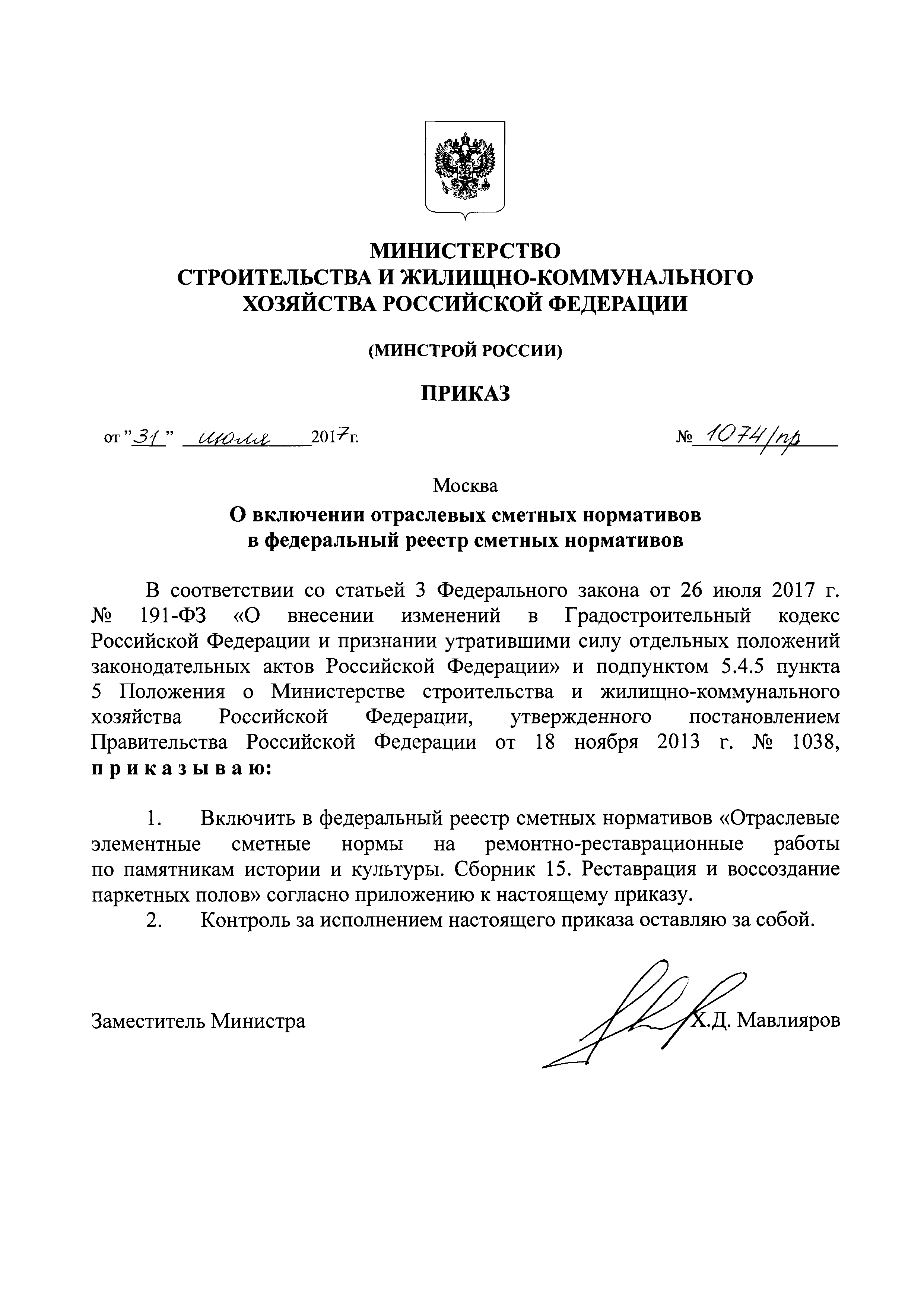 | Утверждён: | 31.07.2017 Министерство строительства и жилищно-коммунального хозяйства Российской Федерации (1074/пр)