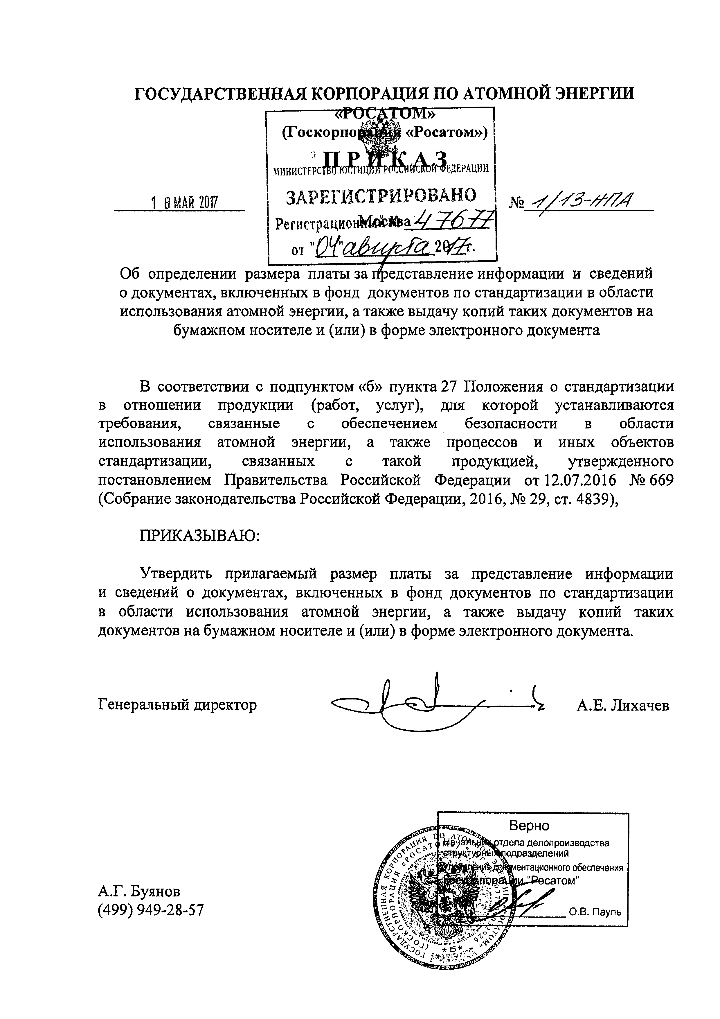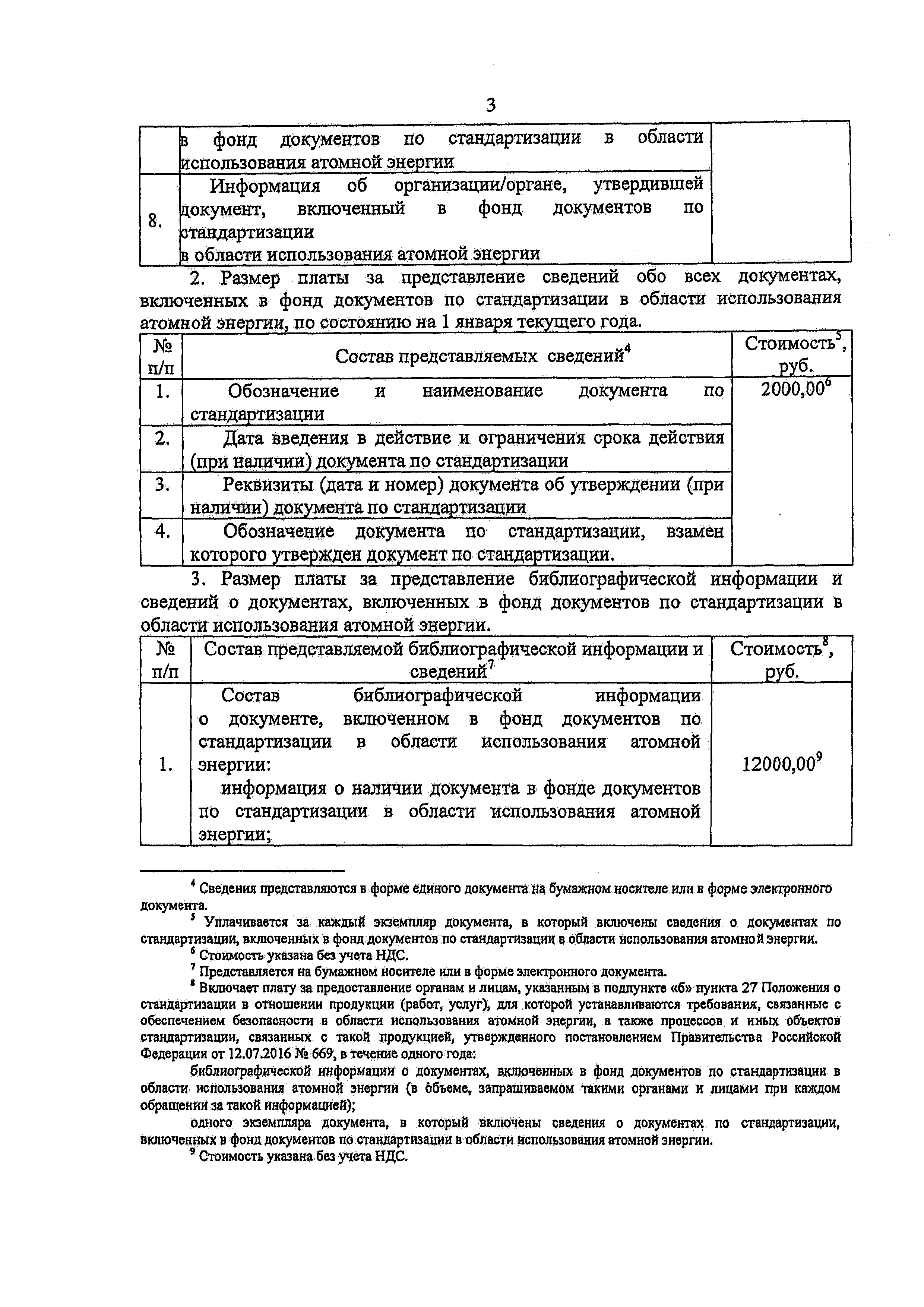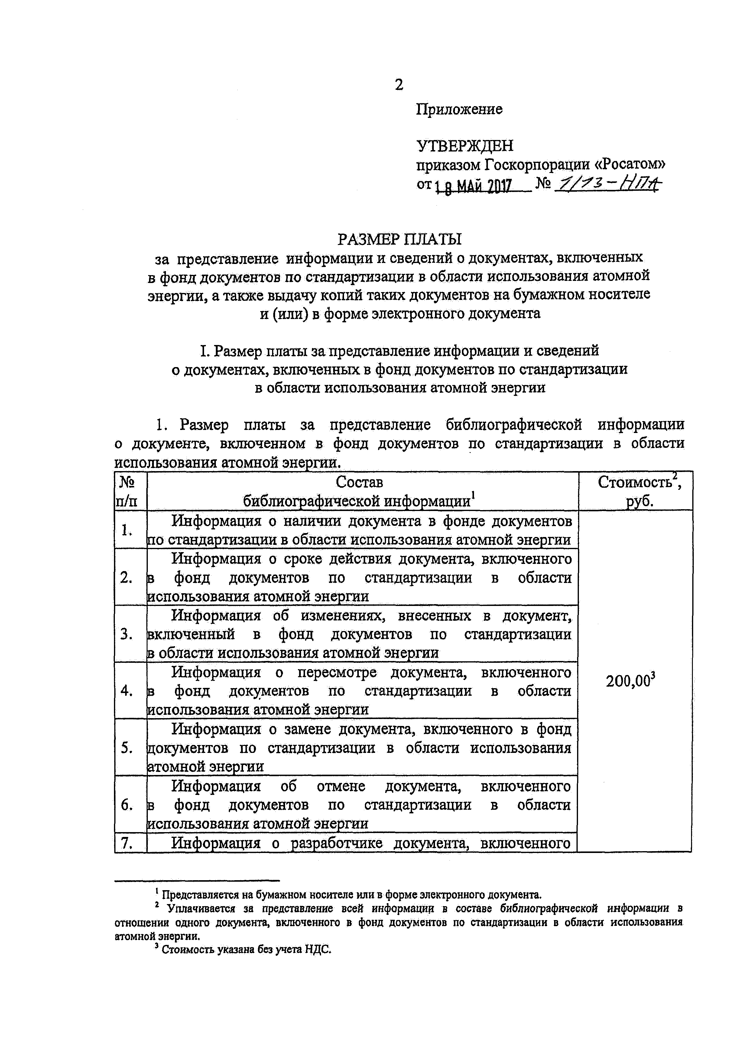 Размер платы за представление информации и сведений о документах, включенных в фонд документов по стандартизации в области использования атомной энергии, а также выдачу копий таких документов на бумажном носителе и (или) в форме электронного документа| Статус: | действует | | Название рус.: | Размер платы за представление информации и сведений о документах, включенных в фонд документов по стандартизации в области использования атомной энергии, а также выдачу копий таких документов на бумажном носителе и (или) в форме электронного документа | | Дата добавления в базу: | 01.01.2018 | | Дата актуализации: | 01.01.2021 | | Дата введения: | 18.08.2017 | | Оглавление: | I. Размер платы за представление информации и сведений о документах, включенных в фонд документов по стандартизации в области использования атомной энергии II. Размер платы за выдачу копий документов, включенных в фонд документов по стандартизации в области использования атомной энергии, на бумажном носителе и (или) в форме электронного документа | | Утверждён: | 18.05.2017 Государственная корпорация по атомной энергии РОСАТОМ (1/13-НПА)