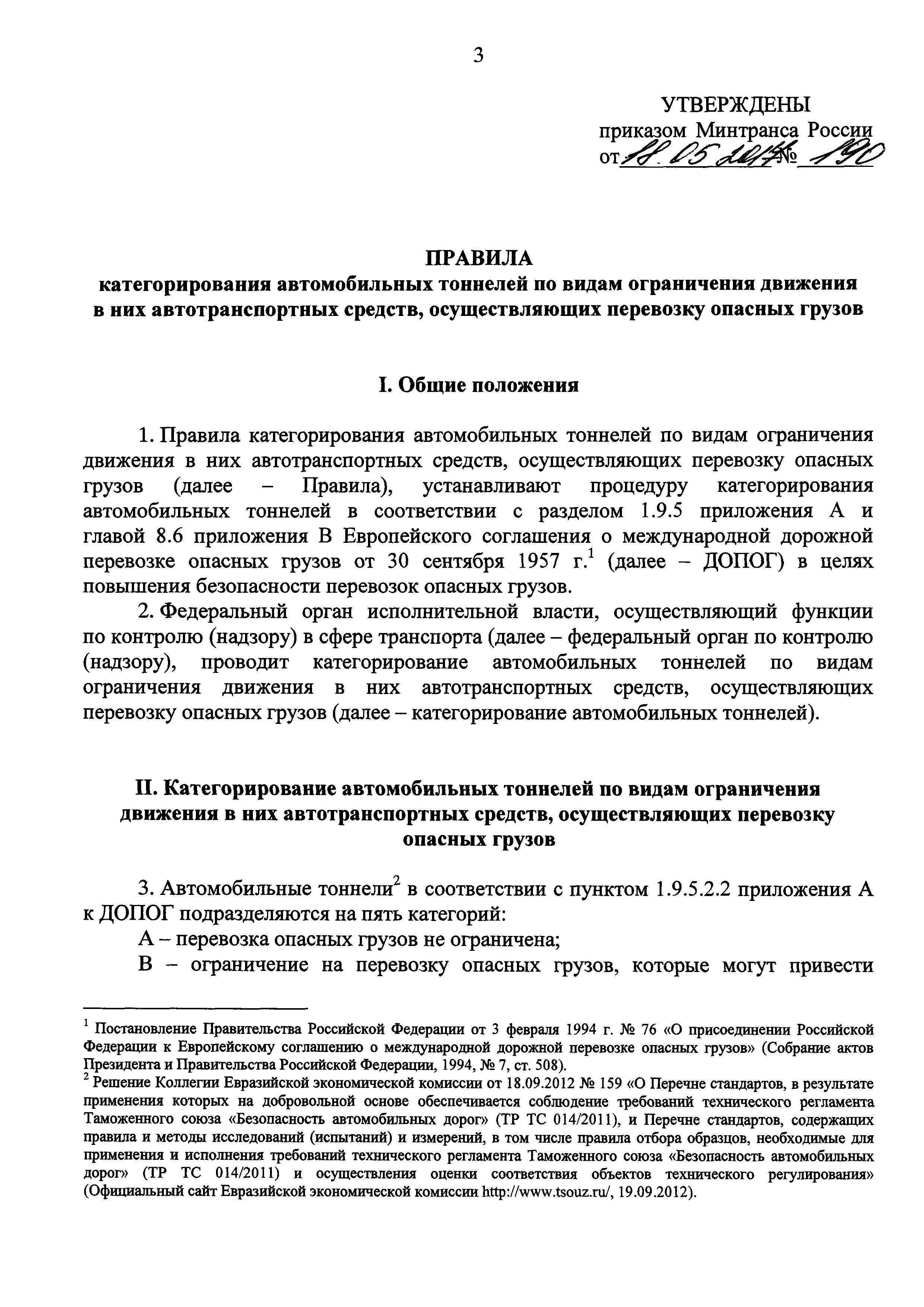 | Область применения: | Правила категорирования автомобильных тоннелей по видам ограничения движения в них автотранспортных средств, осуществляющих перевозку опасных грузов, устанавливают процедуру категорирования автомобильных тоннелей в соответствии с разделом 1.9.5 приложения А и главой 8.6 приложения В Европейского соглашения о международной дорожной перевозке опасных грузов от 30 сентября 1957 г. в целях повышения безопасности перевозок опасных грузов |