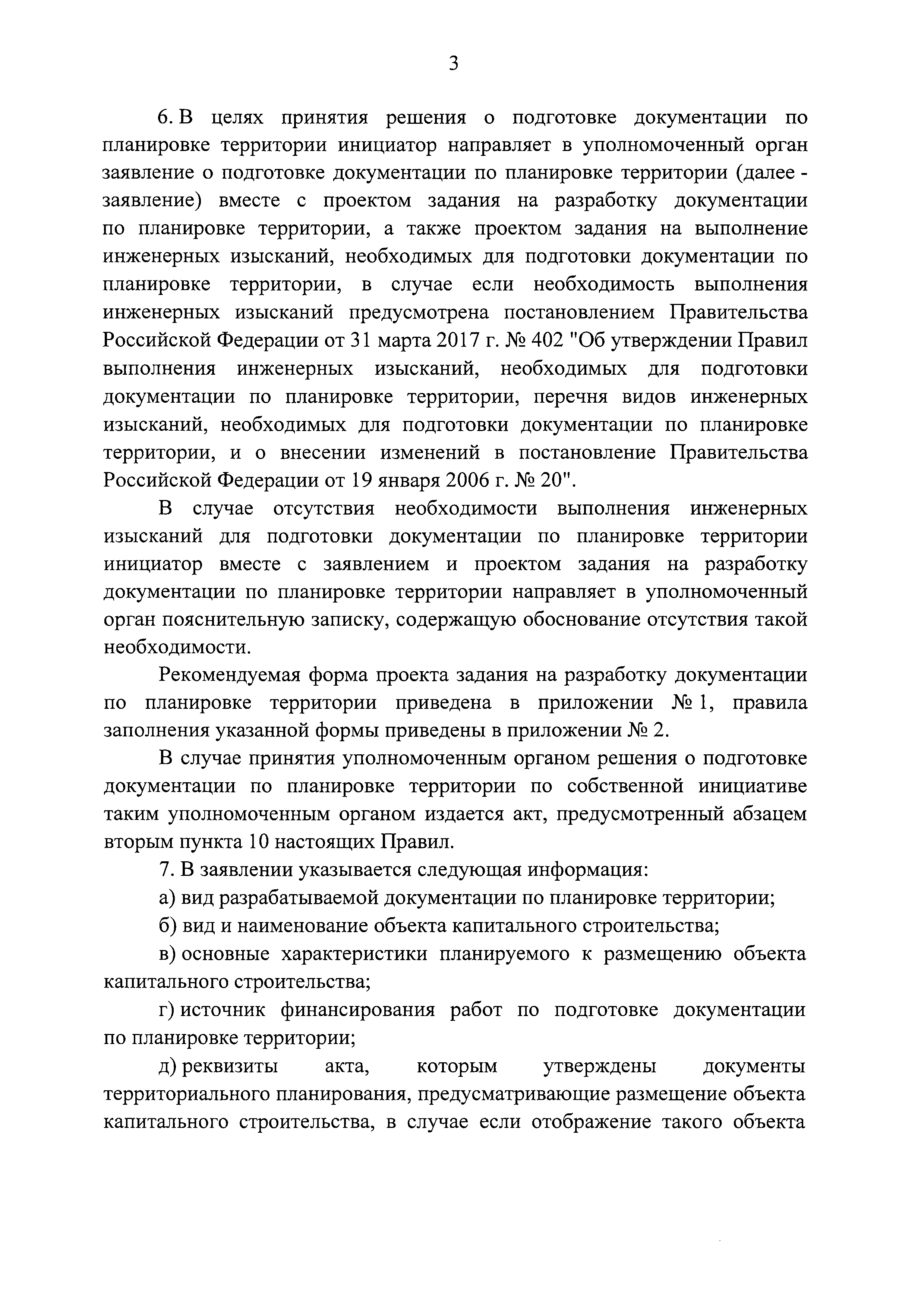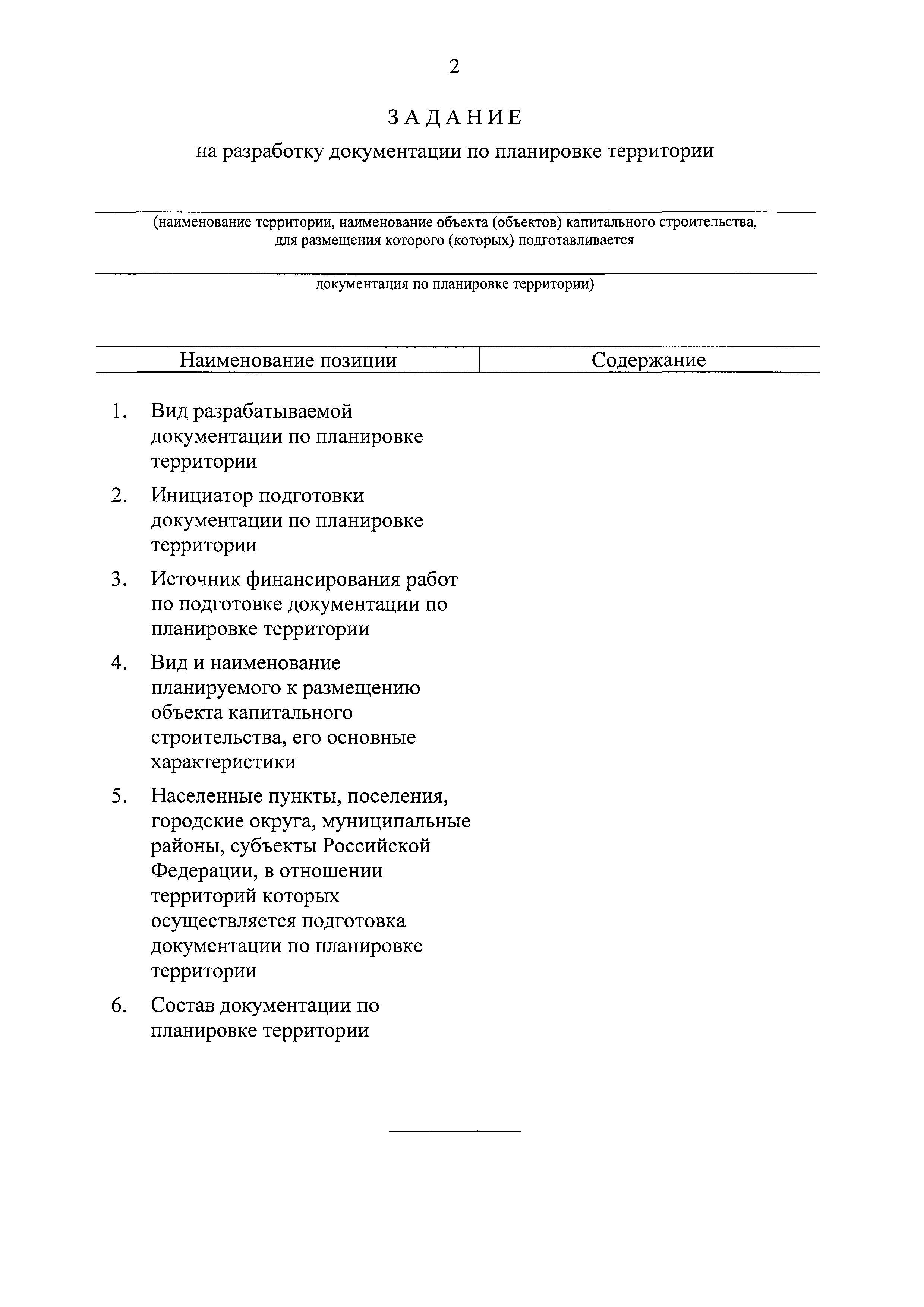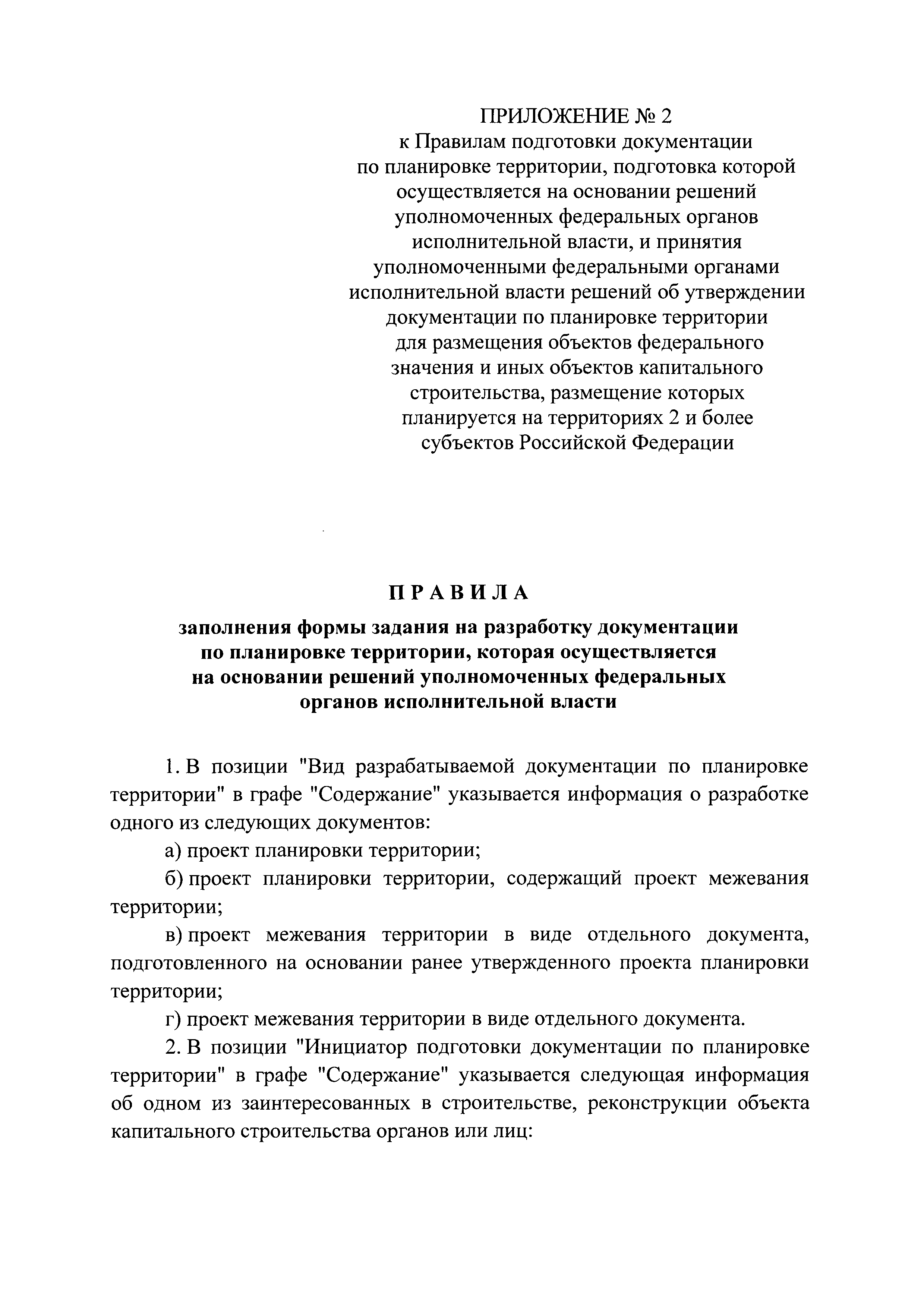 | Оглавление: | Приложение № 1. Задание на разработку документации по планировке территории (форма) Приложение № 2. Правила заполнения формы задания на разработку документации по планировке территории, которая осуществляется на основании решений уполномоченных федеральных органов исполнительной власти |