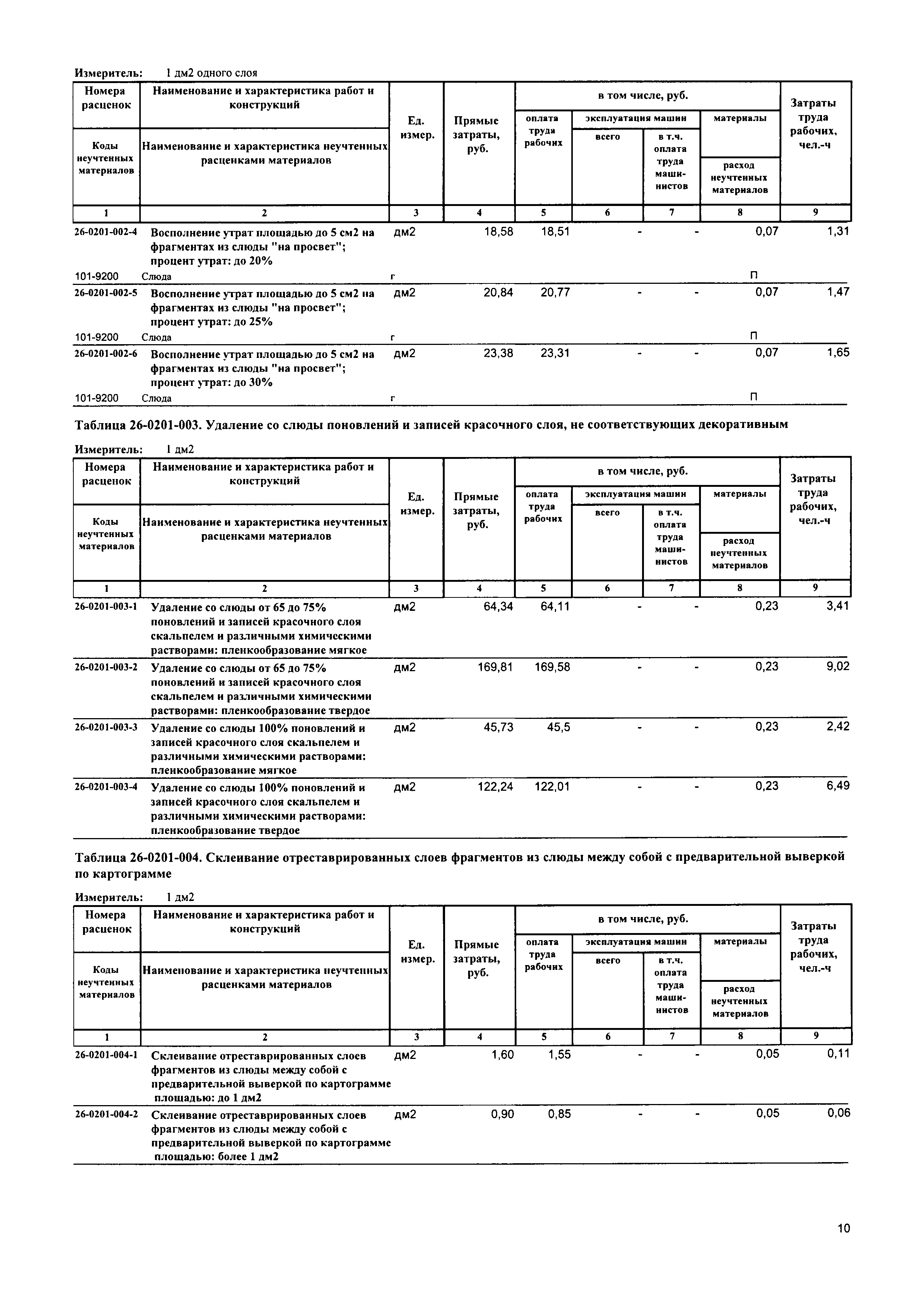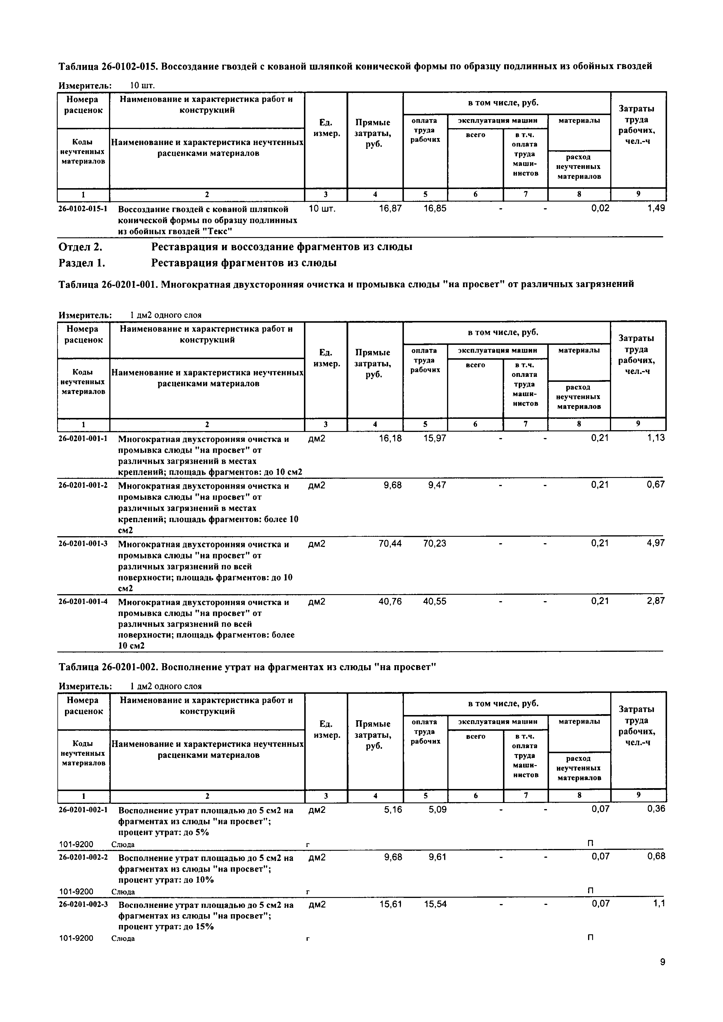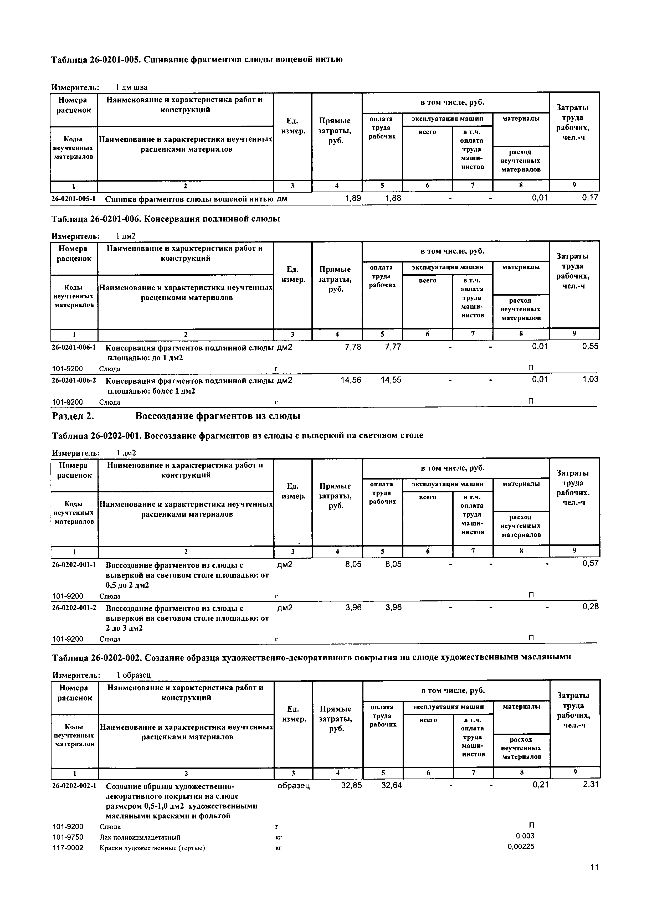 | Область применения: | Расценки сборника предусматривают специфические условия работ по реставрации и воссозданию произведений искусства, не проводимых ранее в условиях реставрационного производства. |