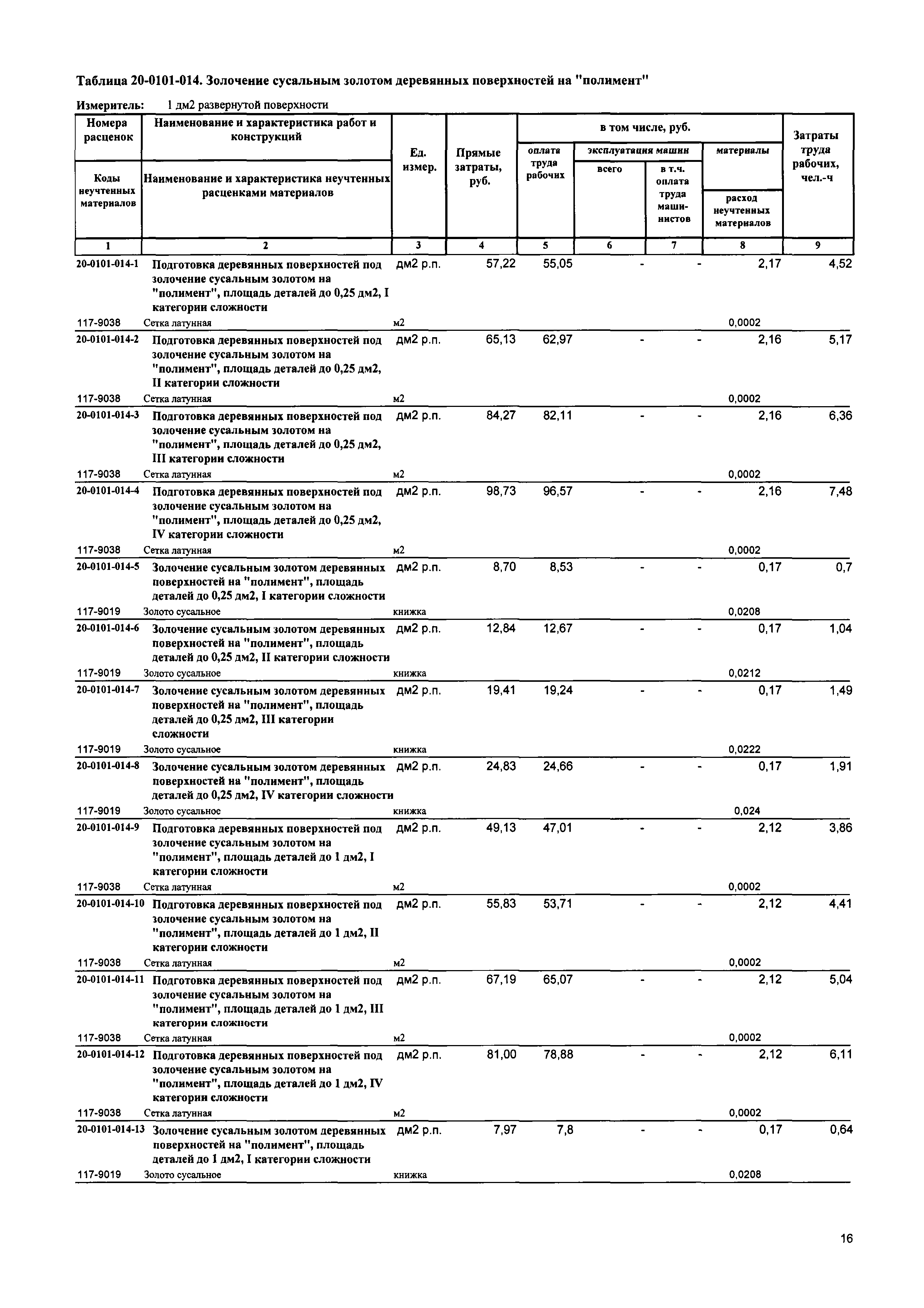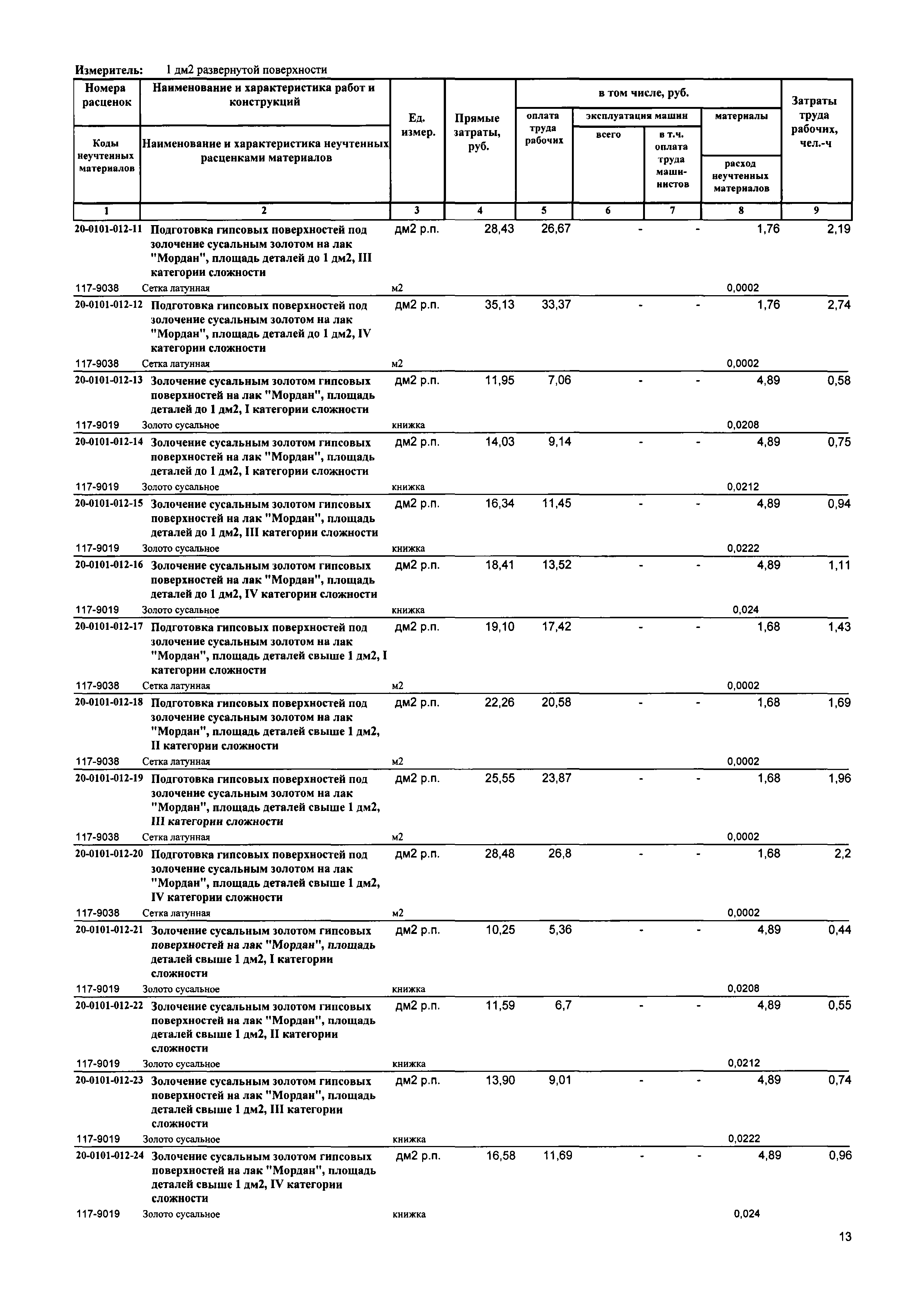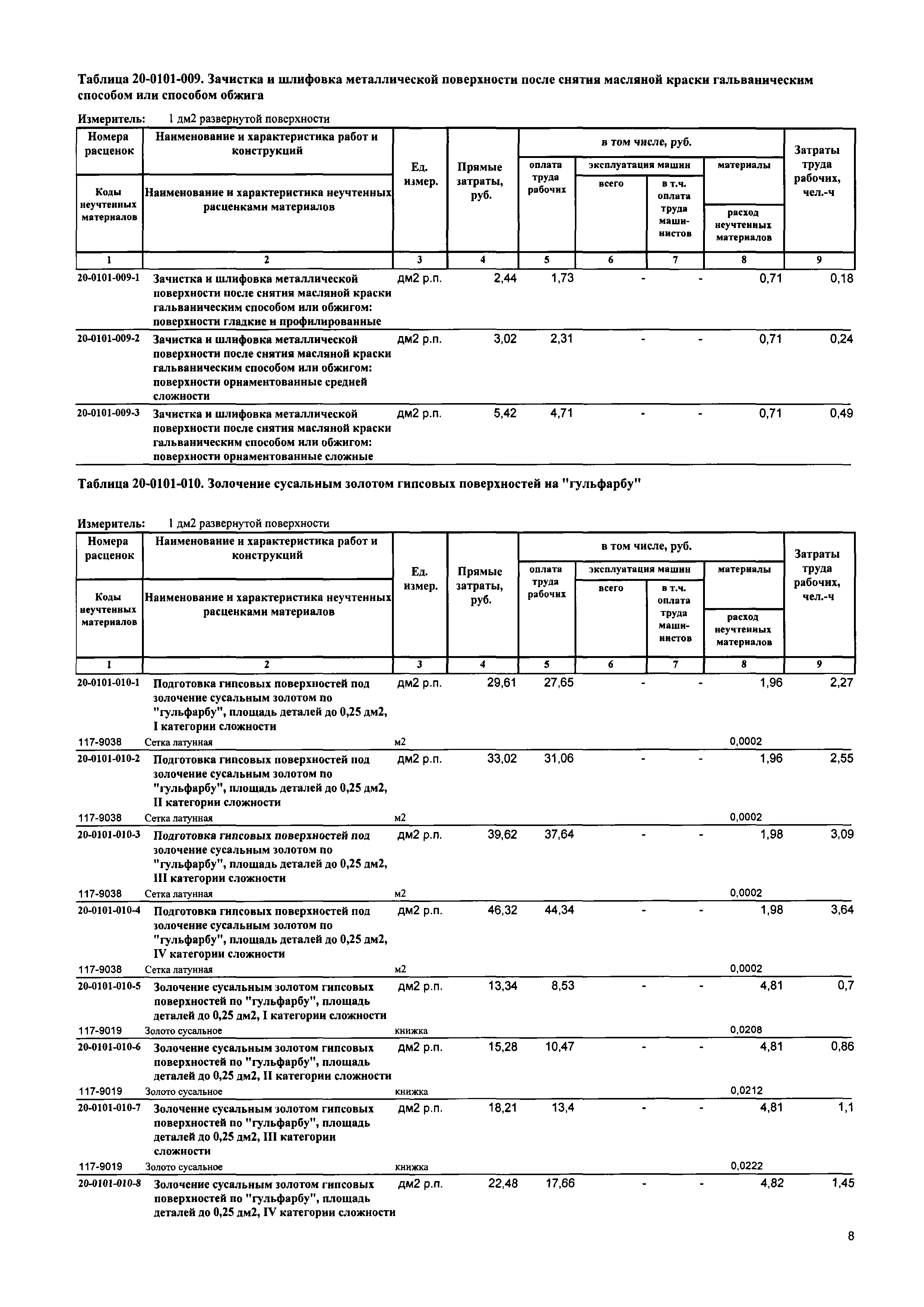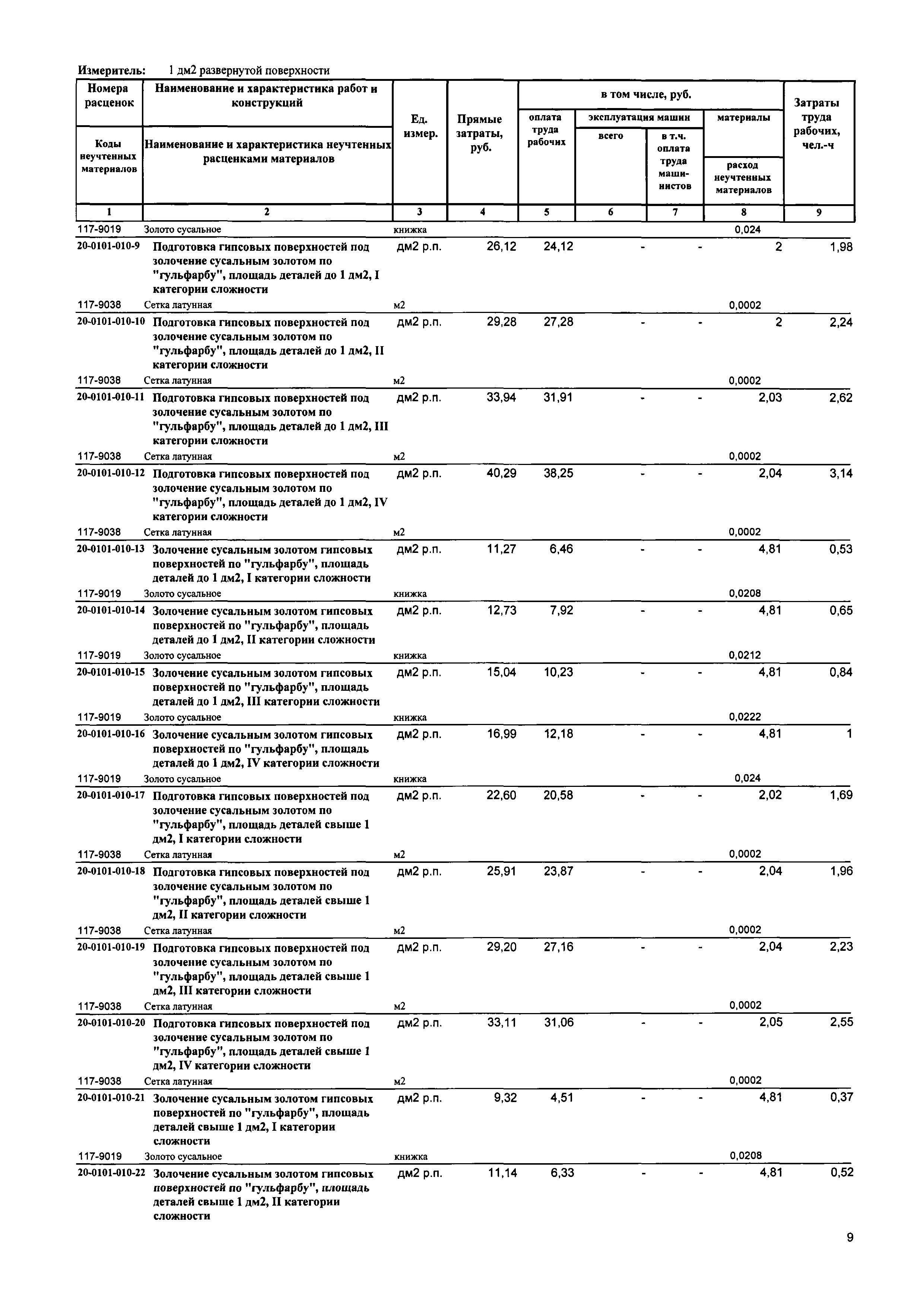 | Область применения: | Расценками сборника предусмотрены работы по реставрации и воссозданию позолоты наружных и внутренних элементов памятников истории и культуры на деревянных металлических и гипсовых поверхностях. |