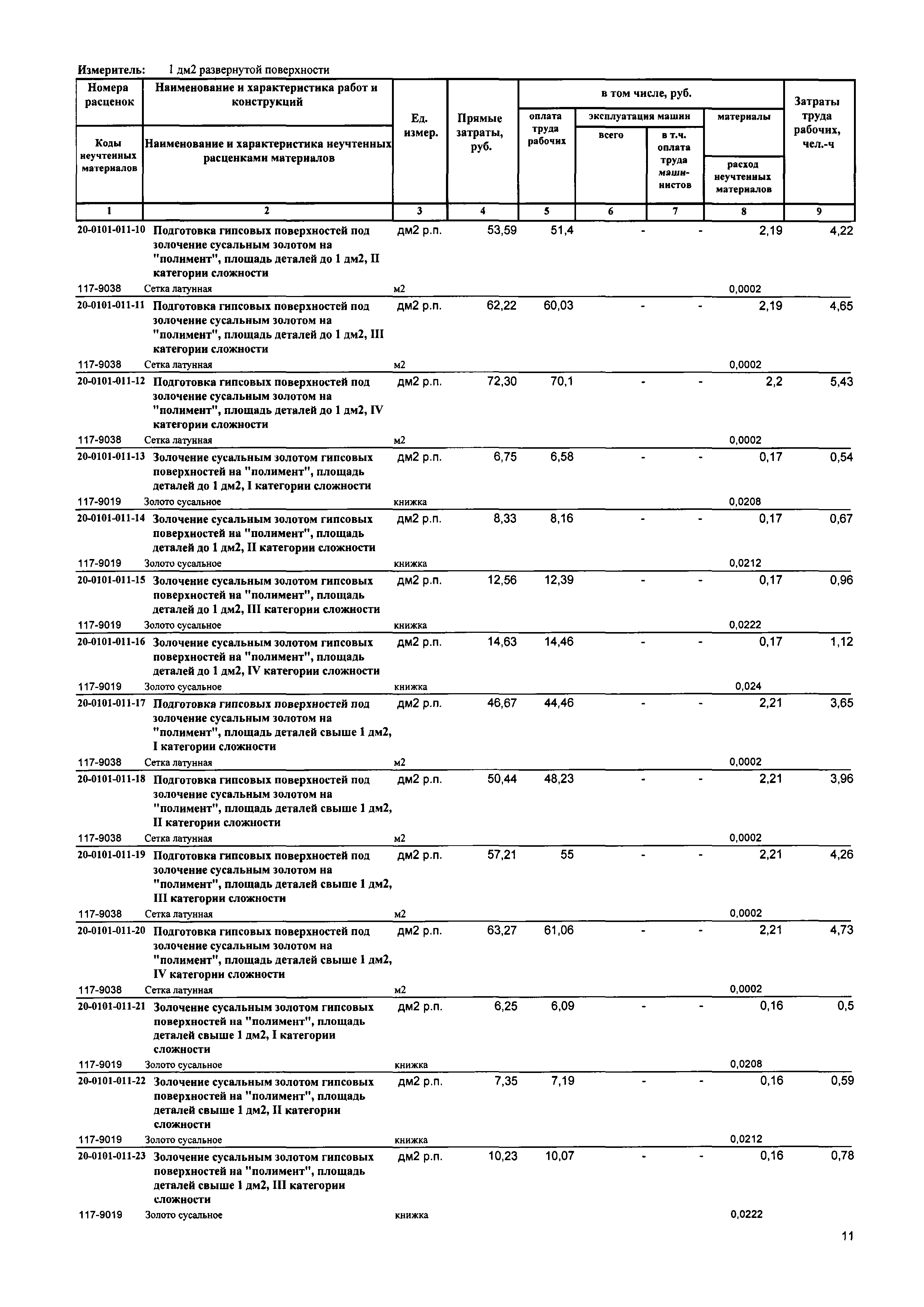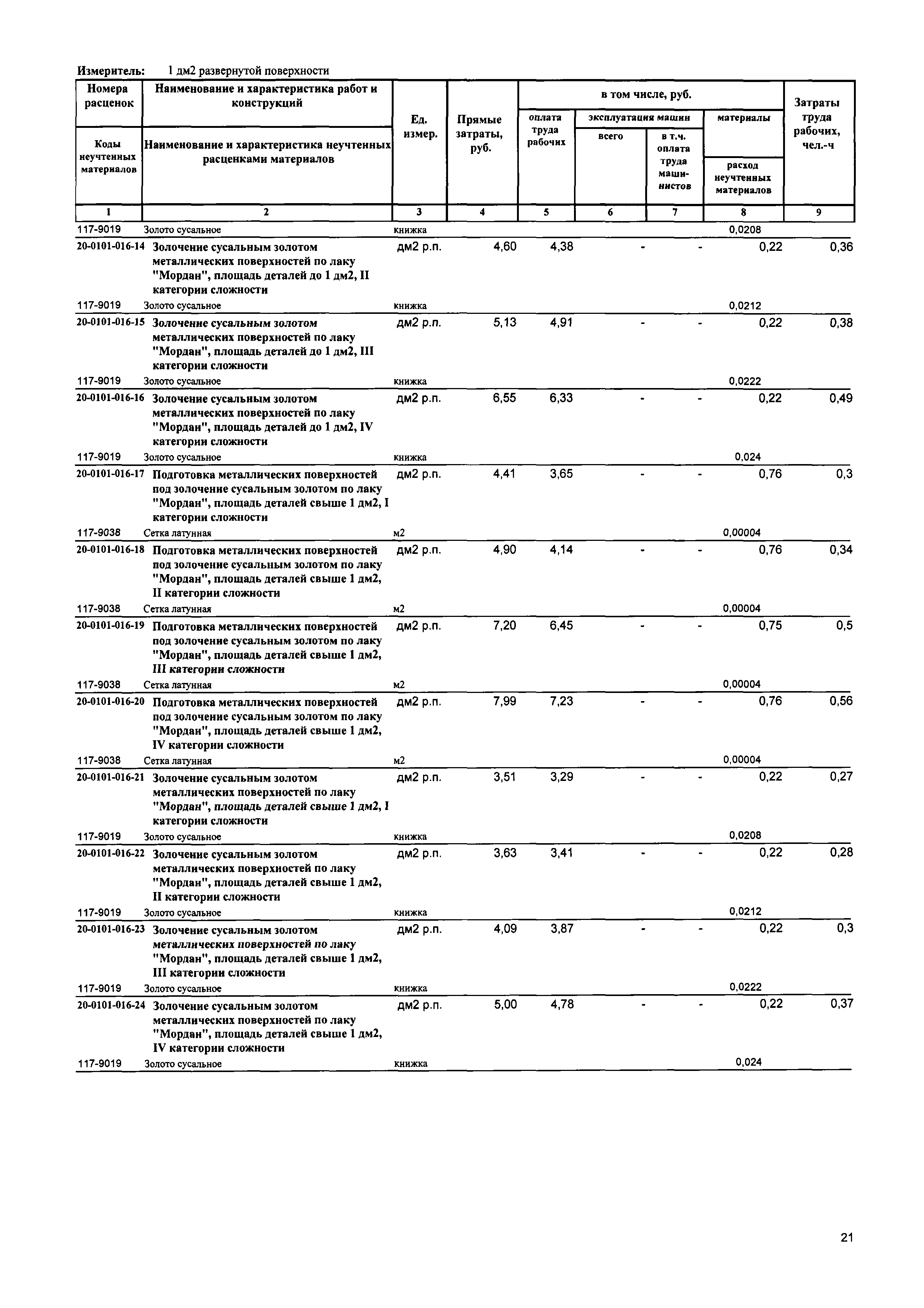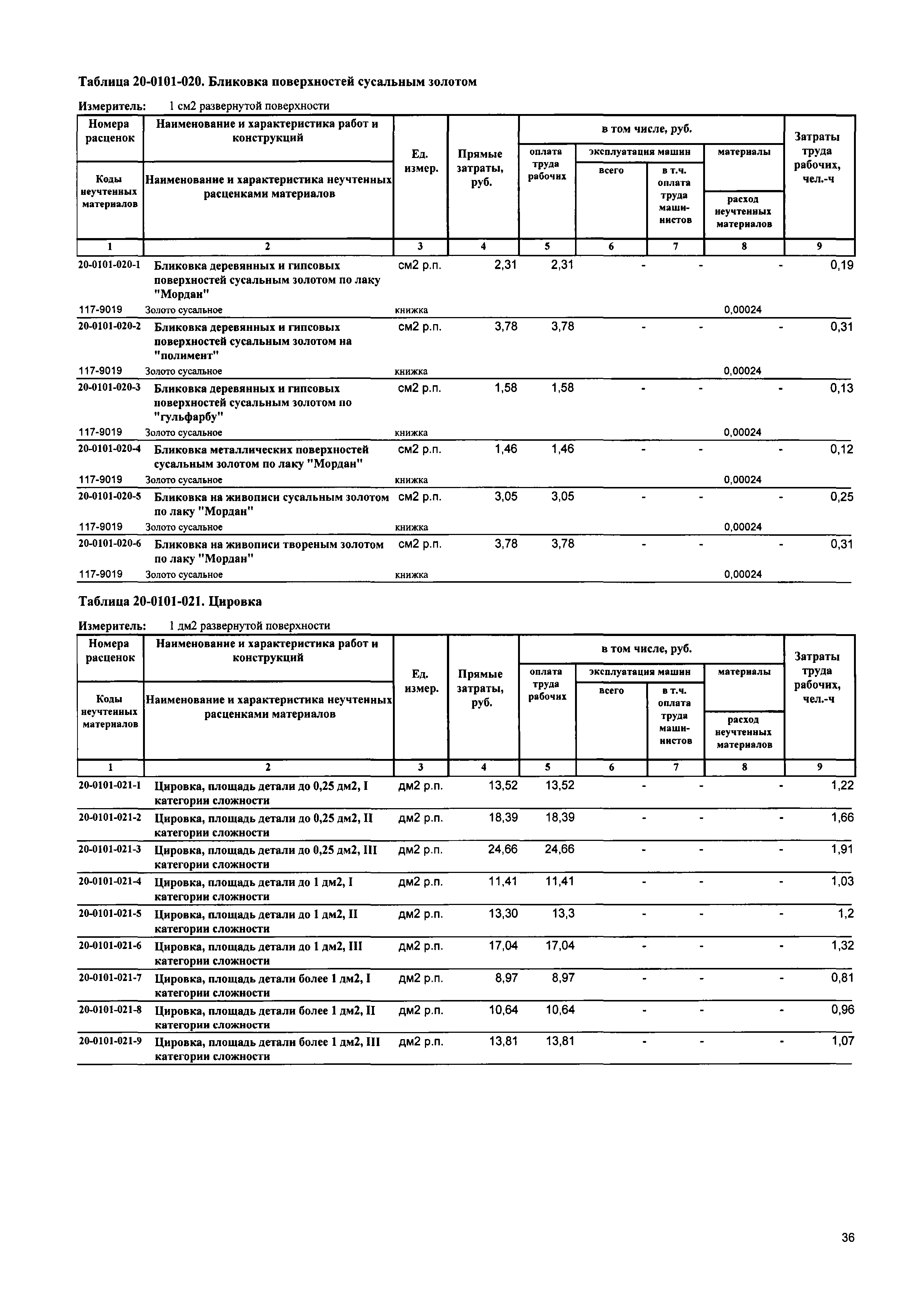 | Область применения: | Расценками сборника предусмотрены работы по реставрации и воссозданию позолоты наружных и внутренних элементов памятников истории и культуры на деревянных металлических и гипсовых поверхностях. |