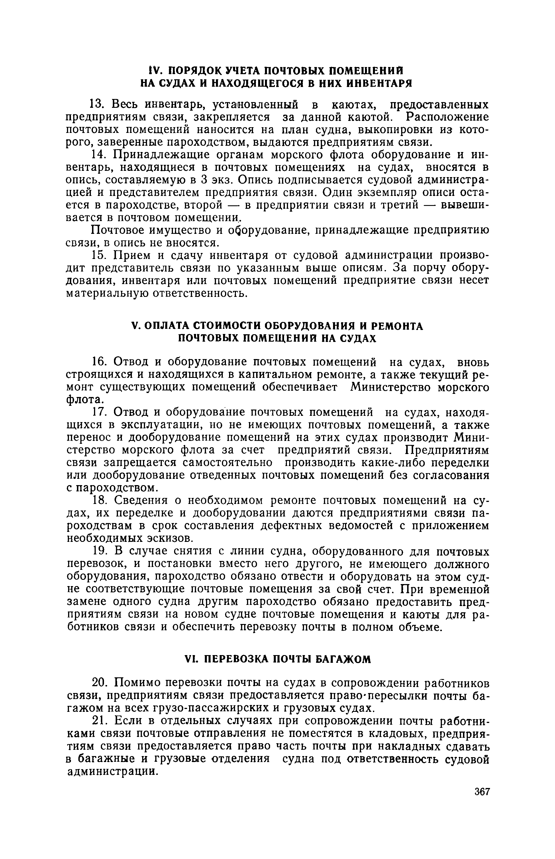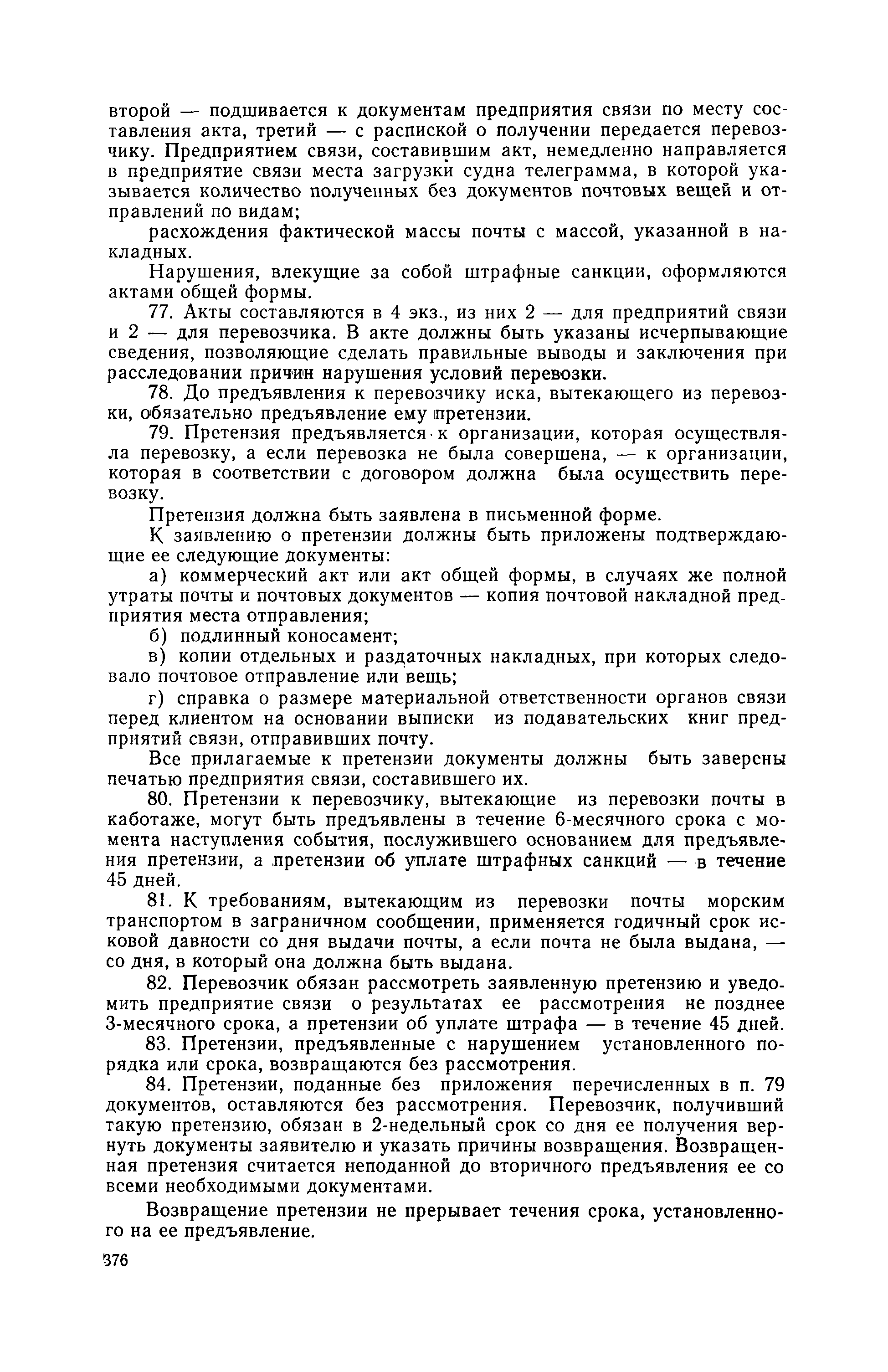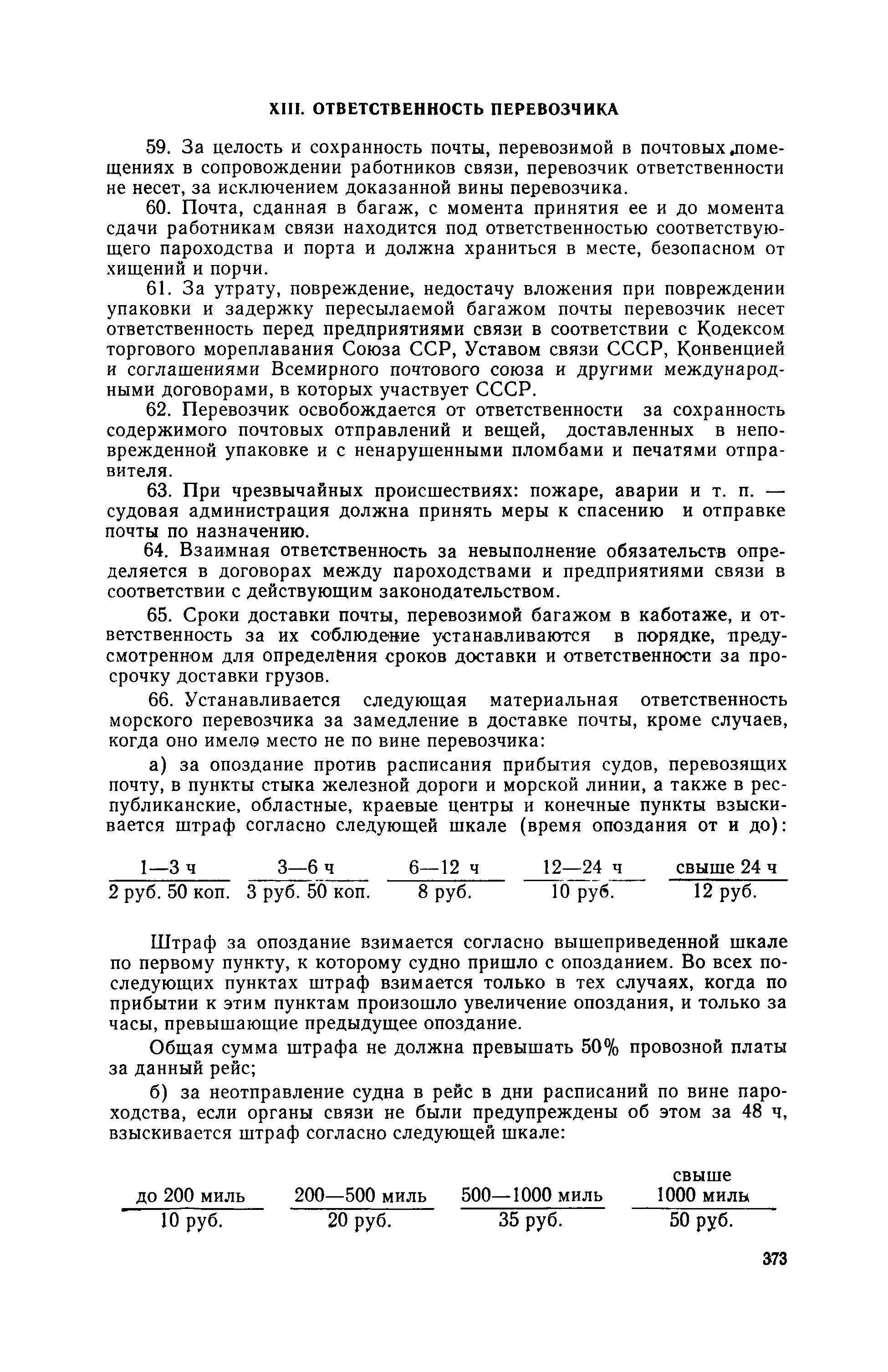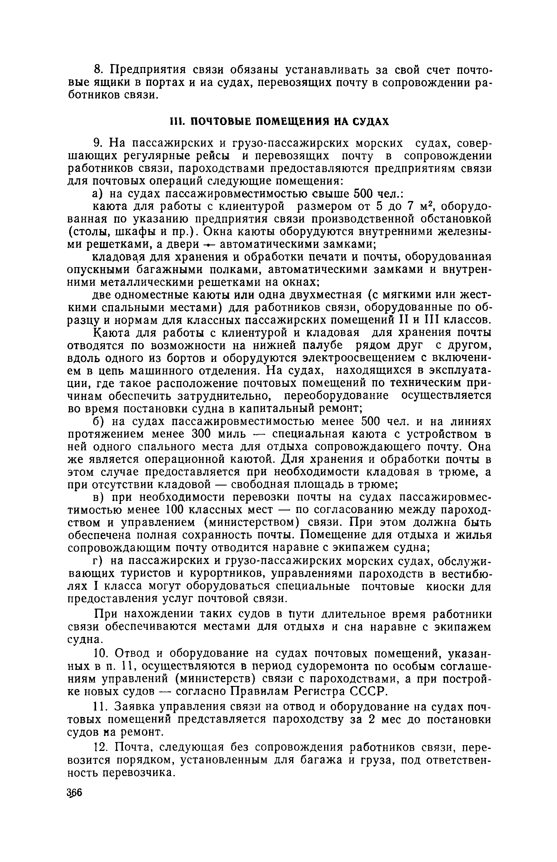 | Оглавление: | 1 Общие положения 2 Почтовые помещения в портах 3 Почтовые помещения на судах 4 Порядок учёта почтовых помещений на судах и находящегося в них инвентаря 5 Оплата стоимости оборудования и ремонта почтовых помещения на судах 6 Перевозка почты багажом 7 Перевозка почты в контейнерах 8 Оформление документации на почту, перевозимую на судах 9 Погрузка и выгрузка почты 10 Разъездные работники 11 Контроль и досмотр почтовых помещений на судах 12 Расписание движения грузо-пассажирских судов 13 Ответственность перевозчика 14 Нормы перевозок, тарифы и порядок расчетов за перевозку почты 15 Порядок и условия заключения договоров на перевозку почты по морским линиям 16 Претензии и иски 17 Порядок перевозки морем международной почты |
