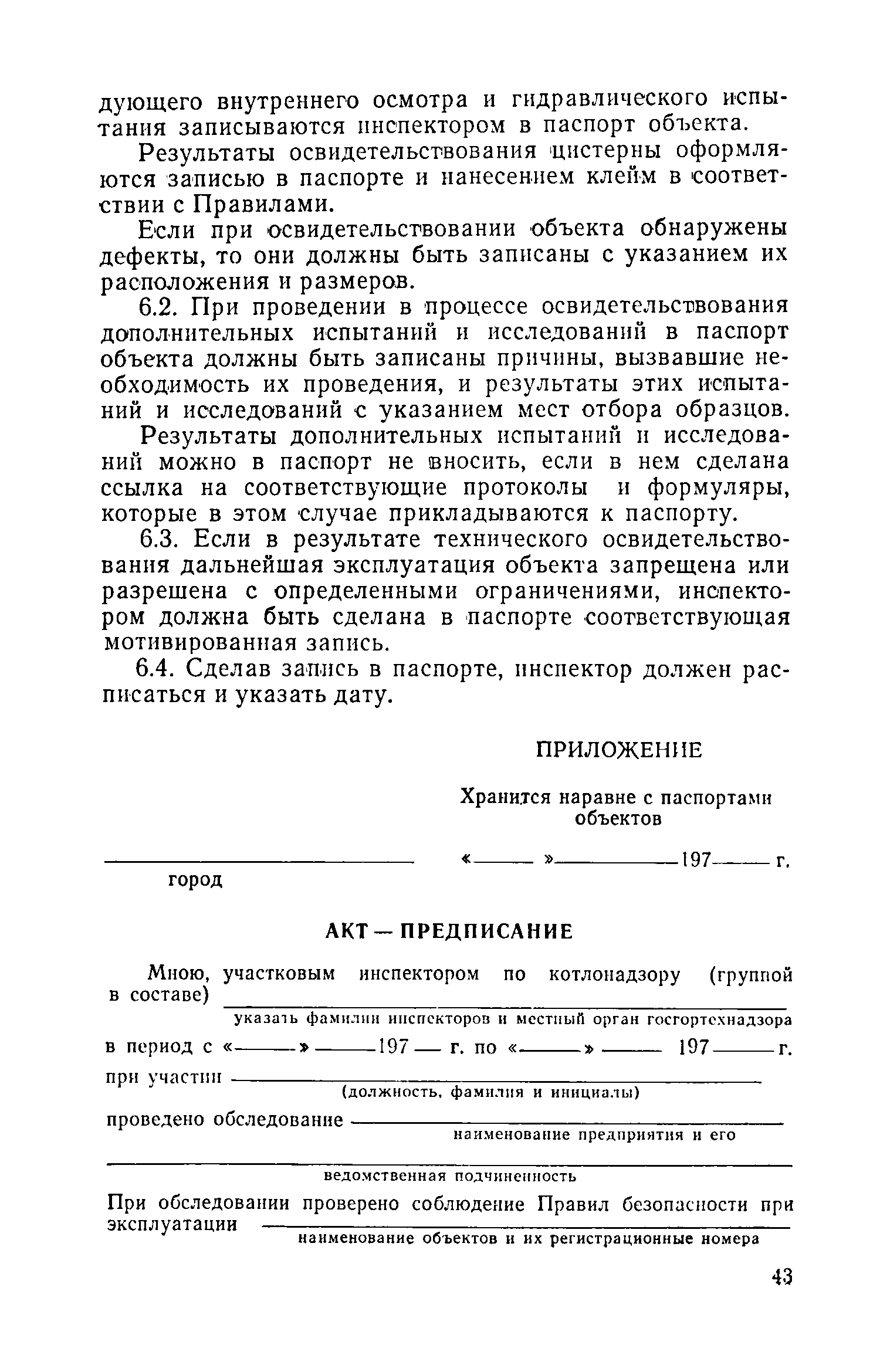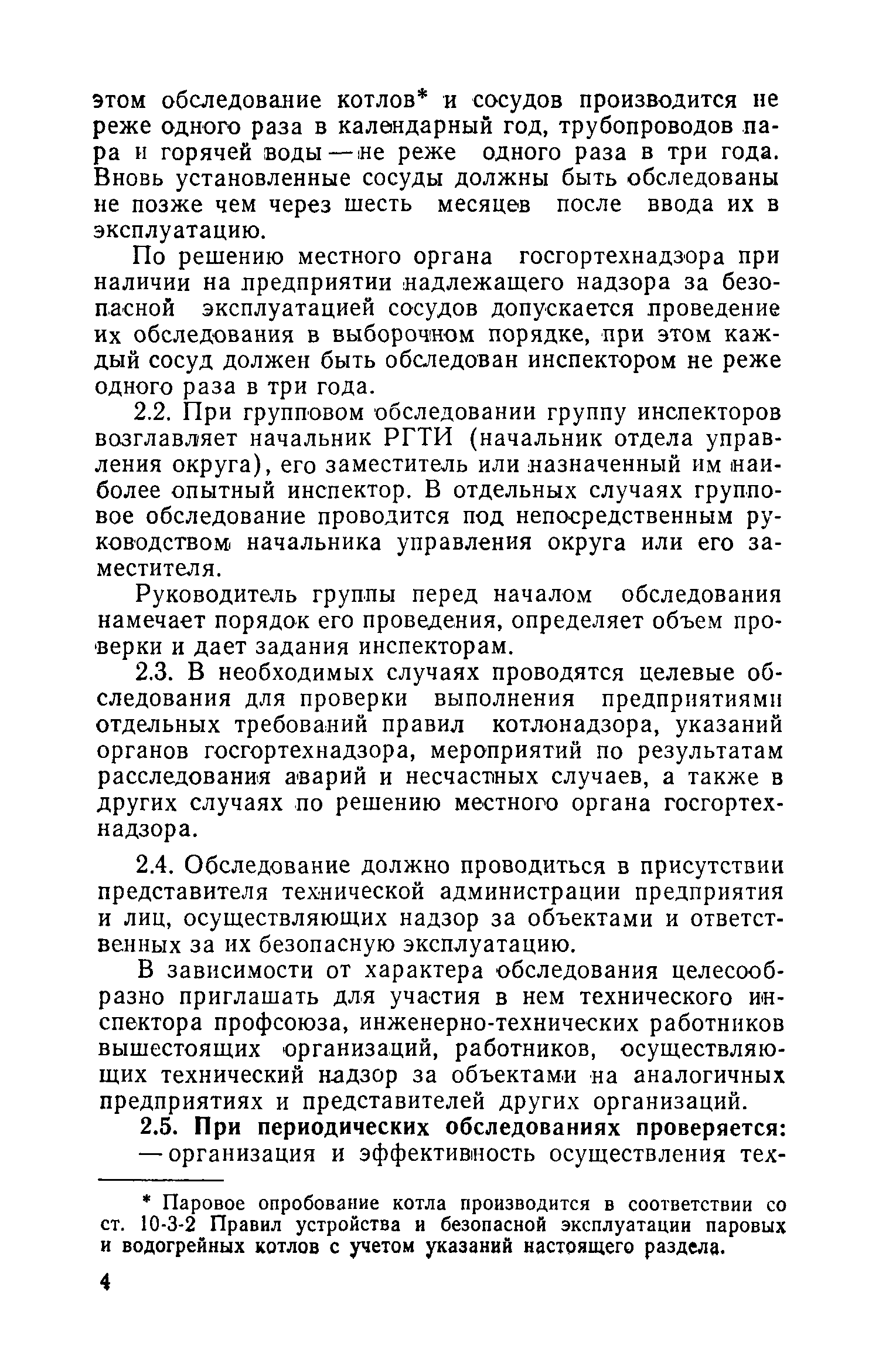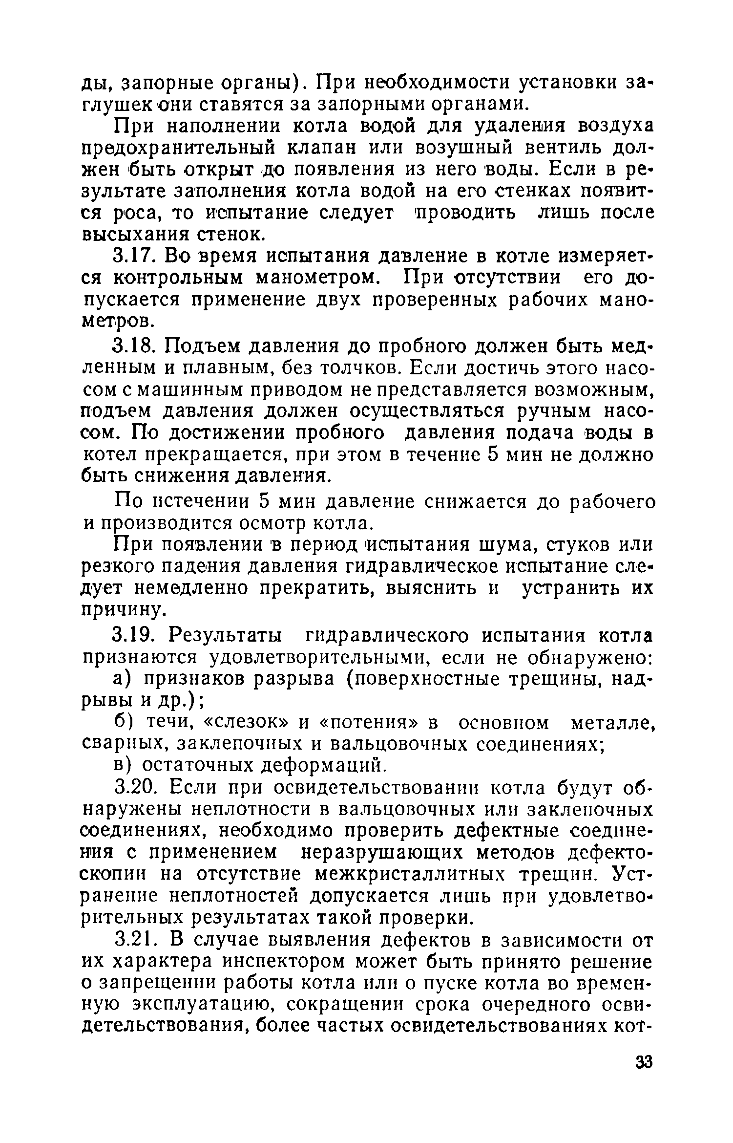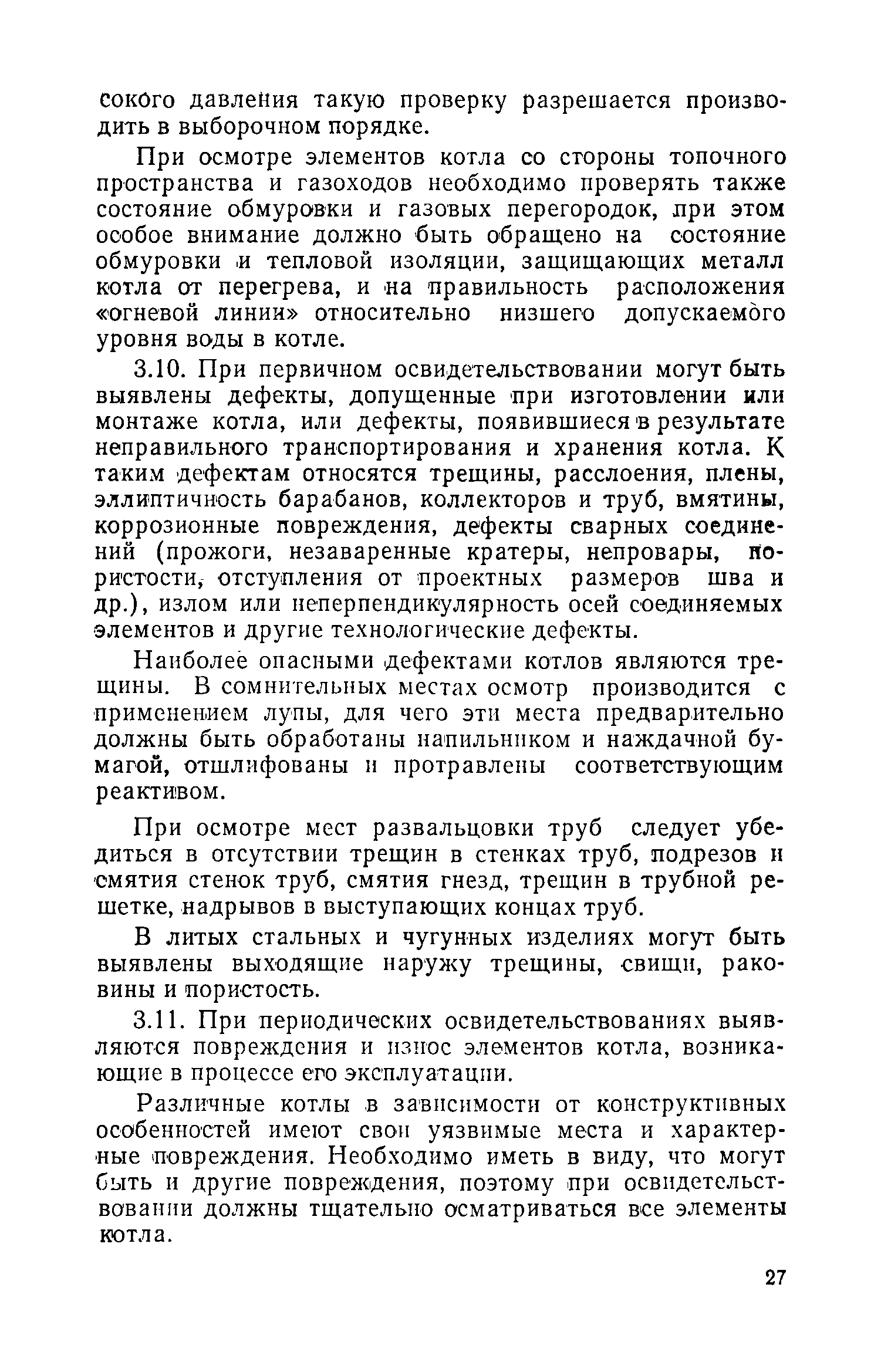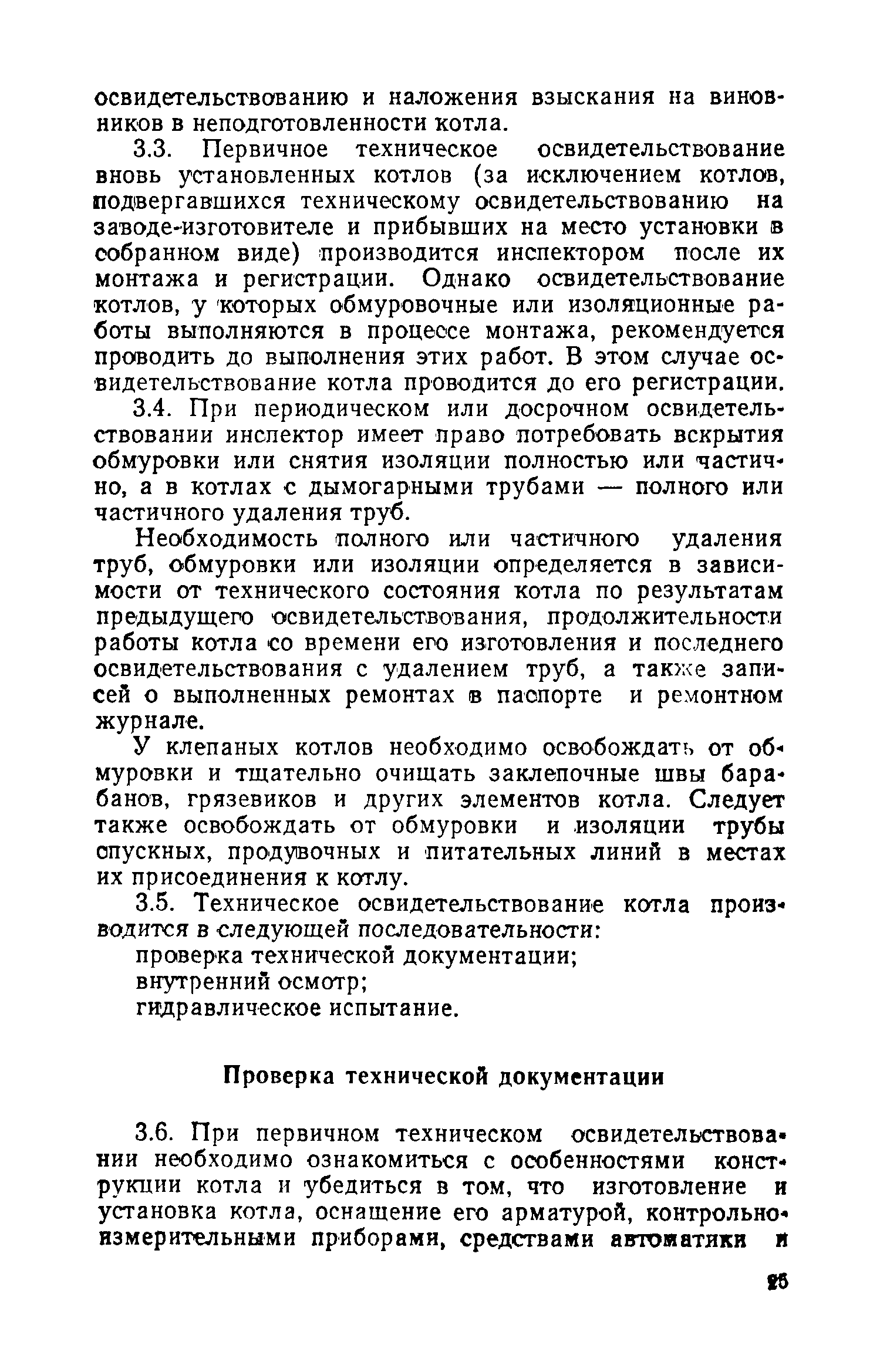 | Оглавление: | 1 Общие положения 2 Обследование 3 Техническое освидетельствование котлов Общие положения Проверка технической документация Внутренний осмотр Гидравлическое испытание 4 Техническое освидетельствование сосудов Общие положения Проверка технической документации Внутренний осмотр Гидравлическое испытание 5 Техническое освидетельствование трубопроводов пара и горячей воды Общие положения Проверка технической документации Наружный осмотр Гидравлическое испытание 6 Оформление результатов технического освидетельствования 7 Приложение. Перечень некоторых нормативных и других материалов, которые могут быть использованы инспектором при обследованиях и освидетельствованиях объектов котлонадзора |