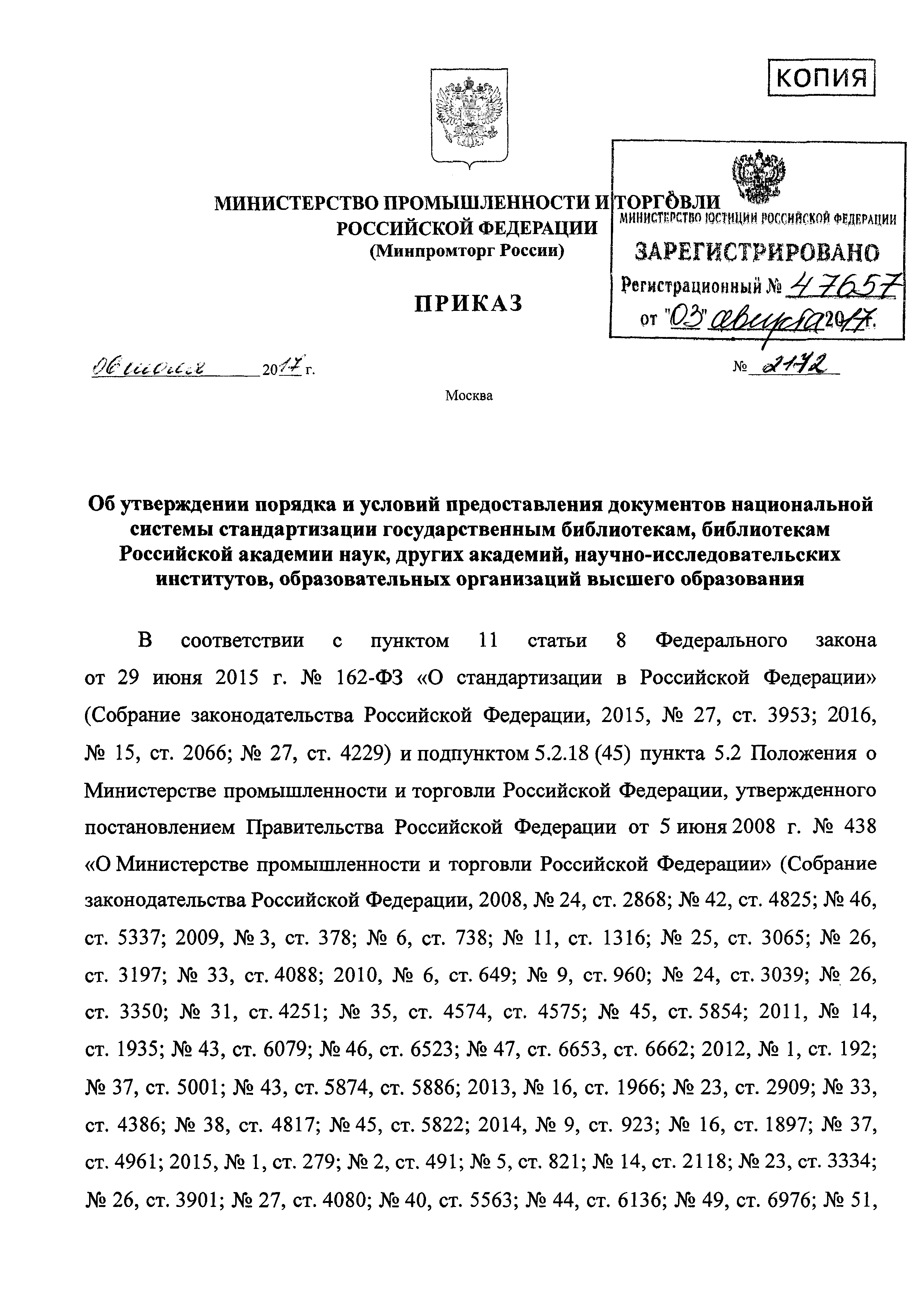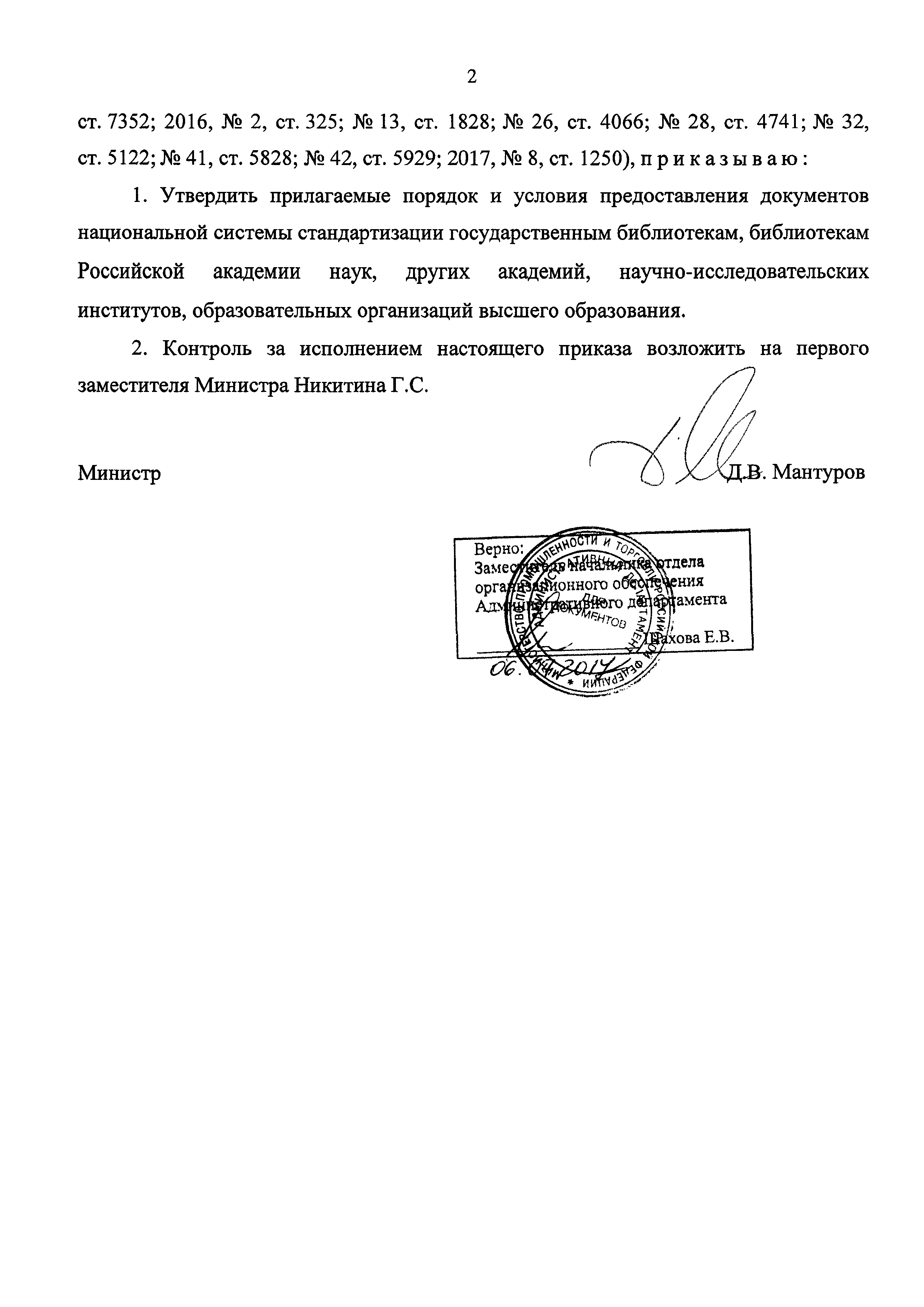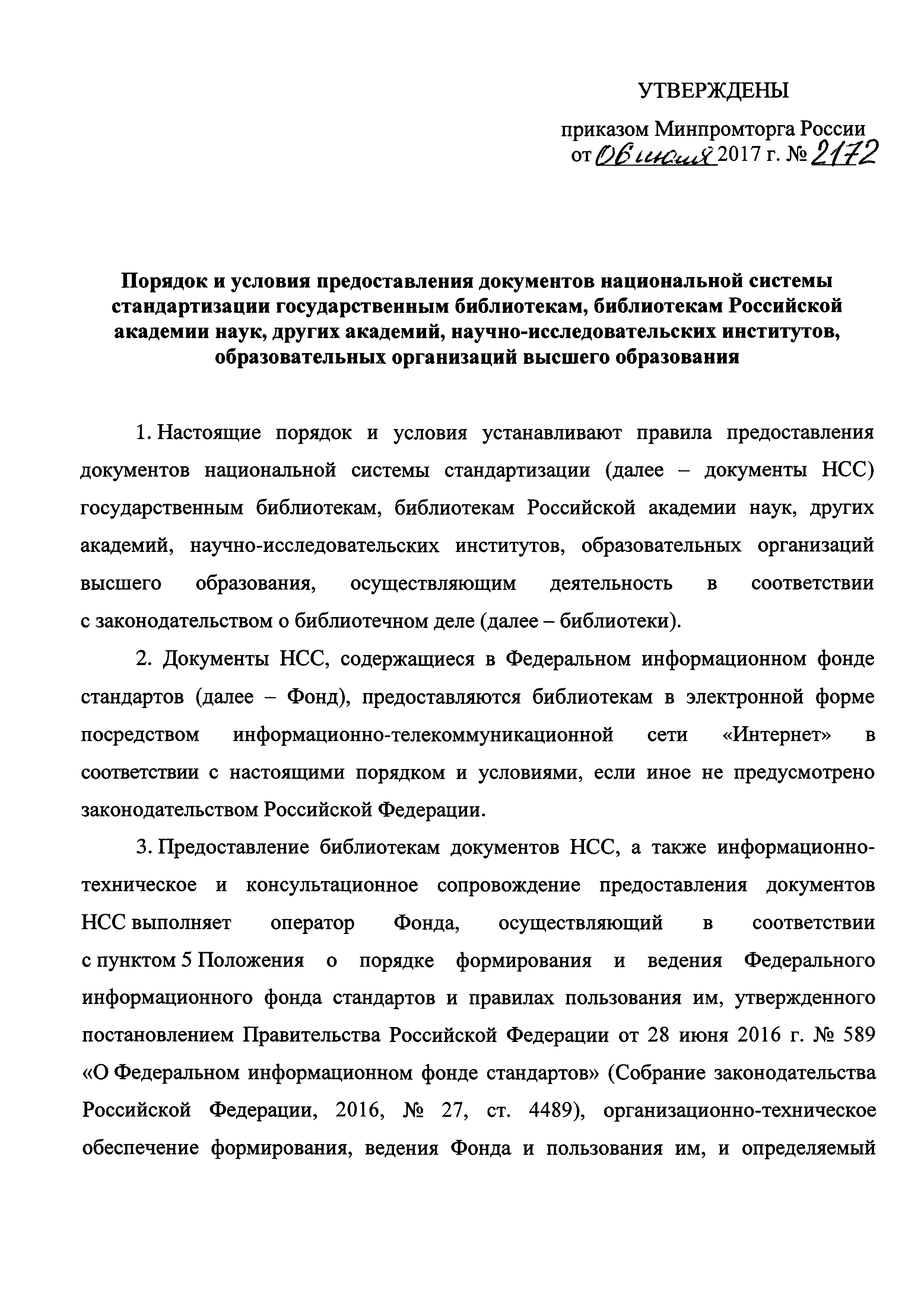 Порядок и условия предоставления документов национальной системы стандартизации государственным библиотекам, библиотекам Российской академии наук, других академий, научно-исследовательских институтов, образовательных организаций высшего образования| Статус: | действует | | Название рус.: | Порядок и условия предоставления документов национальной системы стандартизации государственным библиотекам, библиотекам Российской академии наук, других академий, научно-исследовательских институтов, образовательных организаций высшего образования | | Дата добавления в базу: | 01.01.2018 | | Дата актуализации: | 01.01.2021 | | Дата введения: | 14.08.2017 | | Область применения: | Порядок и условия устанавливают правила предоставления документов национальной системы стандартизации государственным библиотекам, библиотекам Российской академии наук, других академий, научно-исследовательских институтов, образовательных организаций высшего образования, осуществляющим деятельность в соответствии с законодательством о библиотечном деле | | Утверждён: | 06.07.2017 Минпромторг России (2172)