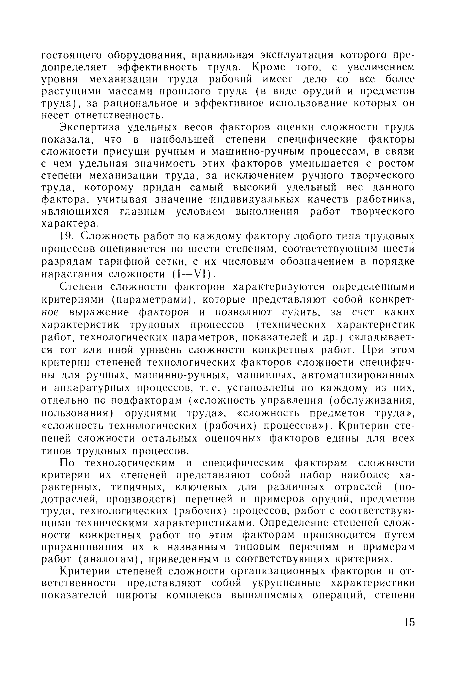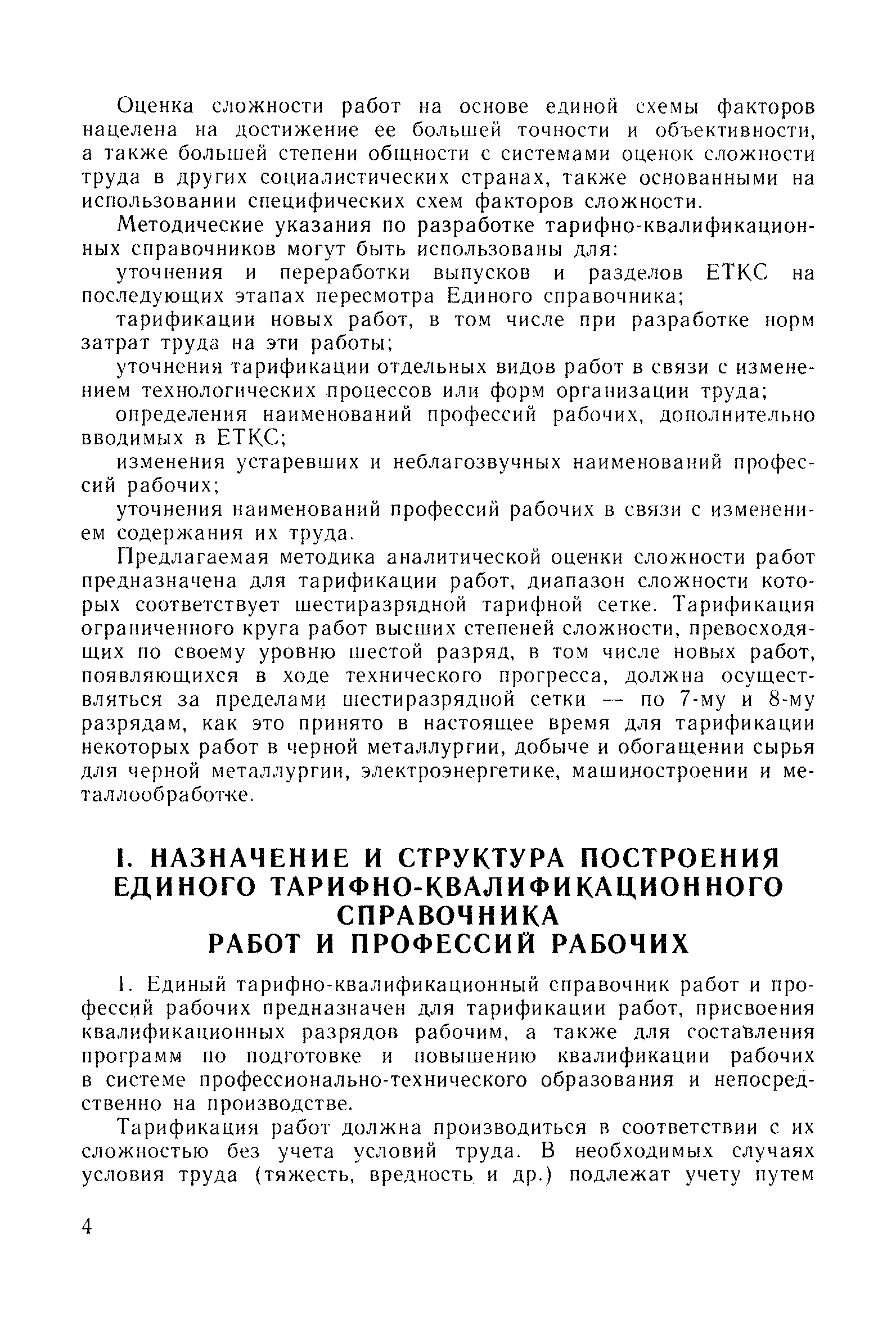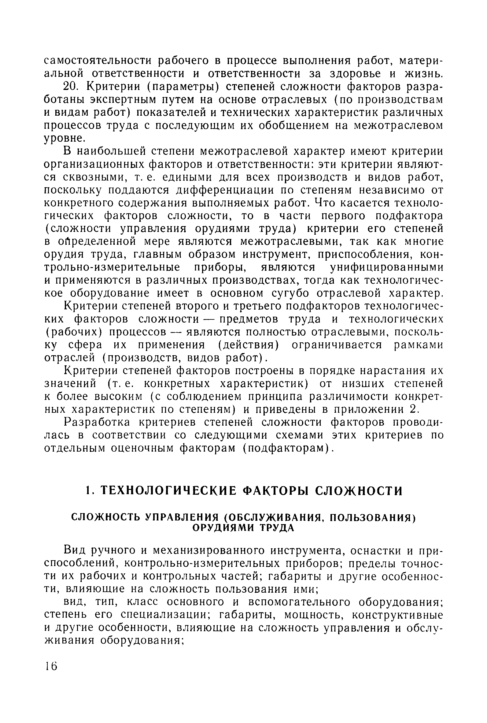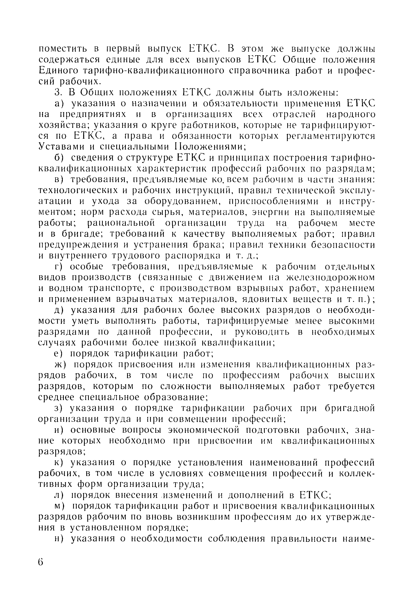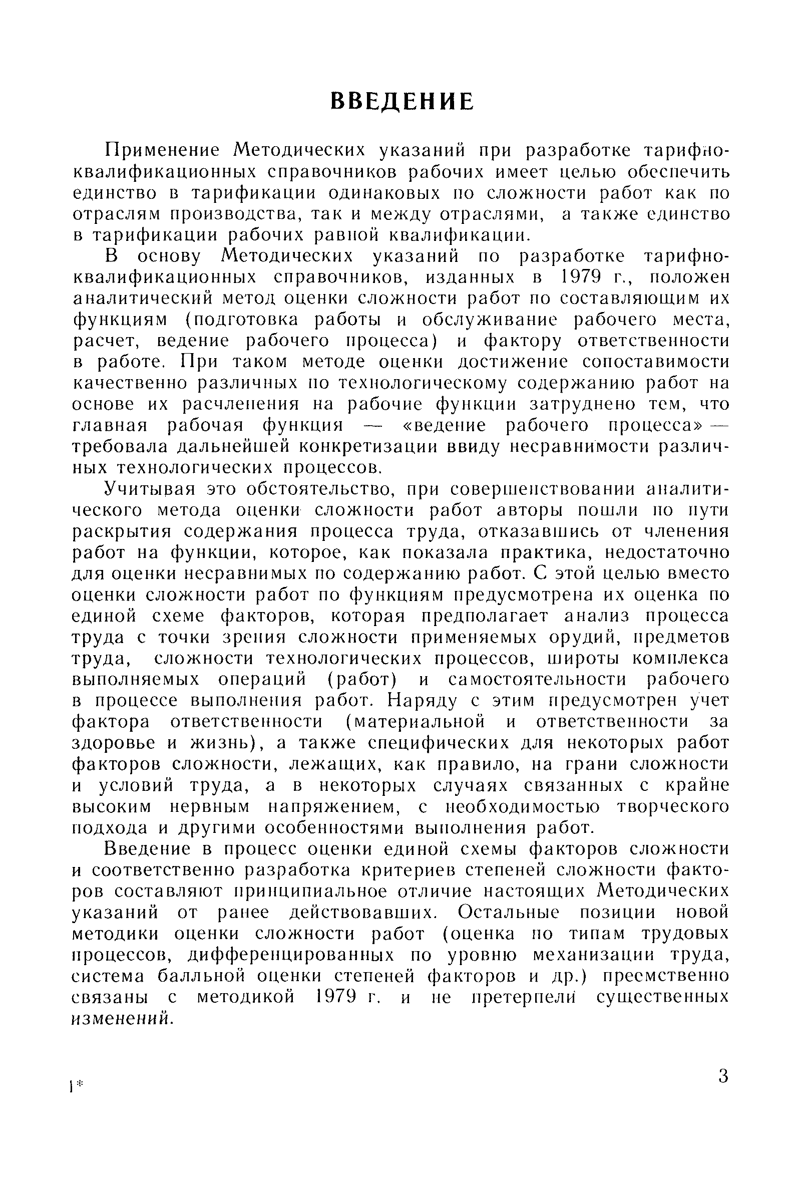 | Оглавление: | Введение I Назначение и структура построения Единого тарифно-квалификационного справочника работ и профессий рабочих II Основы методики определения разряда сложности работ III Определение требований к квалификации рабочих IV Определение наименований профессий рабочих Приложение 1. Примеры тарифно-квалификационных характеристик профессий рабочих по типам трудовых процессов Приложение 2. Критерии степеней сложности факторов 1. Критерии степеней сложности технологических факторов 1. Критерии степеней подфактора "Сложность управлении (обслуживания, пользования) орудиями труда" А. Для ручных процессов труда Б. Для машинно-ручных процессов труда В. Для машинных процессов труда Г. Для автоматизированных процессов труда Д. Для аппаратурных процессов труда 2. Критерии степеней подфактора "Сложность предметов труда" А. Для ручных процессов труда Б. Для машинно-ручных процессов труда В. Для машинных процессов труда 3. Критерии степеней подфактора "Сложность технологических (рабочих) процессов" А. Для ручных процессов труда Б. Для машинно-ручных процессов труда В. Для машинных процессов труда Г. Для автоматизированных процессов труда Д. Для аппаратурных процессов труда II Критерии степеней сложности организационных факторов (широты комплекса выполняемых операций (работ) и степени самостоятельности рабочего в процессе выполнения работ) III Критерии степеней сложности фактора ответственности (материальной ответственности и ответственности за здоровье и жизнь) IV Критерии степеней сложности специфических факторов . . . Приложение 3. Профессионально-квалификационная карта рабочего Приложение 4. Примеры оценки сложности работ по типам трудовых процессов Приложение 5. Тарифно-квалификационная карта для определения разряда сложности работы |
