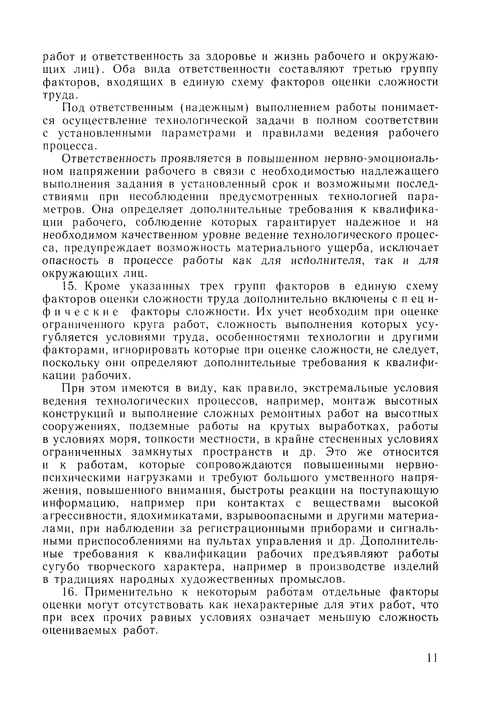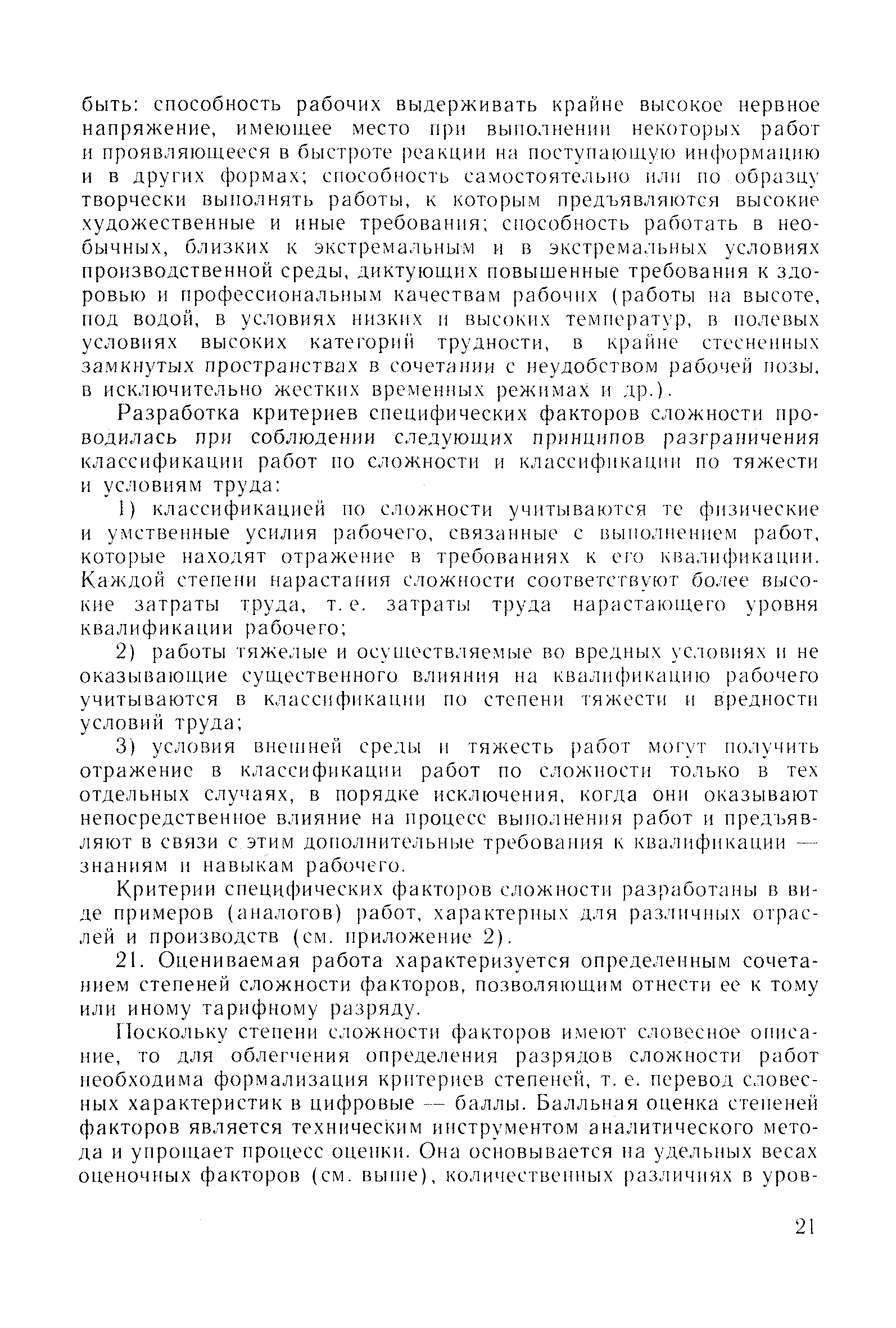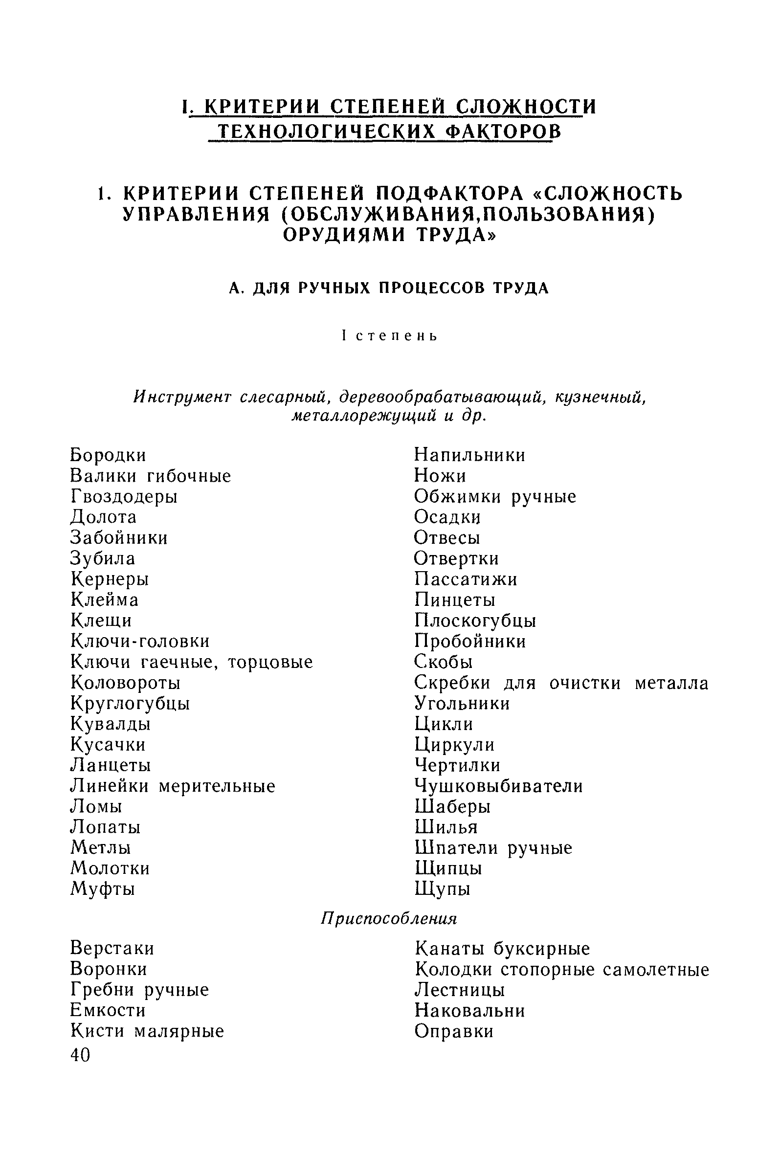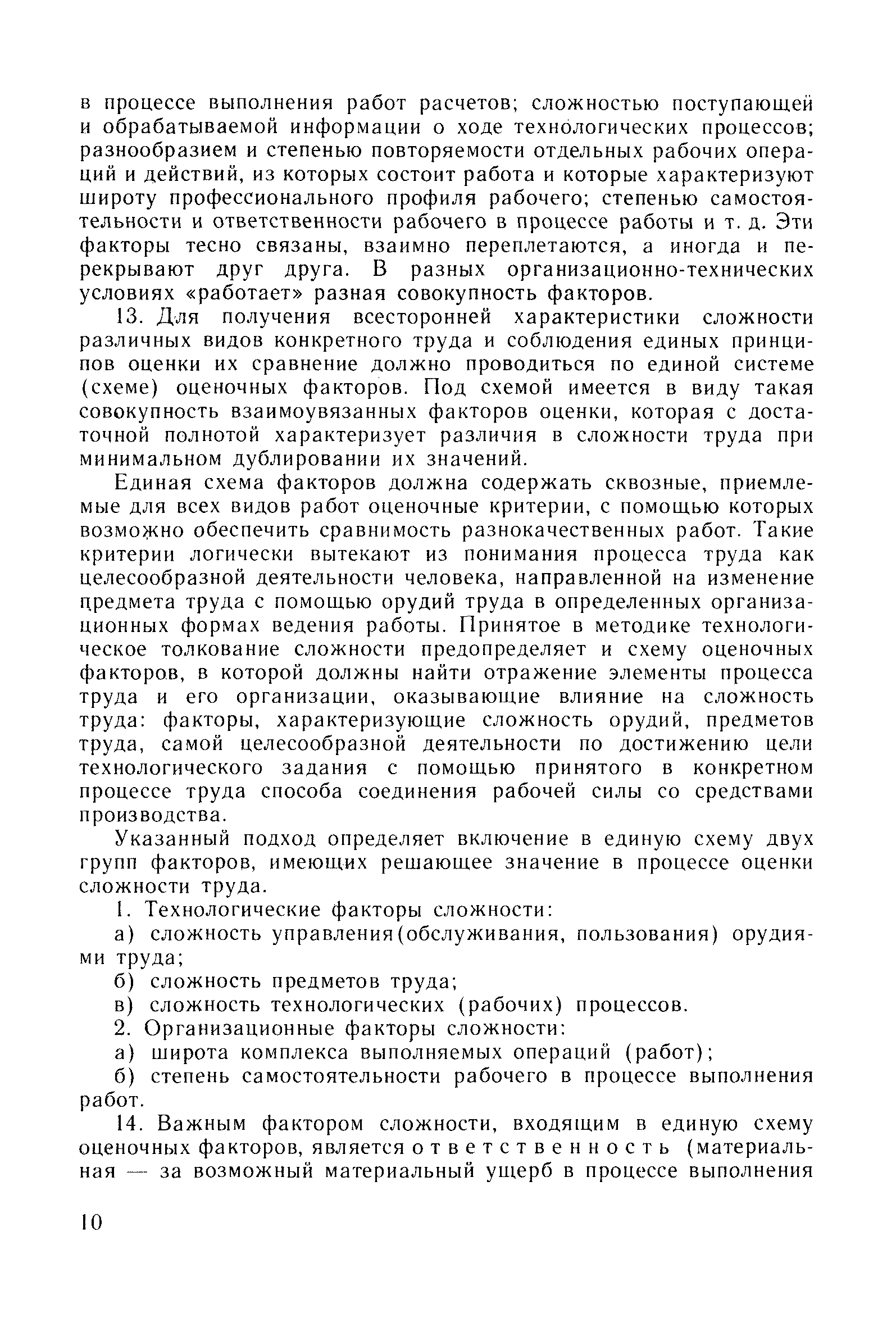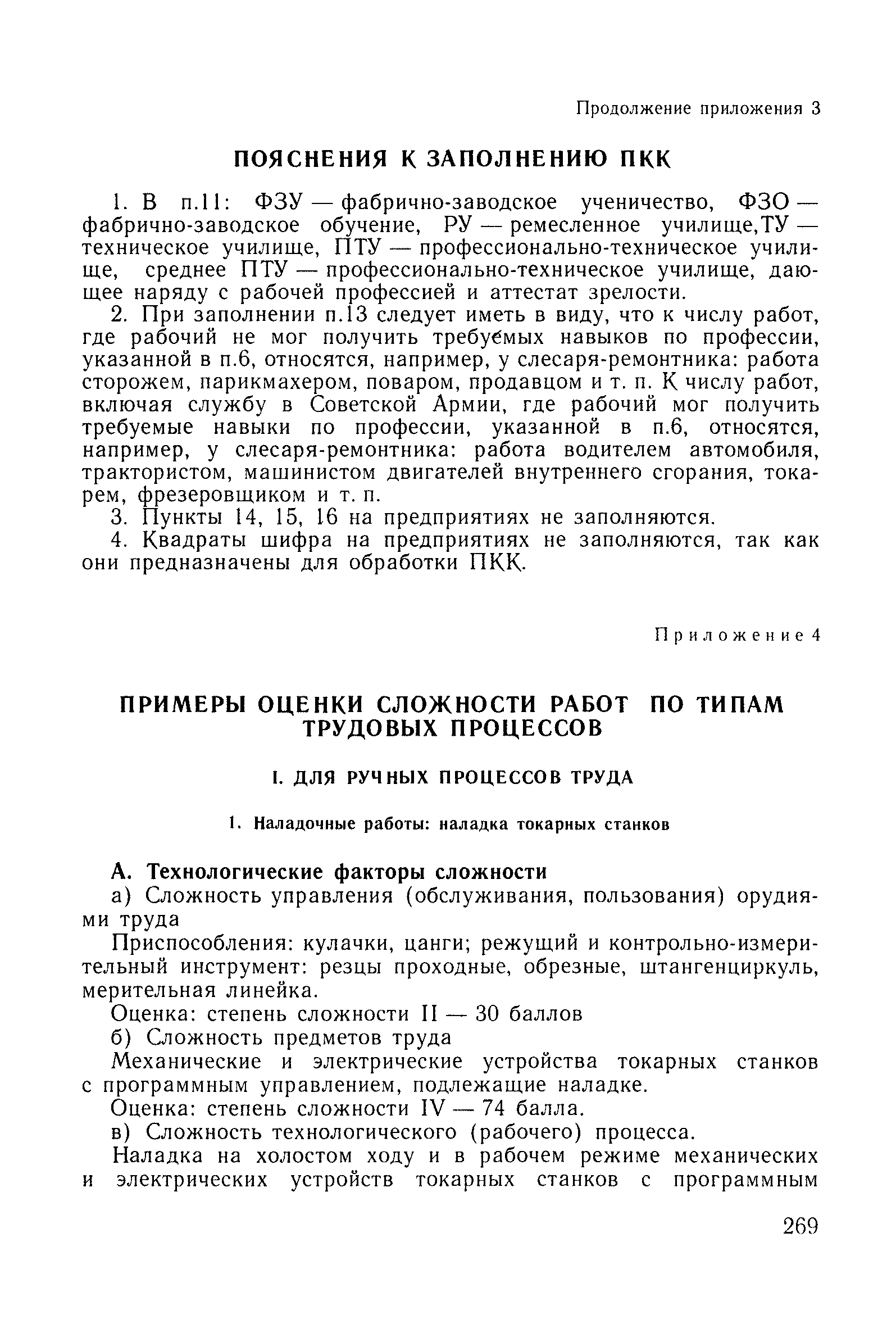 | Оглавление: | Введение I Назначение и структура построения Единого тарифно-квалификационного справочника работ и профессий рабочих II Основы методики определения разряда сложности работ III Определение требований к квалификации рабочих IV Определение наименований профессий рабочих Приложение 1. Примеры тарифно-квалификационных характеристик профессий рабочих по типам трудовых процессов Приложение 2. Критерии степеней сложности факторов 1. Критерии степеней сложности технологических факторов 1. Критерии степеней подфактора "Сложность управлении (обслуживания, пользования) орудиями труда" А. Для ручных процессов труда Б. Для машинно-ручных процессов труда В. Для машинных процессов труда Г. Для автоматизированных процессов труда Д. Для аппаратурных процессов труда 2. Критерии степеней подфактора "Сложность предметов труда" А. Для ручных процессов труда Б. Для машинно-ручных процессов труда В. Для машинных процессов труда 3. Критерии степеней подфактора "Сложность технологических (рабочих) процессов" А. Для ручных процессов труда Б. Для машинно-ручных процессов труда В. Для машинных процессов труда Г. Для автоматизированных процессов труда Д. Для аппаратурных процессов труда II Критерии степеней сложности организационных факторов (широты комплекса выполняемых операций (работ) и степени самостоятельности рабочего в процессе выполнения работ) III Критерии степеней сложности фактора ответственности (материальной ответственности и ответственности за здоровье и жизнь) IV Критерии степеней сложности специфических факторов . . . Приложение 3. Профессионально-квалификационная карта рабочего Приложение 4. Примеры оценки сложности работ по типам трудовых процессов Приложение 5. Тарифно-квалификационная карта для определения разряда сложности работы |