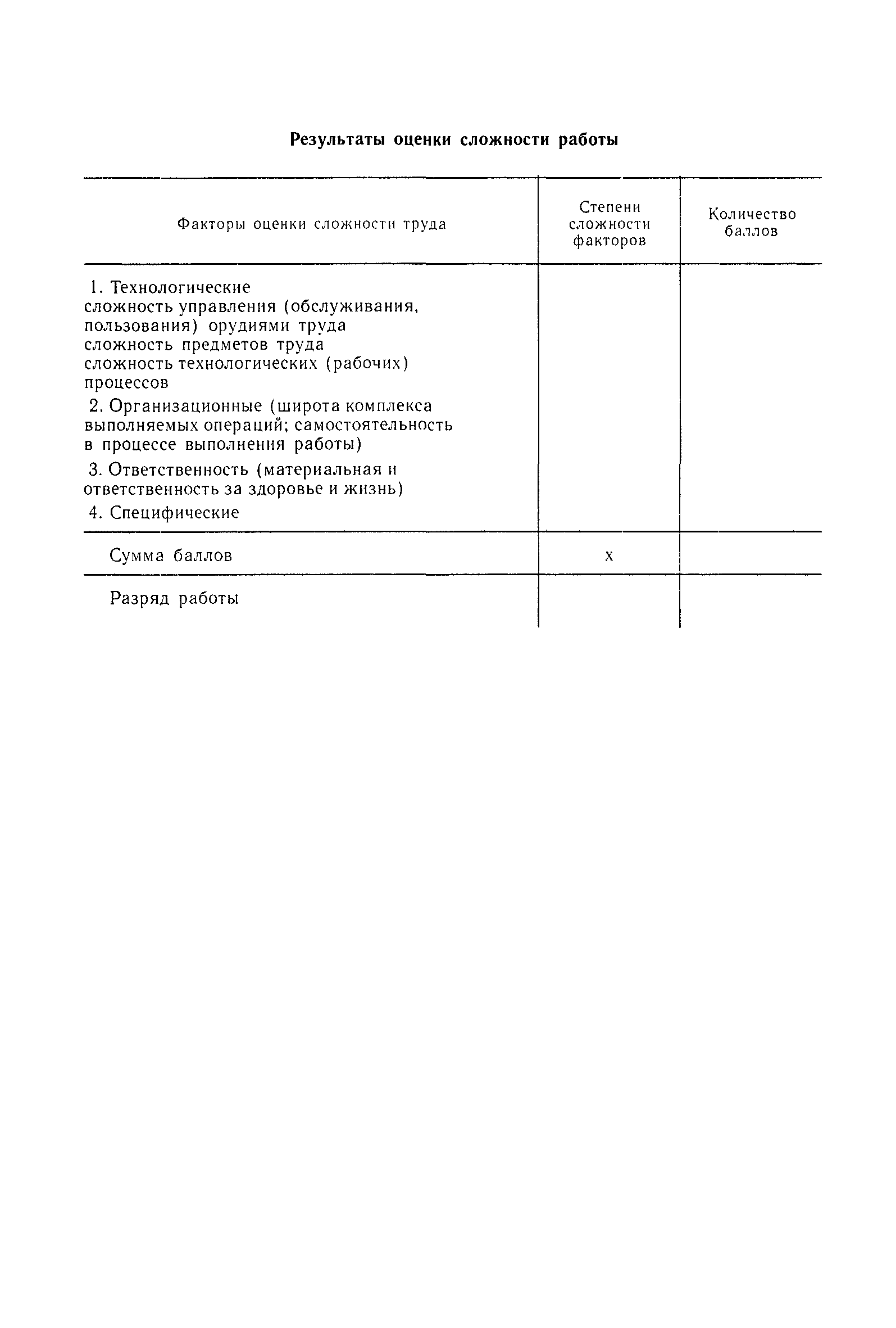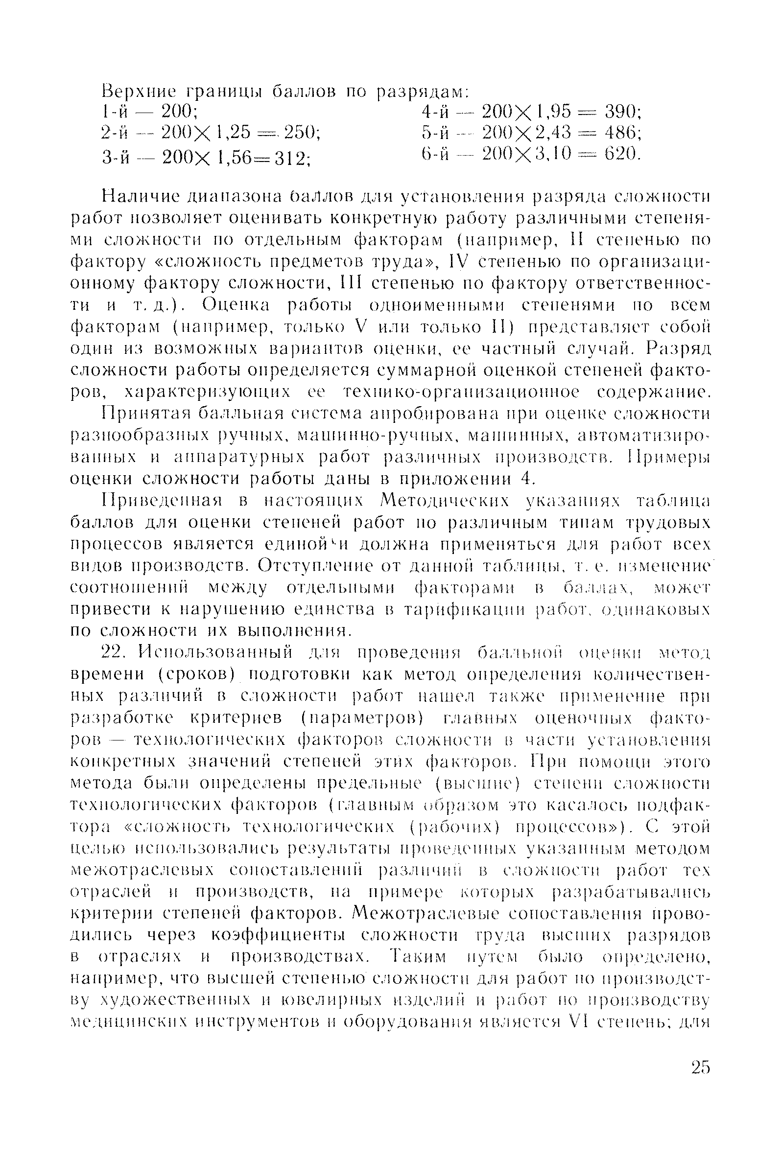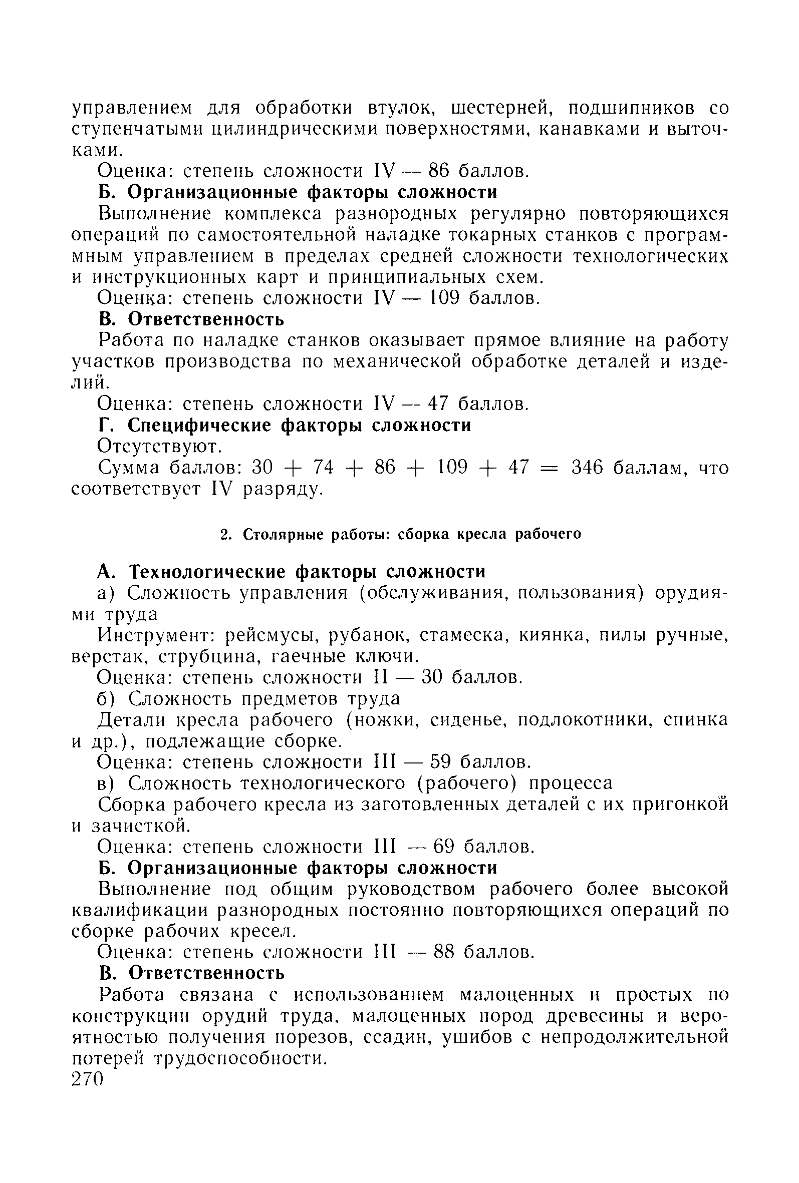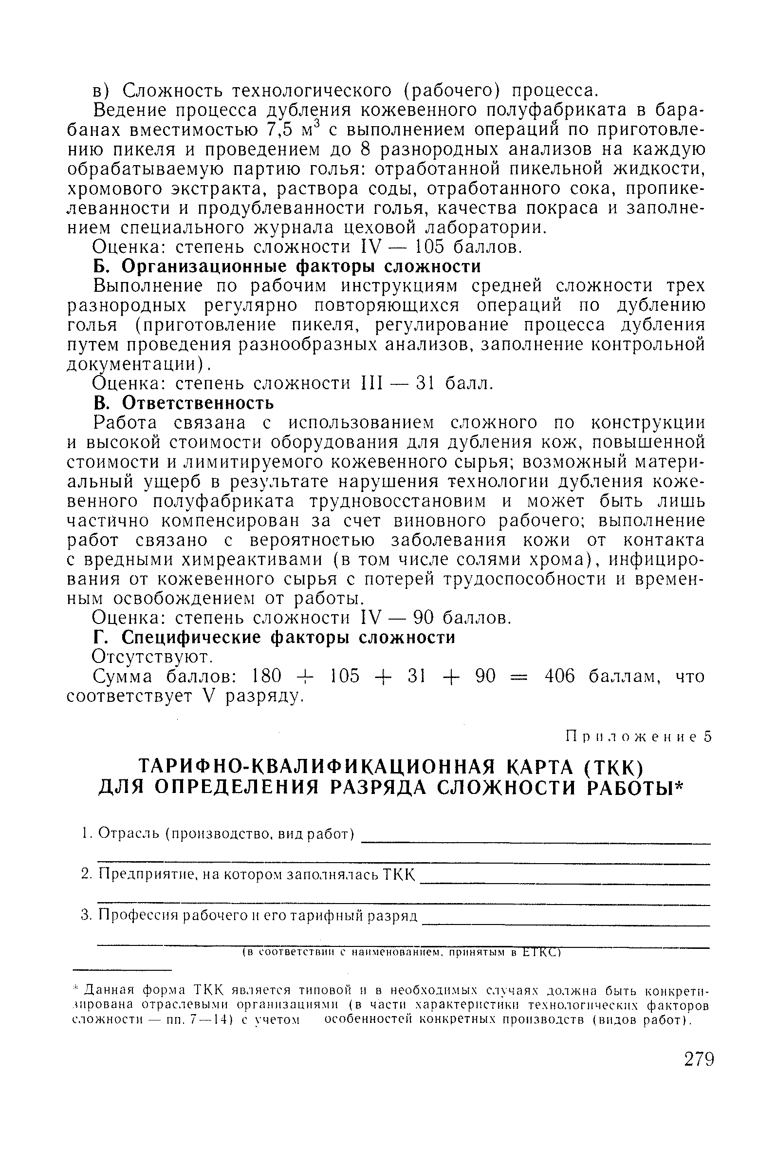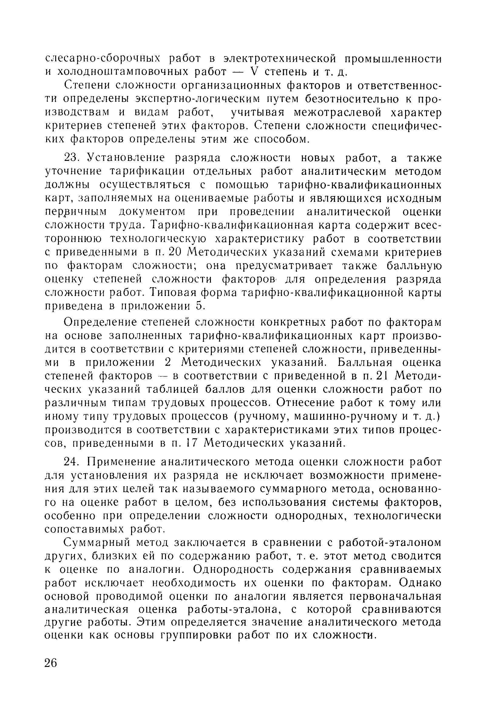 | Оглавление: | Введение I Назначение и структура построения Единого тарифно-квалификационного справочника работ и профессий рабочих II Основы методики определения разряда сложности работ III Определение требований к квалификации рабочих IV Определение наименований профессий рабочих Приложение 1. Примеры тарифно-квалификационных характеристик профессий рабочих по типам трудовых процессов Приложение 2. Критерии степеней сложности факторов 1. Критерии степеней сложности технологических факторов 1. Критерии степеней подфактора "Сложность управлении (обслуживания, пользования) орудиями труда" А. Для ручных процессов труда Б. Для машинно-ручных процессов труда В. Для машинных процессов труда Г. Для автоматизированных процессов труда Д. Для аппаратурных процессов труда 2. Критерии степеней подфактора "Сложность предметов труда" А. Для ручных процессов труда Б. Для машинно-ручных процессов труда В. Для машинных процессов труда 3. Критерии степеней подфактора "Сложность технологических (рабочих) процессов" А. Для ручных процессов труда Б. Для машинно-ручных процессов труда В. Для машинных процессов труда Г. Для автоматизированных процессов труда Д. Для аппаратурных процессов труда II Критерии степеней сложности организационных факторов (широты комплекса выполняемых операций (работ) и степени самостоятельности рабочего в процессе выполнения работ) III Критерии степеней сложности фактора ответственности (материальной ответственности и ответственности за здоровье и жизнь) IV Критерии степеней сложности специфических факторов . . . Приложение 3. Профессионально-квалификационная карта рабочего Приложение 4. Примеры оценки сложности работ по типам трудовых процессов Приложение 5. Тарифно-квалификационная карта для определения разряда сложности работы |