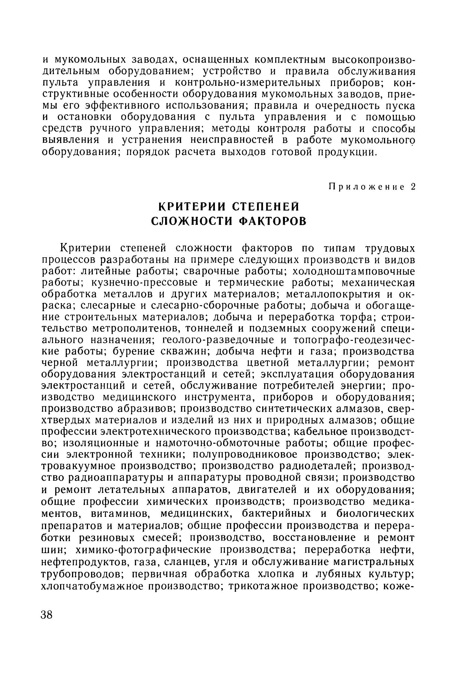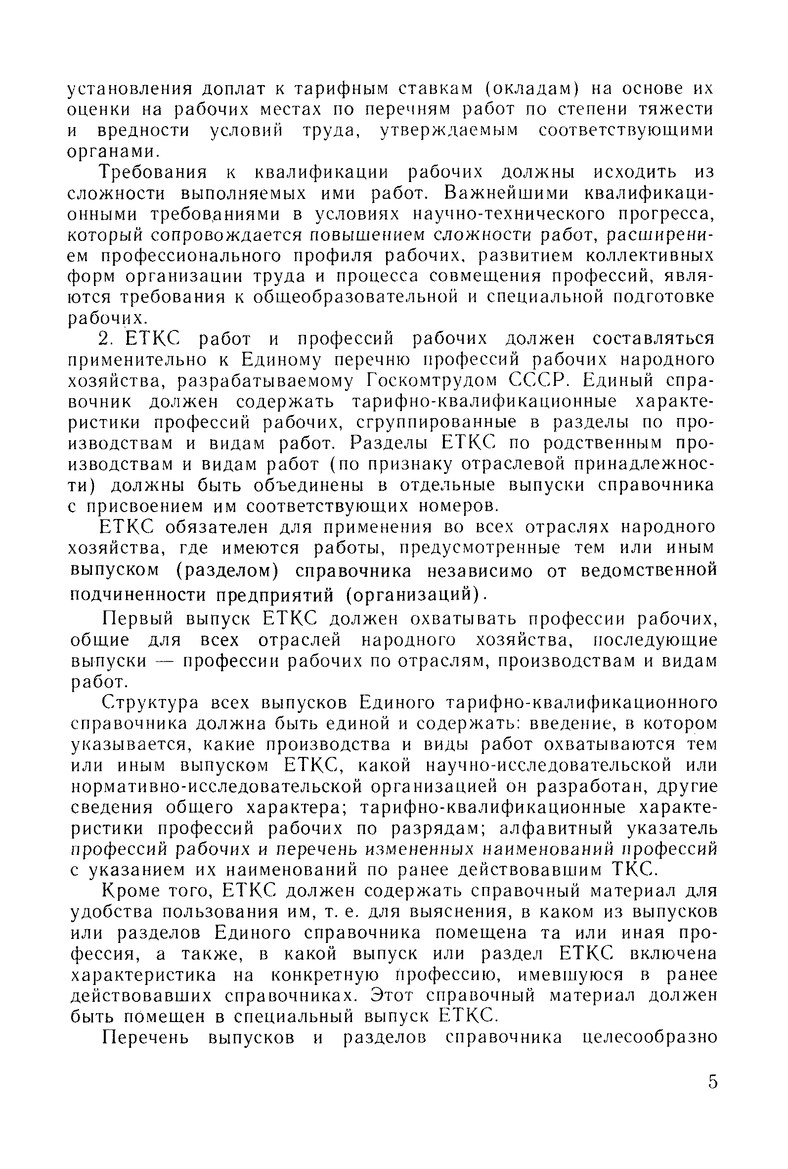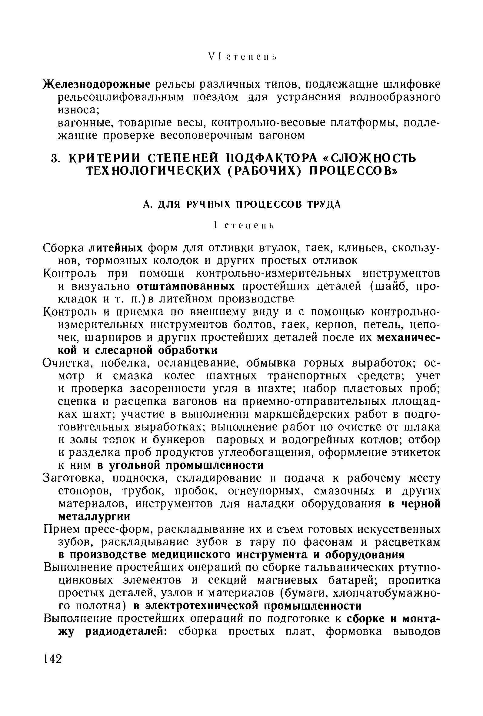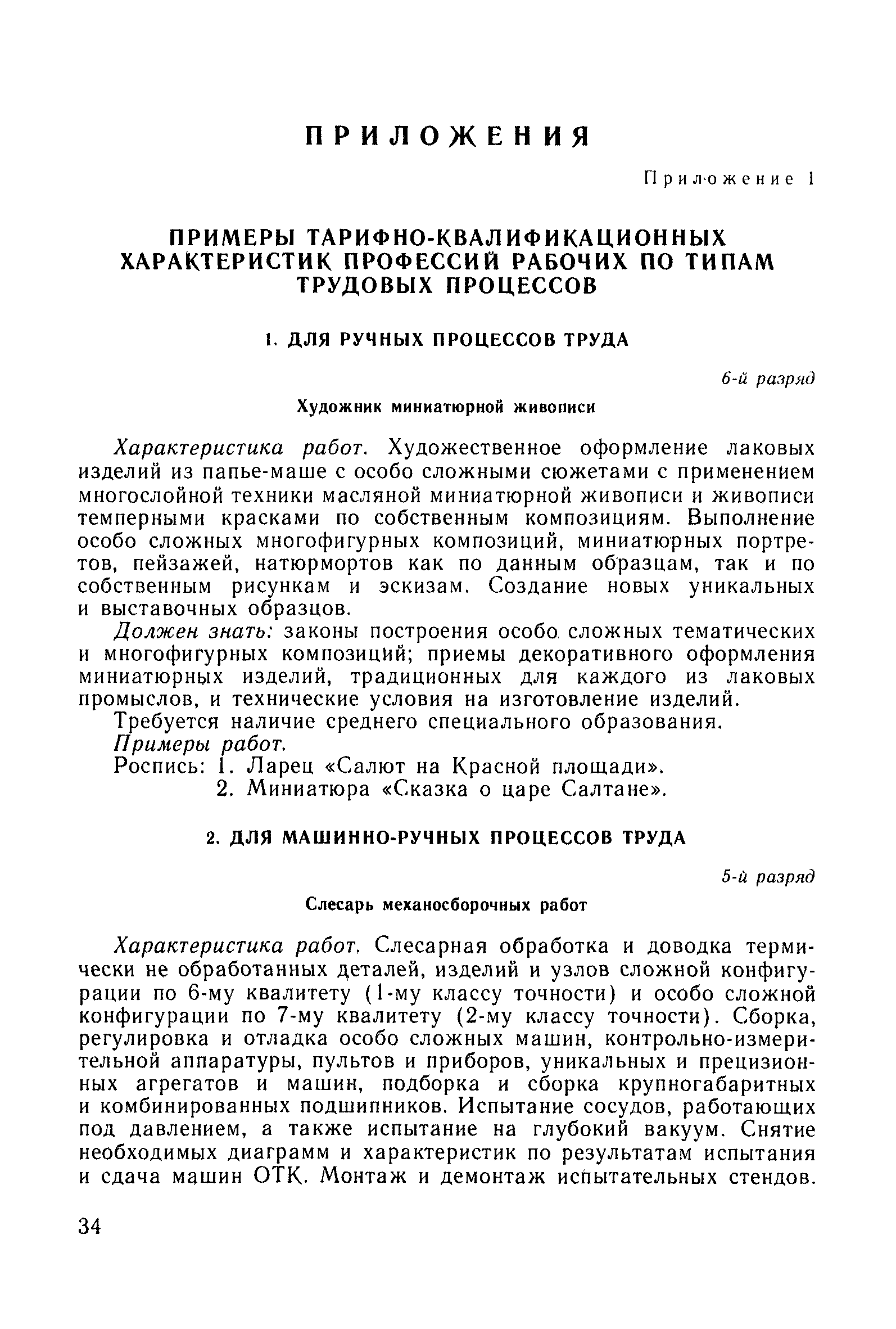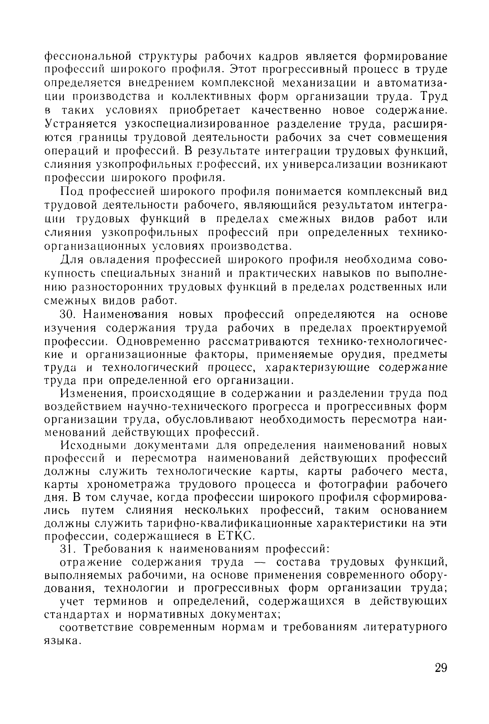 | Оглавление: | Введение I Назначение и структура построения Единого тарифно-квалификационного справочника работ и профессий рабочих II Основы методики определения разряда сложности работ III Определение требований к квалификации рабочих IV Определение наименований профессий рабочих Приложение 1. Примеры тарифно-квалификационных характеристик профессий рабочих по типам трудовых процессов Приложение 2. Критерии степеней сложности факторов 1. Критерии степеней сложности технологических факторов 1. Критерии степеней подфактора "Сложность управлении (обслуживания, пользования) орудиями труда" А. Для ручных процессов труда Б. Для машинно-ручных процессов труда В. Для машинных процессов труда Г. Для автоматизированных процессов труда Д. Для аппаратурных процессов труда 2. Критерии степеней подфактора "Сложность предметов труда" А. Для ручных процессов труда Б. Для машинно-ручных процессов труда В. Для машинных процессов труда 3. Критерии степеней подфактора "Сложность технологических (рабочих) процессов" А. Для ручных процессов труда Б. Для машинно-ручных процессов труда В. Для машинных процессов труда Г. Для автоматизированных процессов труда Д. Для аппаратурных процессов труда II Критерии степеней сложности организационных факторов (широты комплекса выполняемых операций (работ) и степени самостоятельности рабочего в процессе выполнения работ) III Критерии степеней сложности фактора ответственности (материальной ответственности и ответственности за здоровье и жизнь) IV Критерии степеней сложности специфических факторов . . . Приложение 3. Профессионально-квалификационная карта рабочего Приложение 4. Примеры оценки сложности работ по типам трудовых процессов Приложение 5. Тарифно-квалификационная карта для определения разряда сложности работы |
