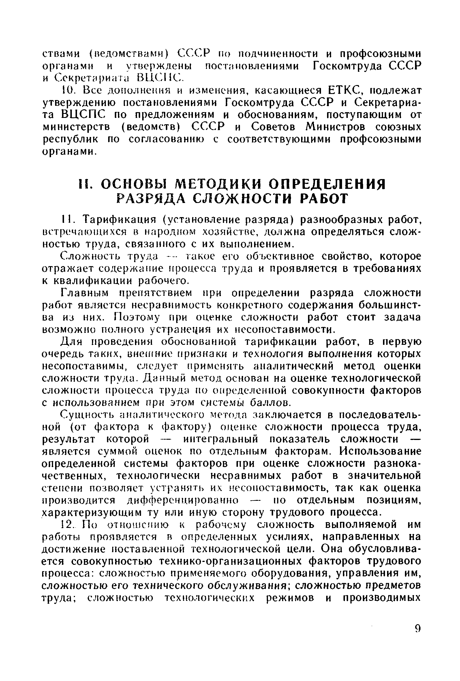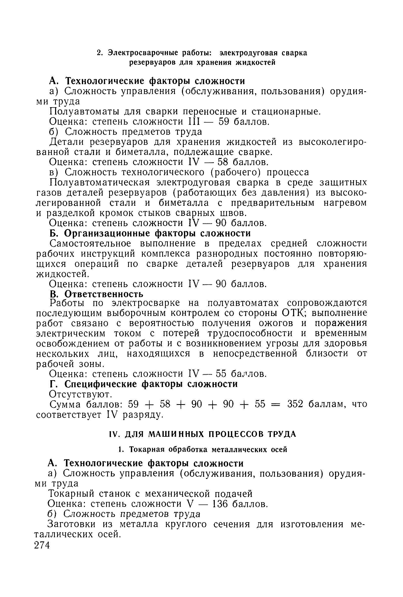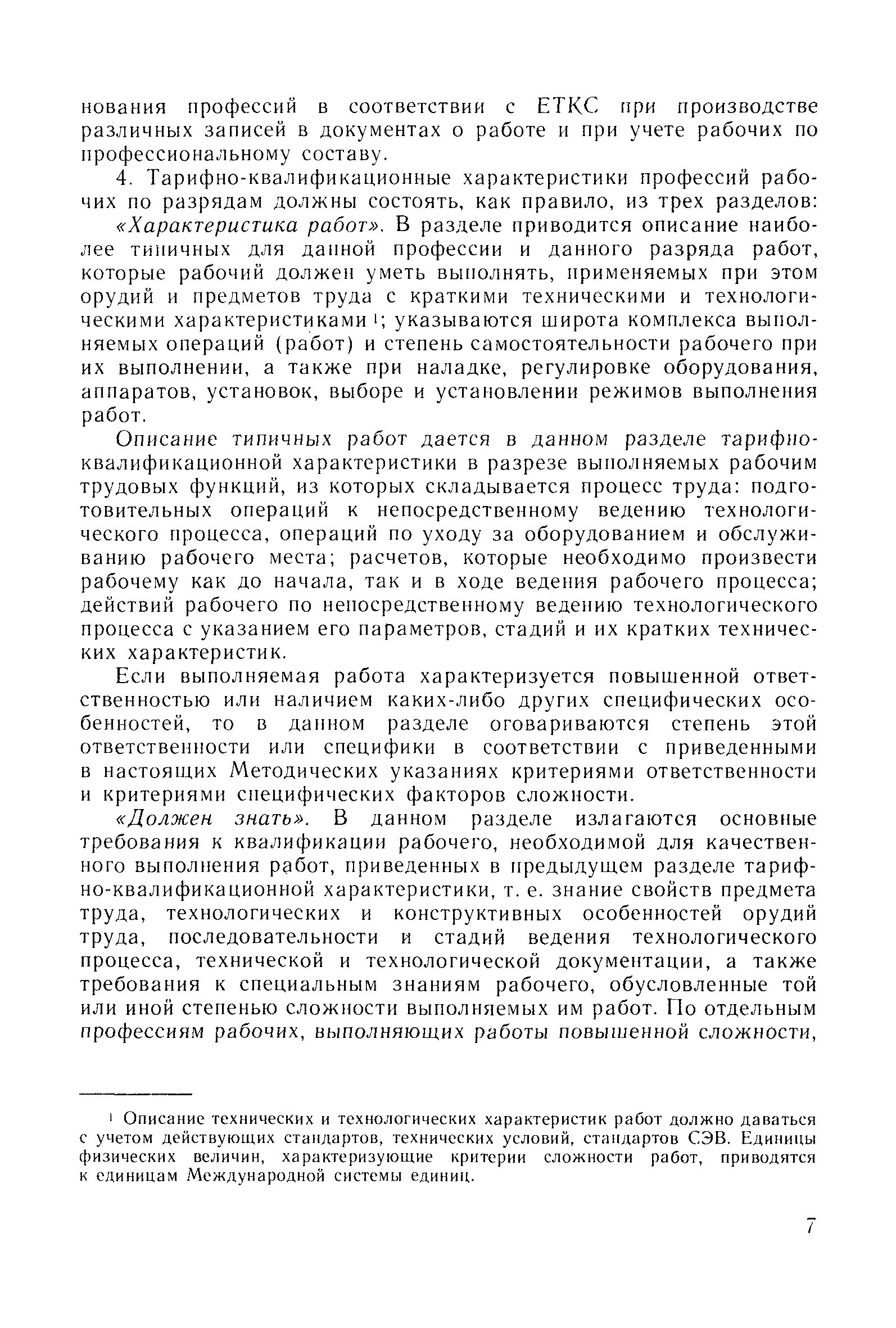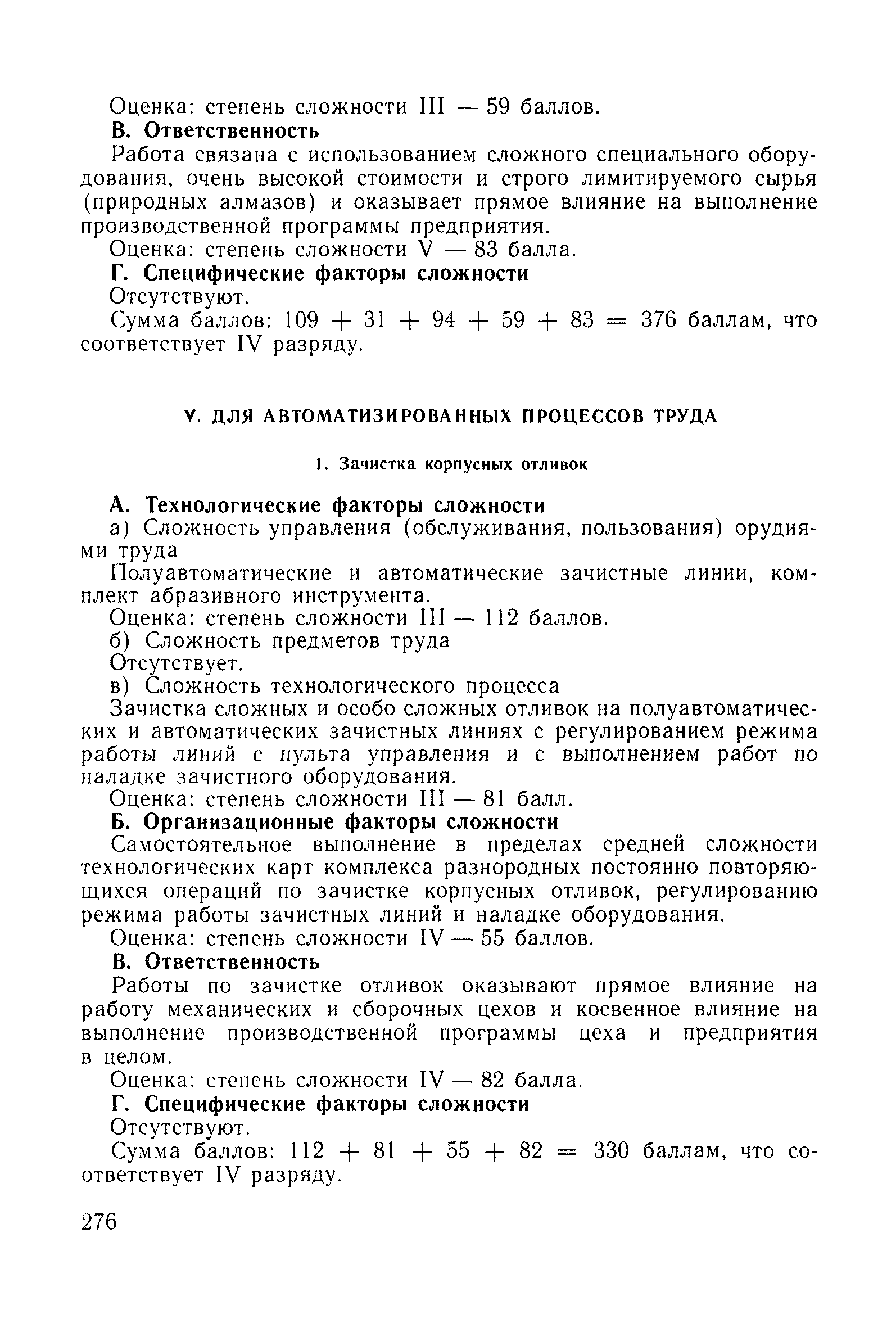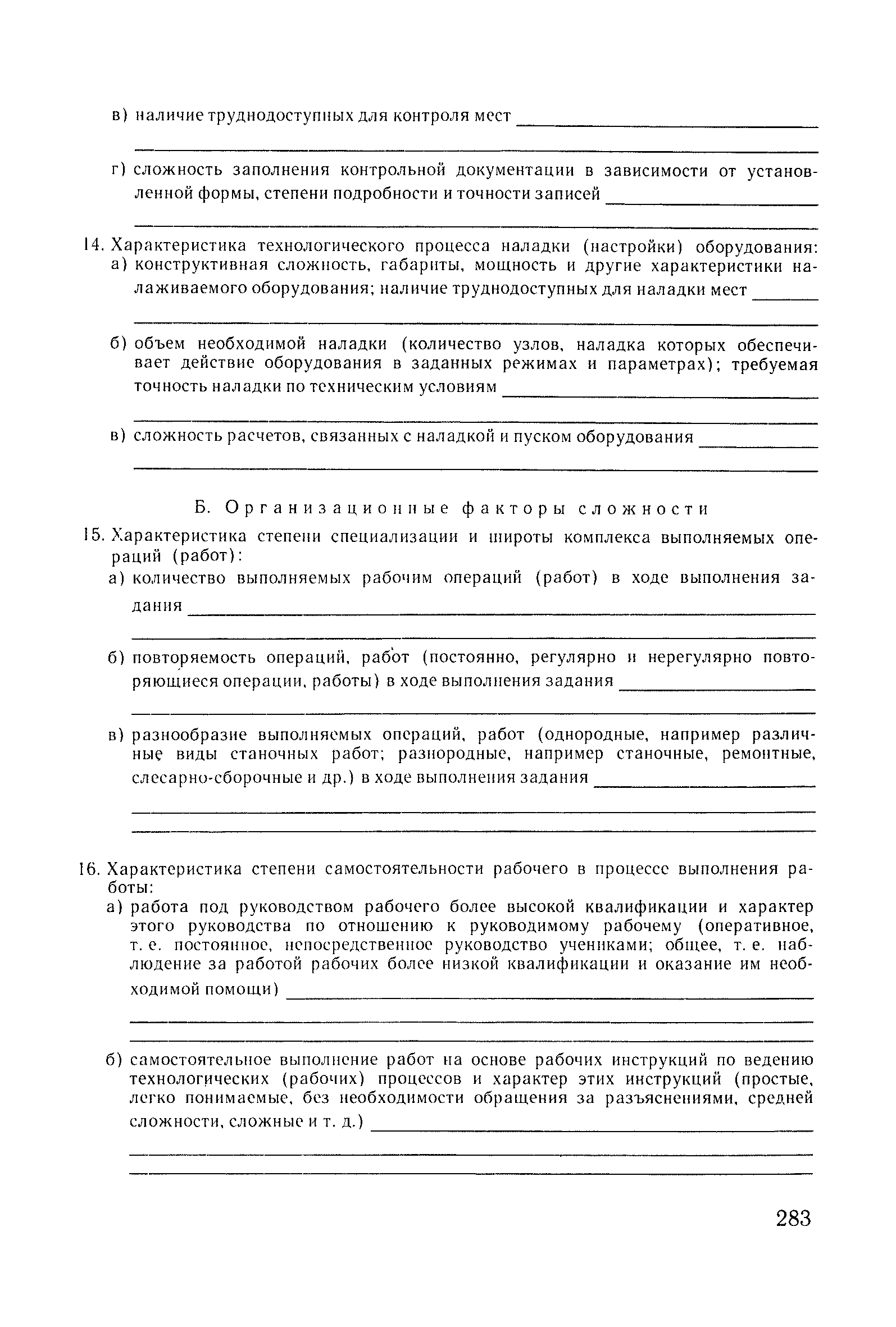 | Оглавление: | Введение I Назначение и структура построения Единого тарифно-квалификационного справочника работ и профессий рабочих II Основы методики определения разряда сложности работ III Определение требований к квалификации рабочих IV Определение наименований профессий рабочих Приложение 1. Примеры тарифно-квалификационных характеристик профессий рабочих по типам трудовых процессов Приложение 2. Критерии степеней сложности факторов 1. Критерии степеней сложности технологических факторов 1. Критерии степеней подфактора "Сложность управлении (обслуживания, пользования) орудиями труда" А. Для ручных процессов труда Б. Для машинно-ручных процессов труда В. Для машинных процессов труда Г. Для автоматизированных процессов труда Д. Для аппаратурных процессов труда 2. Критерии степеней подфактора "Сложность предметов труда" А. Для ручных процессов труда Б. Для машинно-ручных процессов труда В. Для машинных процессов труда 3. Критерии степеней подфактора "Сложность технологических (рабочих) процессов" А. Для ручных процессов труда Б. Для машинно-ручных процессов труда В. Для машинных процессов труда Г. Для автоматизированных процессов труда Д. Для аппаратурных процессов труда II Критерии степеней сложности организационных факторов (широты комплекса выполняемых операций (работ) и степени самостоятельности рабочего в процессе выполнения работ) III Критерии степеней сложности фактора ответственности (материальной ответственности и ответственности за здоровье и жизнь) IV Критерии степеней сложности специфических факторов . . . Приложение 3. Профессионально-квалификационная карта рабочего Приложение 4. Примеры оценки сложности работ по типам трудовых процессов Приложение 5. Тарифно-квалификационная карта для определения разряда сложности работы |