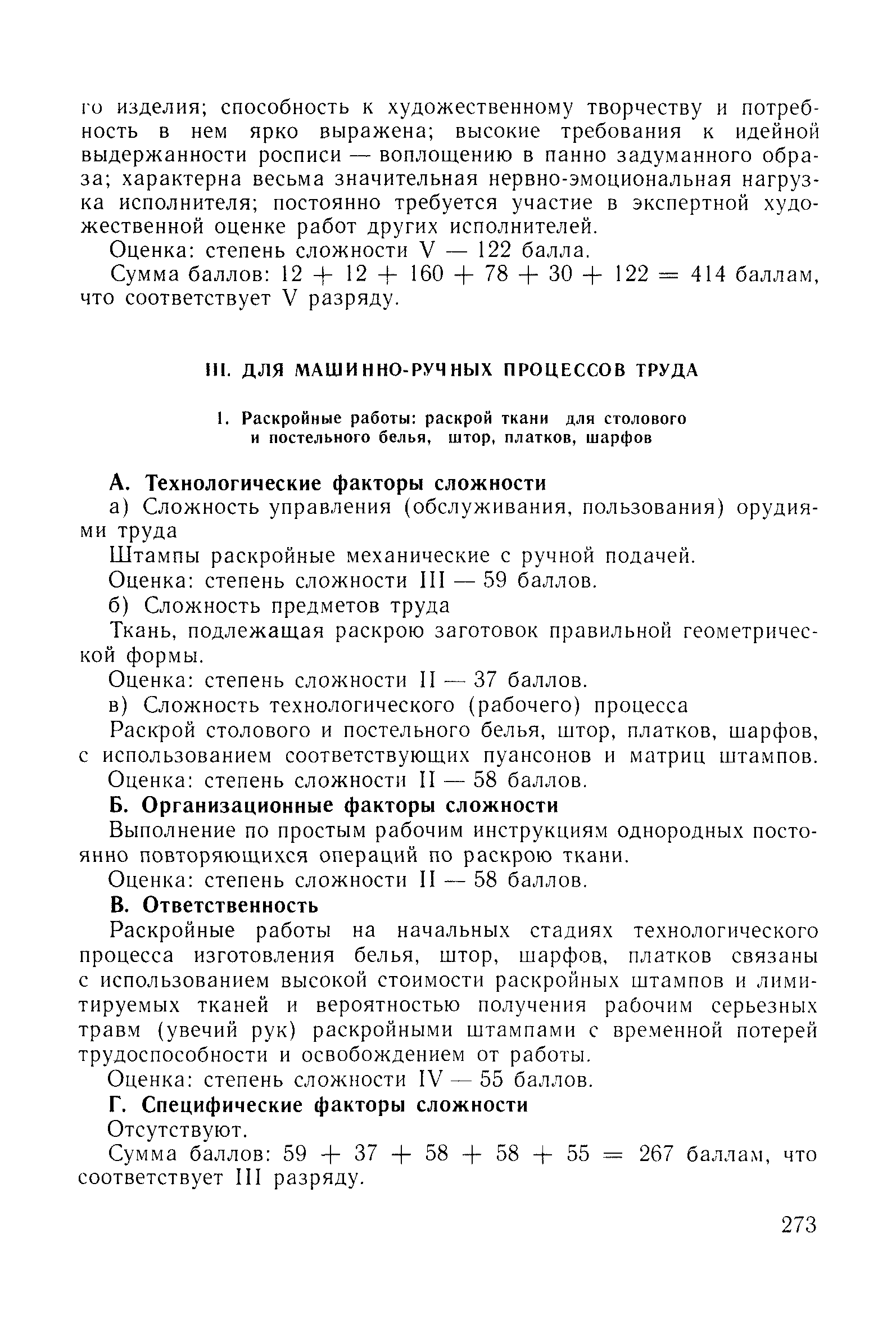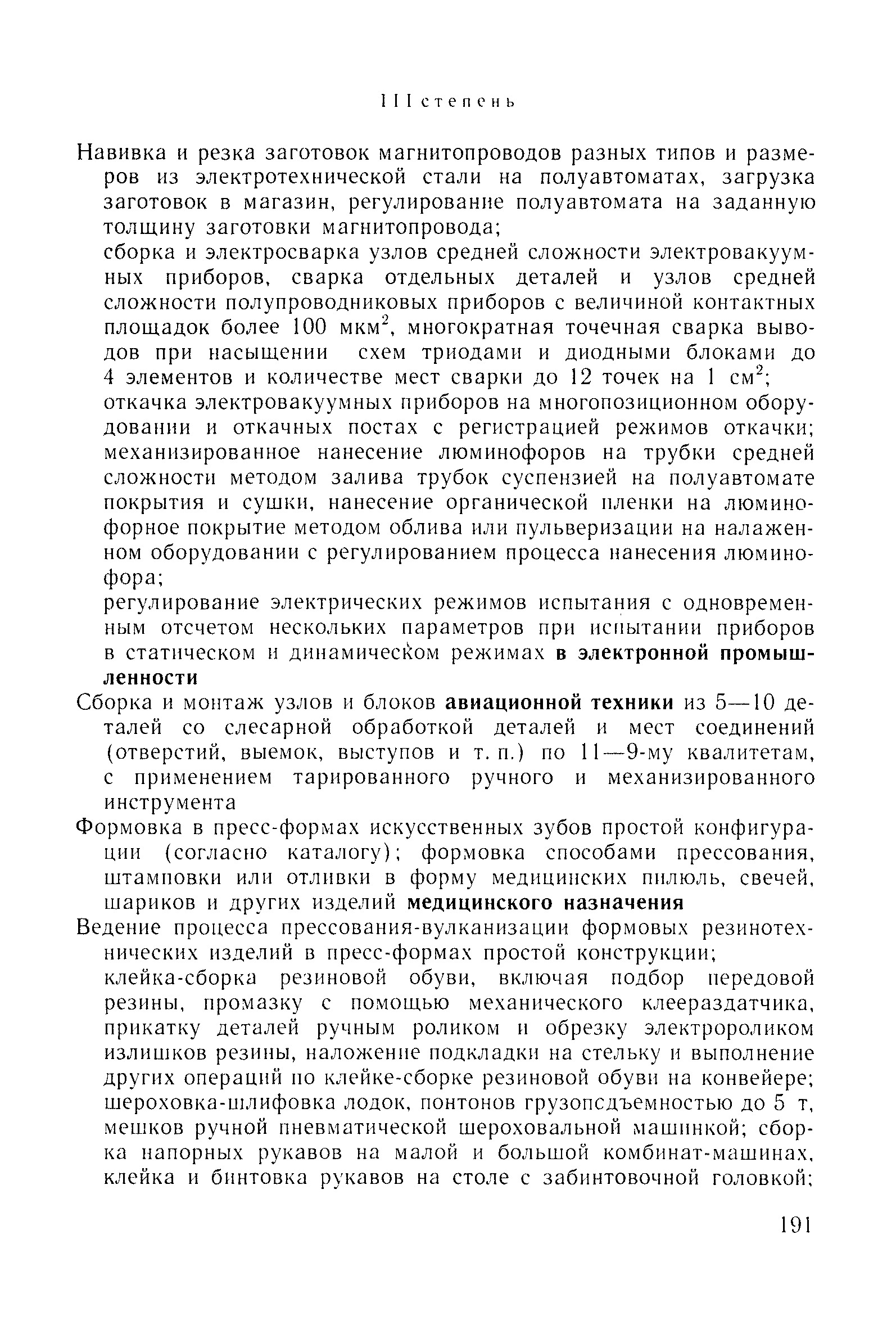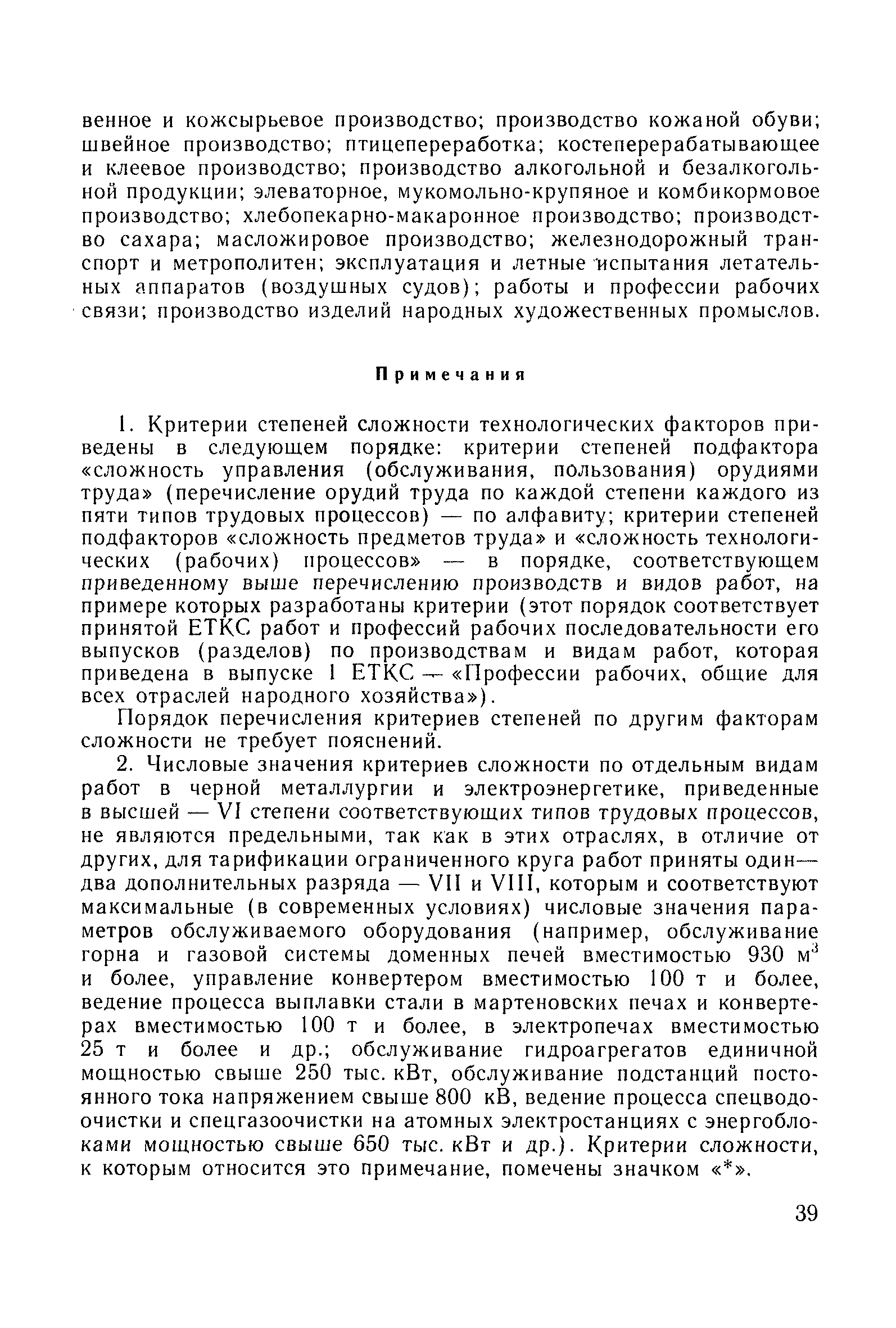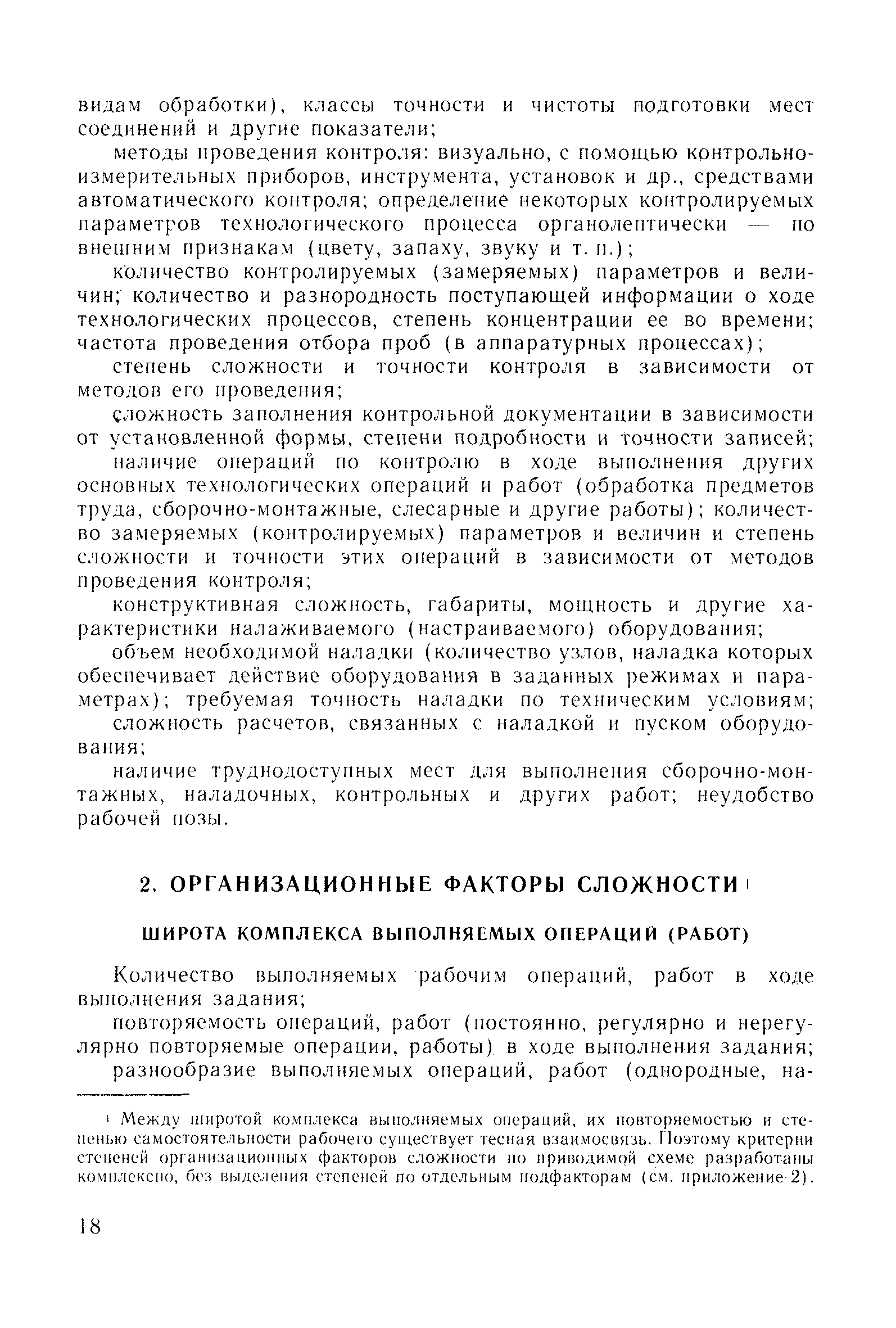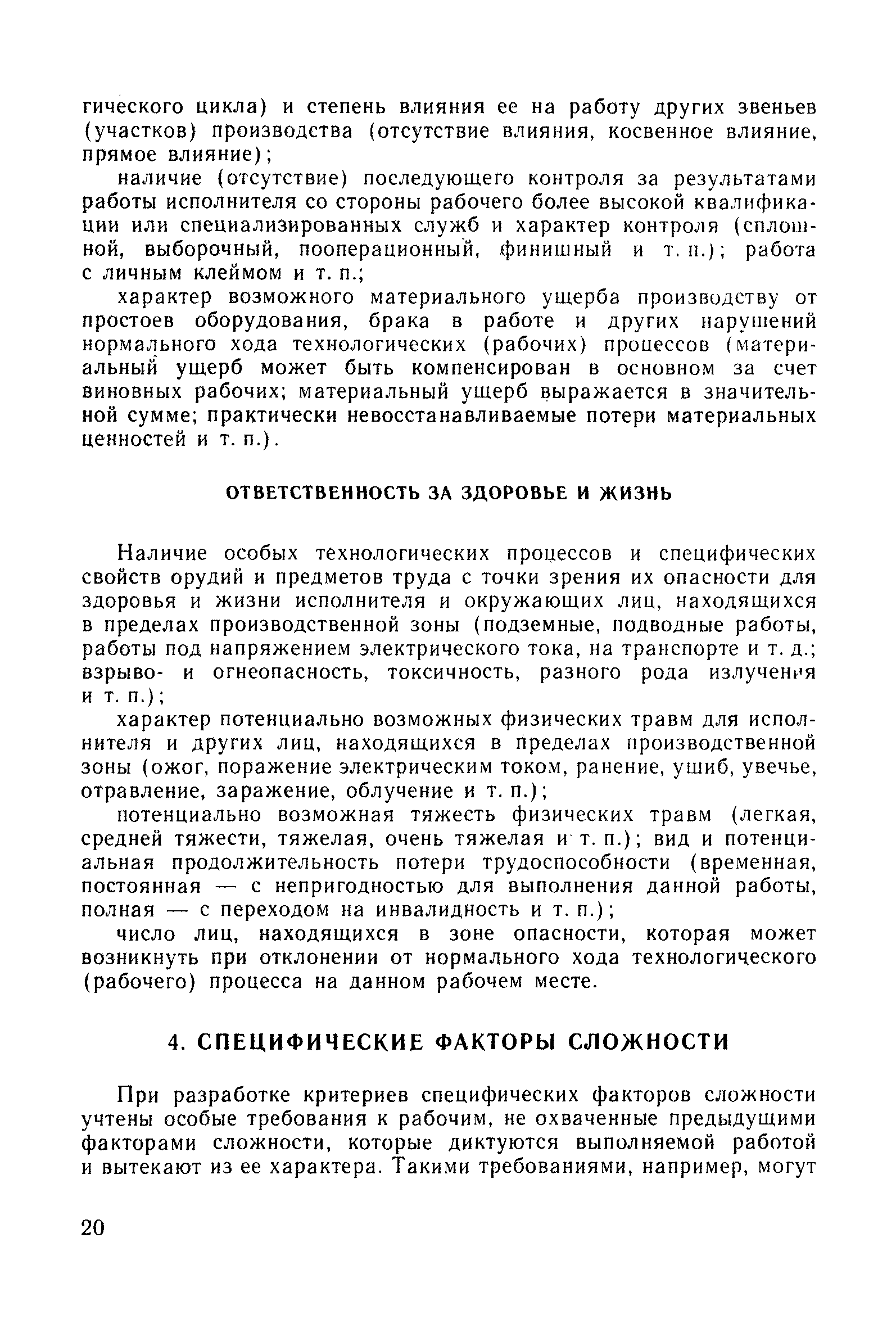 | Оглавление: | Введение I Назначение и структура построения Единого тарифно-квалификационного справочника работ и профессий рабочих II Основы методики определения разряда сложности работ III Определение требований к квалификации рабочих IV Определение наименований профессий рабочих Приложение 1. Примеры тарифно-квалификационных характеристик профессий рабочих по типам трудовых процессов Приложение 2. Критерии степеней сложности факторов 1. Критерии степеней сложности технологических факторов 1. Критерии степеней подфактора "Сложность управлении (обслуживания, пользования) орудиями труда" А. Для ручных процессов труда Б. Для машинно-ручных процессов труда В. Для машинных процессов труда Г. Для автоматизированных процессов труда Д. Для аппаратурных процессов труда 2. Критерии степеней подфактора "Сложность предметов труда" А. Для ручных процессов труда Б. Для машинно-ручных процессов труда В. Для машинных процессов труда 3. Критерии степеней подфактора "Сложность технологических (рабочих) процессов" А. Для ручных процессов труда Б. Для машинно-ручных процессов труда В. Для машинных процессов труда Г. Для автоматизированных процессов труда Д. Для аппаратурных процессов труда II Критерии степеней сложности организационных факторов (широты комплекса выполняемых операций (работ) и степени самостоятельности рабочего в процессе выполнения работ) III Критерии степеней сложности фактора ответственности (материальной ответственности и ответственности за здоровье и жизнь) IV Критерии степеней сложности специфических факторов . . . Приложение 3. Профессионально-квалификационная карта рабочего Приложение 4. Примеры оценки сложности работ по типам трудовых процессов Приложение 5. Тарифно-квалификационная карта для определения разряда сложности работы |